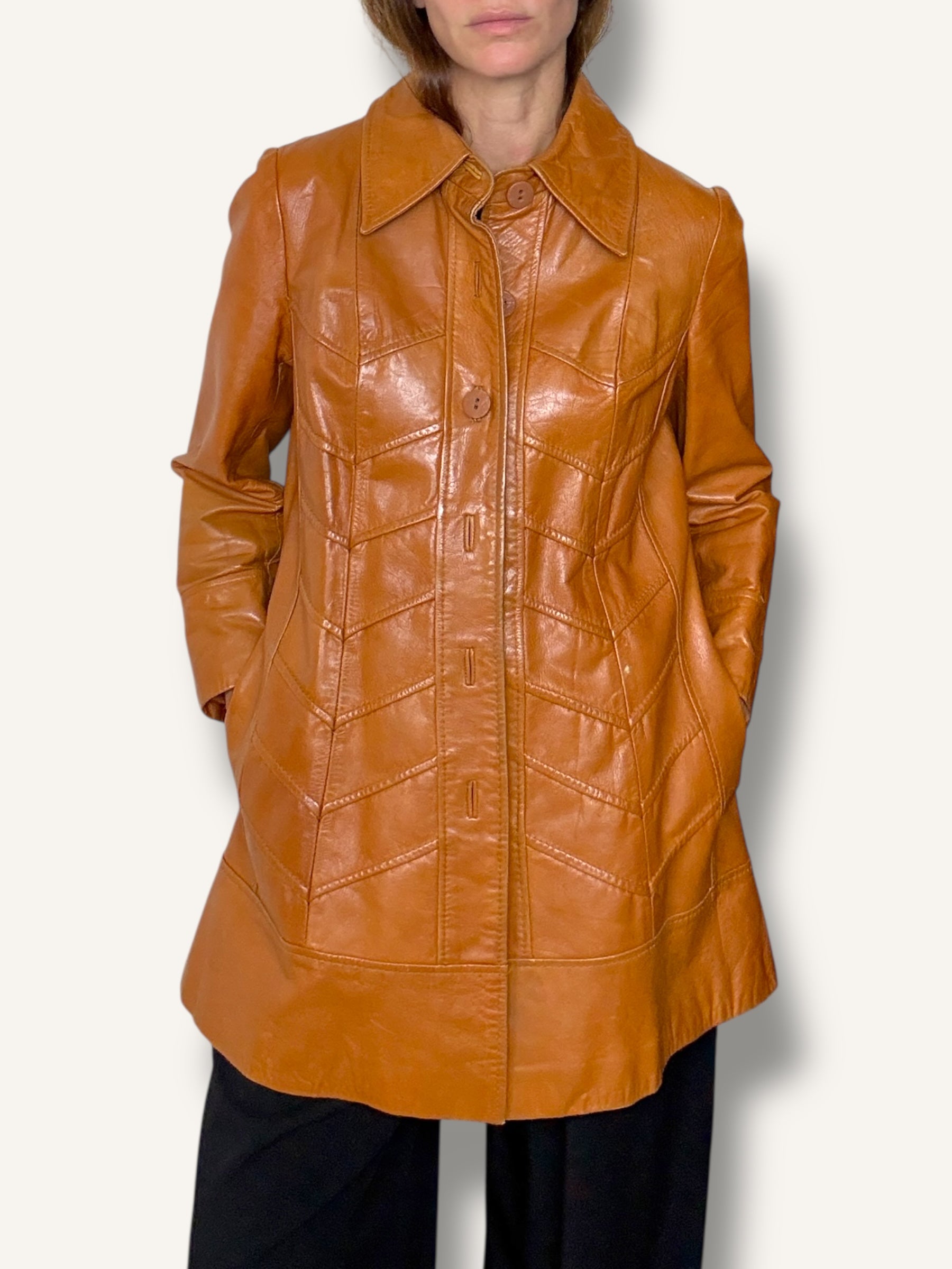 This Heritage vintage coat is crafted from 100% genuine leather in a rich cognac brown, designed with chevron-style paneling that adds subtle structure and shape. It features a wide pointed collar, long sleeves, and oversized tonal buttons running down the front for a classic 70s touch. Cut to a flattering mid-thigh length, the supple leather offers both durability and comfort, making it an effortlessly versatile piece that blends timeless tailoring with retro edge.