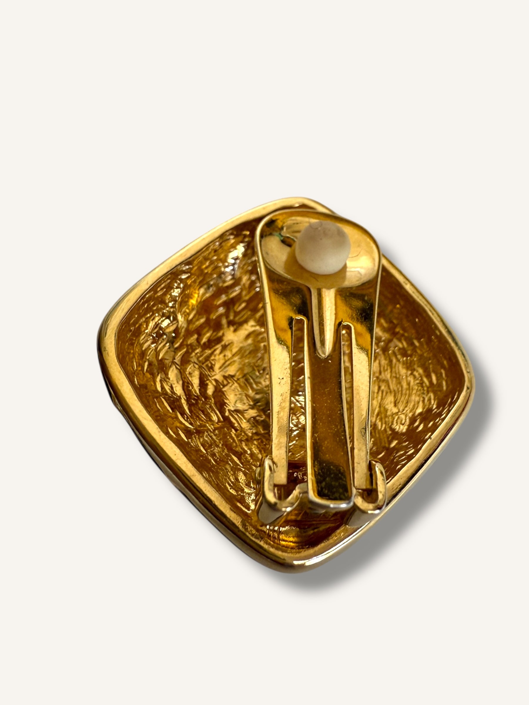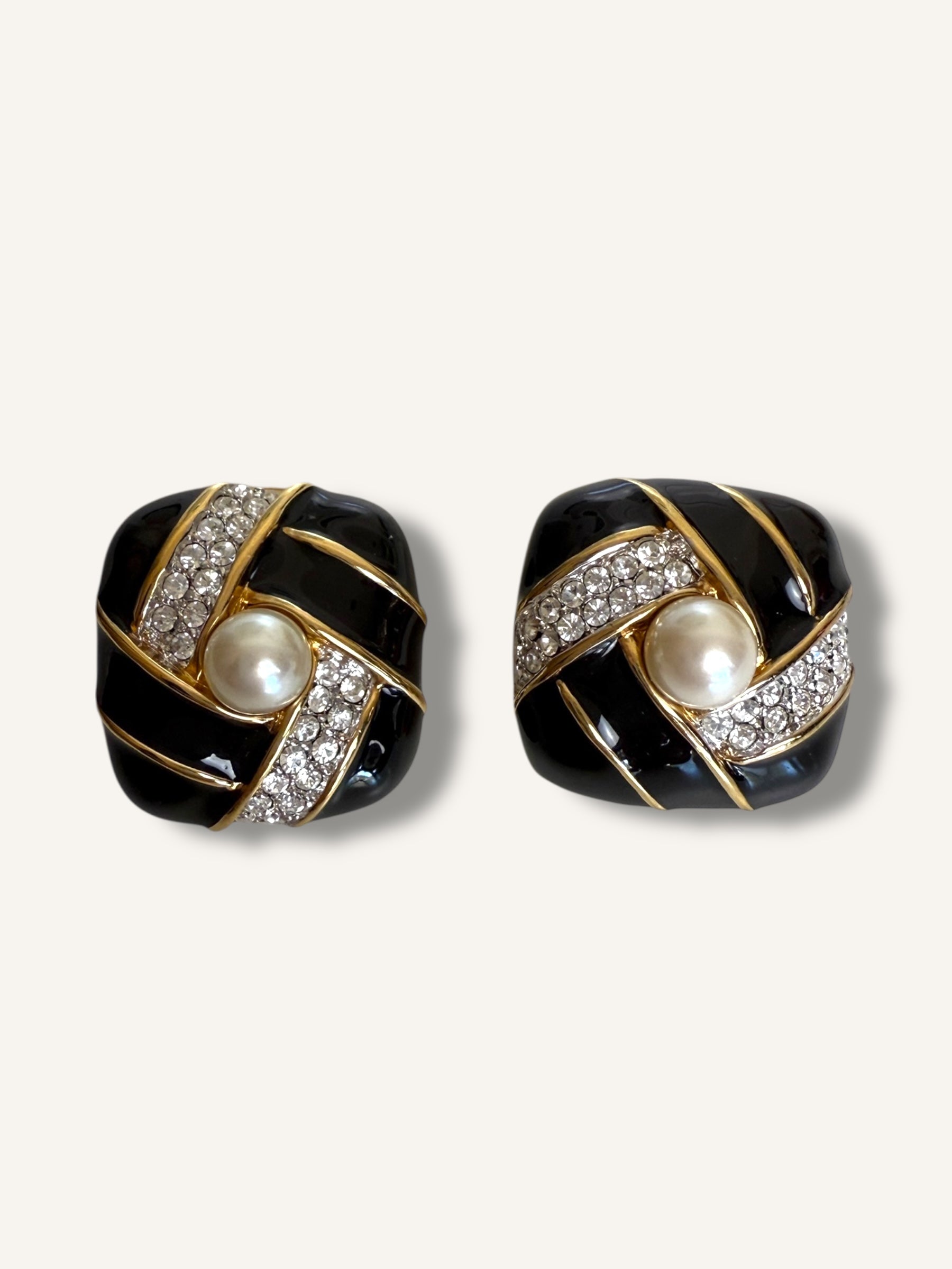 These Vintage Clip-ons earrings from the 90s are a striking design with an elegant mix of materials and textures. The bold, rounded shape is crafted in glossy black enamel, accented by sweeping gold-tone details set with sparkling rhinestones. A luminous faux pearl sits at the center of the design, adding a touch of softness and sophistication. The look is distinctly 1990s—glamorous, sculptural, and perfect for a statement moment.