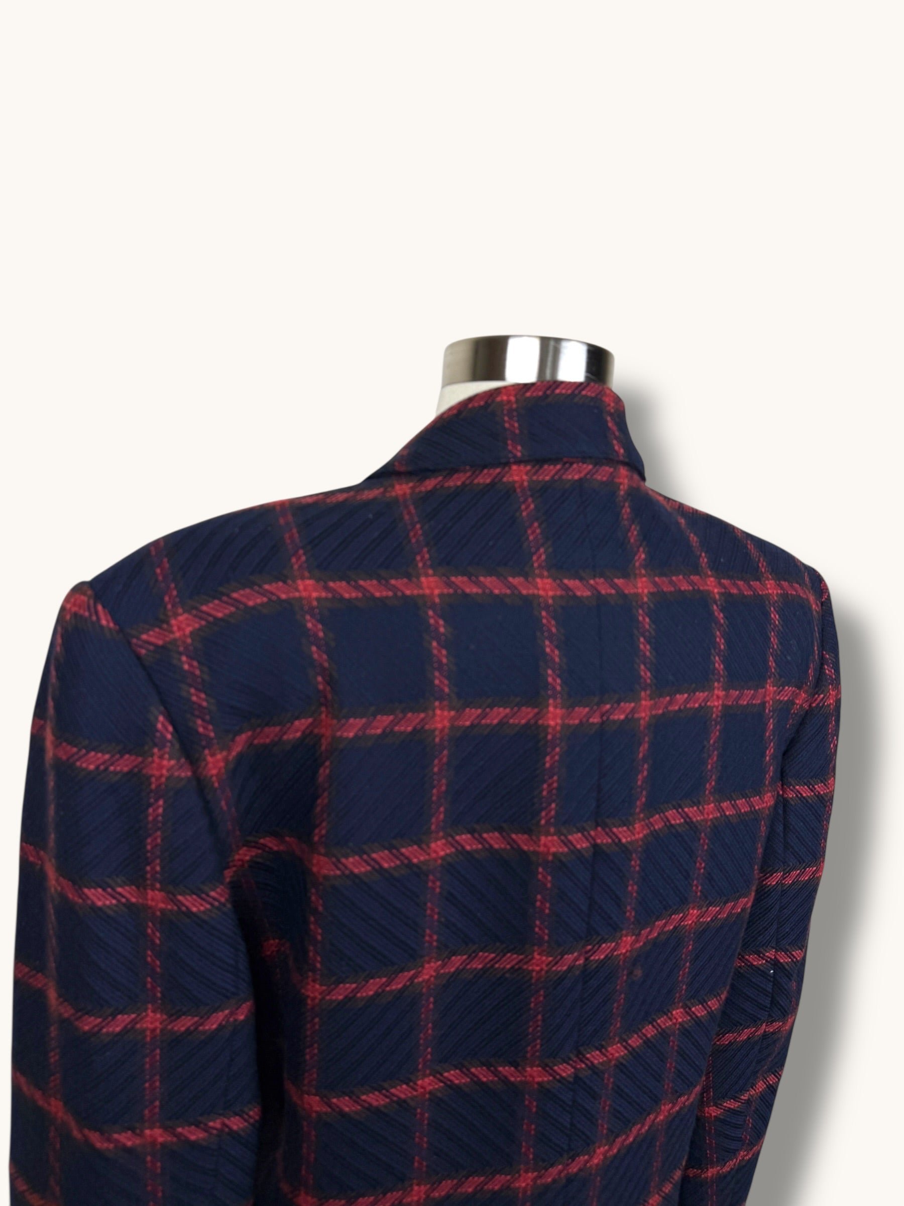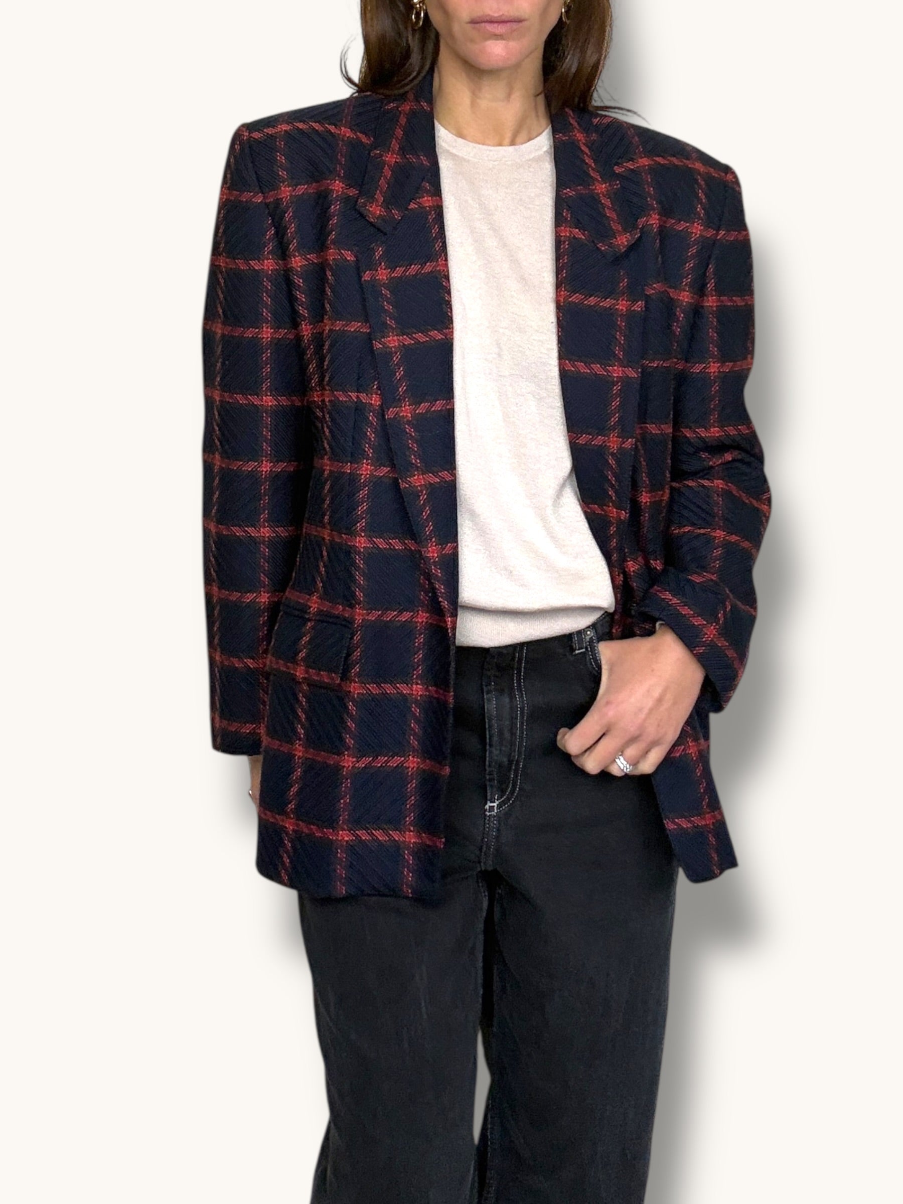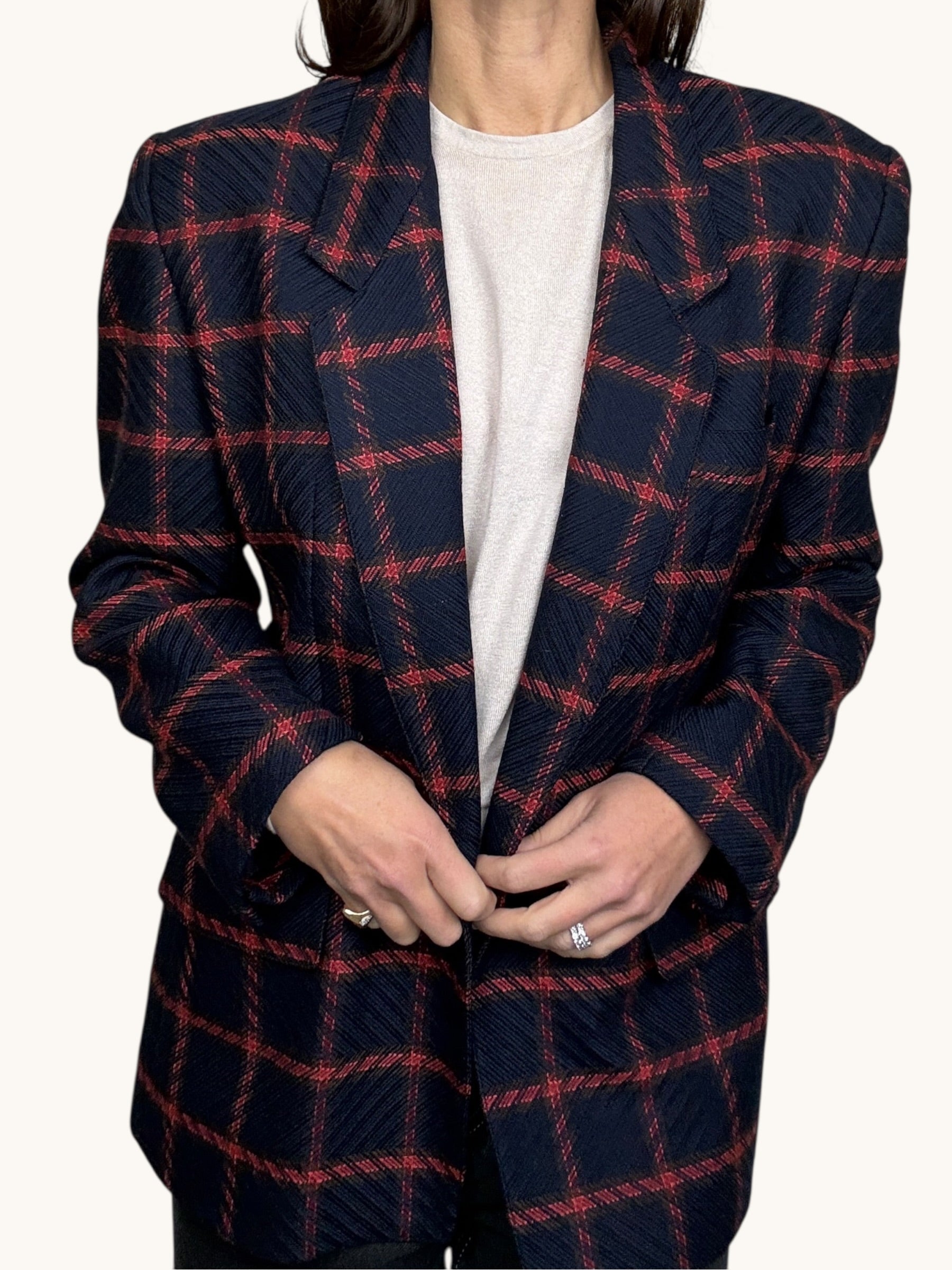 A timeless vintage Anne Klein blazer crafted in a luxurious 90% wool, 10% cashmere blend for a soft yet structured feel. Designed in a rich navy with bold red windowpane plaid, this tailored silhouette features classic notched lapels, subtle shoulder structure, flap pockets, and a single-button front closure that creates a flattering, elongated line. The refined menswear-inspired pattern paired with the elevated fabric makes it both polished and effortlessly chic. Perfect styled with denim for a modern edge or layered over tailored trousers for a sophisticated, heritage look.
