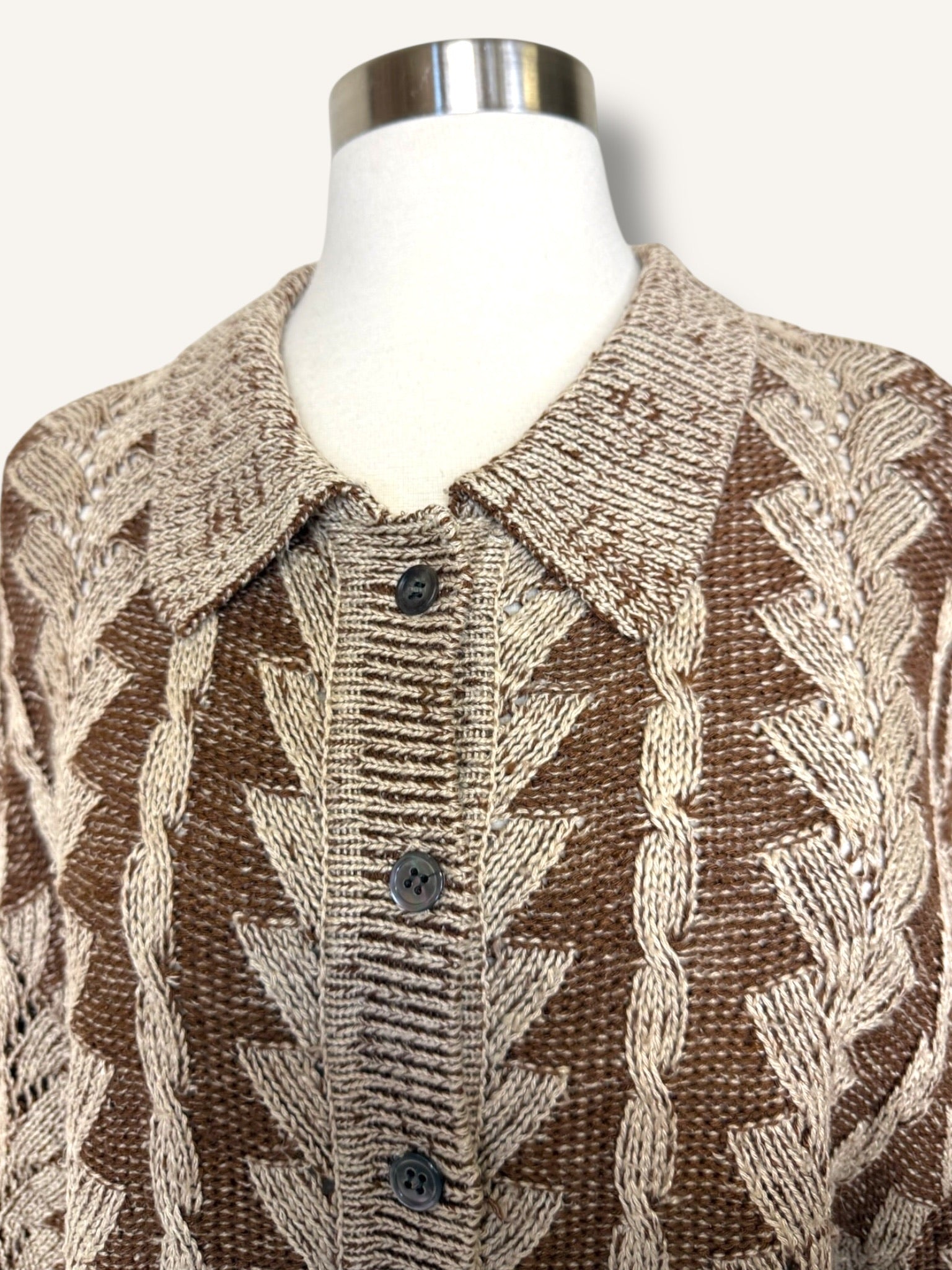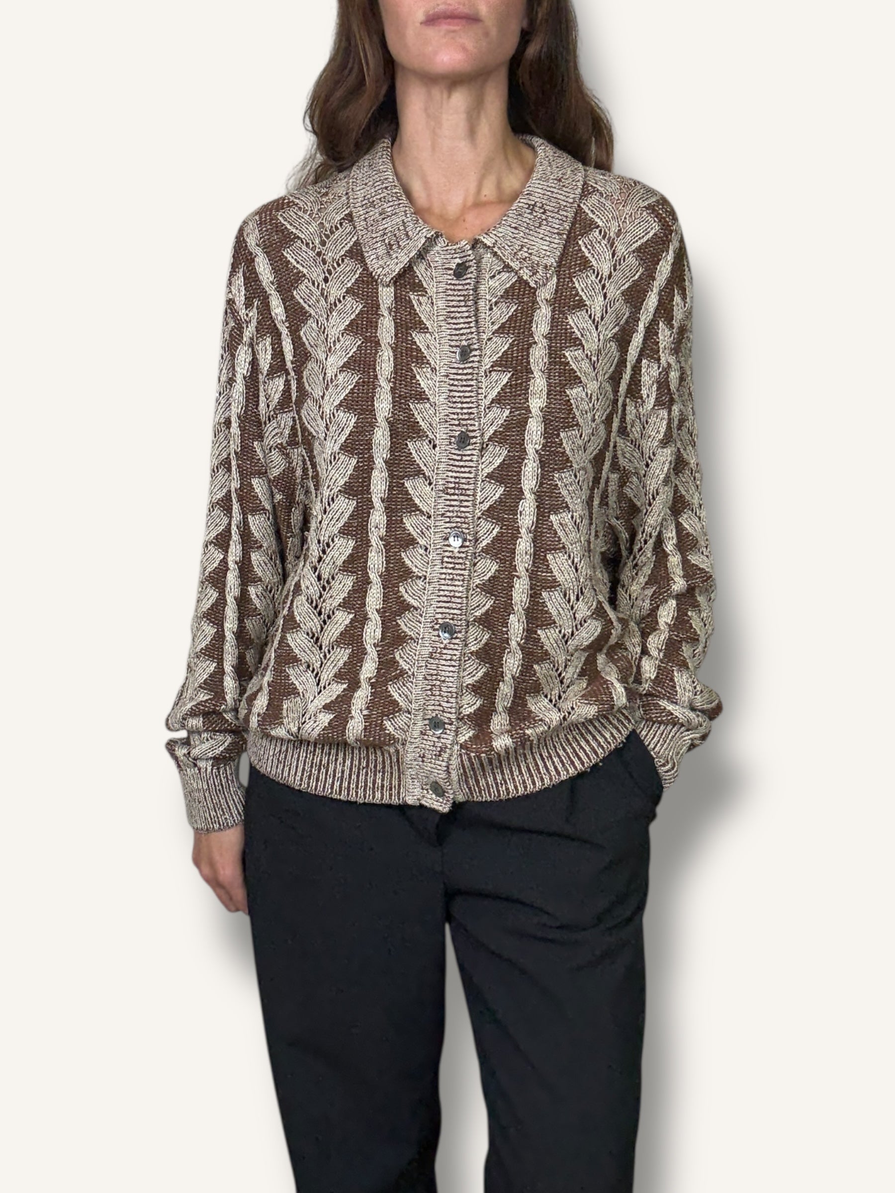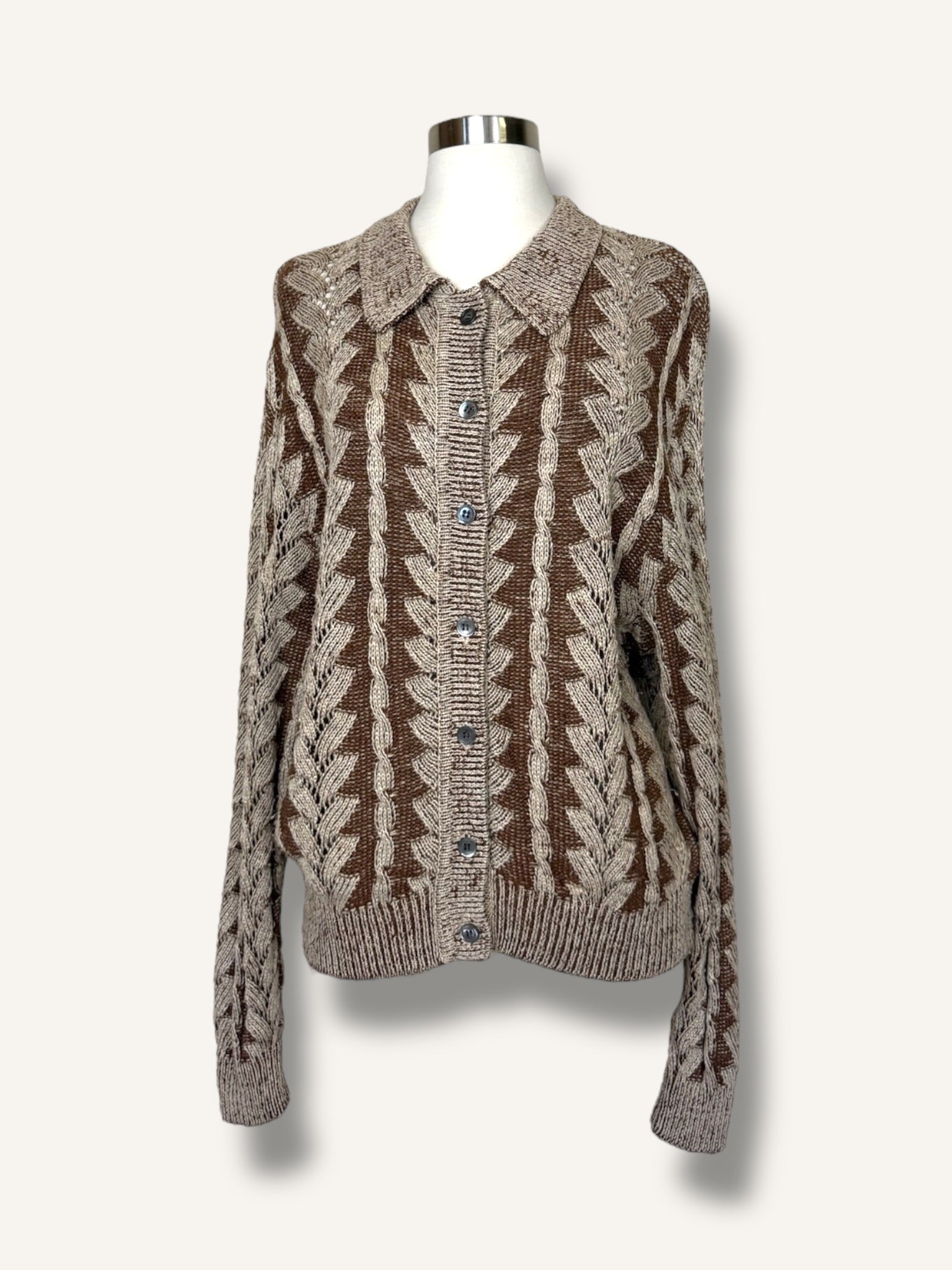 Vintage Anne Klein Knit Cardigan. A classic Anne Klein knit from the late 70s to early 80s, featuring a rich mix of taupe and chocolate tones in a bold chevron and cable pattern. Designed with a structured collar and front button closure, it blends cozy texture with timeless sophistication. The slightly oversized silhouette and intricate knit work make it the perfect layering piece, refined yet effortlessly relaxed, with that signature Anne Klein polish.