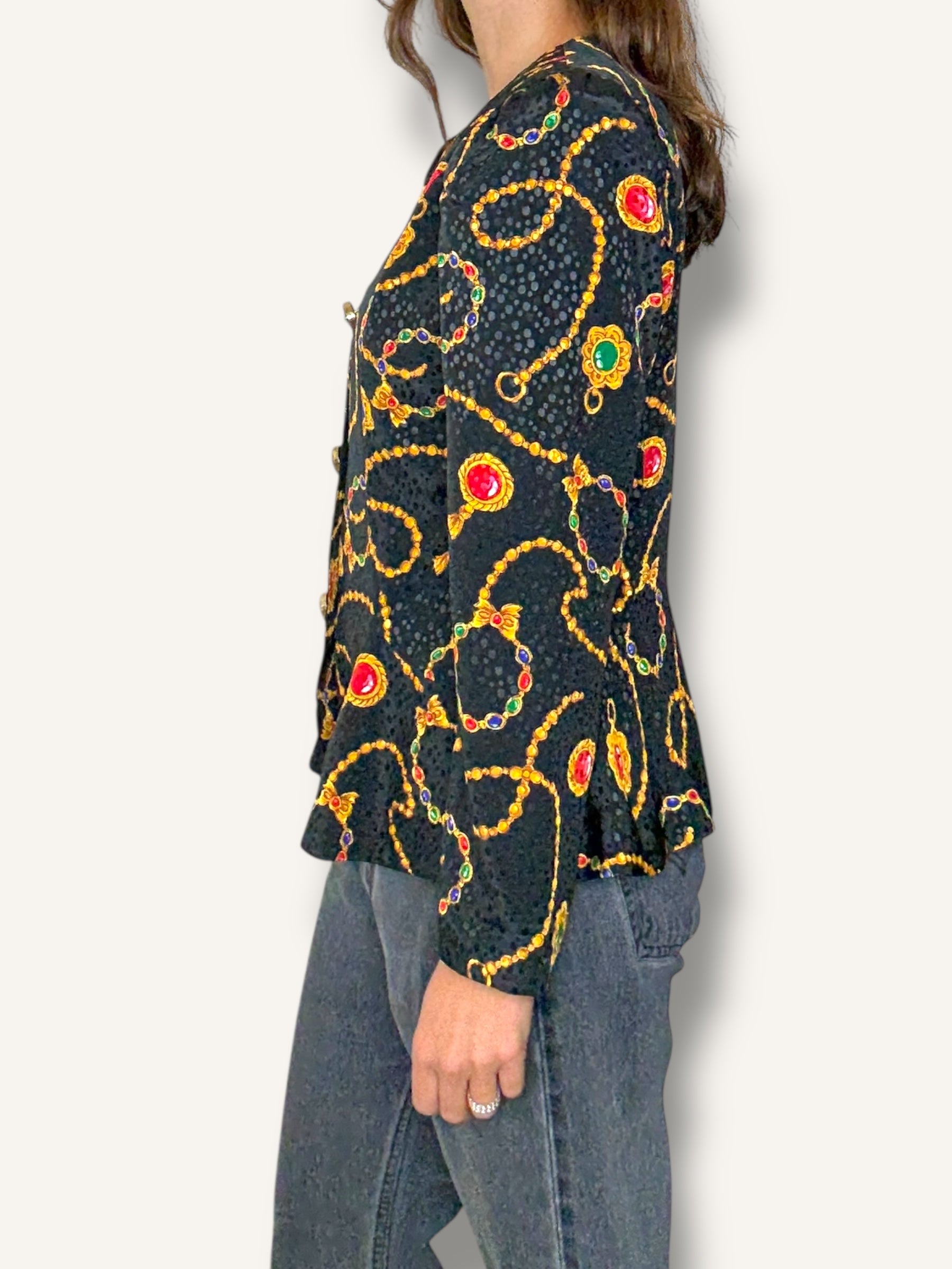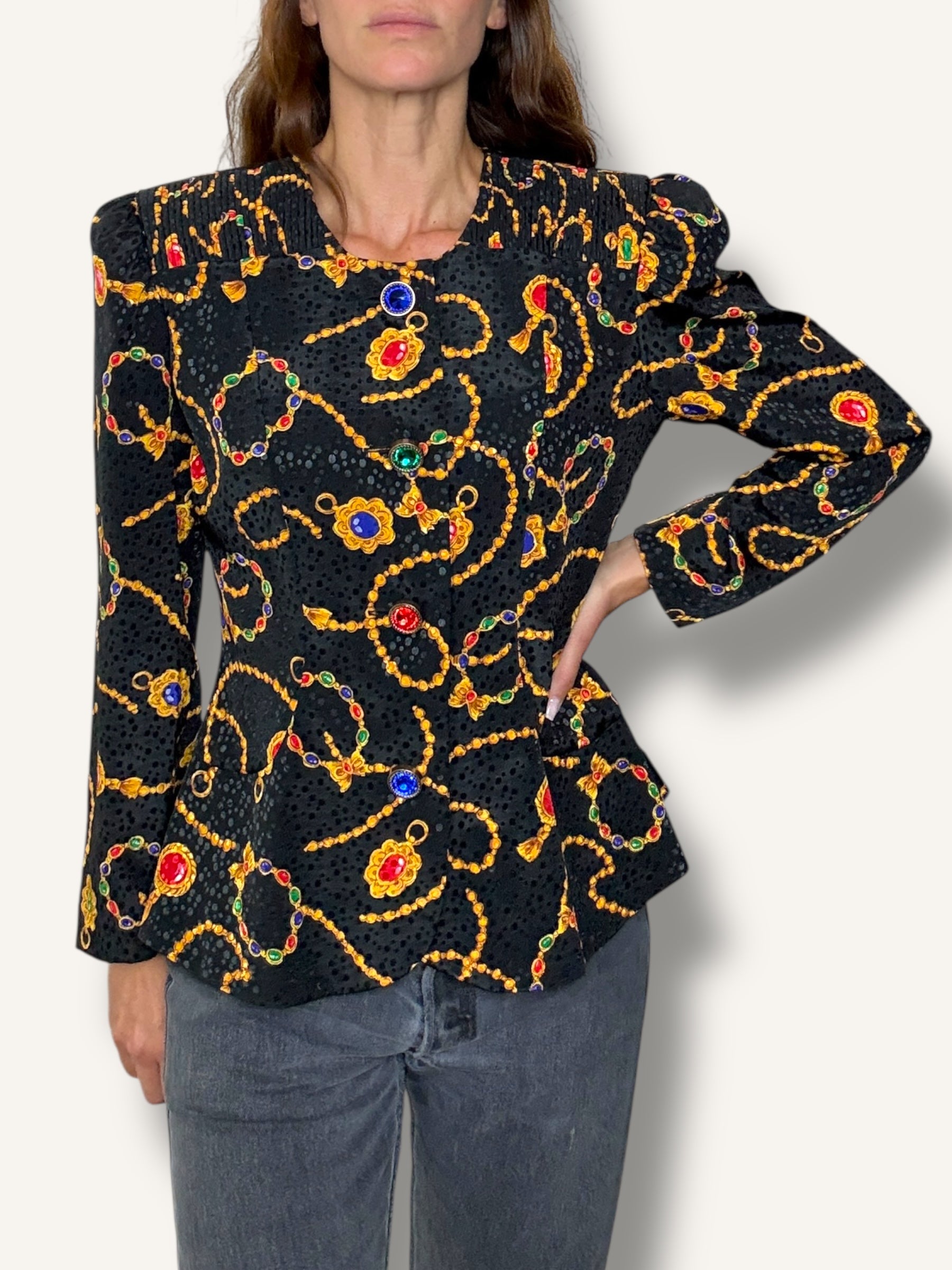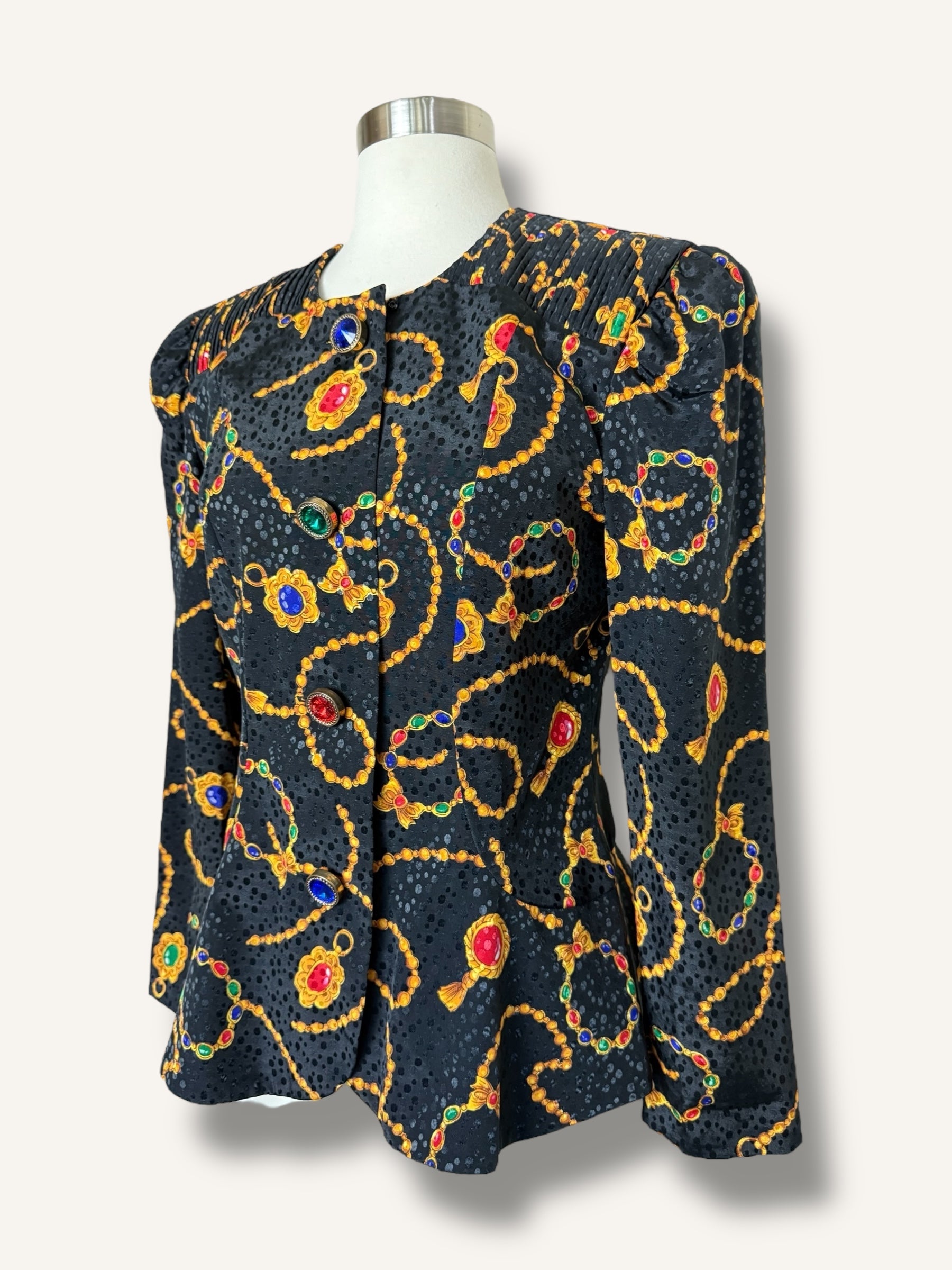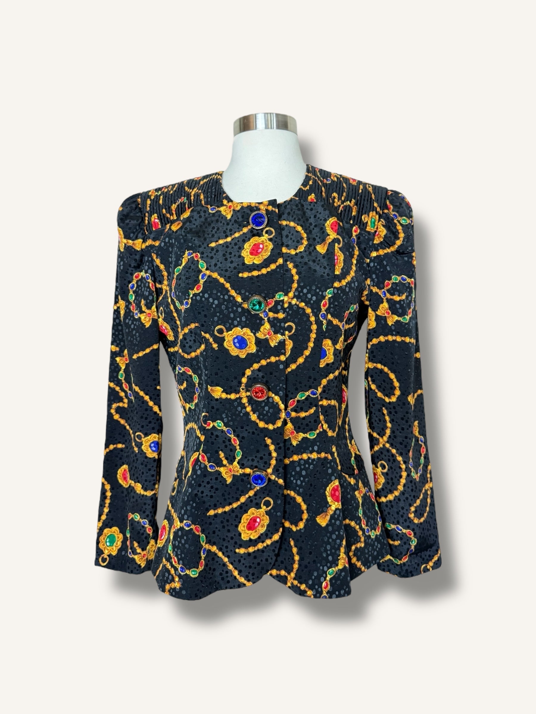 Make a statement with this striking vintage blazer/top featuring an ornate chain-and-gem print in vibrant jewel tones against a deep black backdrop. The silk blend structured silhouette is elevated with gathered shoulders, a fitted waist, and a subtle peplum hem that creates a flattering shape. Bold jeweled buttons add dimension and sparkle, tying into the rich, baroque-inspired pattern. Perfect for dressing up tailored trousers or layering over a sleek slip dress, this piece is pure 80s glamour with timeless appeal.