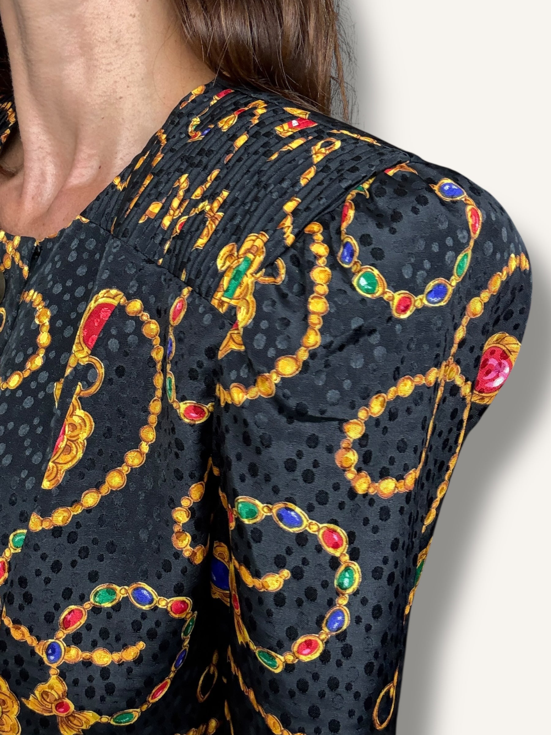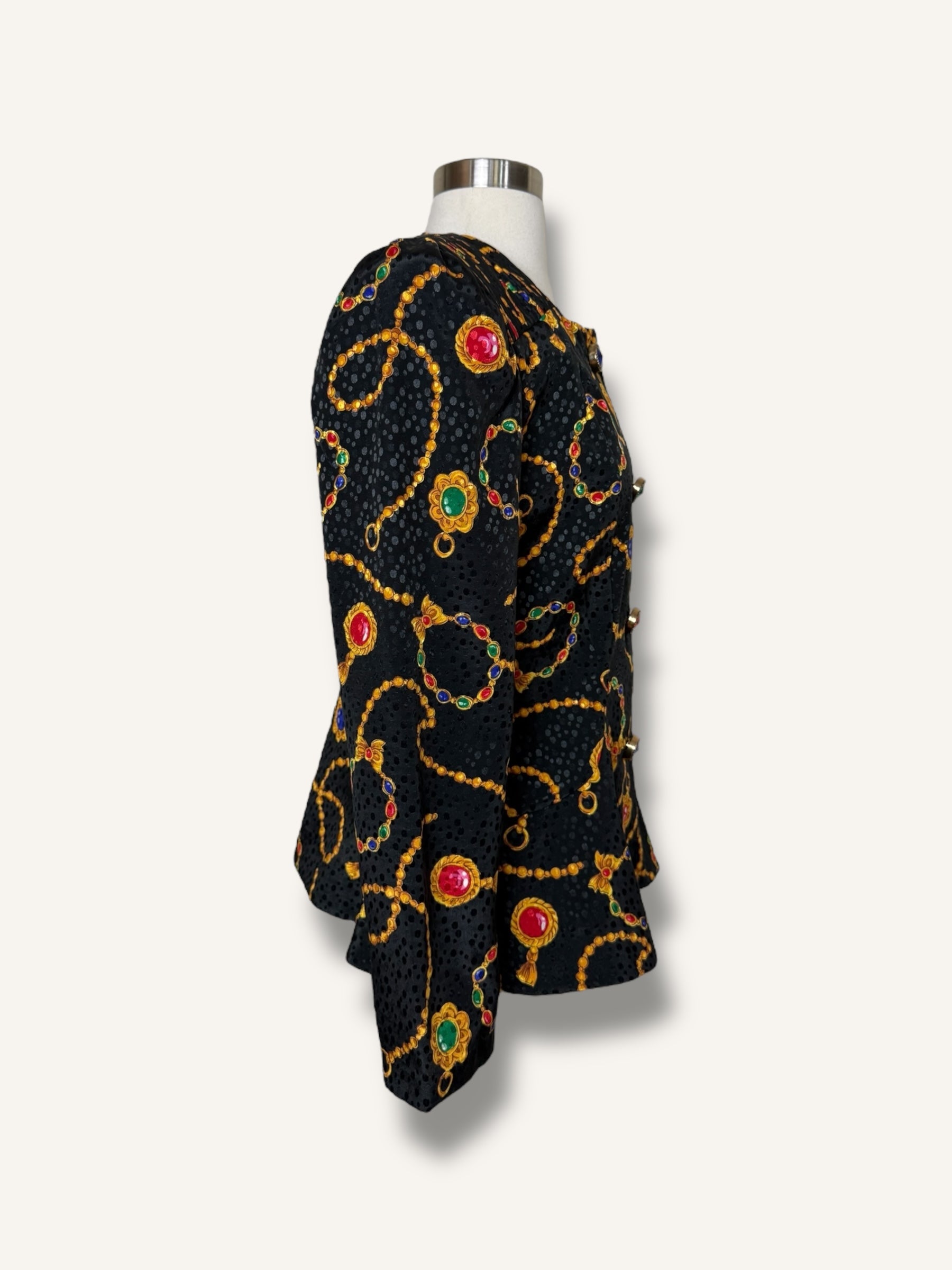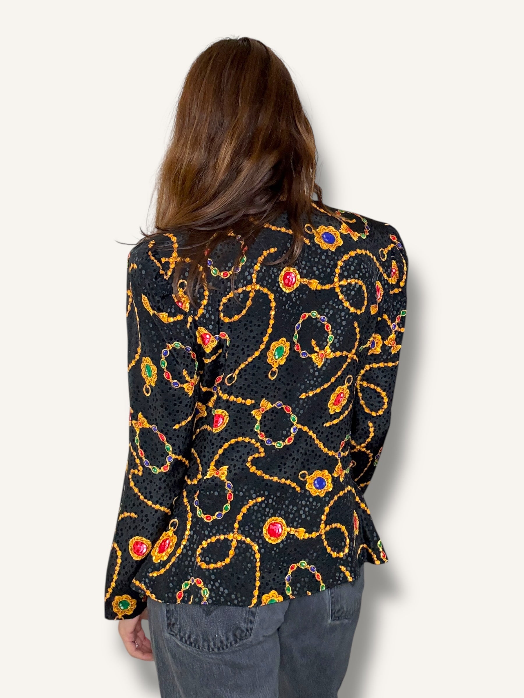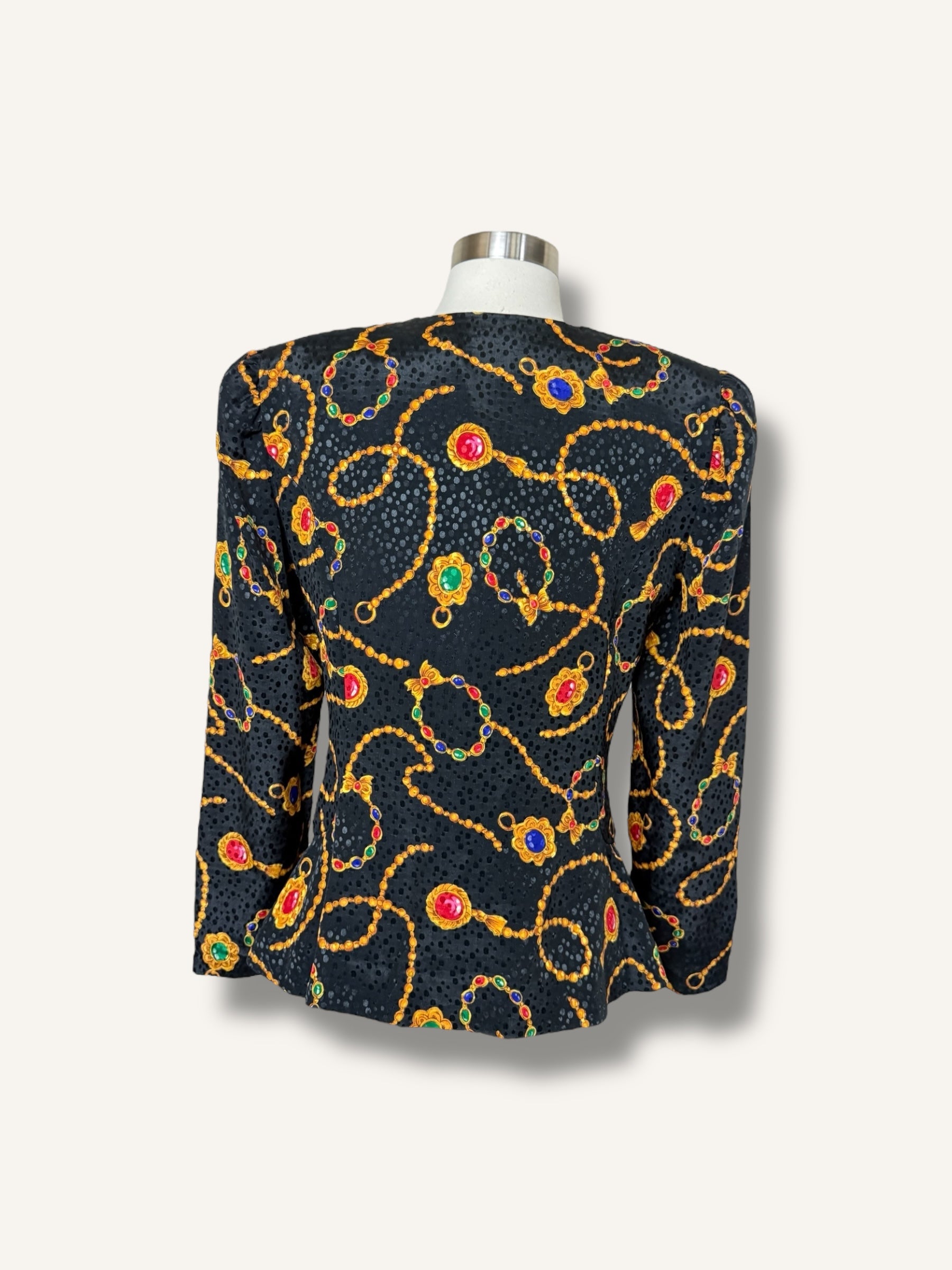 Make a statement with this striking vintage blazer/top featuring an ornate chain-and-gem print in vibrant jewel tones against a deep black backdrop. The silk blend structured silhouette is elevated with gathered shoulders, a fitted waist, and a subtle peplum hem that creates a flattering shape. Bold jeweled buttons add dimension and sparkle, tying into the rich, baroque-inspired pattern. Perfect for dressing up tailored trousers or layering over a sleek slip dress, this piece is pure 80s glamour with timeless appeal.