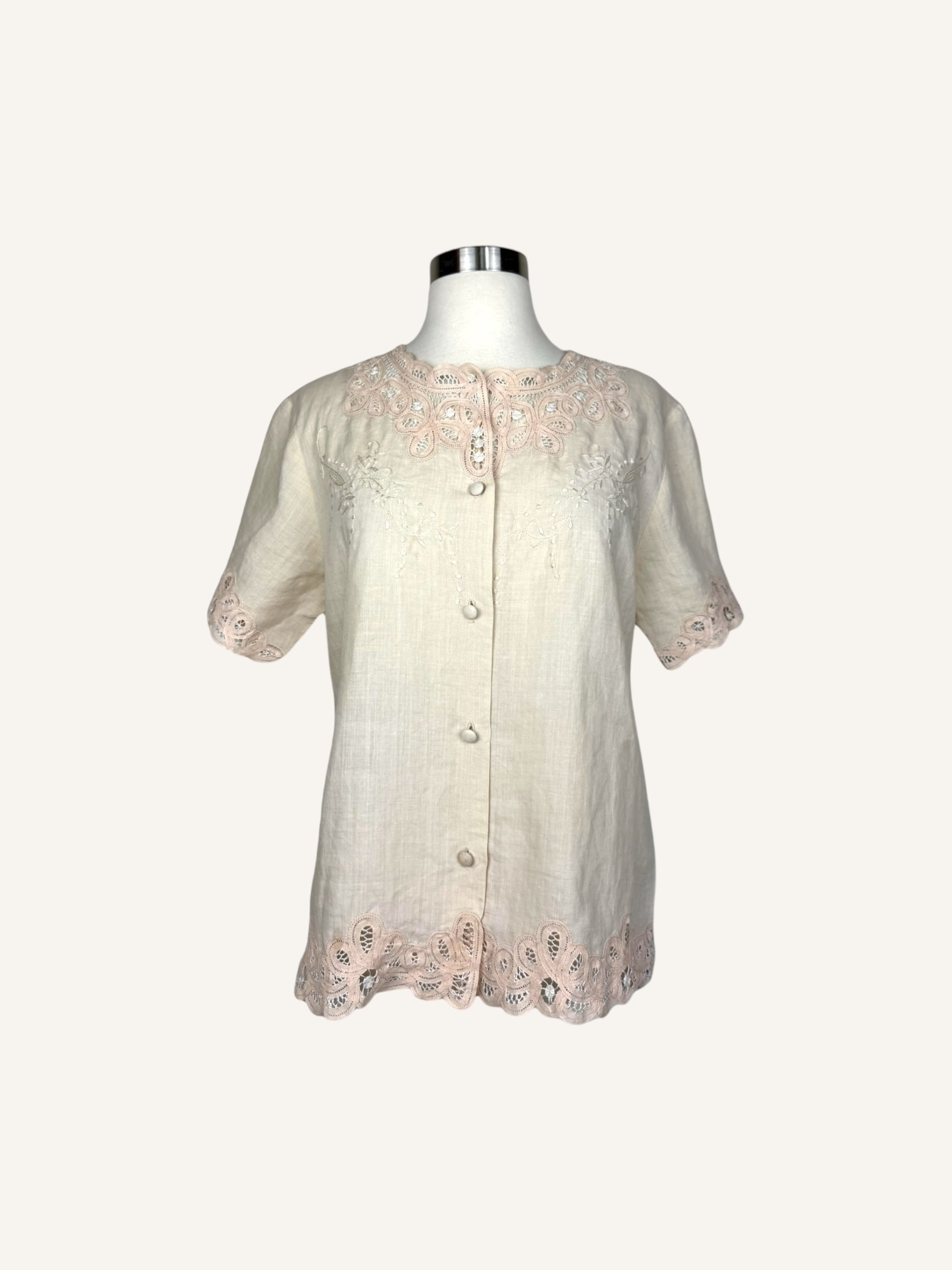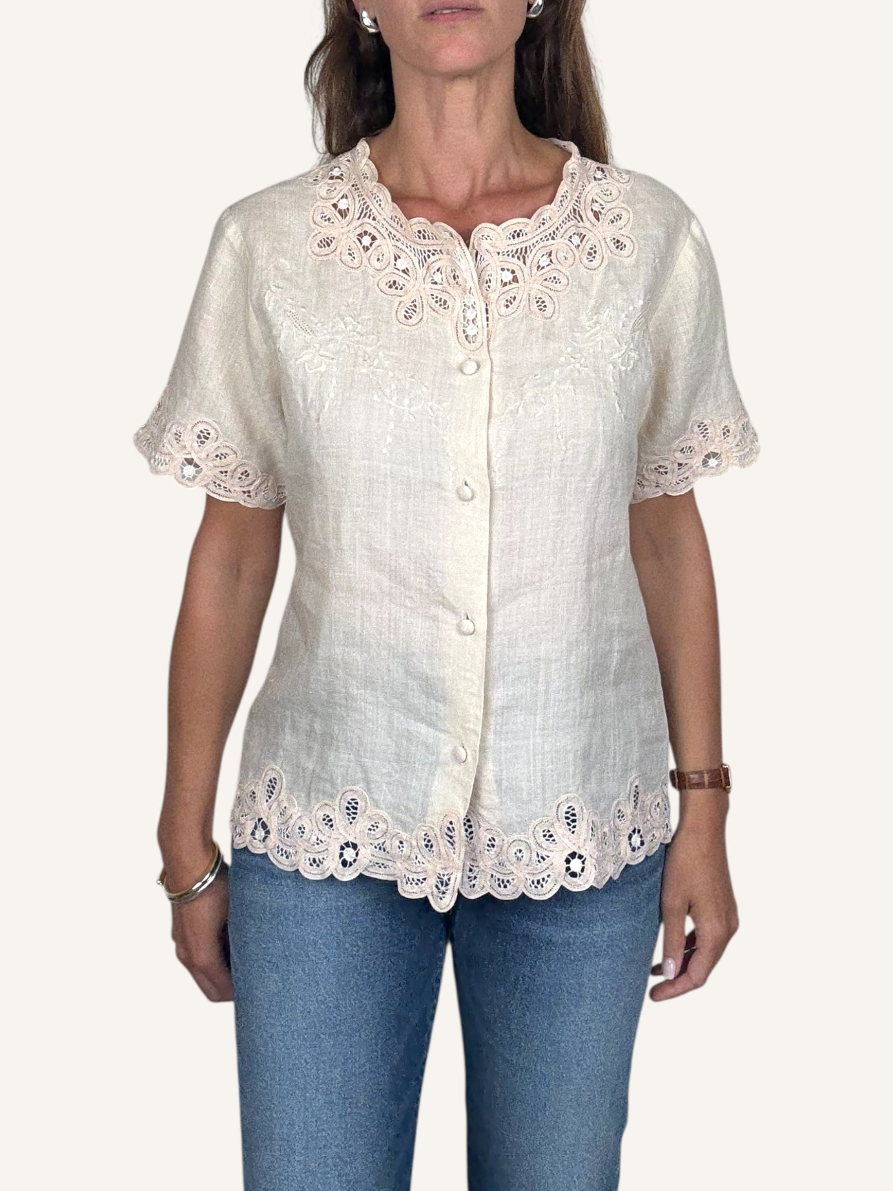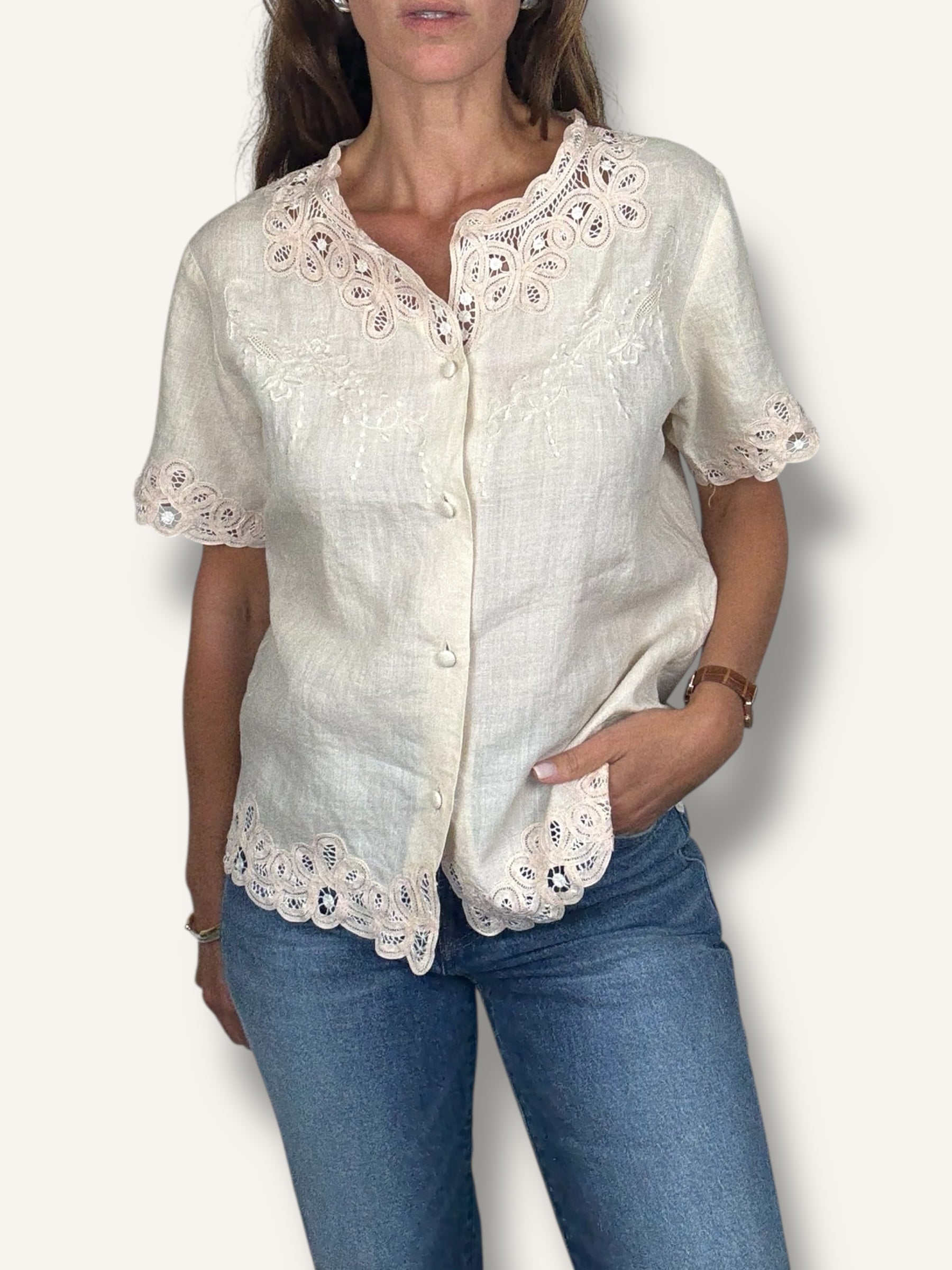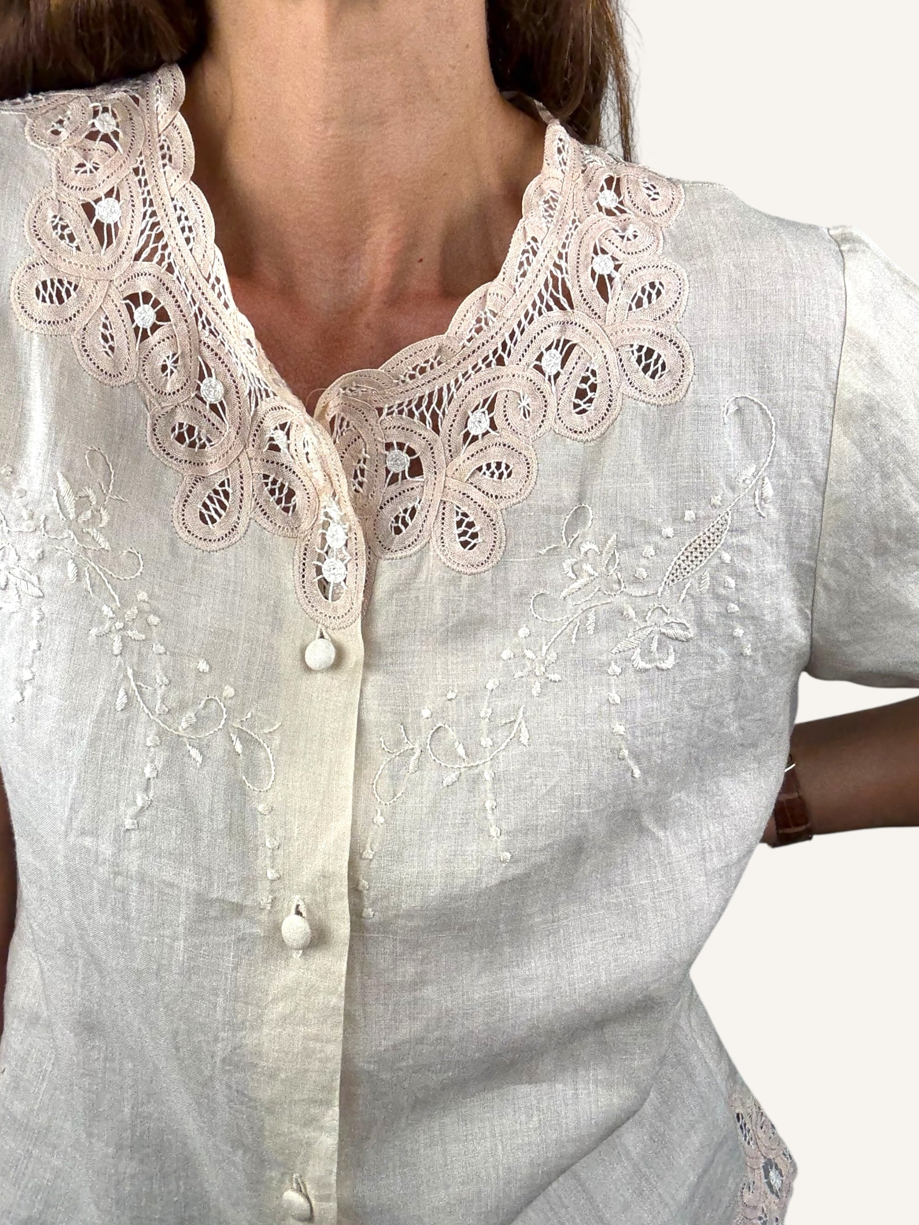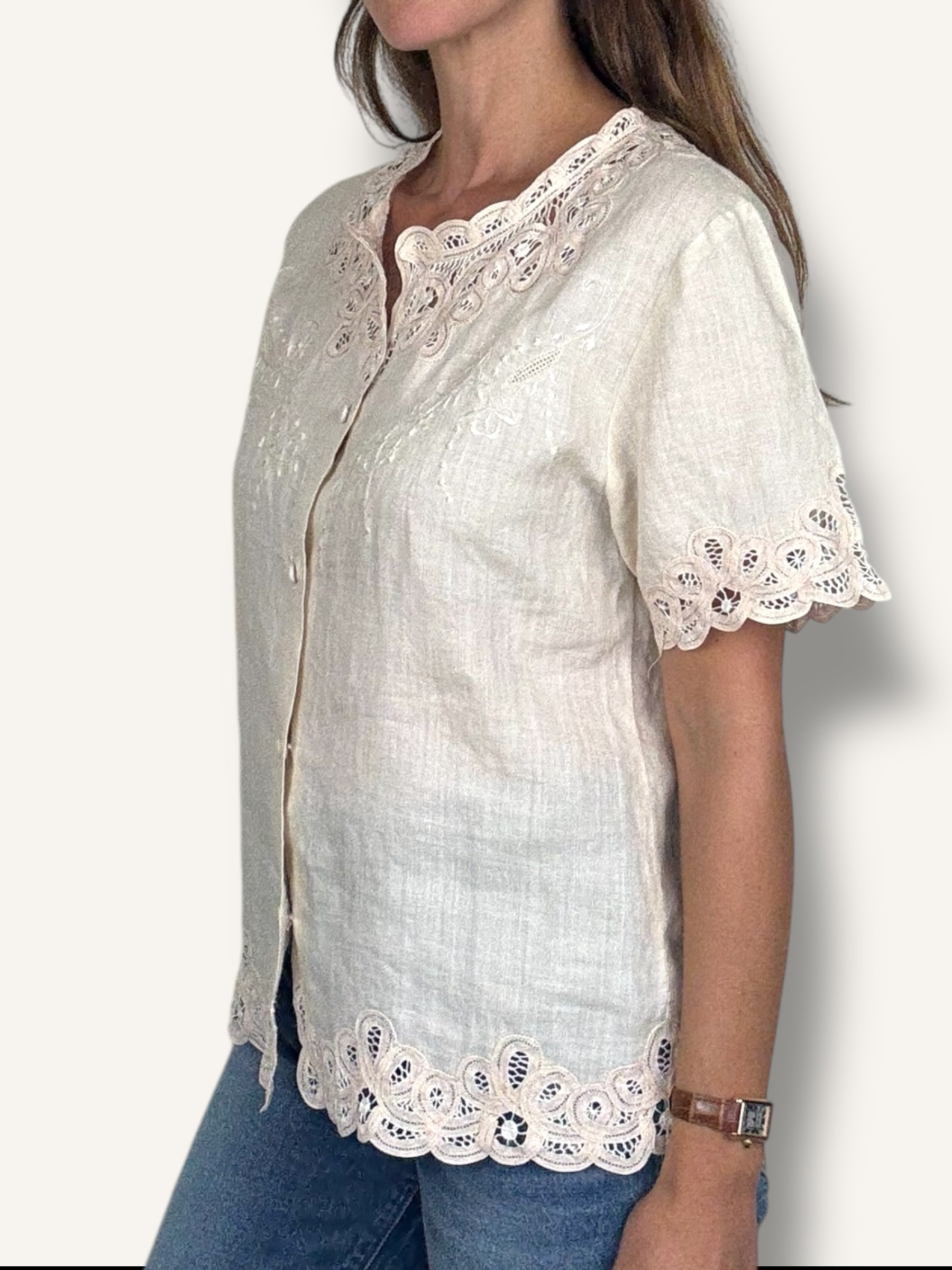 Vintage short-sleeve blouse from the 60's in a lightweight cotton-linen blend, featuring delicate tonal embroidery and openwork trim along the neckline, sleeves, and hem. The slightly fitted silhouette closes with pearlescent buttons down the front and has a softly structured drape. Scalloped edges add texture without feeling overly ornate.