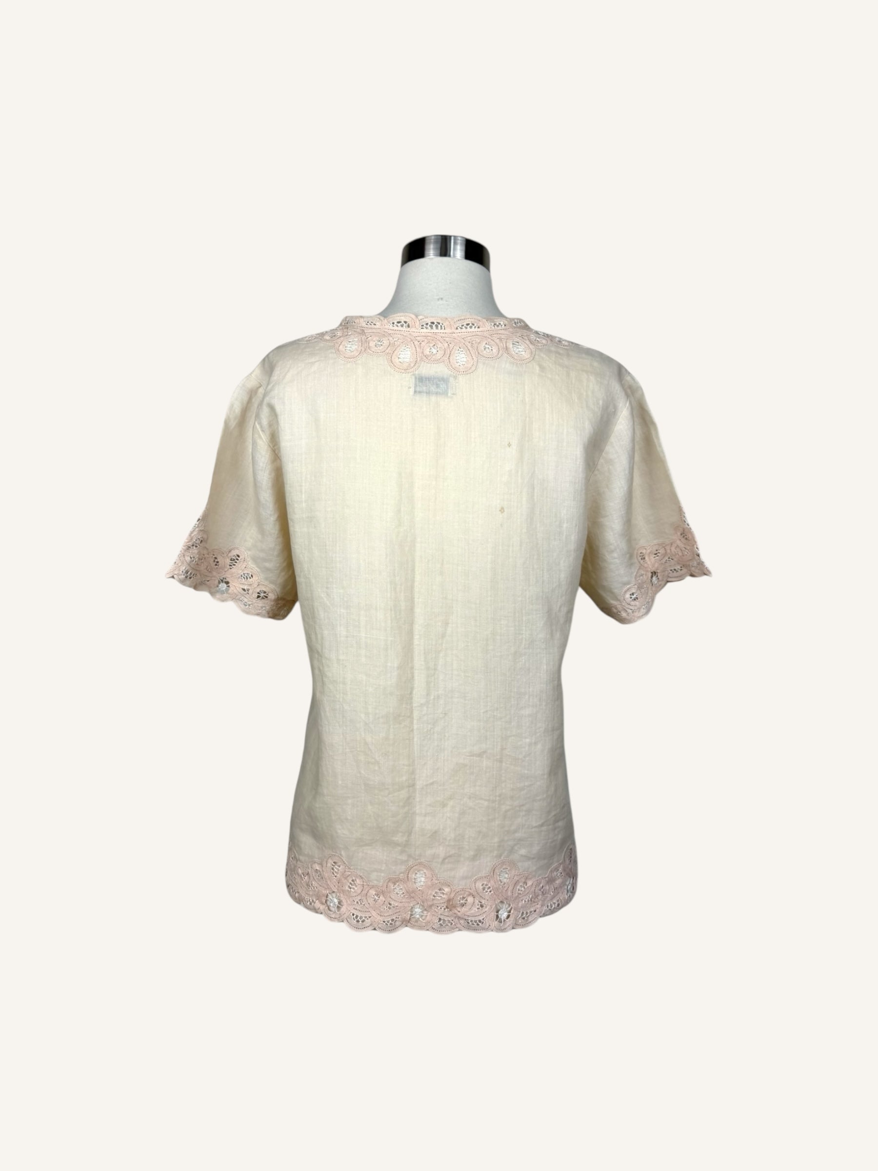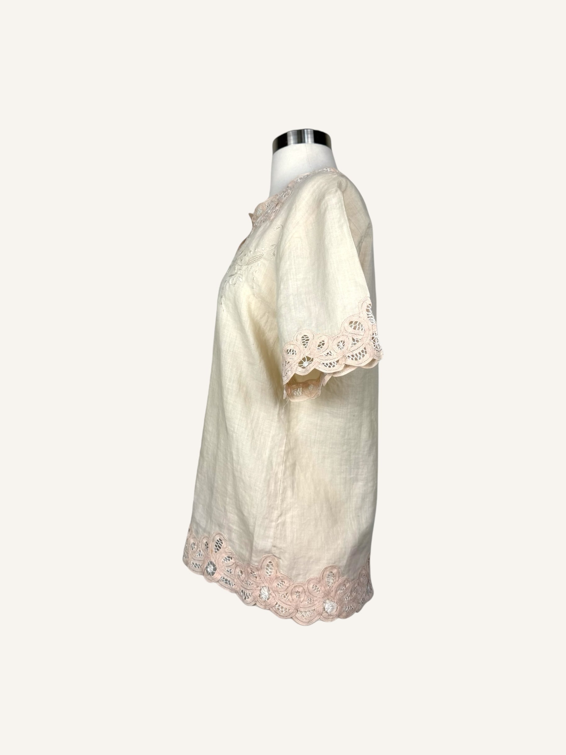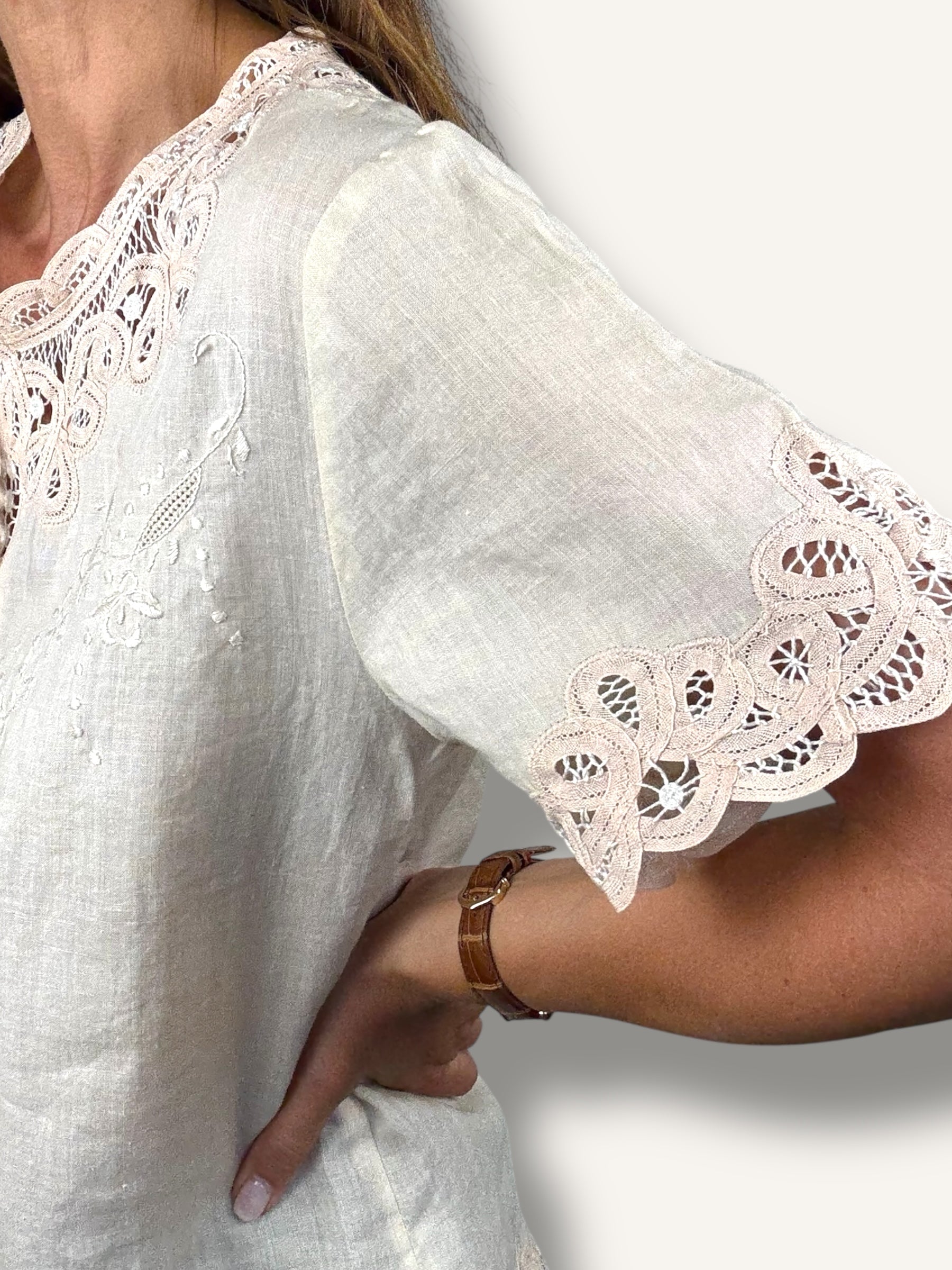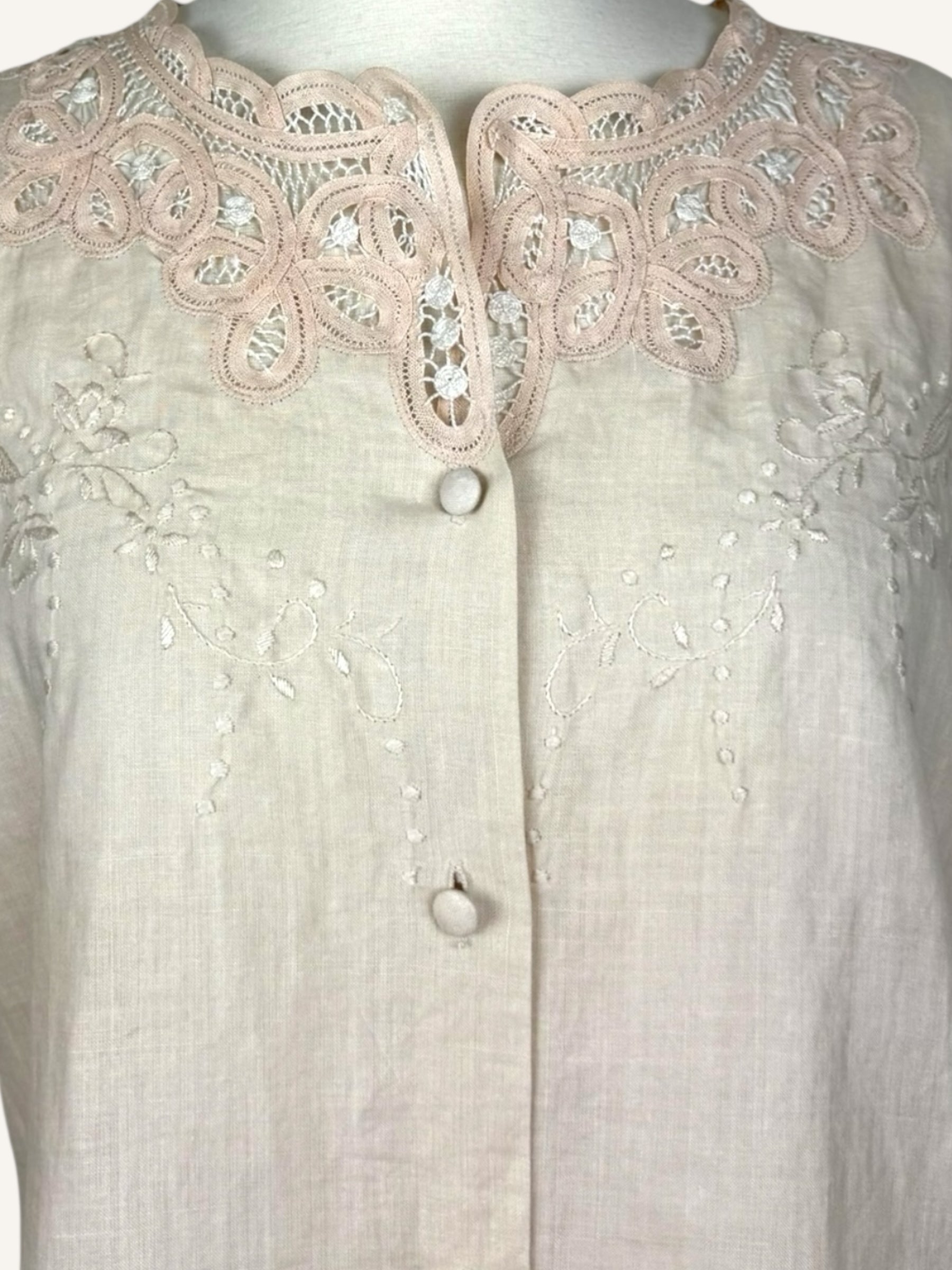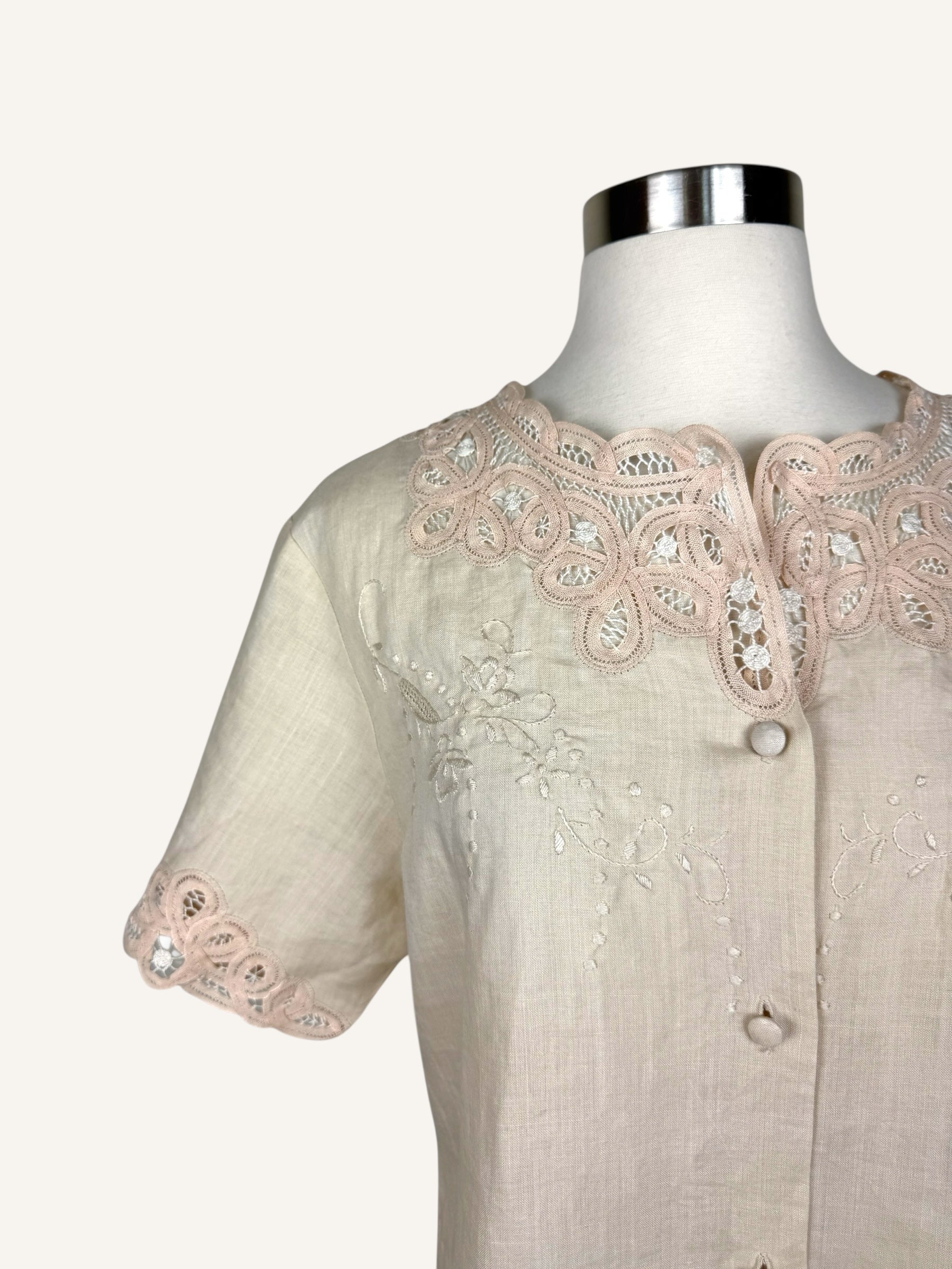 Vintage short-sleeve blouse from the 60's in a lightweight cotton-linen blend, featuring delicate tonal embroidery and openwork trim along the neckline, sleeves, and hem. The slightly fitted silhouette closes with pearlescent buttons down the front and has a softly structured drape. Scalloped edges add texture without feeling overly ornate.