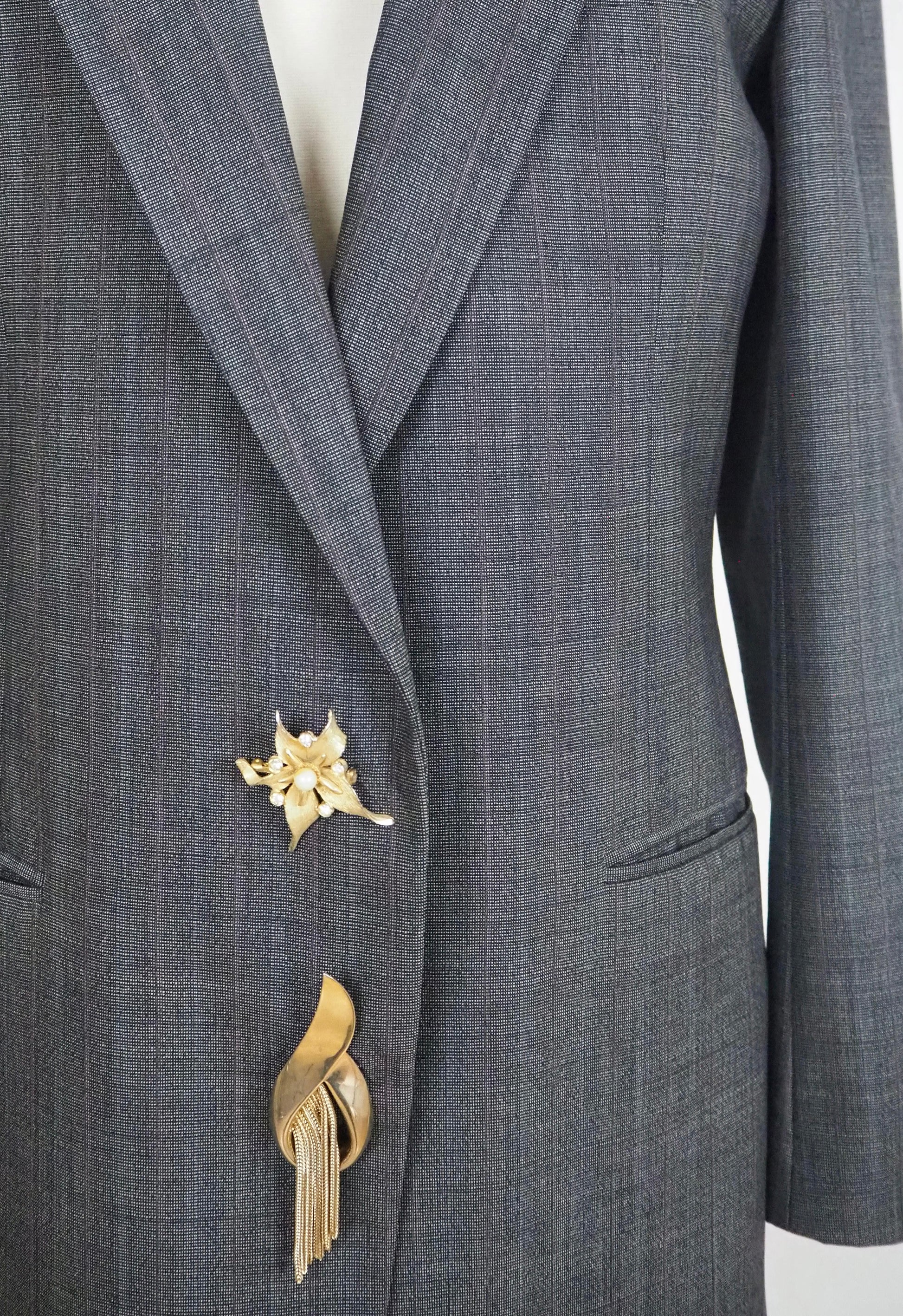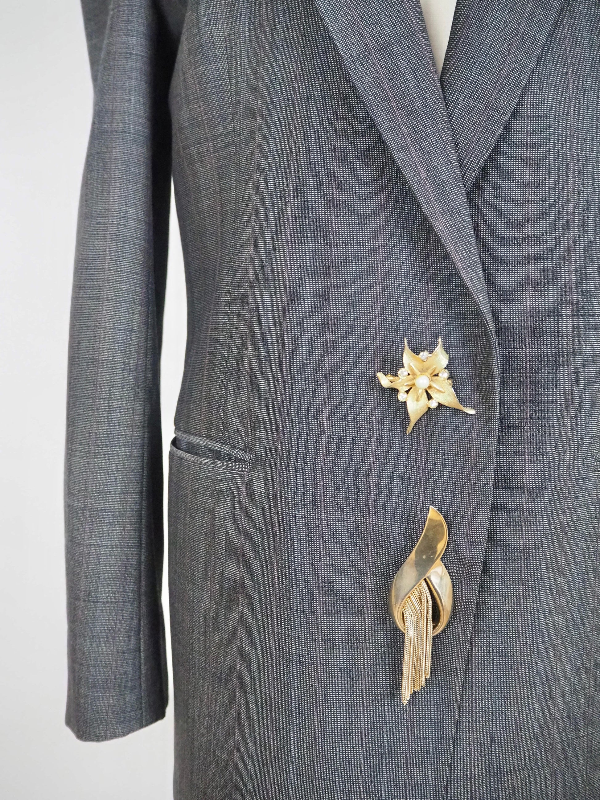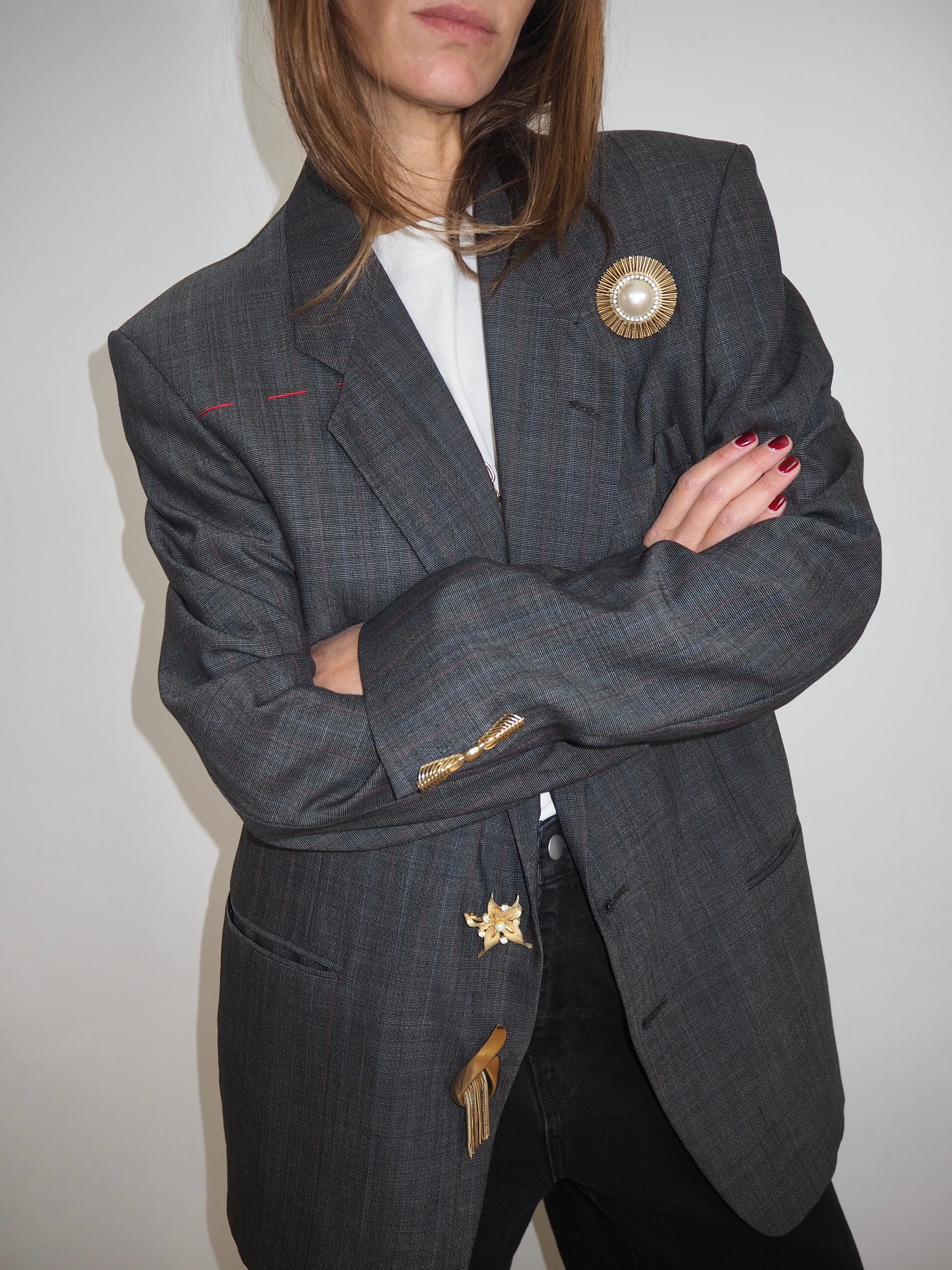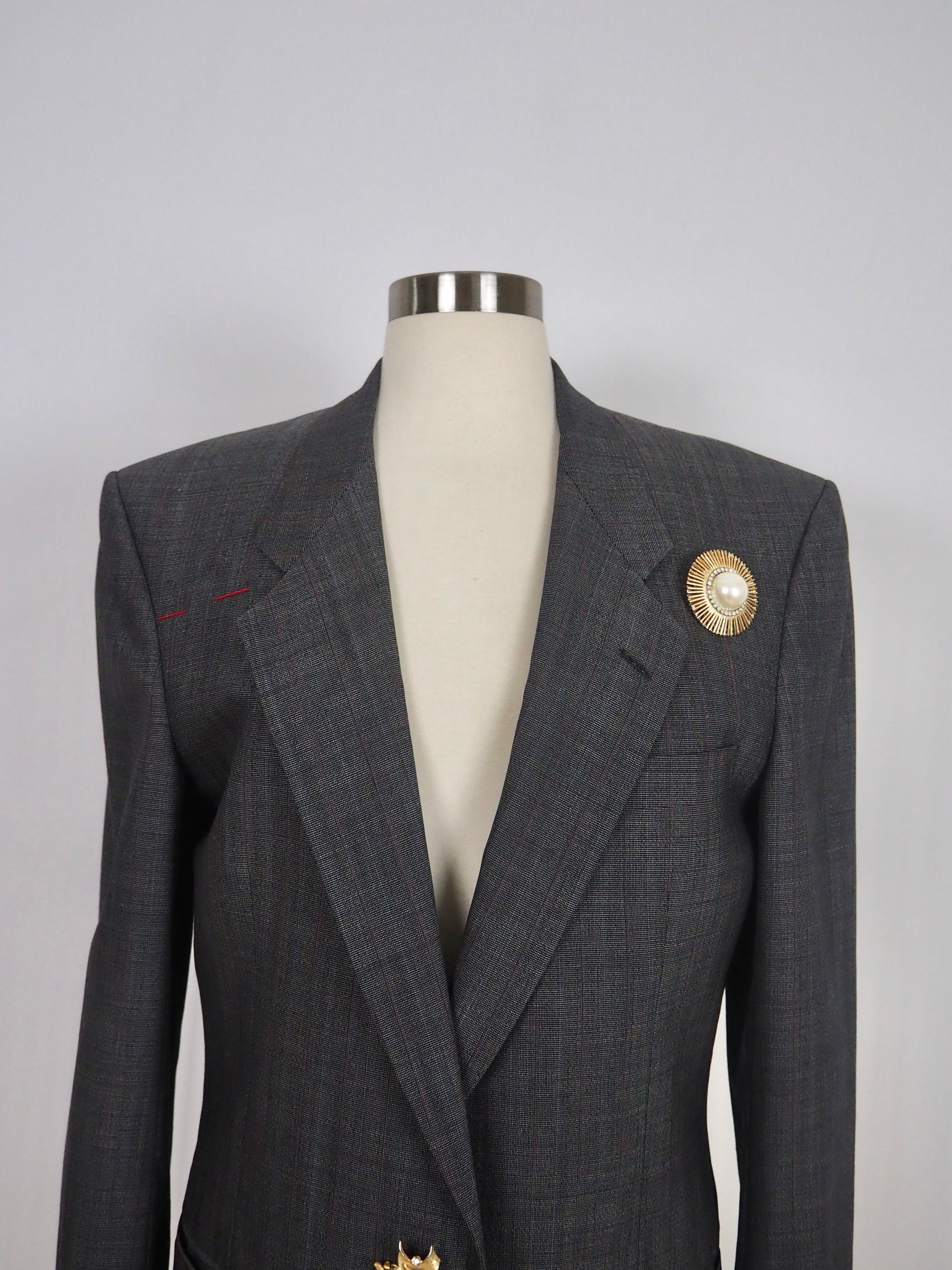 Vintage Burberry Gray Blazer adorned by Jen Wonders with Vintage Gold tone brooches and red stitching on top side as a sign of good fortune. The blazer is meant to stay open, but you can use the brooches to close if needed.