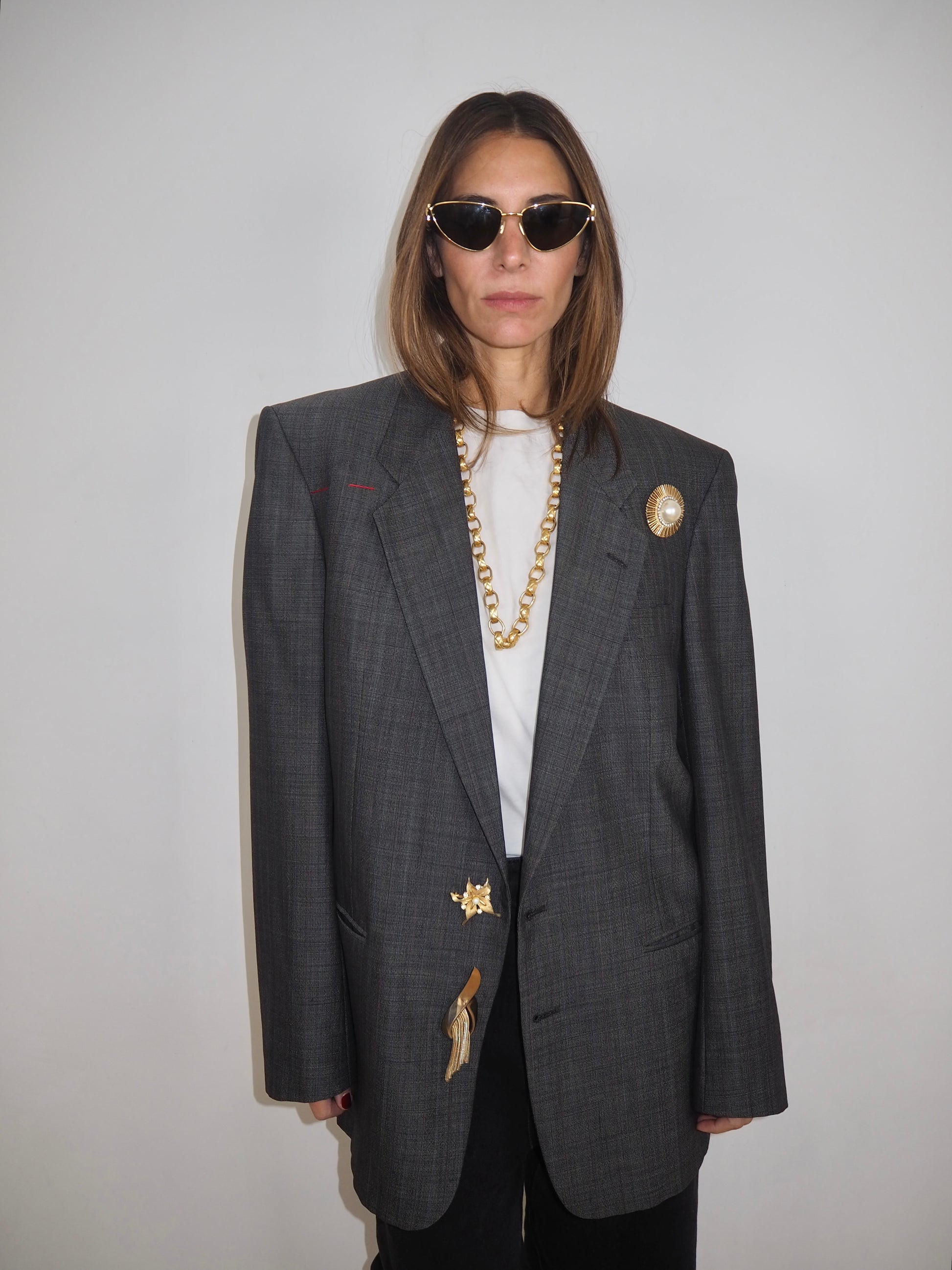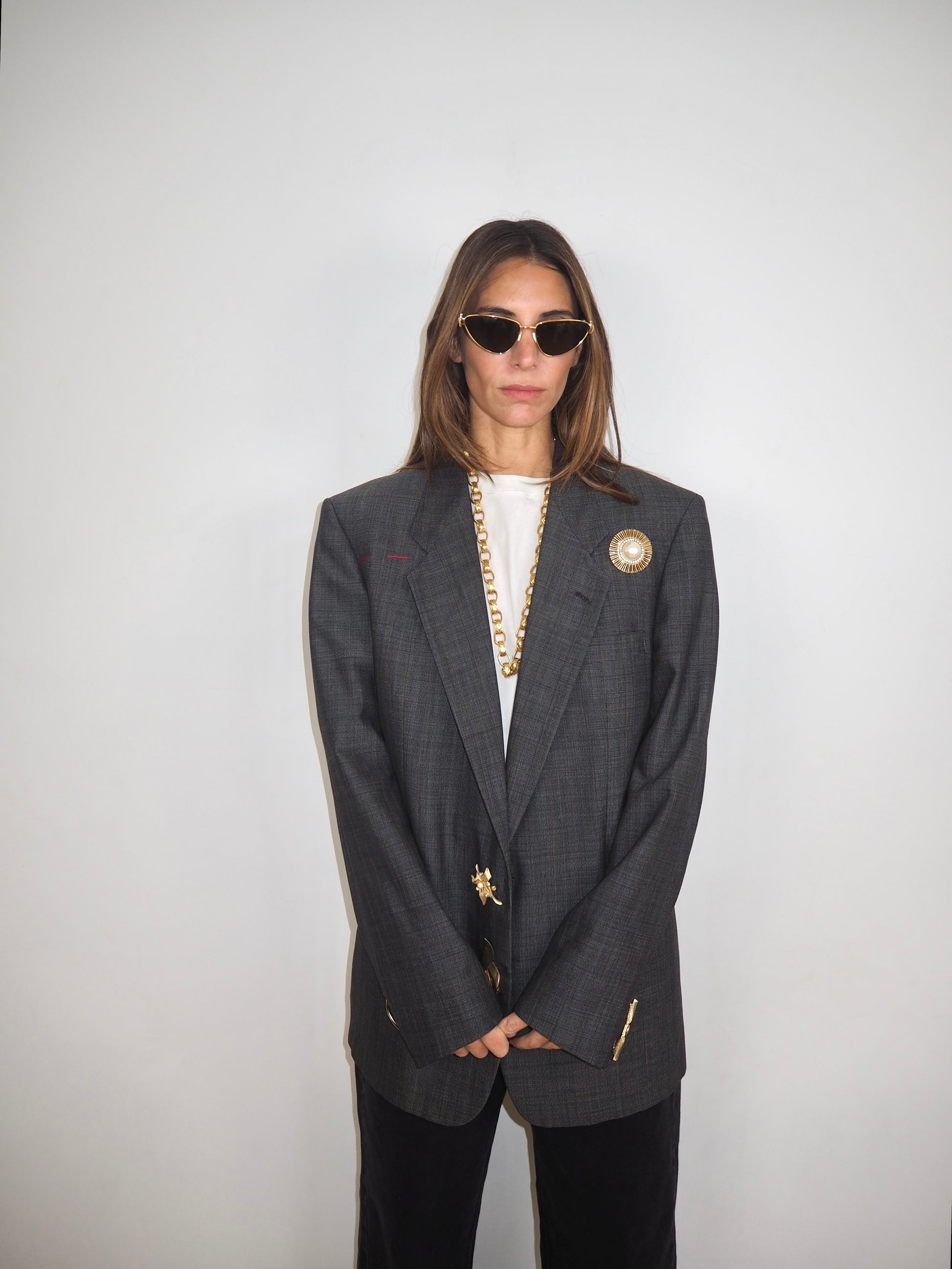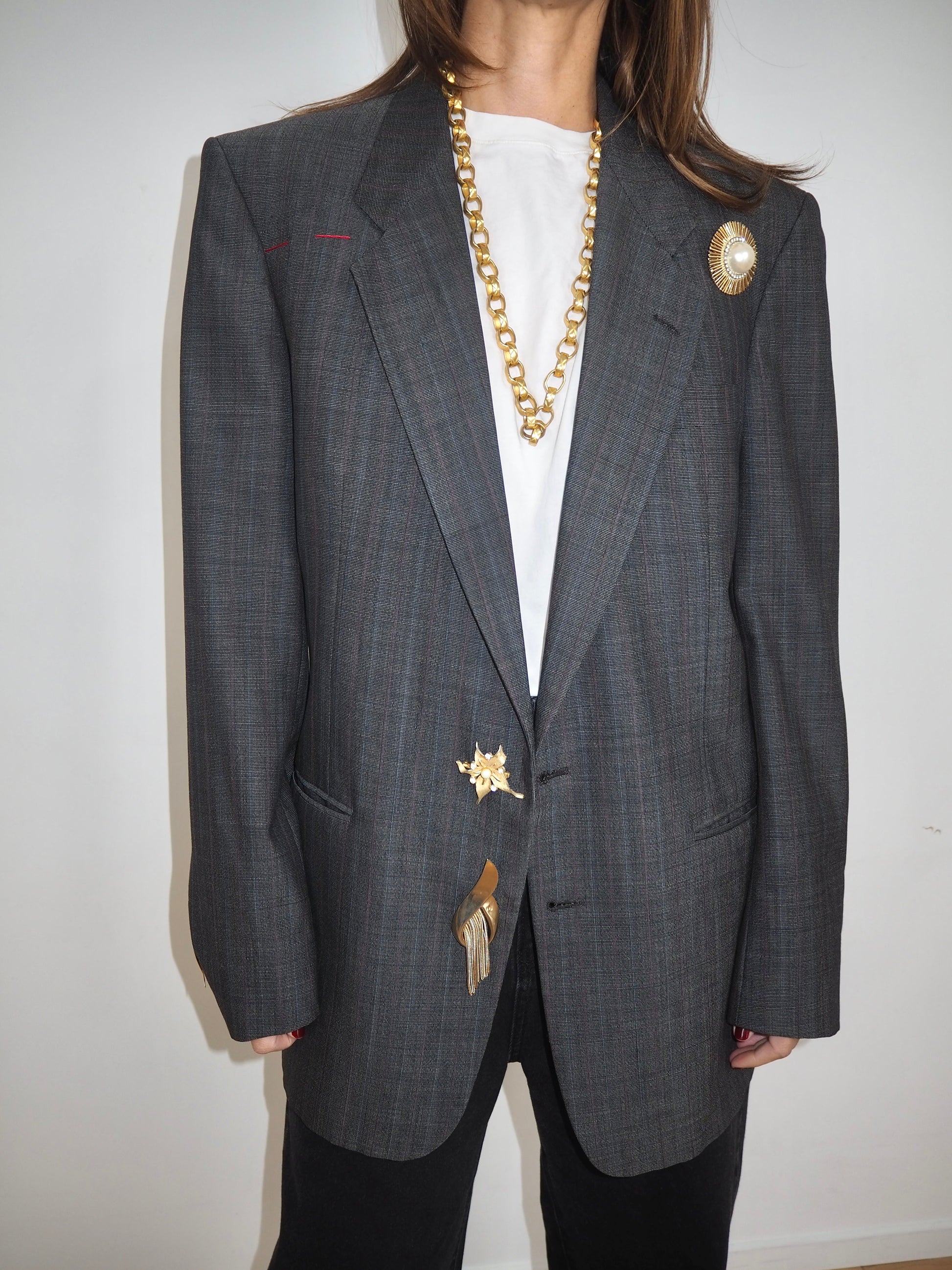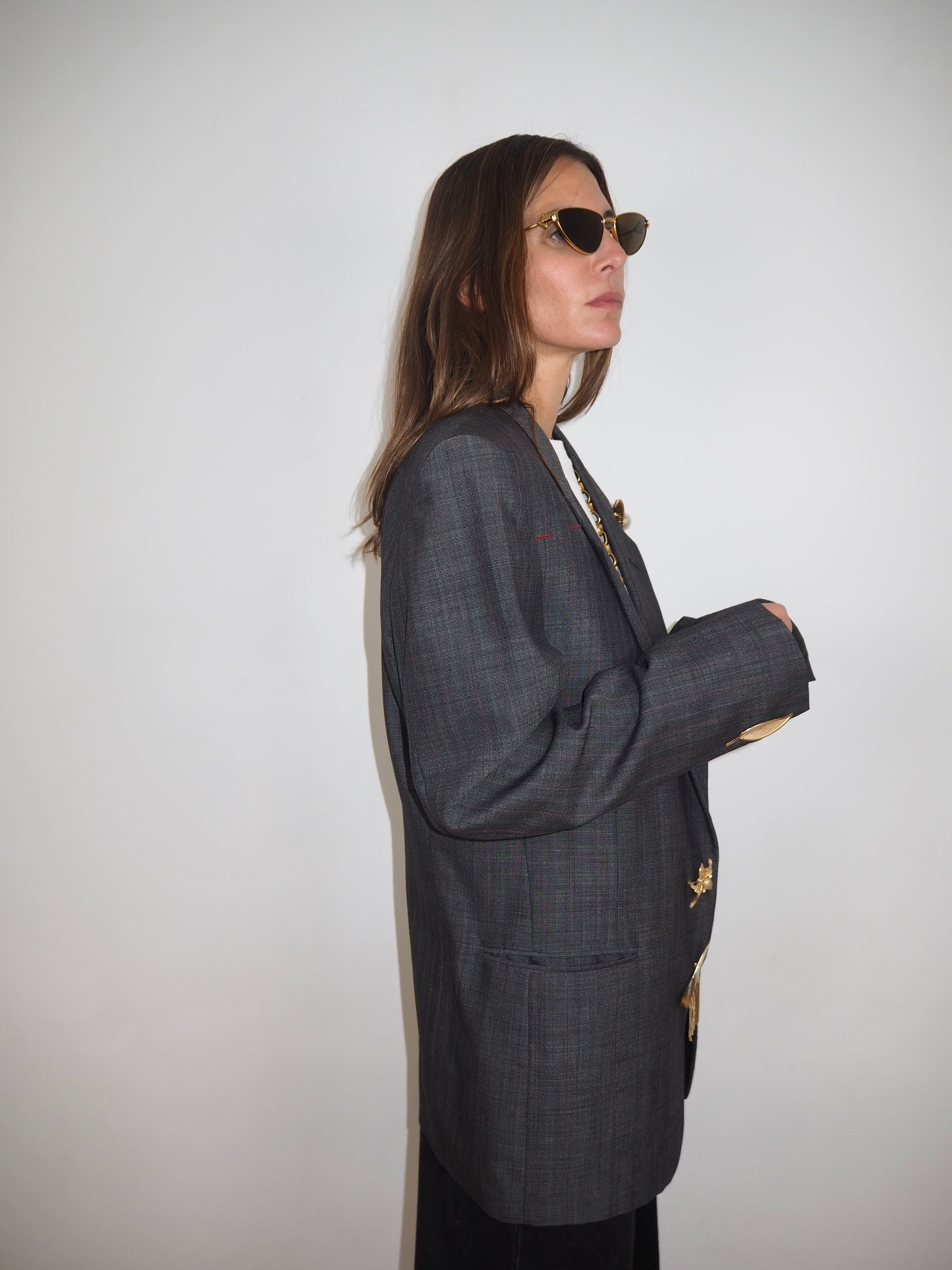 Vintage Burberry Gray Blazer adorned by Jen Wonders with Vintage Gold tone brooches and red stitching on top side as a sign of good fortune. The blazer is meant to stay open, but you can use the brooches to close if needed.