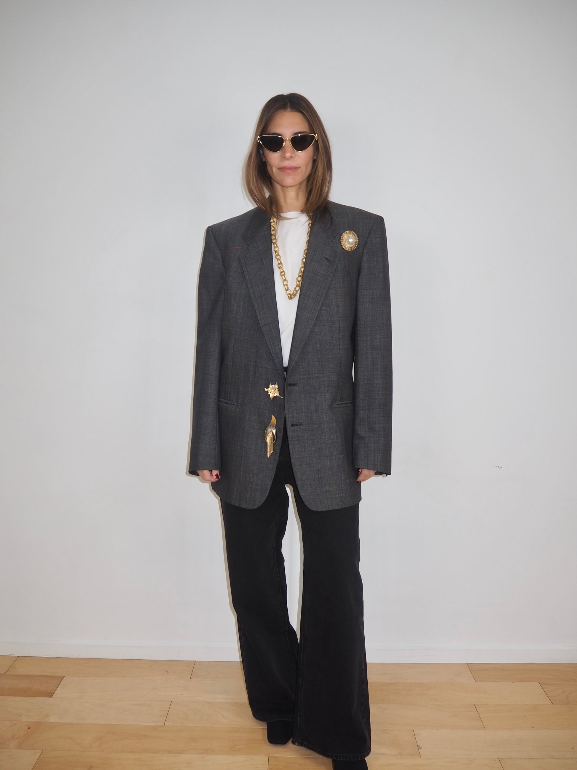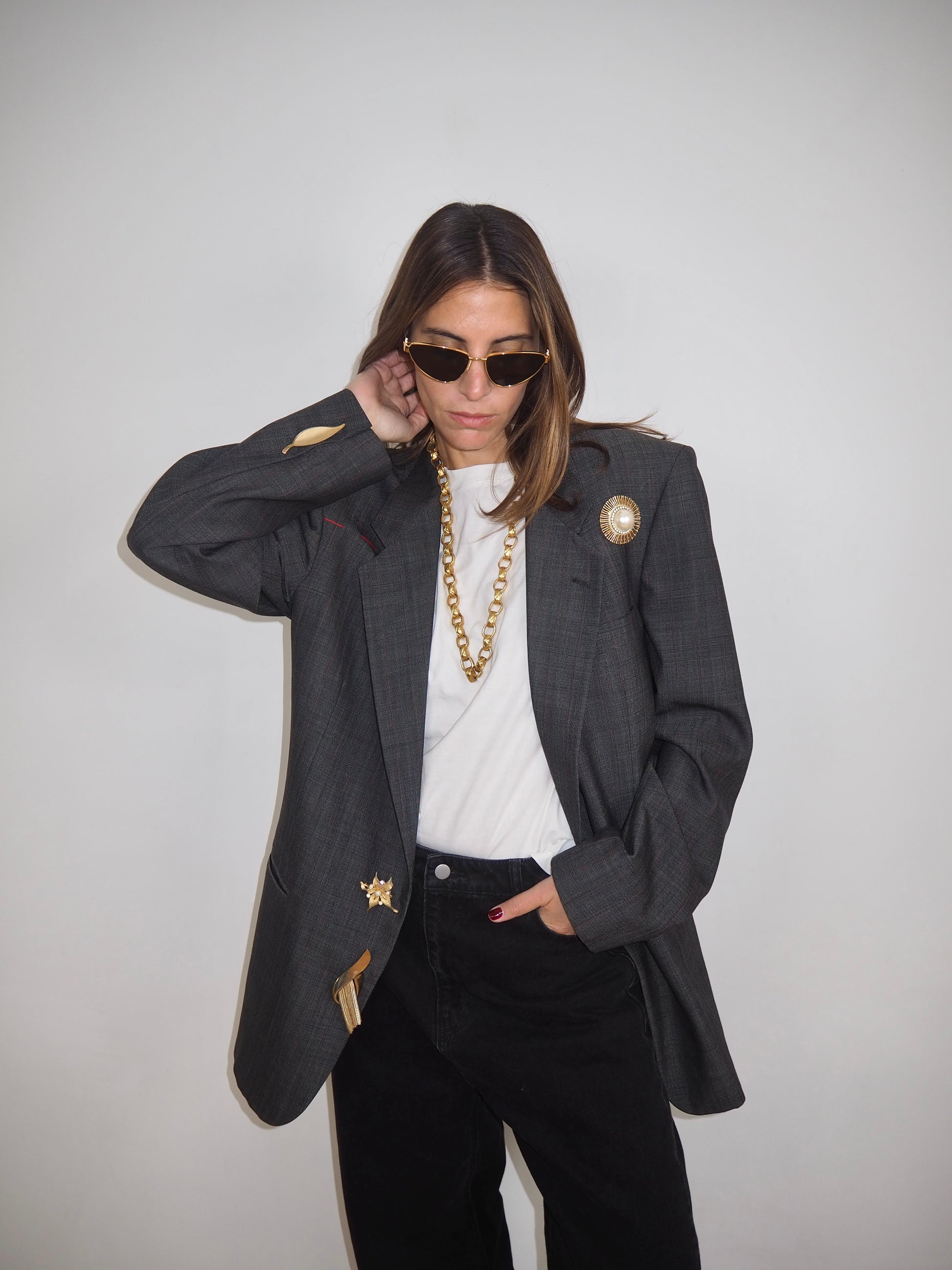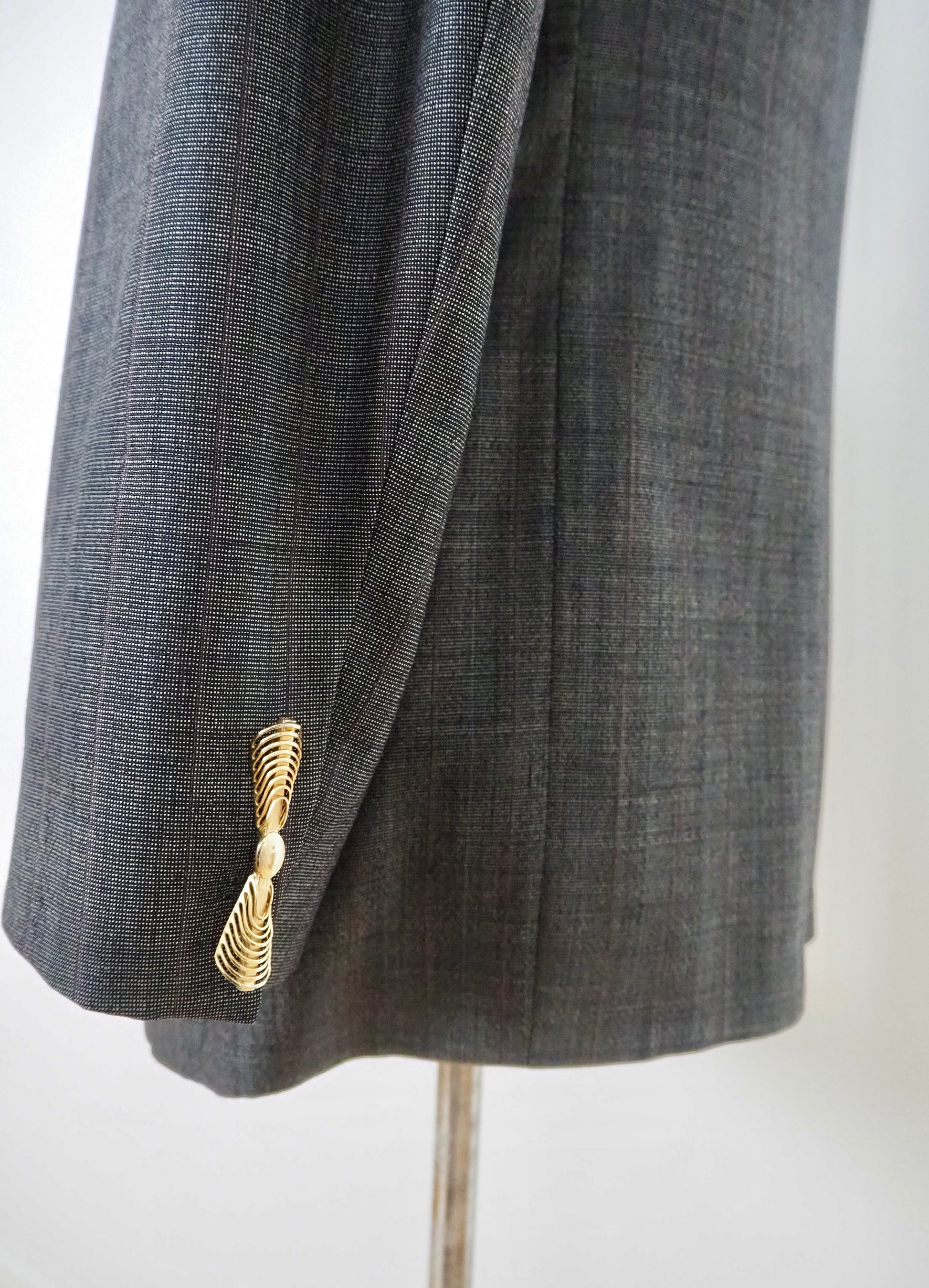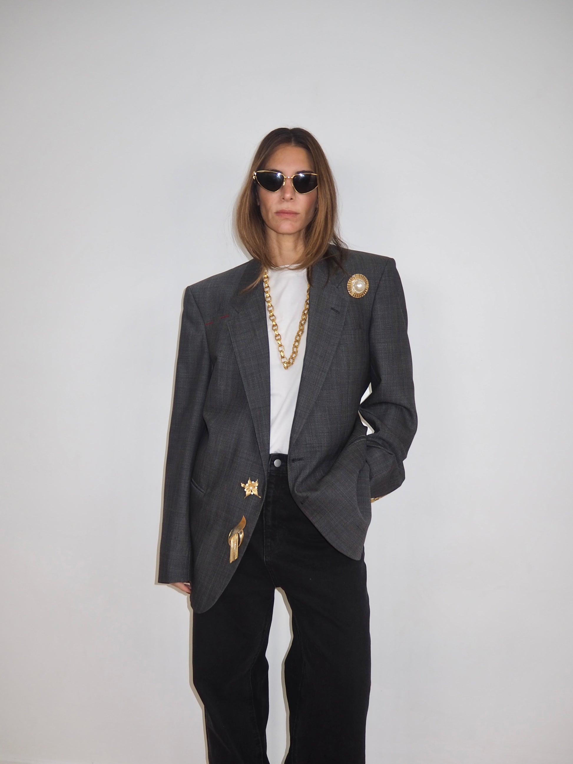 Vintage Burberry Gray Blazer adorned by Jen Wonders with Vintage Gold tone brooches and red stitching on top side as a sign of good fortune. The blazer is meant to stay open, but you can use the brooches to close if needed.