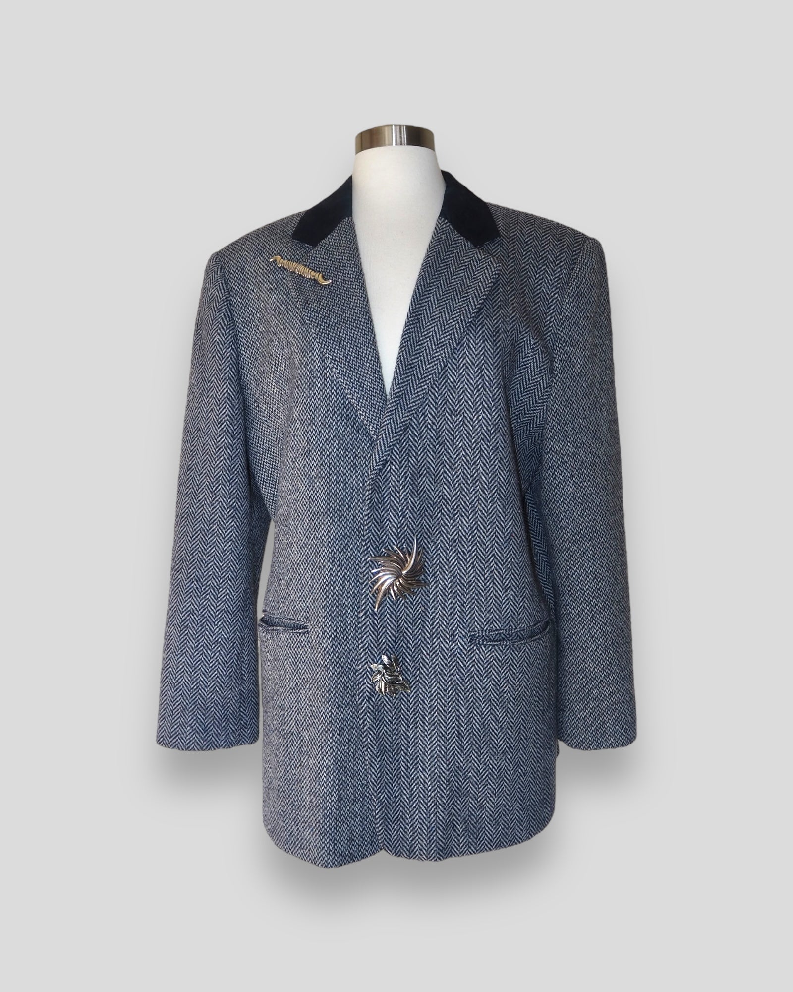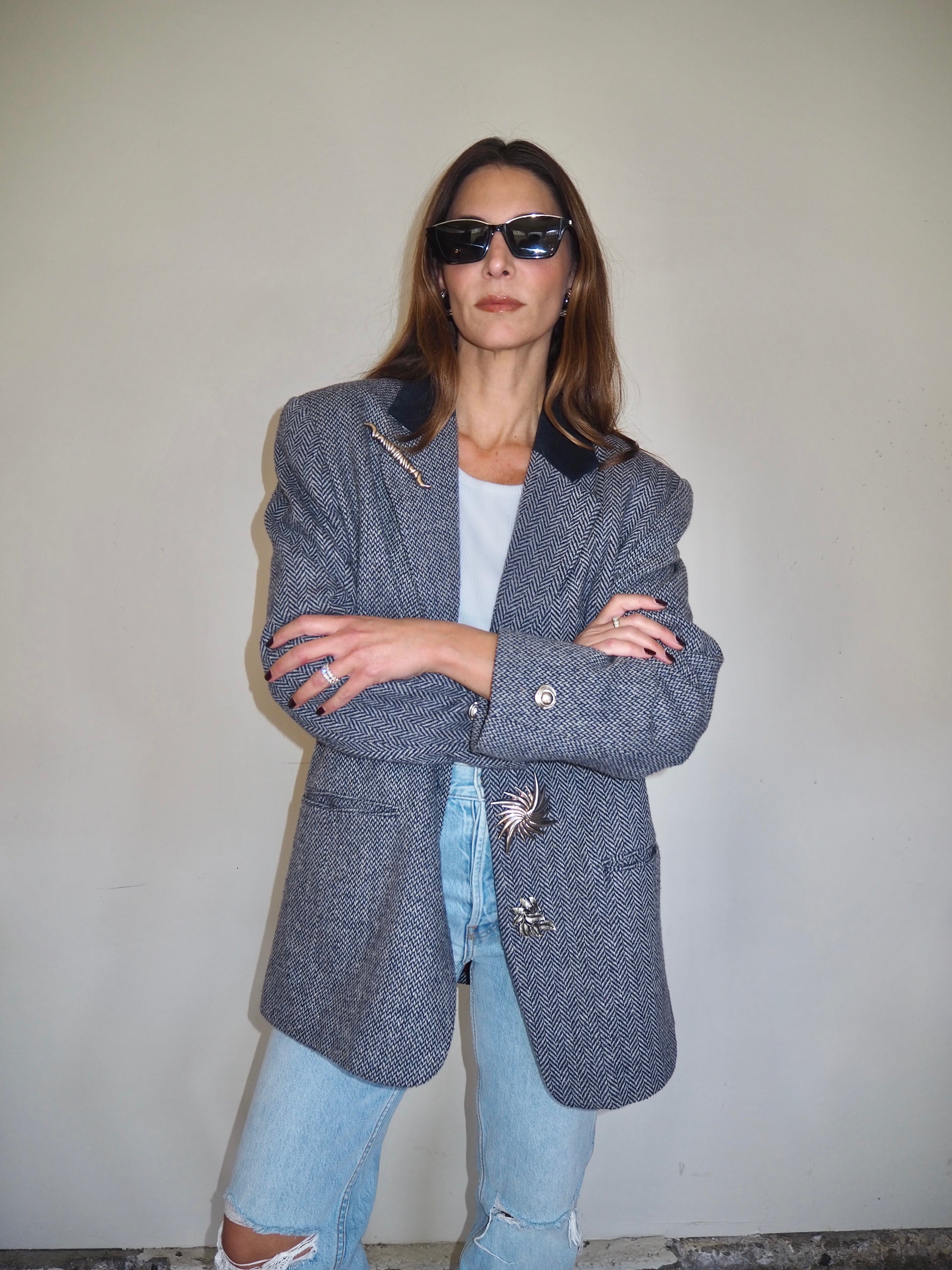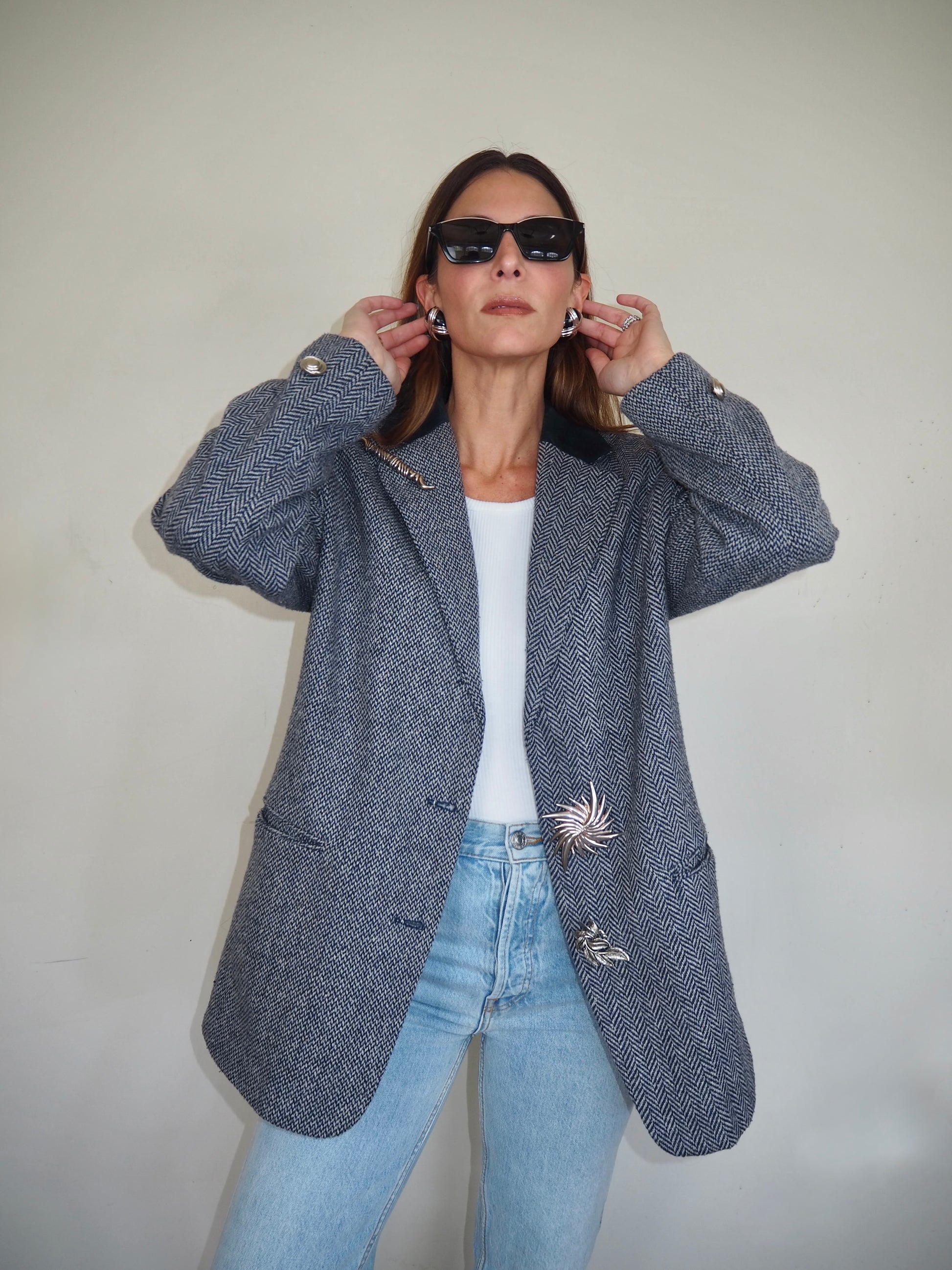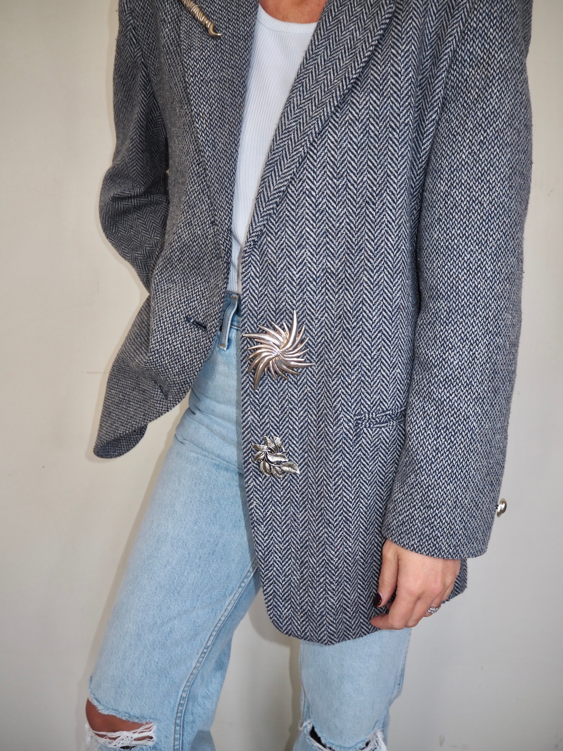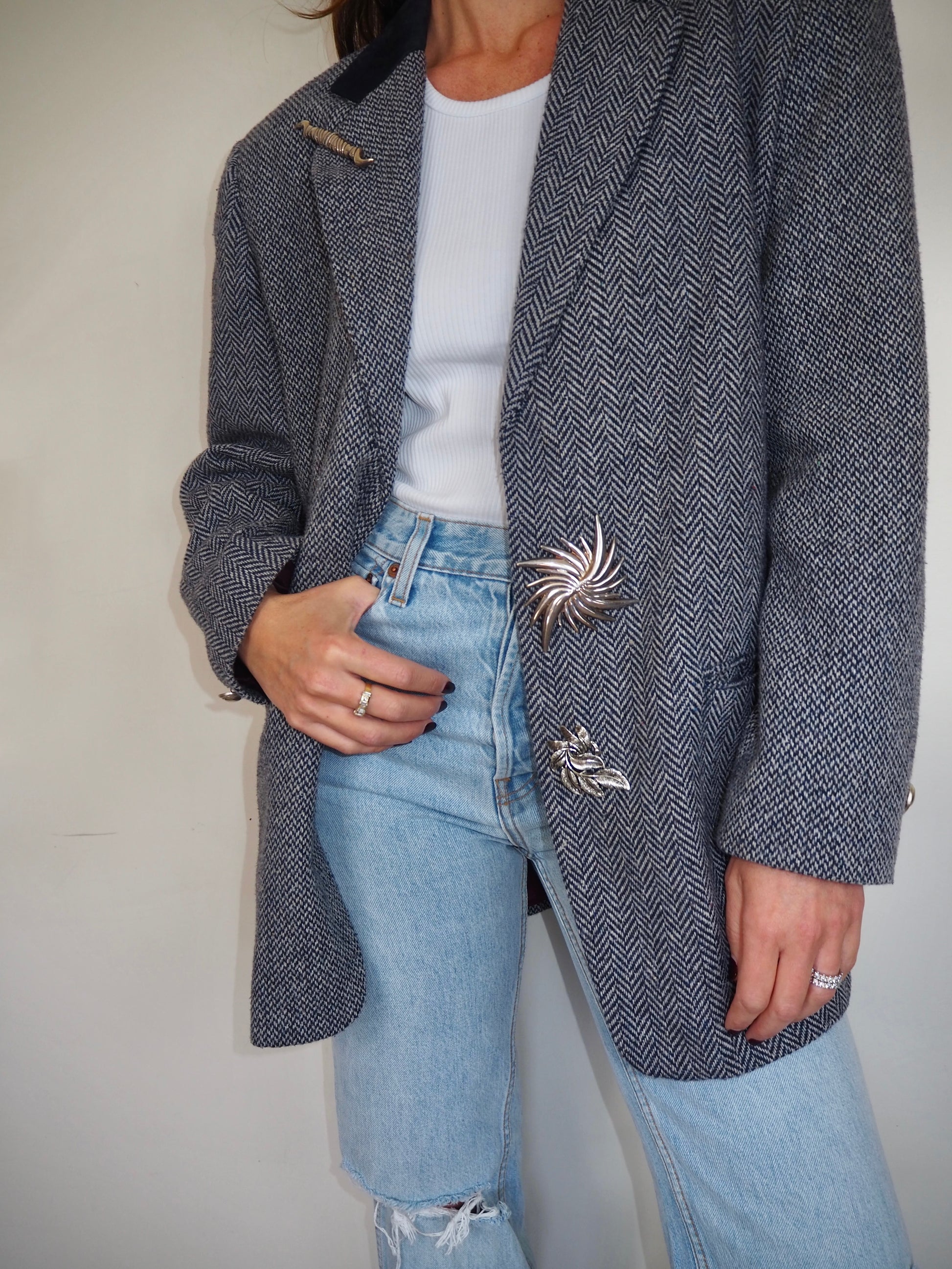 One of a Kind Vintage Oversized Navy Herringbone Wool Blazer with Suede collar adorned by Jen Wonders with Vintage silver brooches and Vintage silver Sleeves buttons. The blazer is meant to stay open, but you can use the brooches to close if needed.