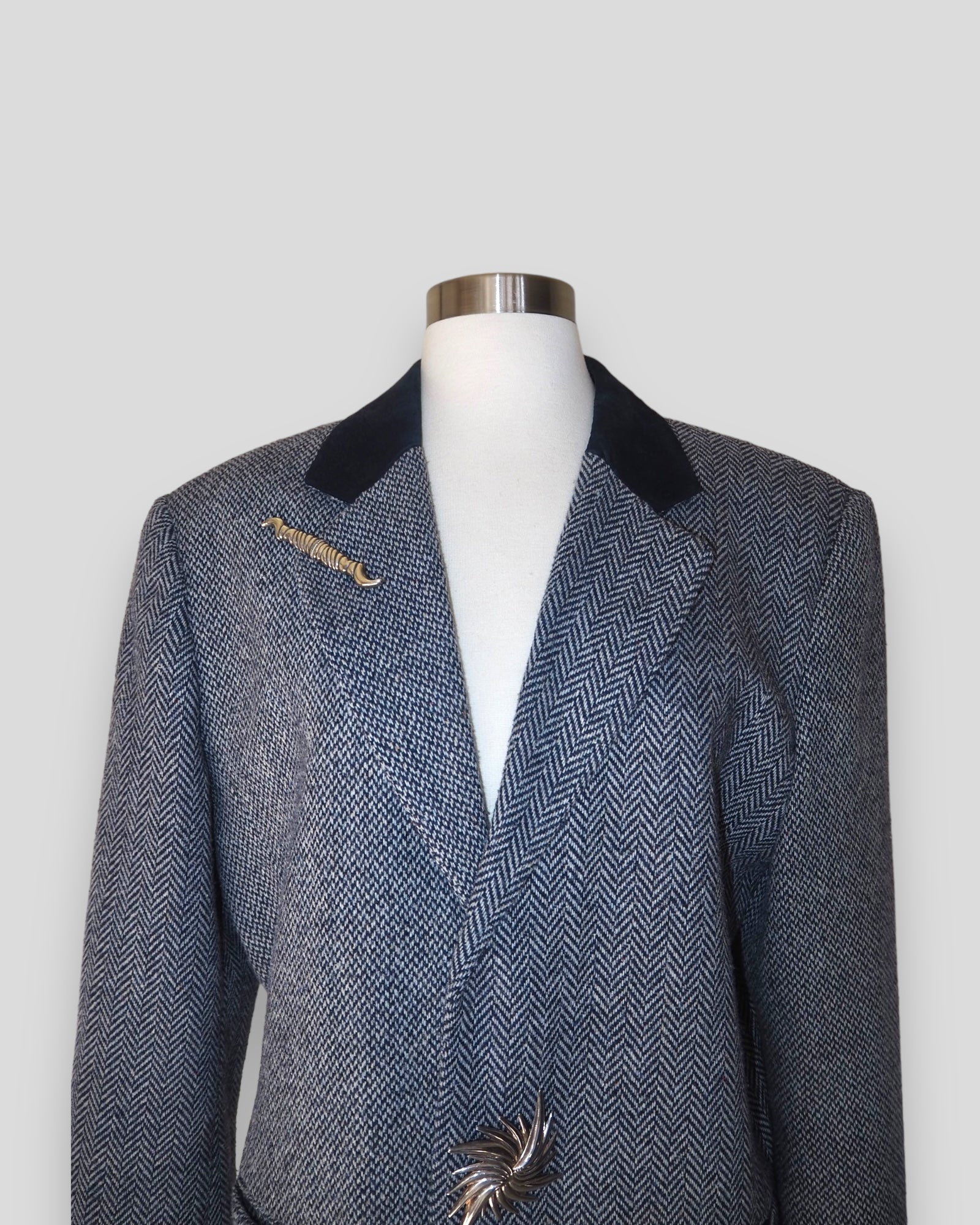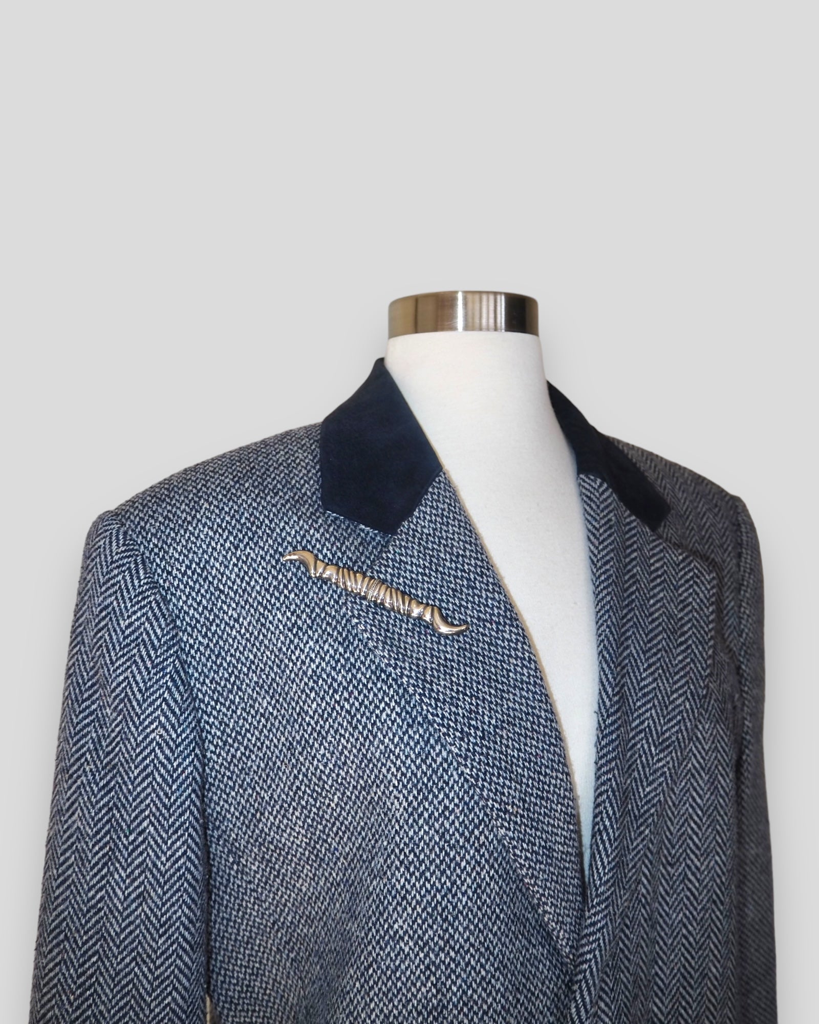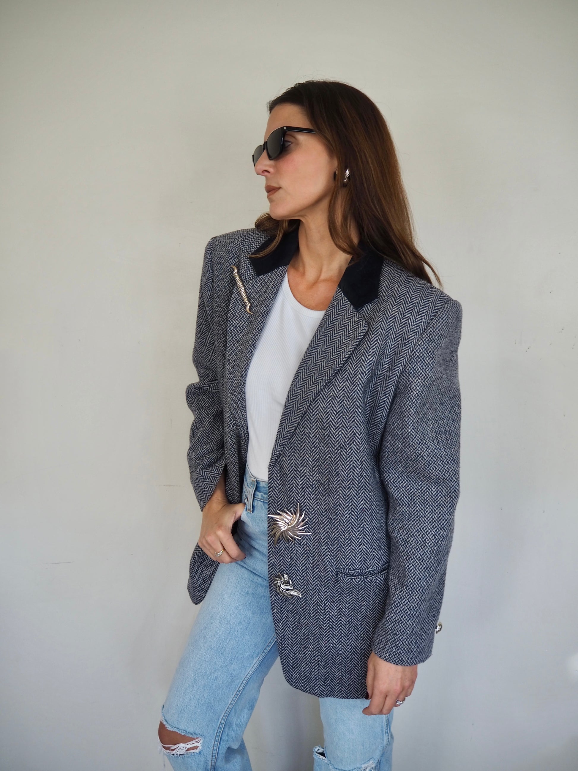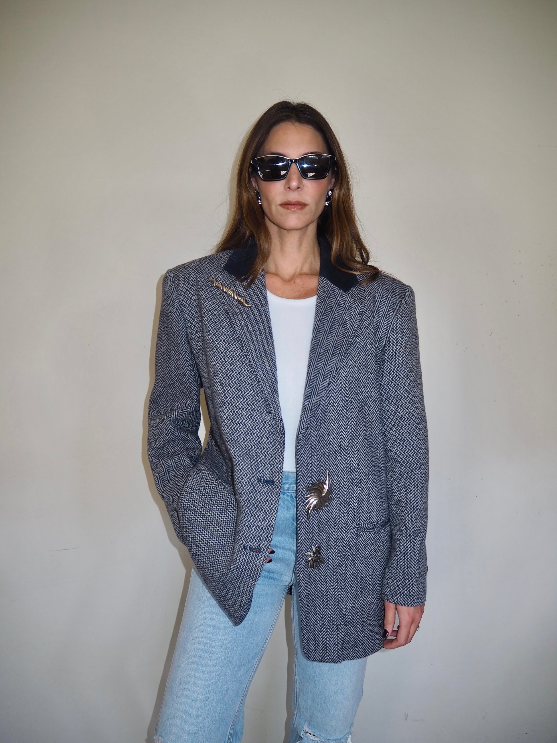 One of a Kind Vintage Oversized Navy Herringbone Wool Blazer with Suede collar adorned by Jen Wonders with Vintage silver brooches and Vintage silver Sleeves buttons. The blazer is meant to stay open, but you can use the brooches to close if needed.