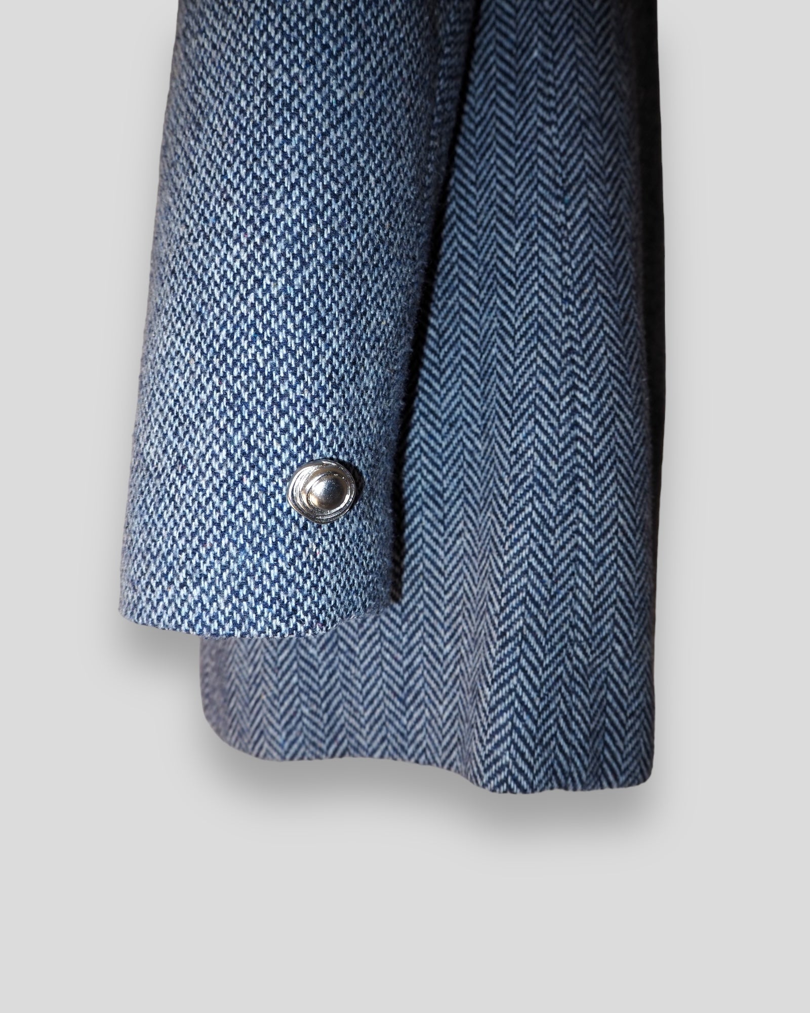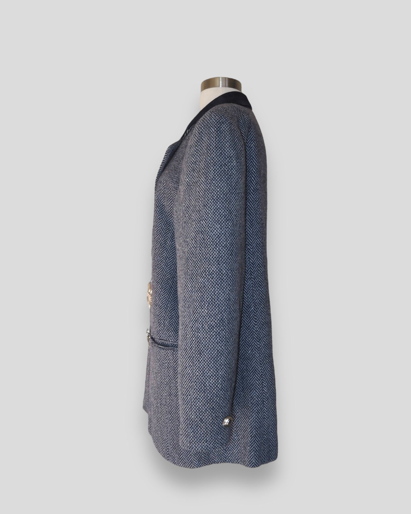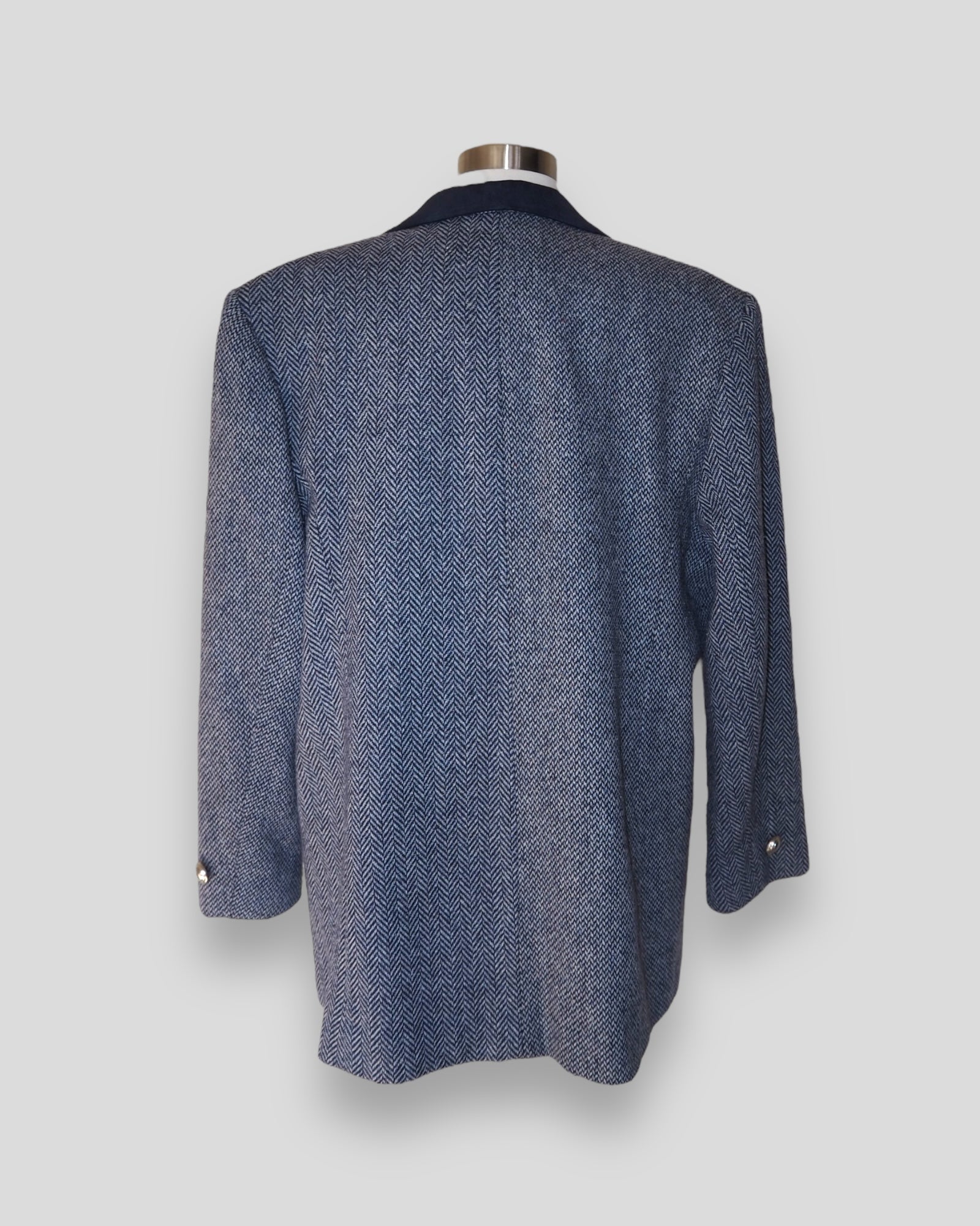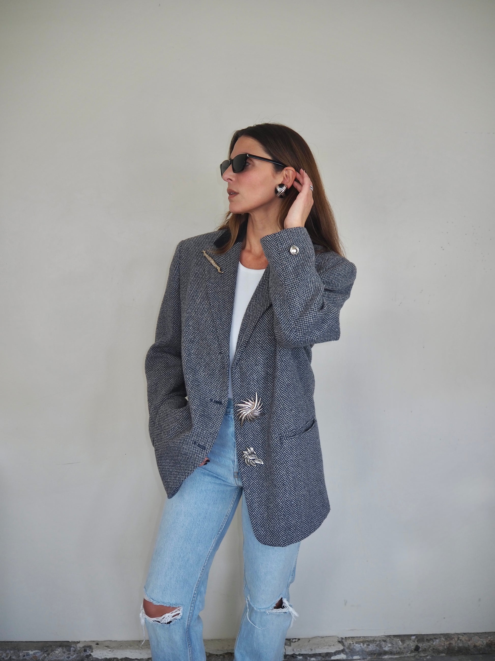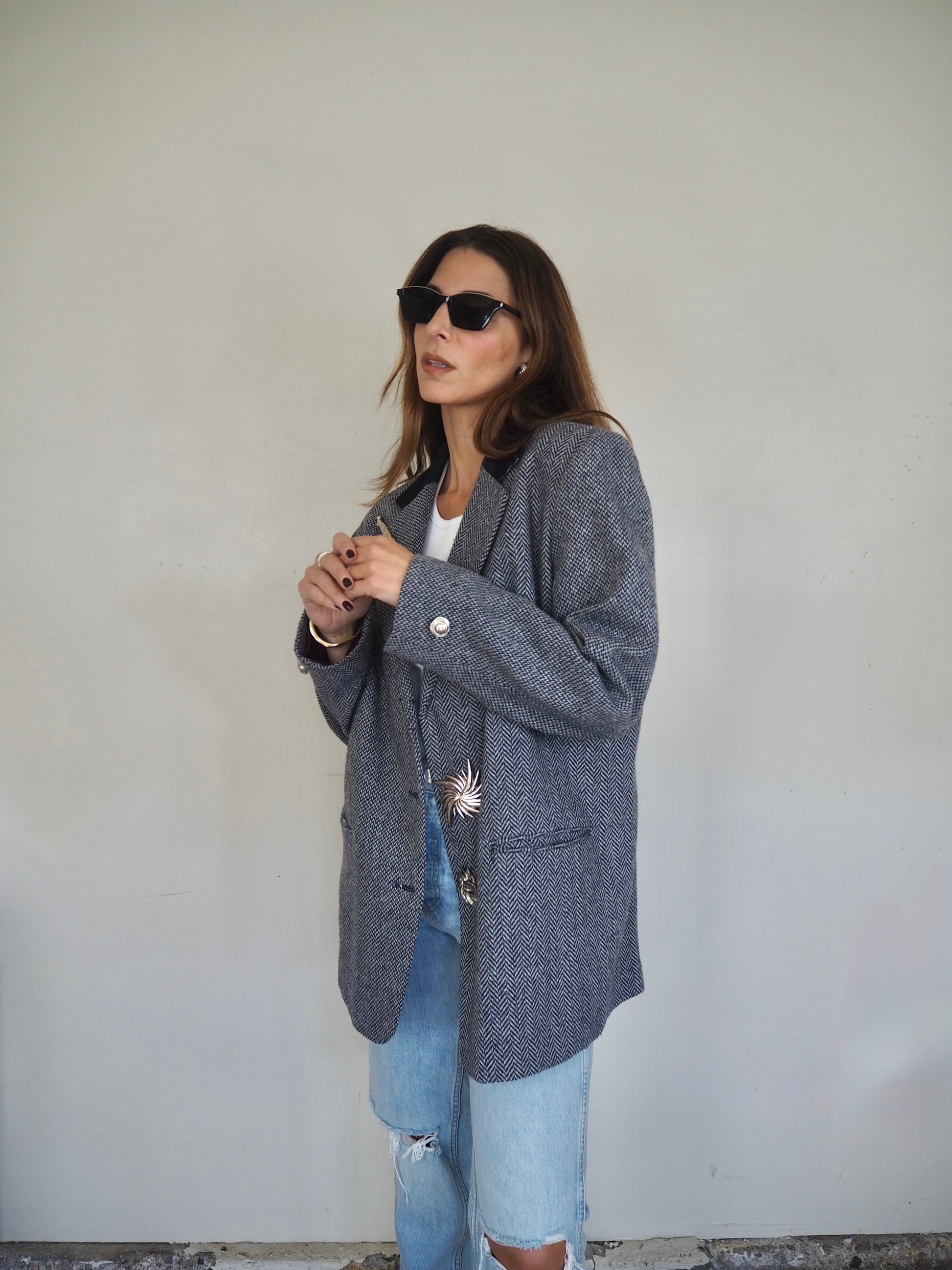 One of a Kind Vintage Oversized Navy Herringbone Wool Blazer with Suede collar adorned by Jen Wonders with Vintage silver brooches and Vintage silver Sleeves buttons. The blazer is meant to stay open, but you can use the brooches to close if needed.