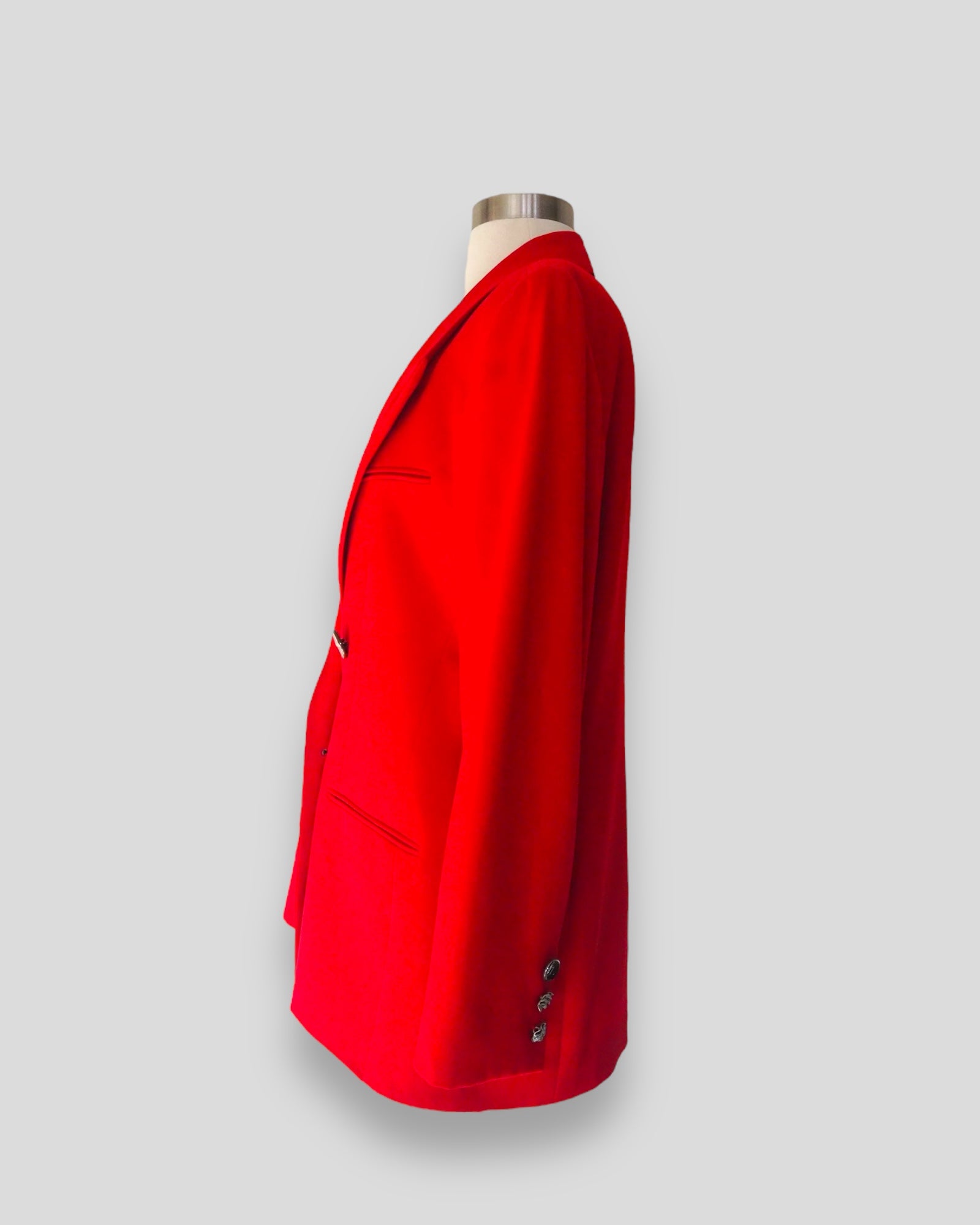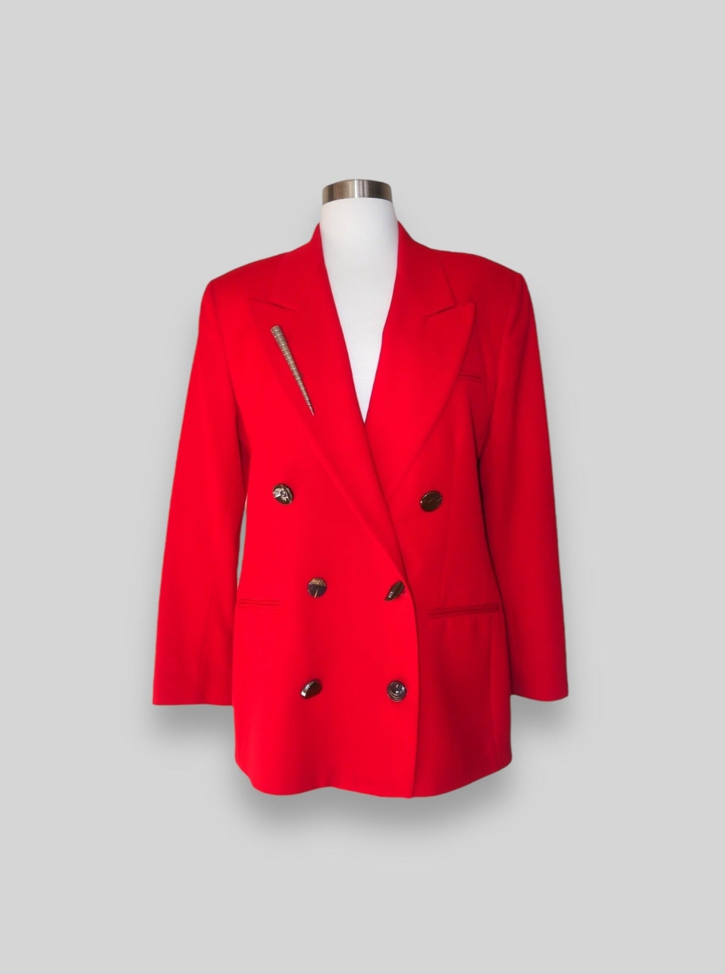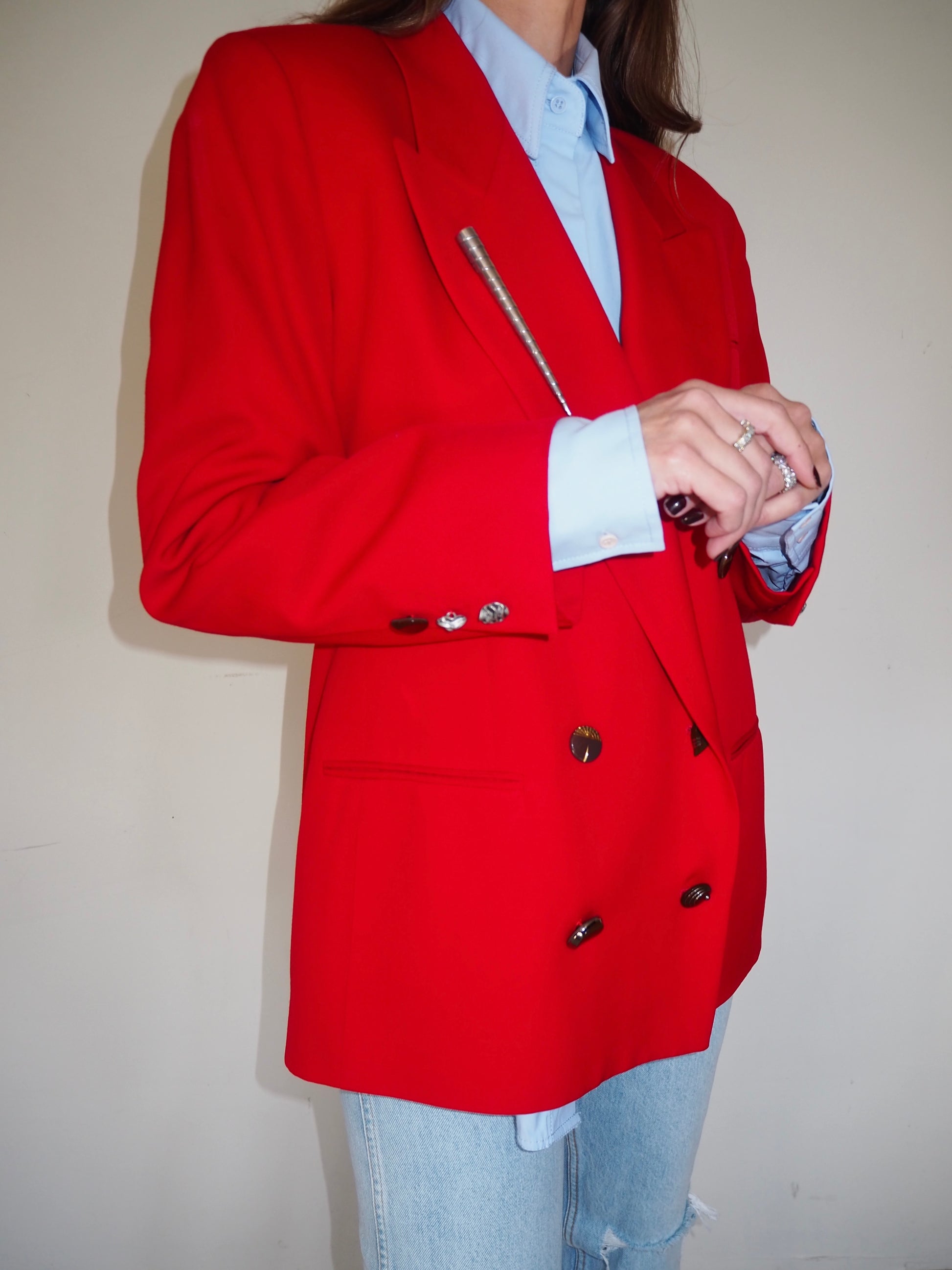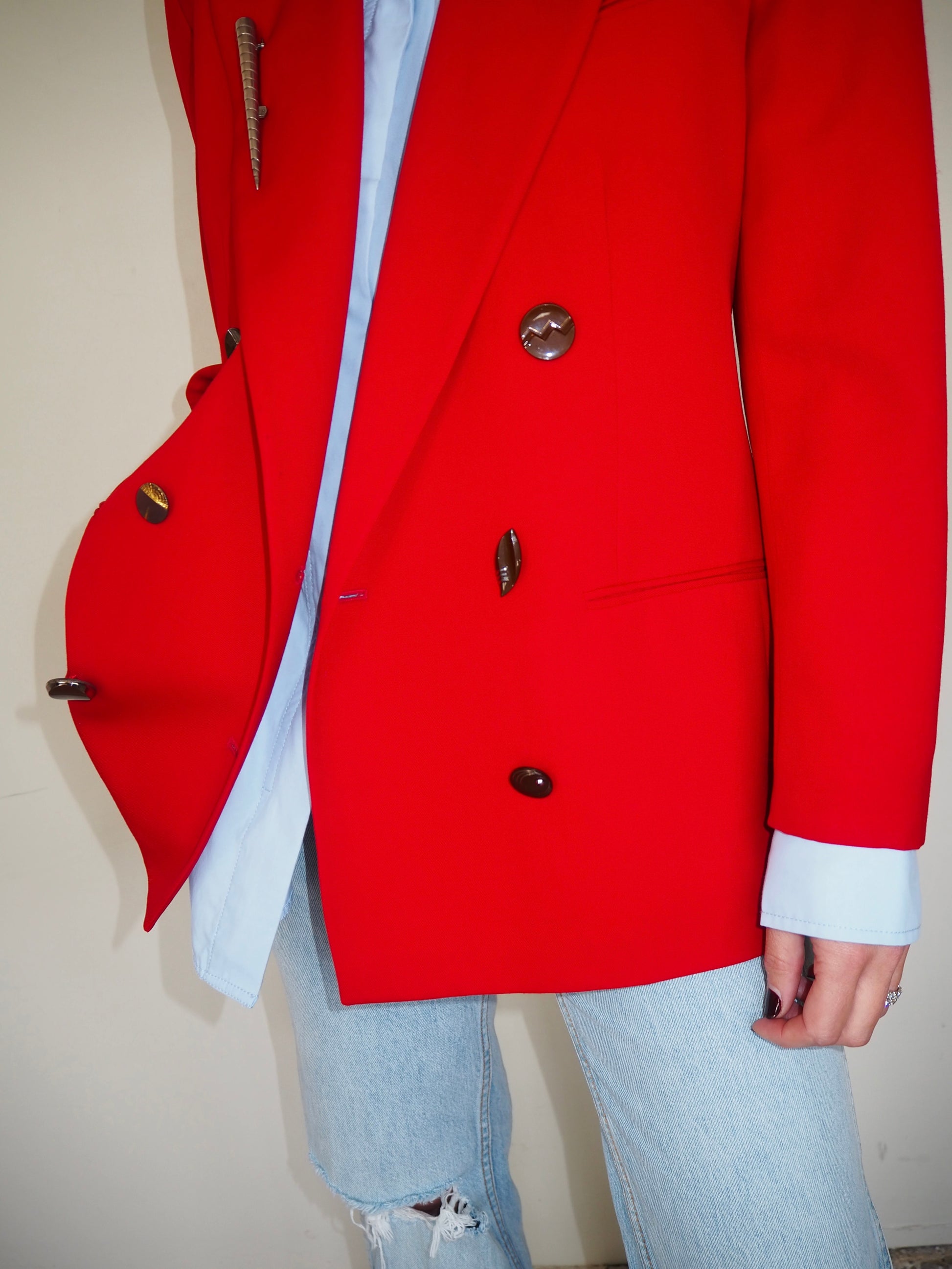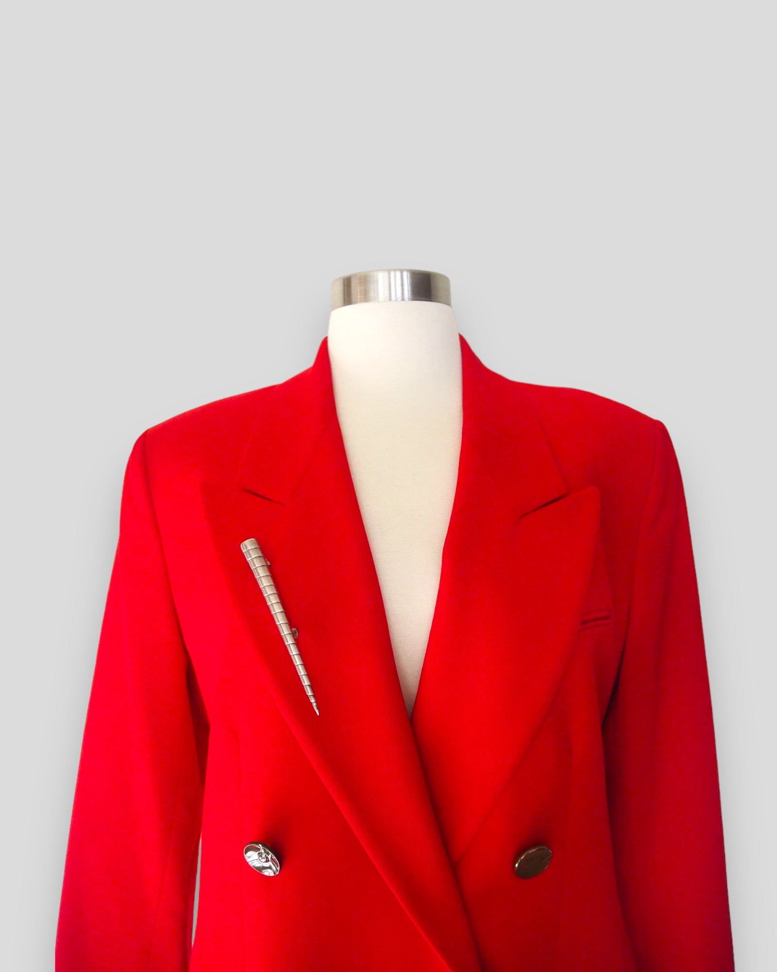 One of a Kind Vintage double breasted Red Wool Blazer adorned by Jen Wonders with Vintage silver brooch on lapel and rare Vintage Brown with Silver and gold accents buttons.