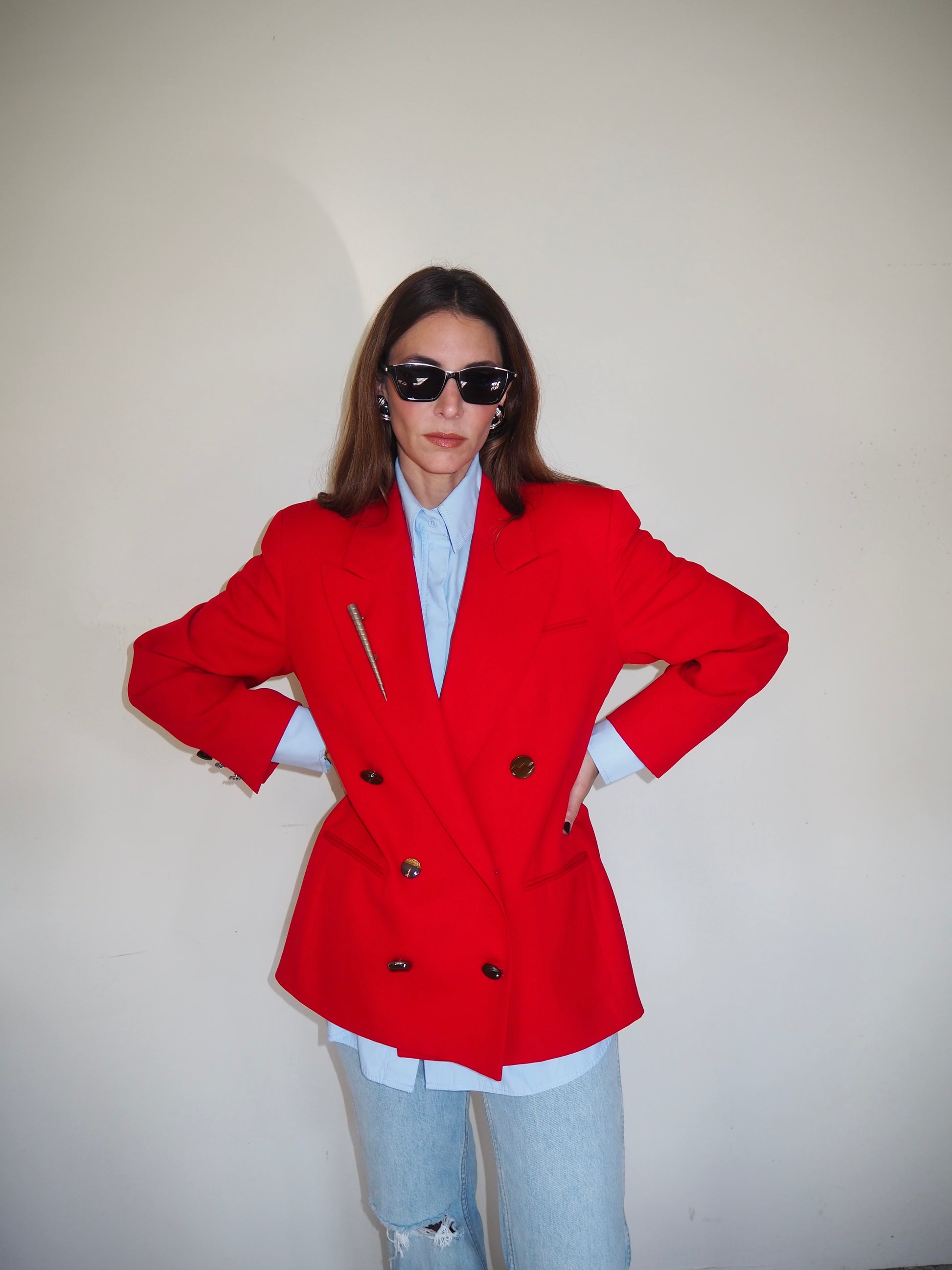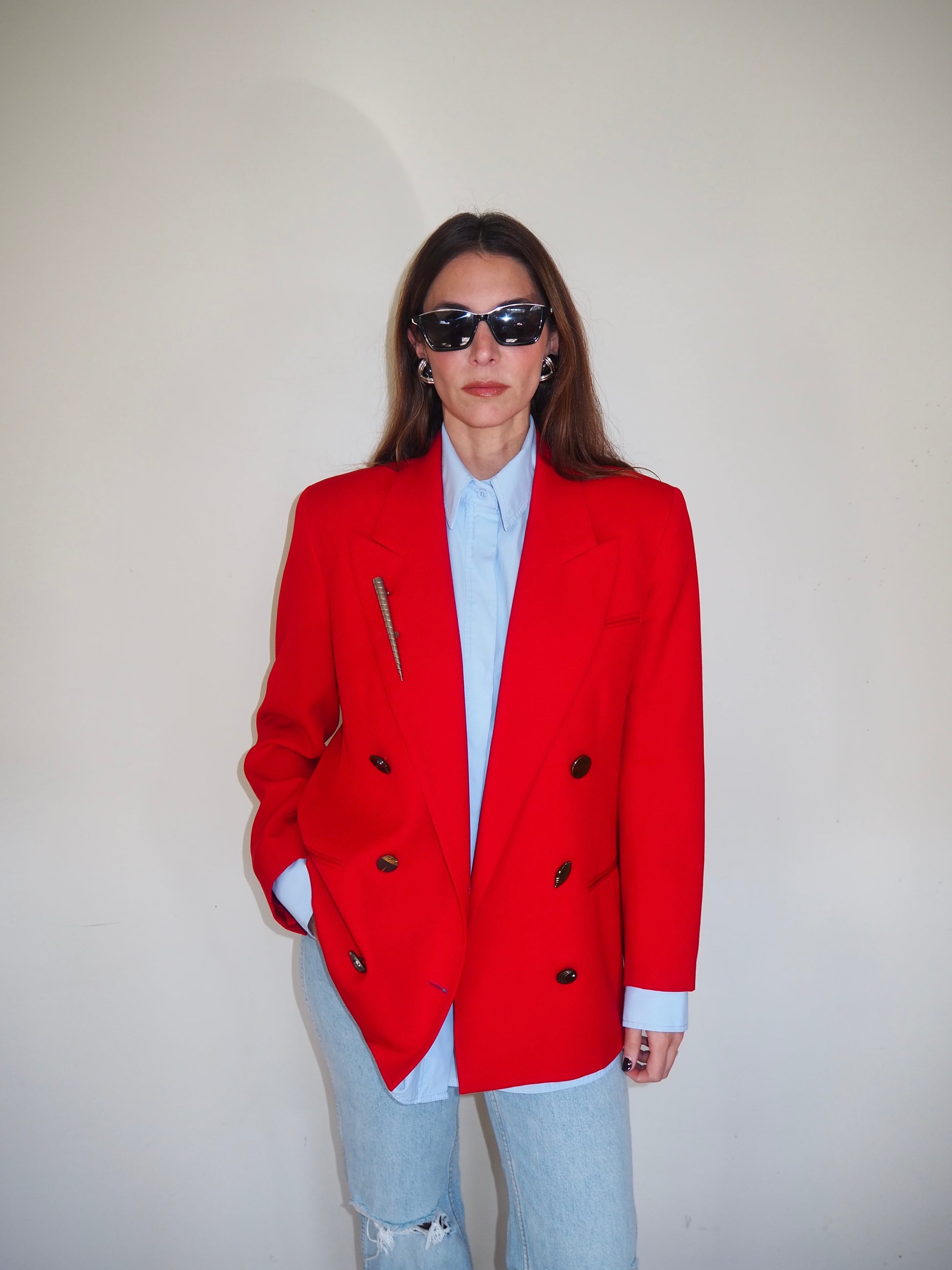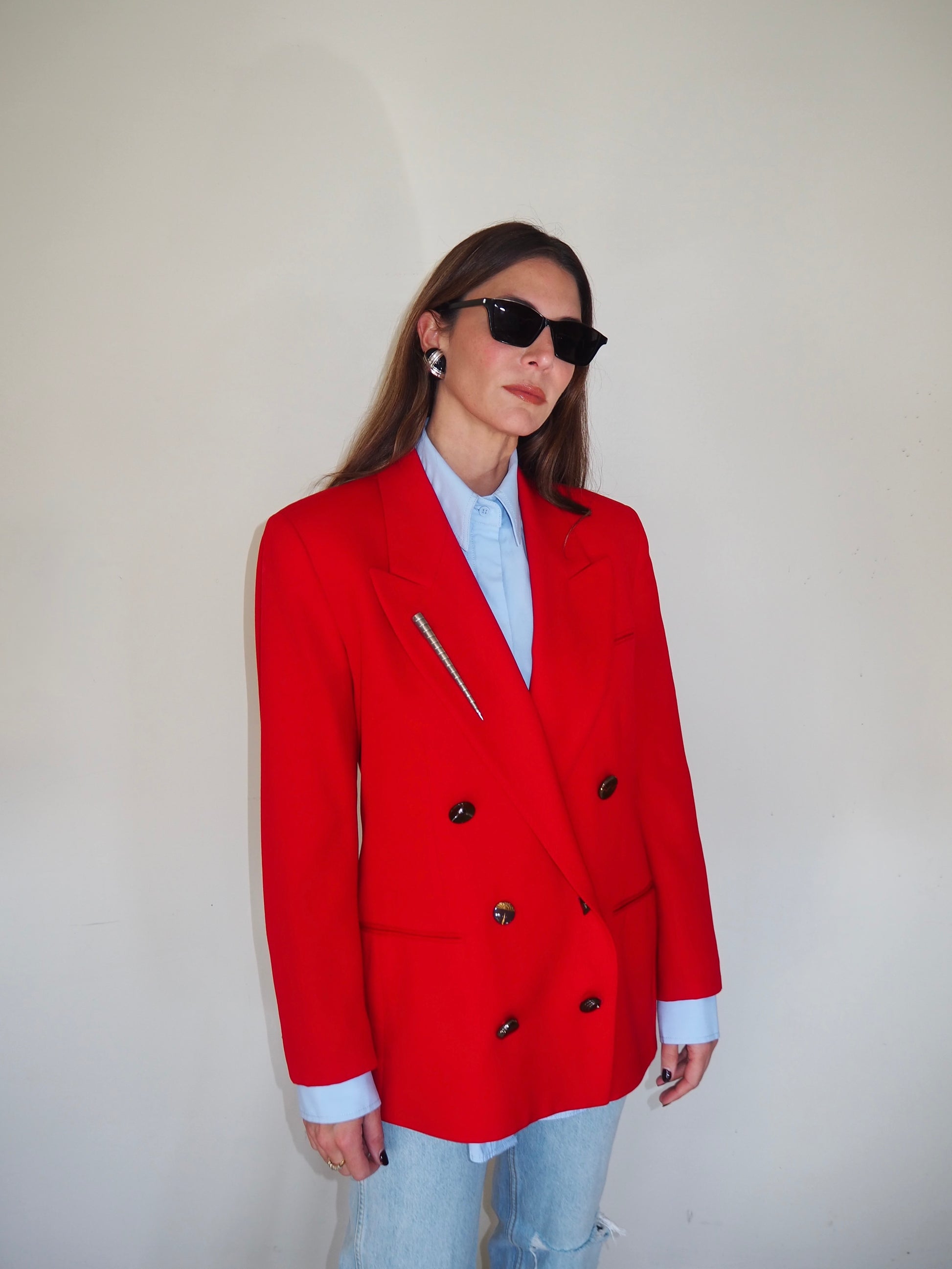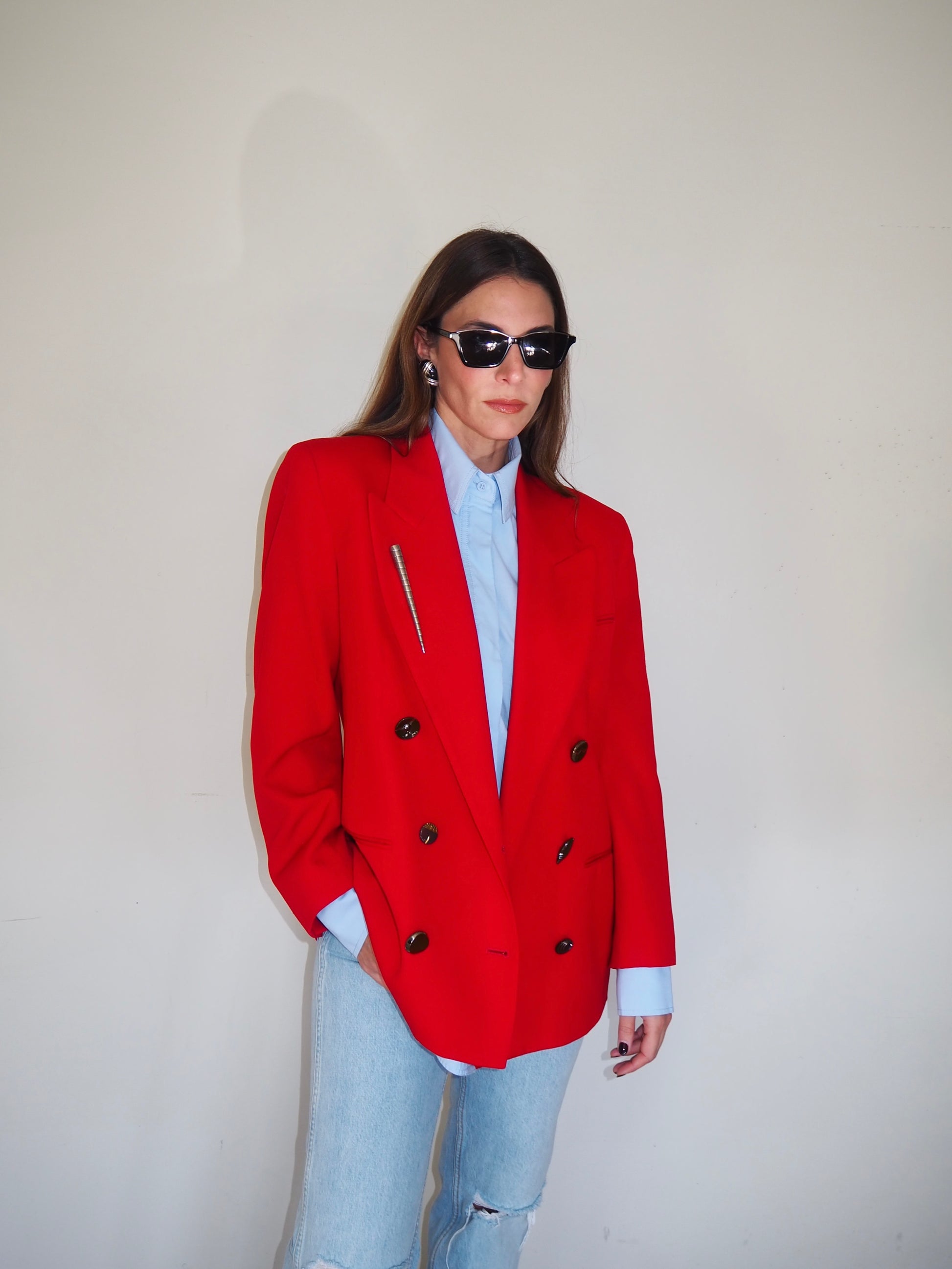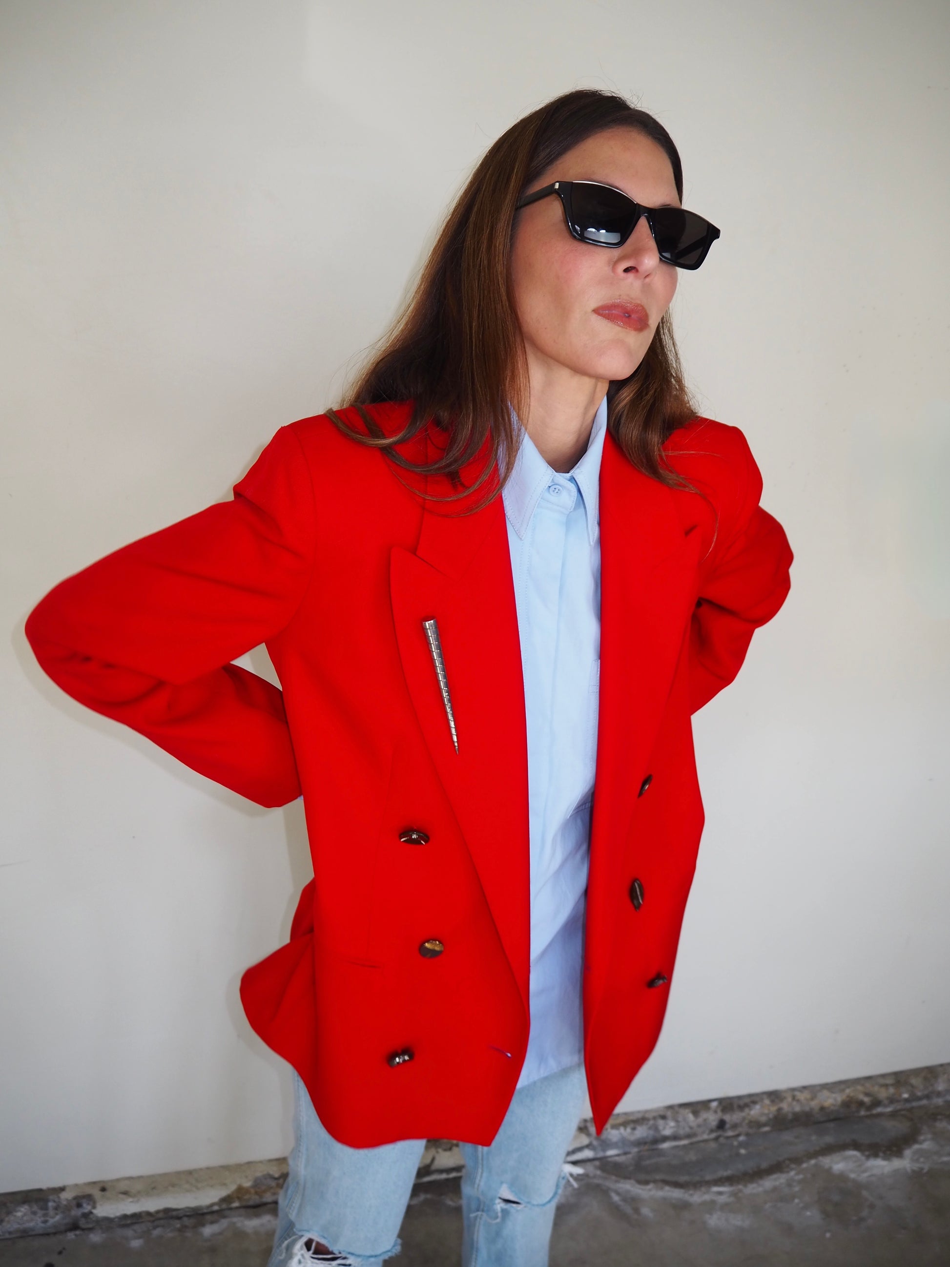 One of a Kind Vintage double breasted Red Wool Blazer adorned by Jen Wonders with Vintage silver brooch on lapel and rare Vintage Brown with Silver and gold accents buttons.