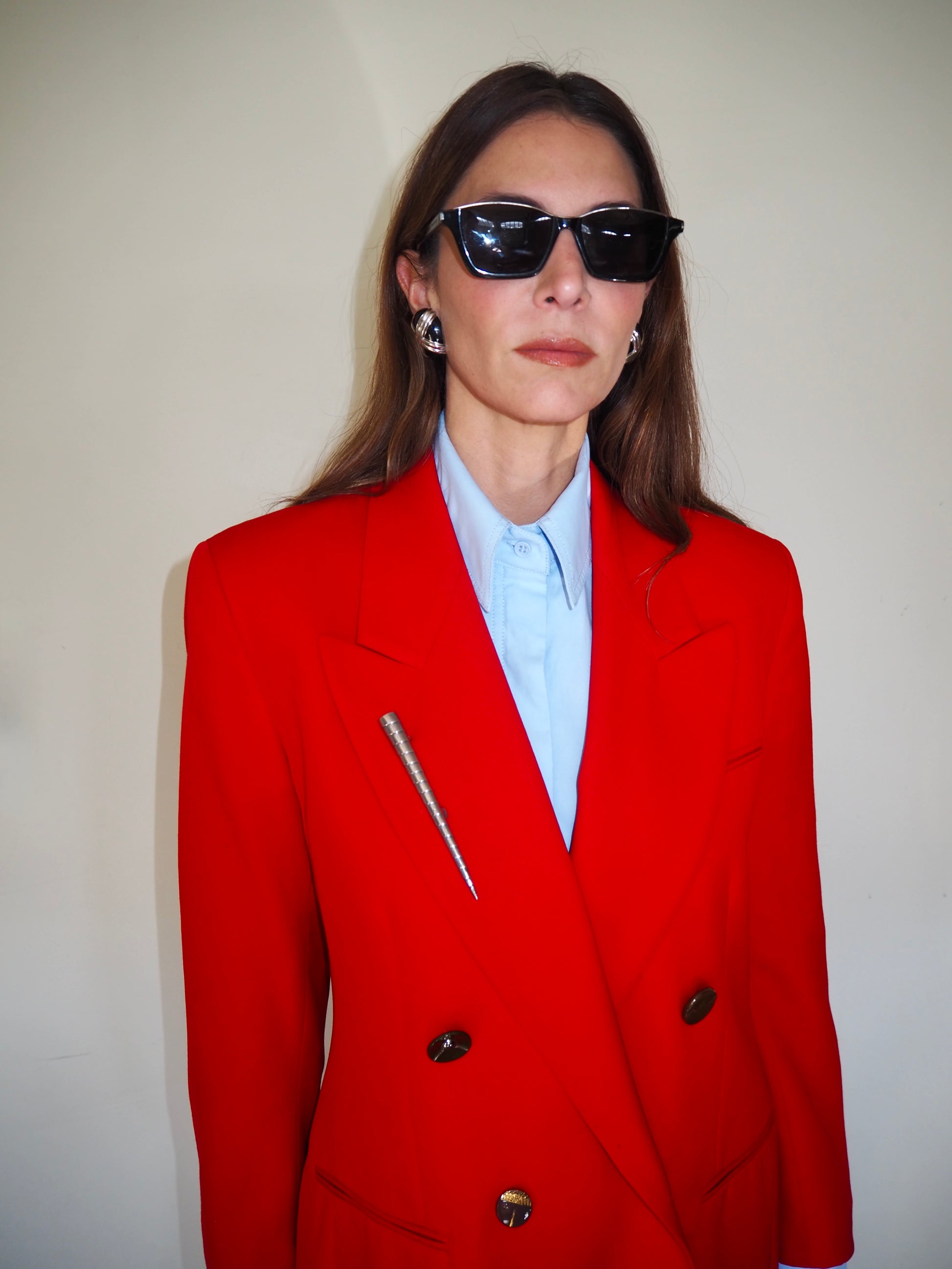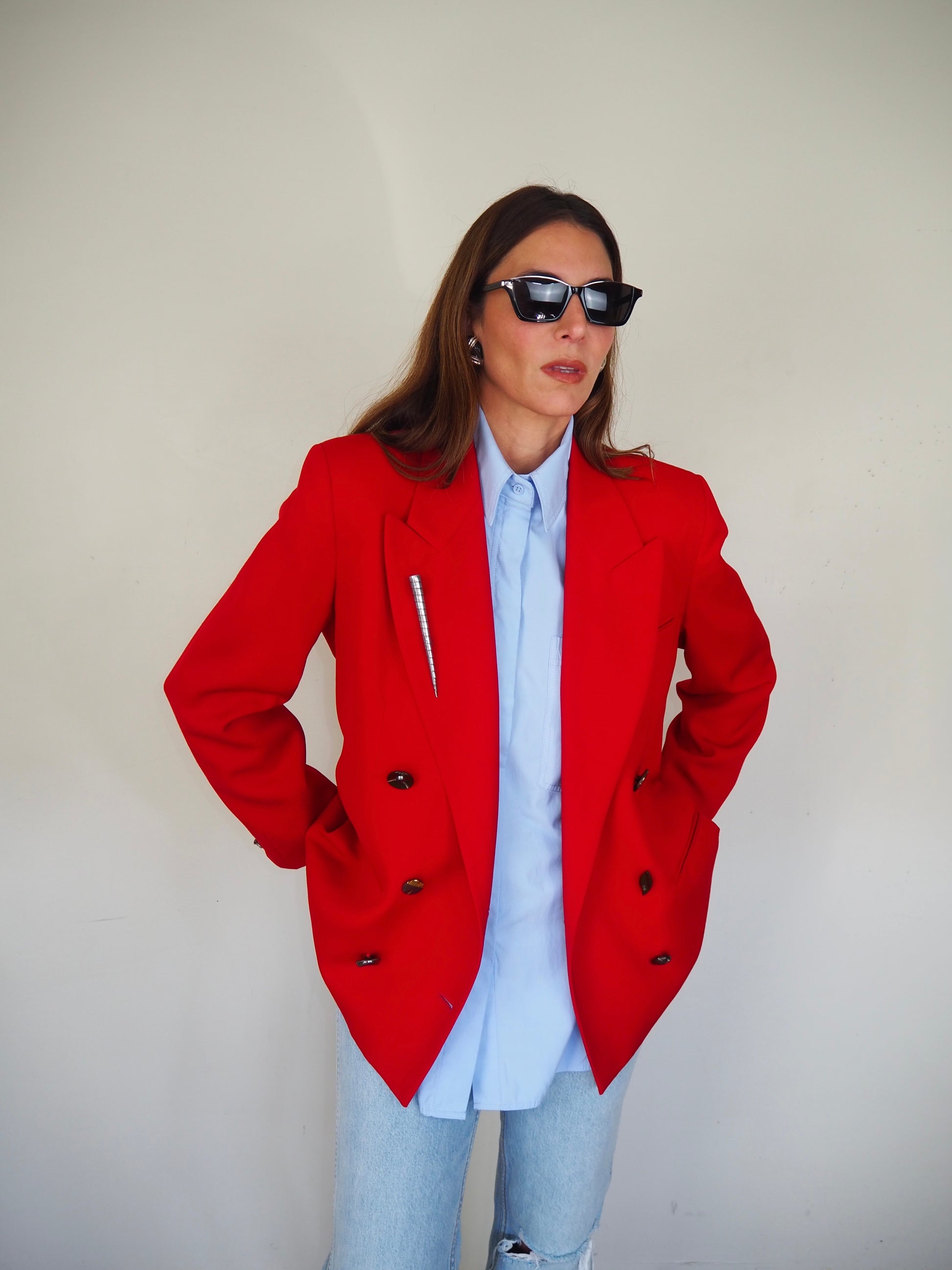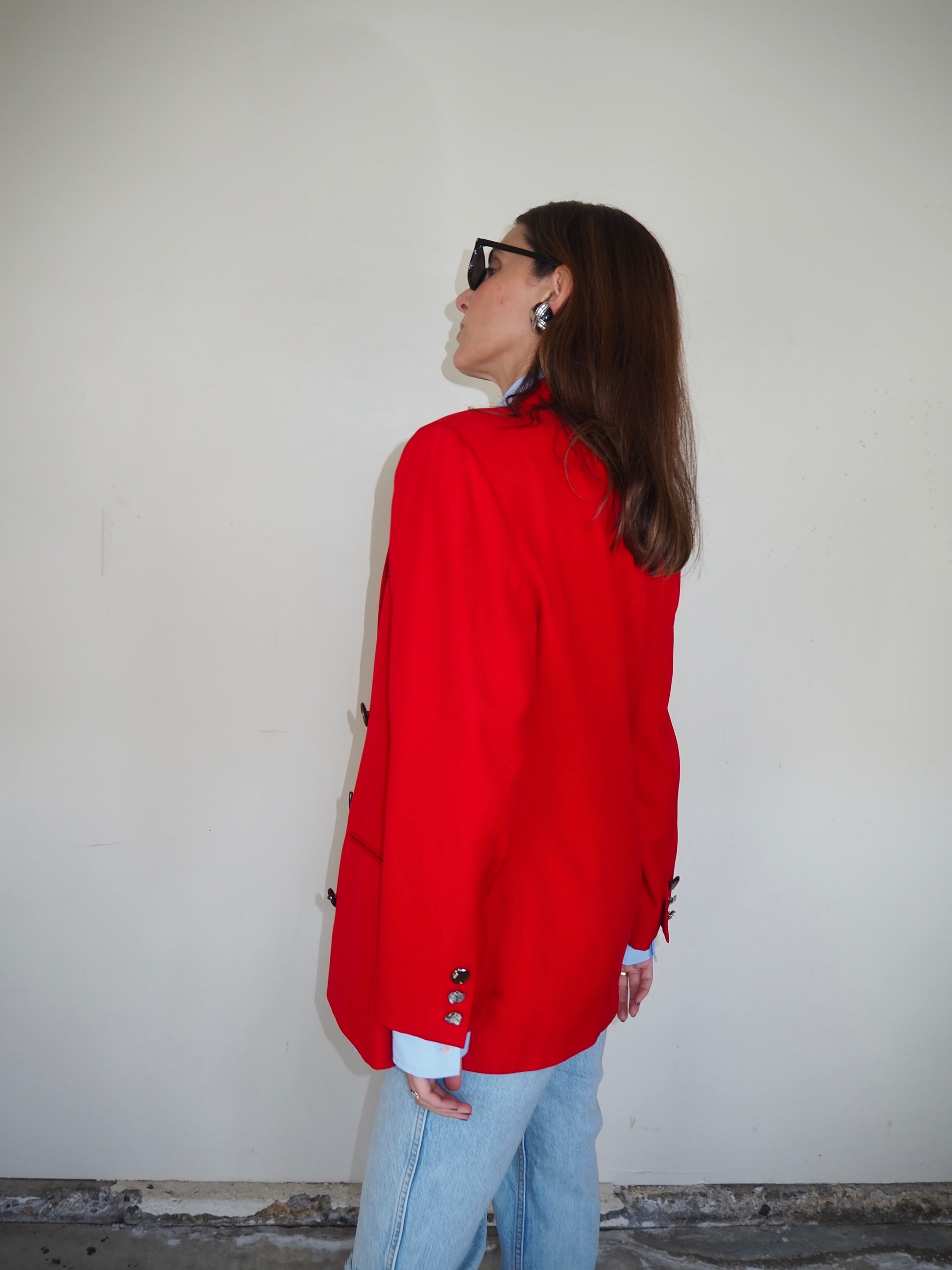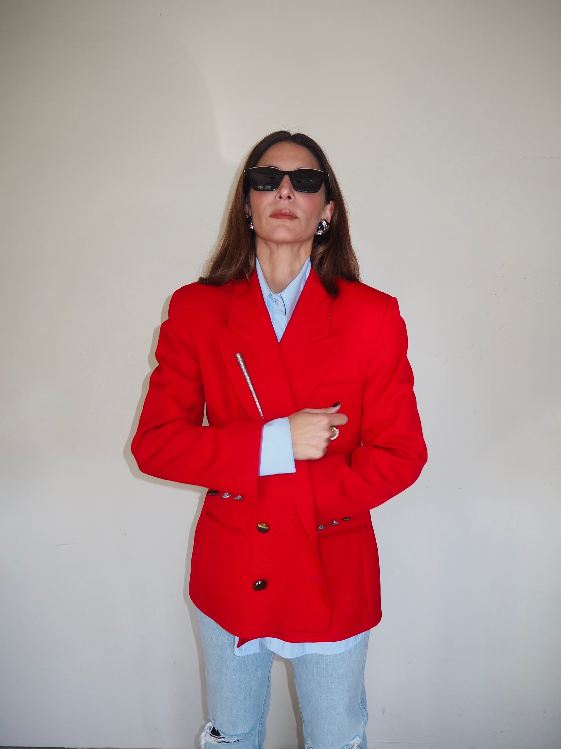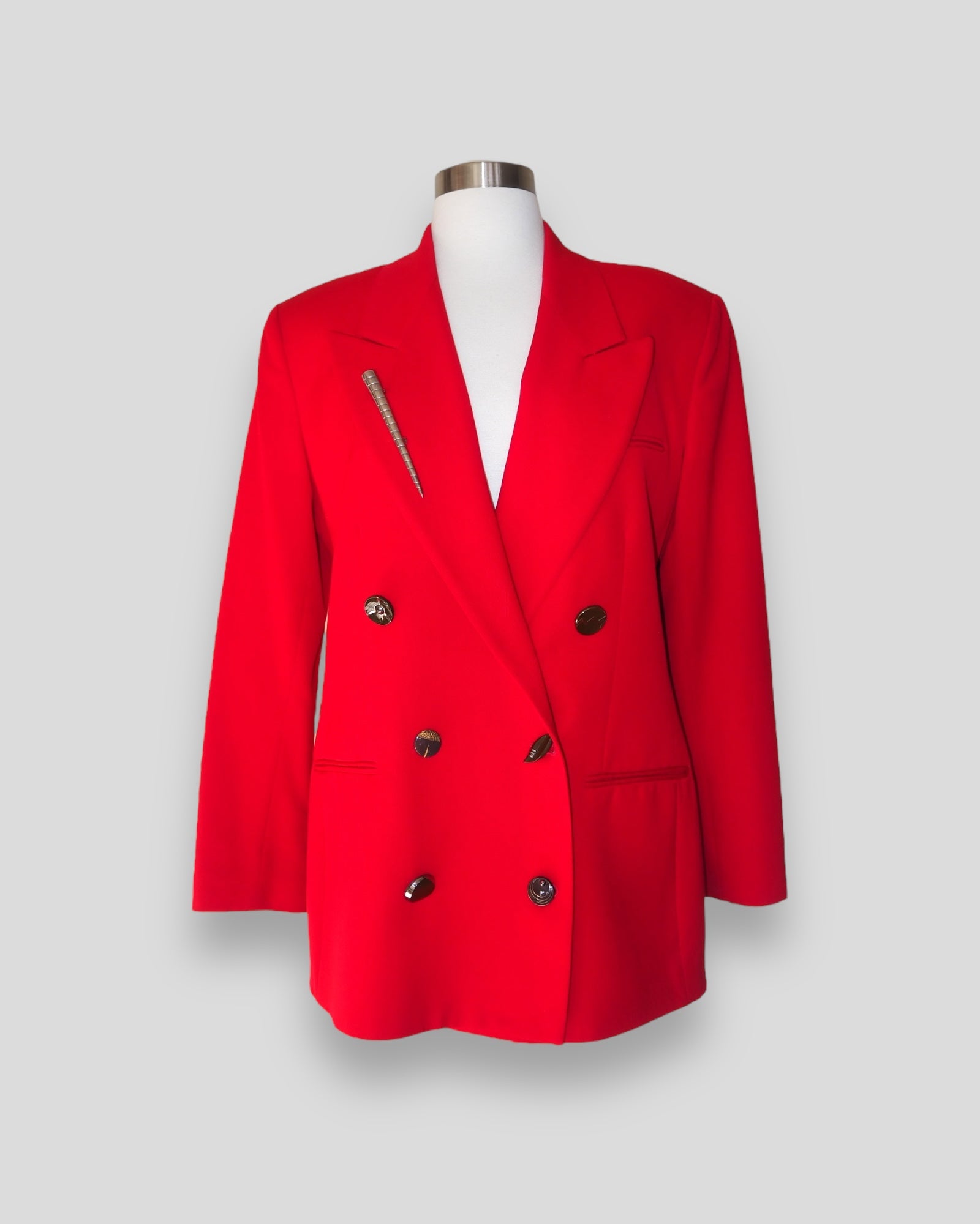 One of a Kind Vintage double breasted Red Wool Blazer adorned by Jen Wonders with Vintage silver brooch on lapel and rare Vintage Brown with Silver and gold accents buttons.