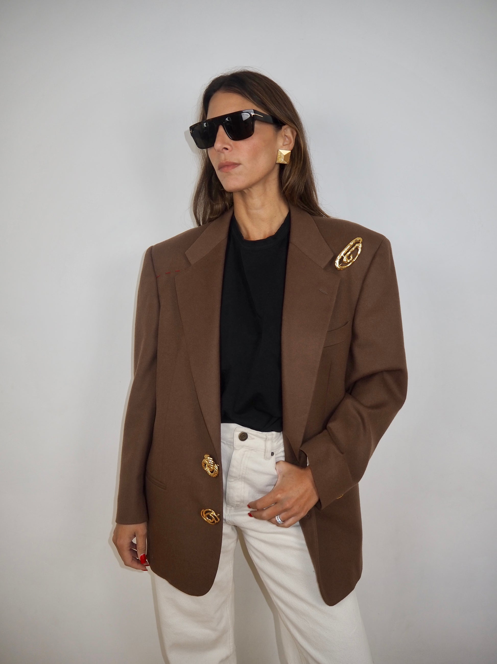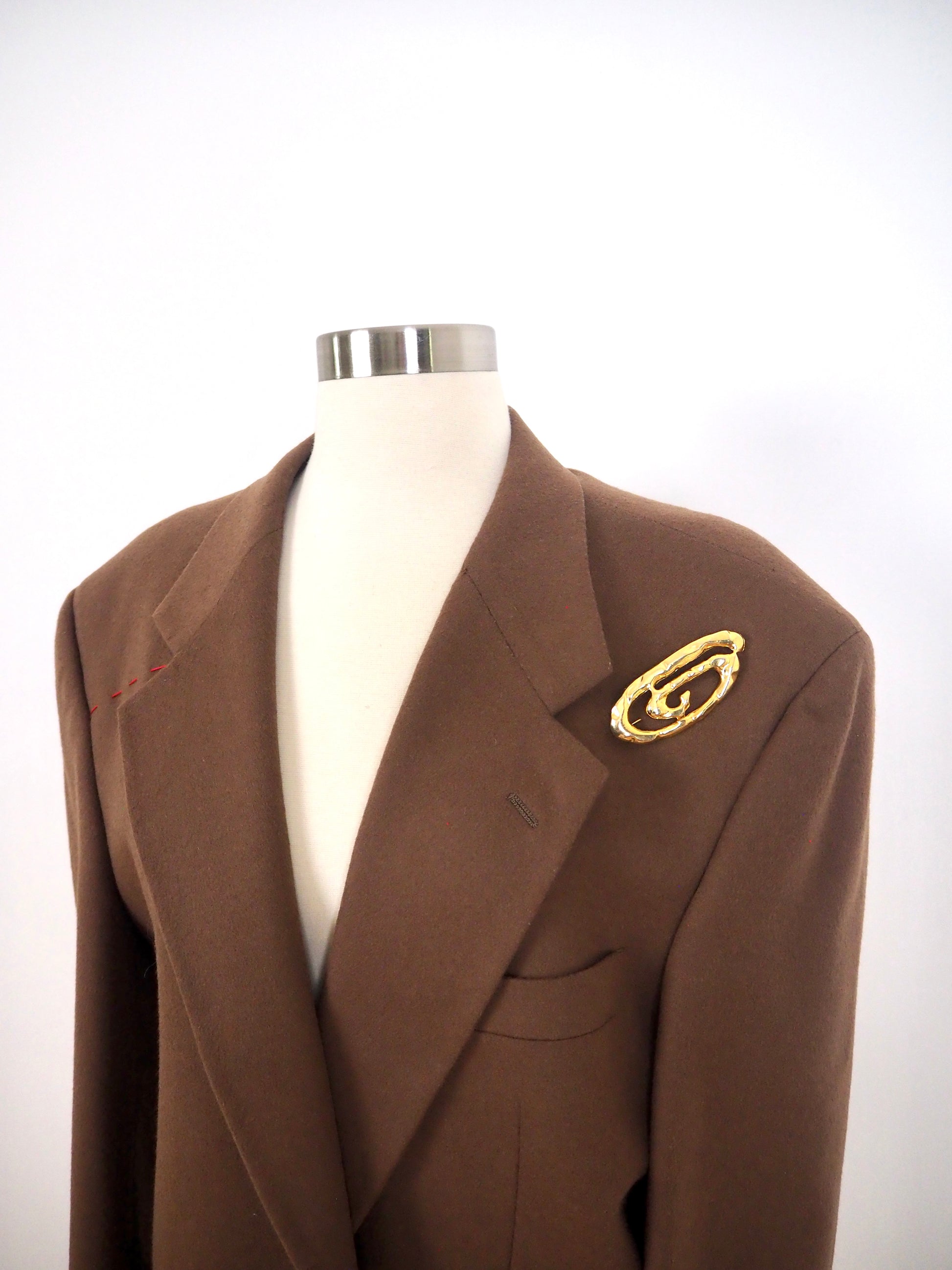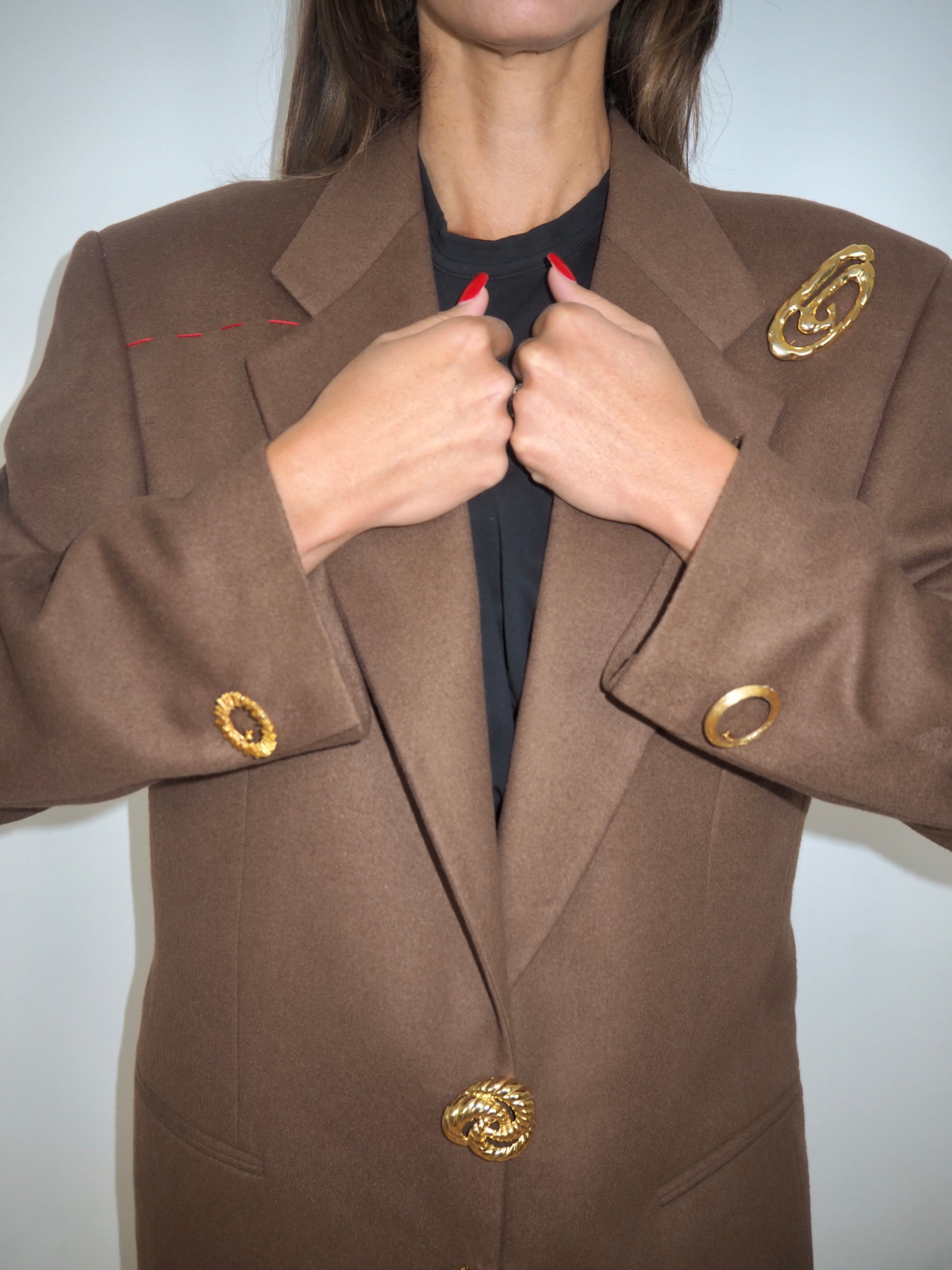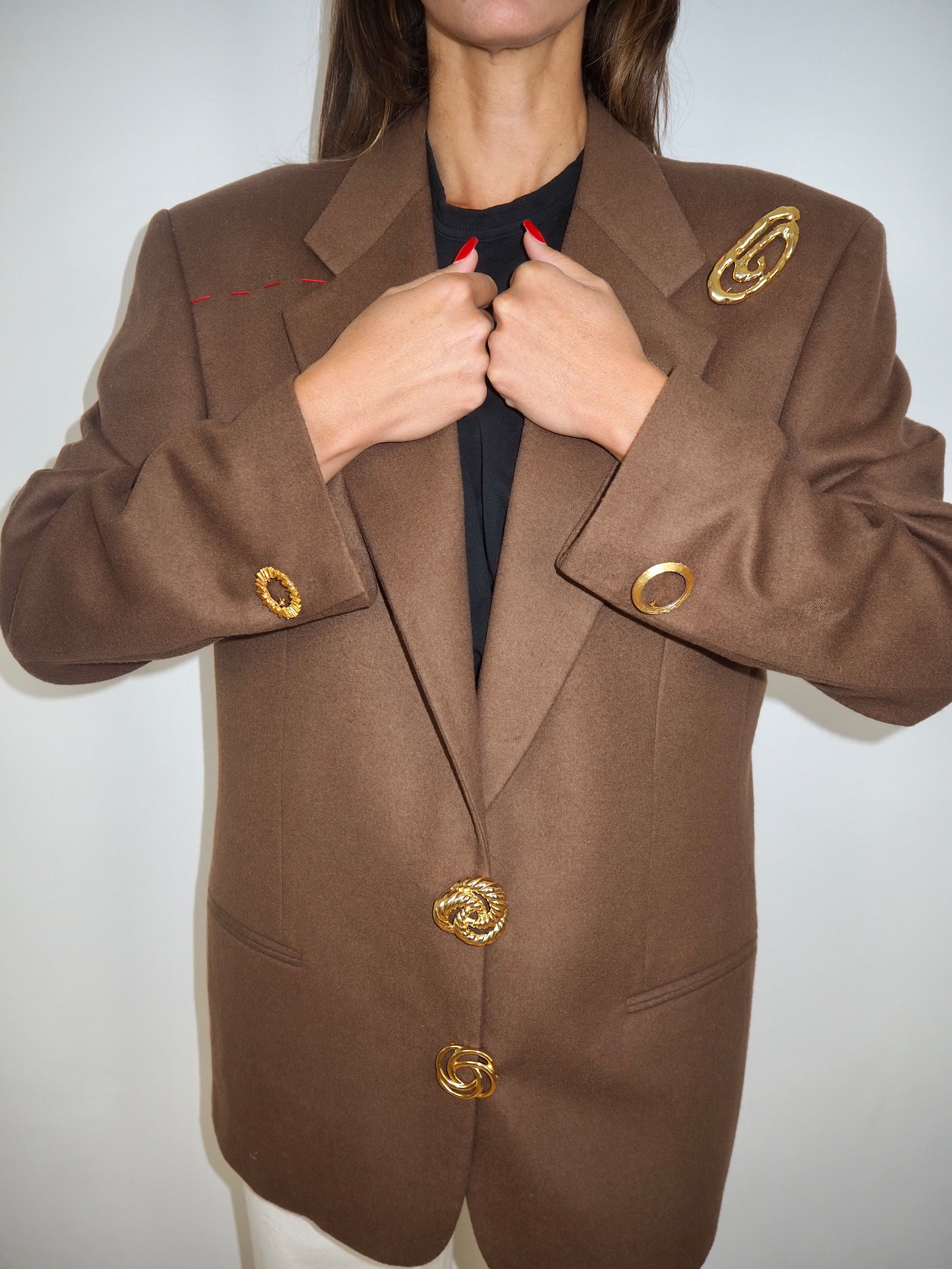 Vintage Valentino Camel Wool Blazer adorned by Jen Wonders with Vintage gold brooches and red stitching on top side as a sign of good fortune. The blazer is meant to stay open, but you can use the brooches to close if needed.