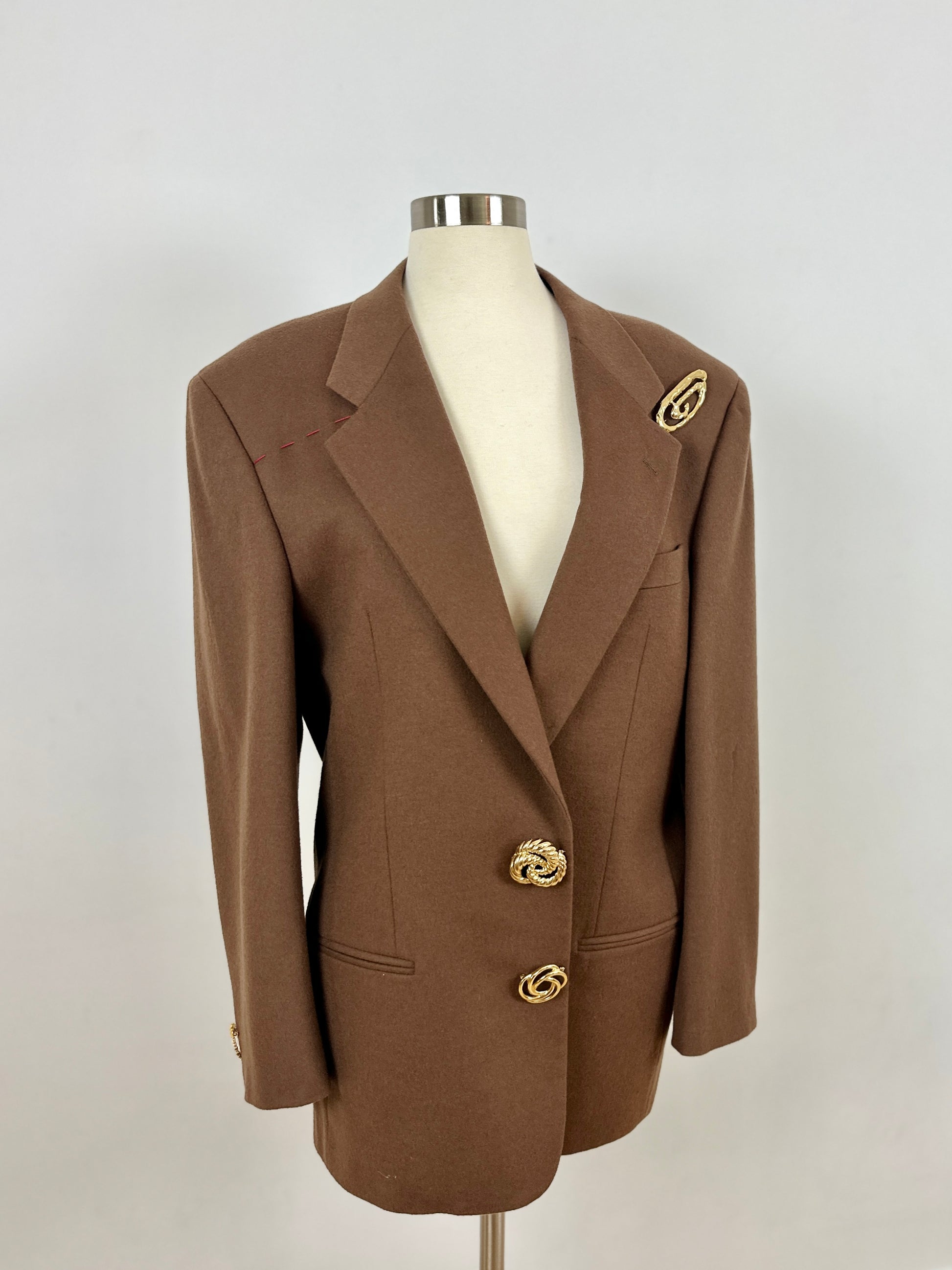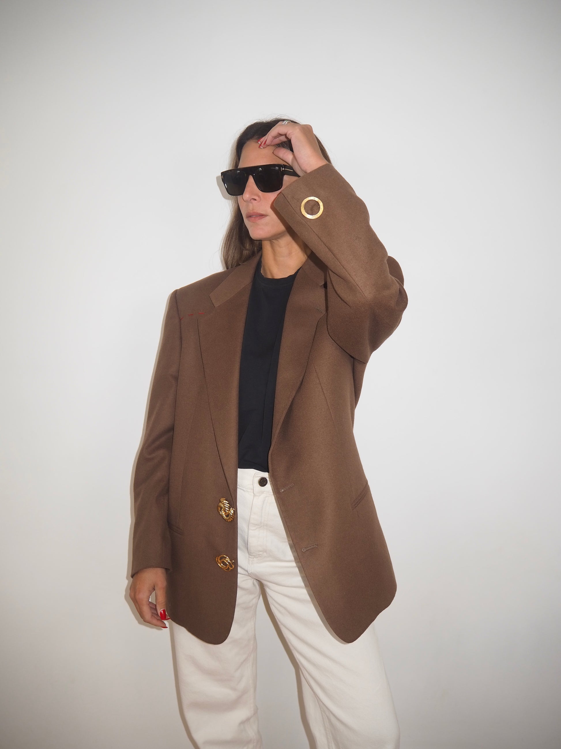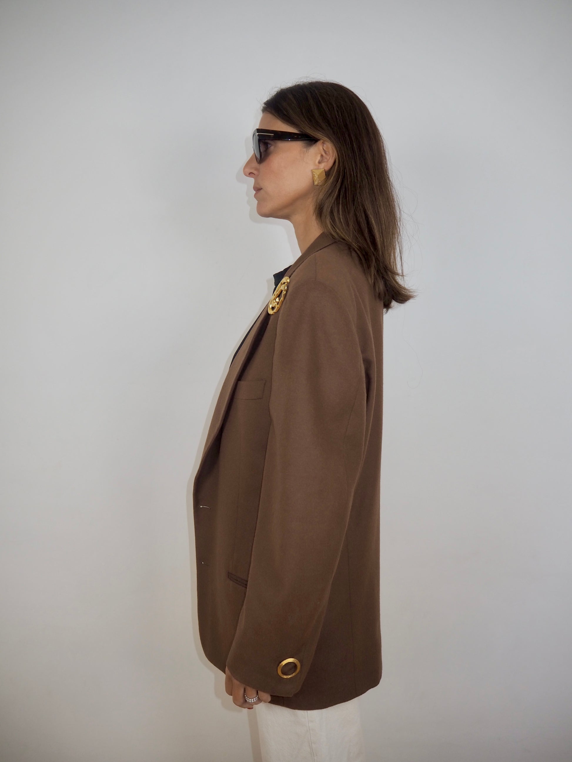Vintage Valentino Camel Wool Blazer adorned by Jen Wonders with Vintage gold brooches and red stitching on top side as a sign of good fortune. The blazer is meant to stay open, but you can use the brooches to close if needed.