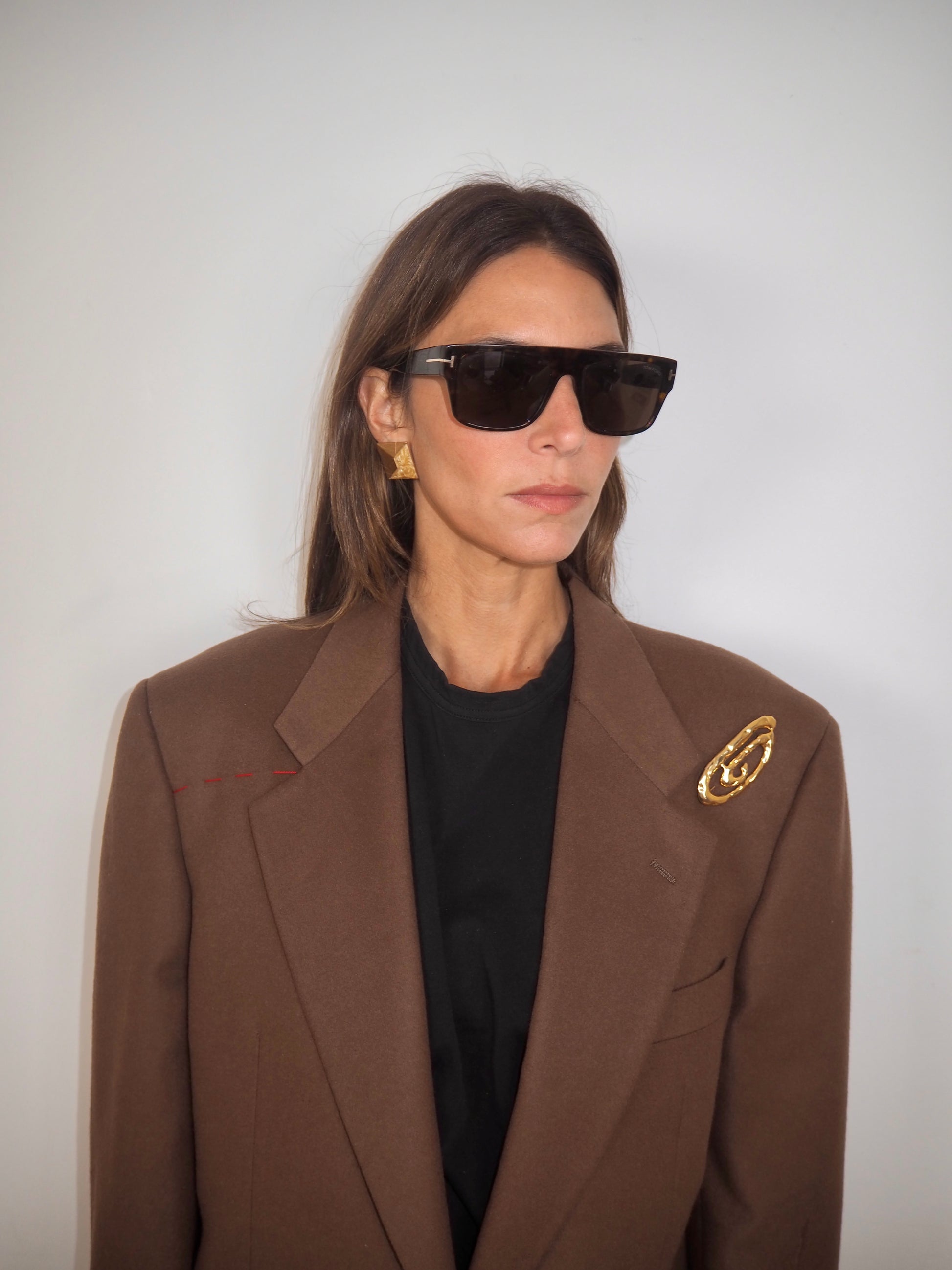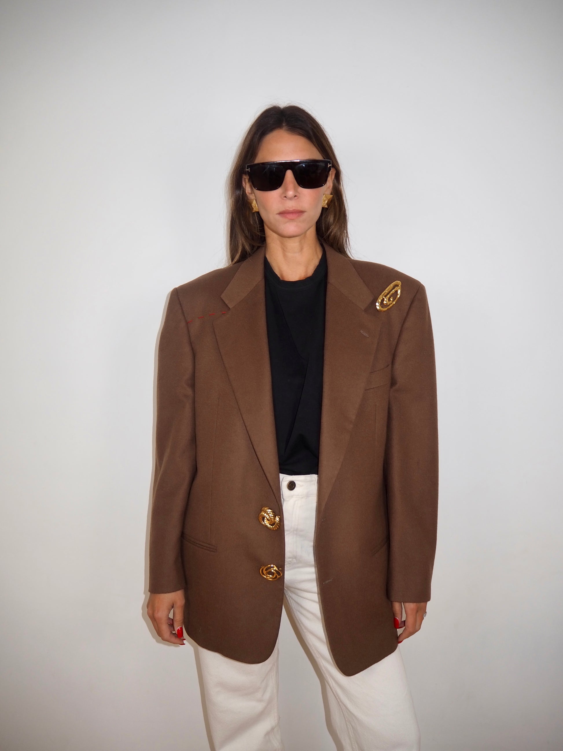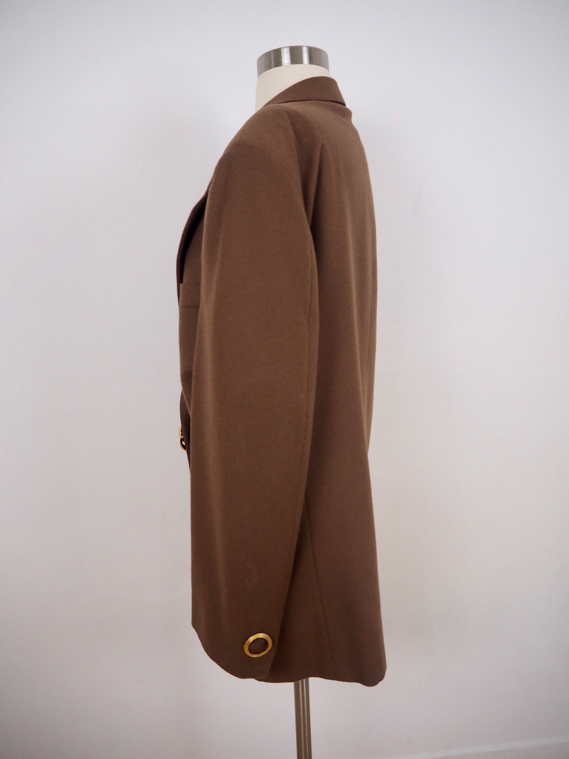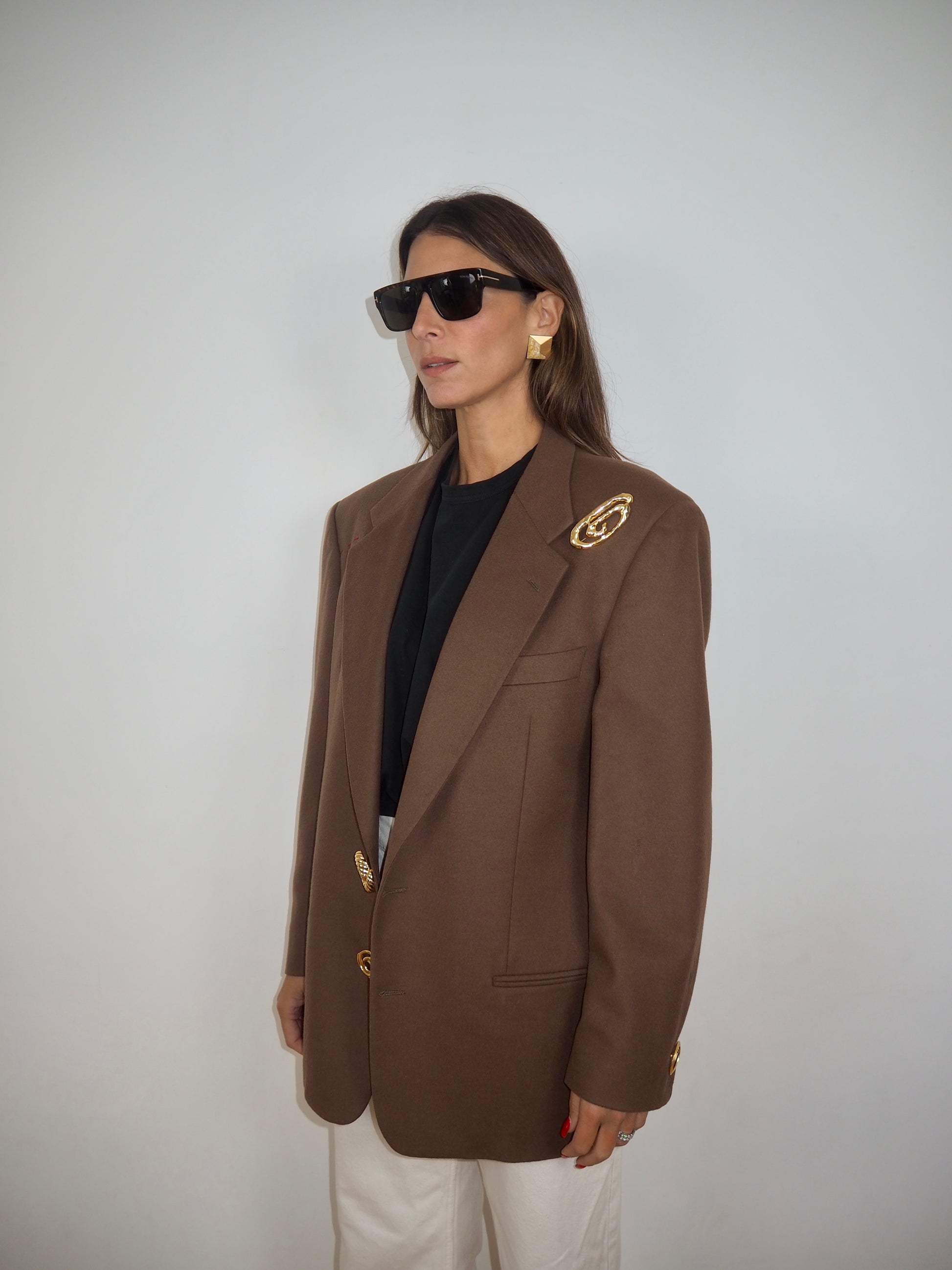 Vintage Valentino Camel Wool Blazer adorned by Jen Wonders with Vintage gold brooches and red stitching on top side as a sign of good fortune. The blazer is meant to stay open, but you can use the brooches to close if needed.