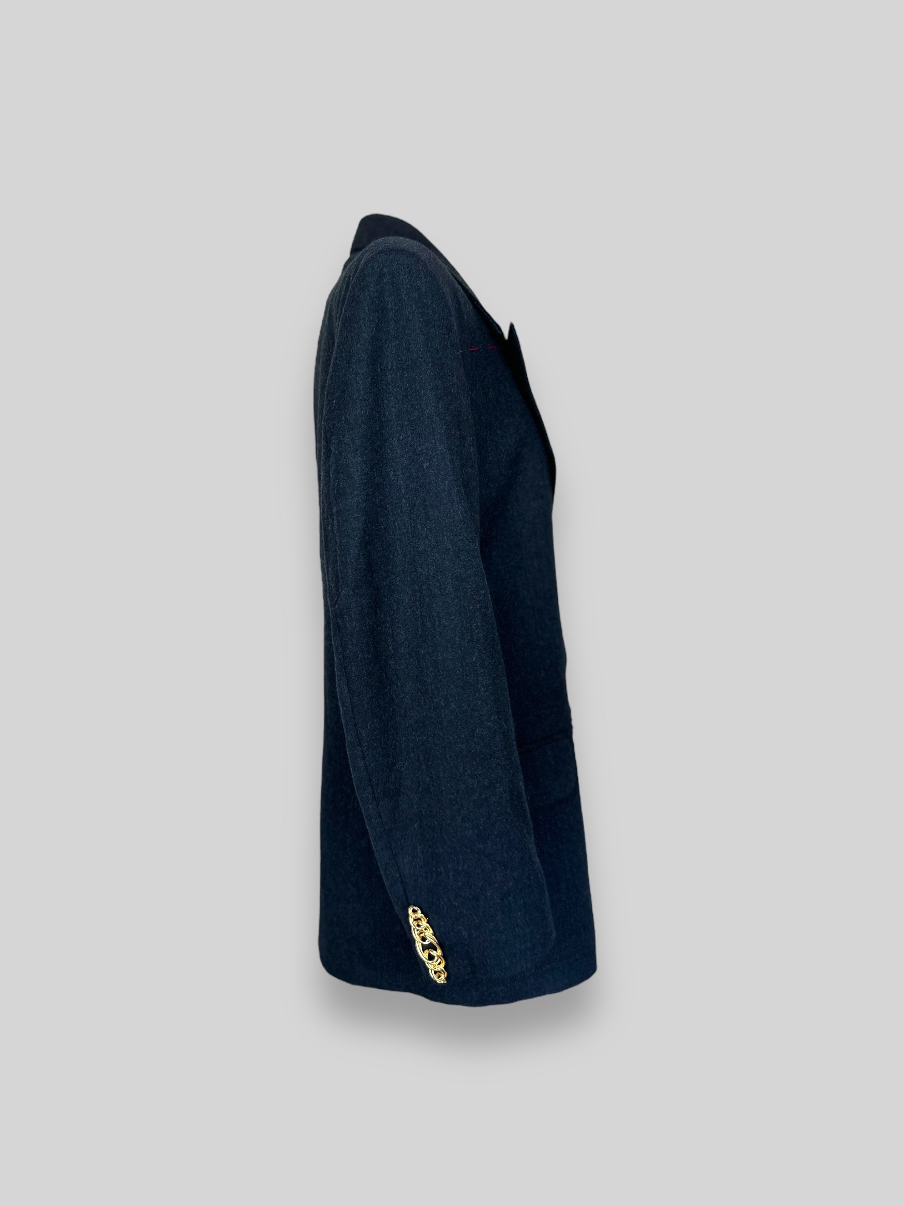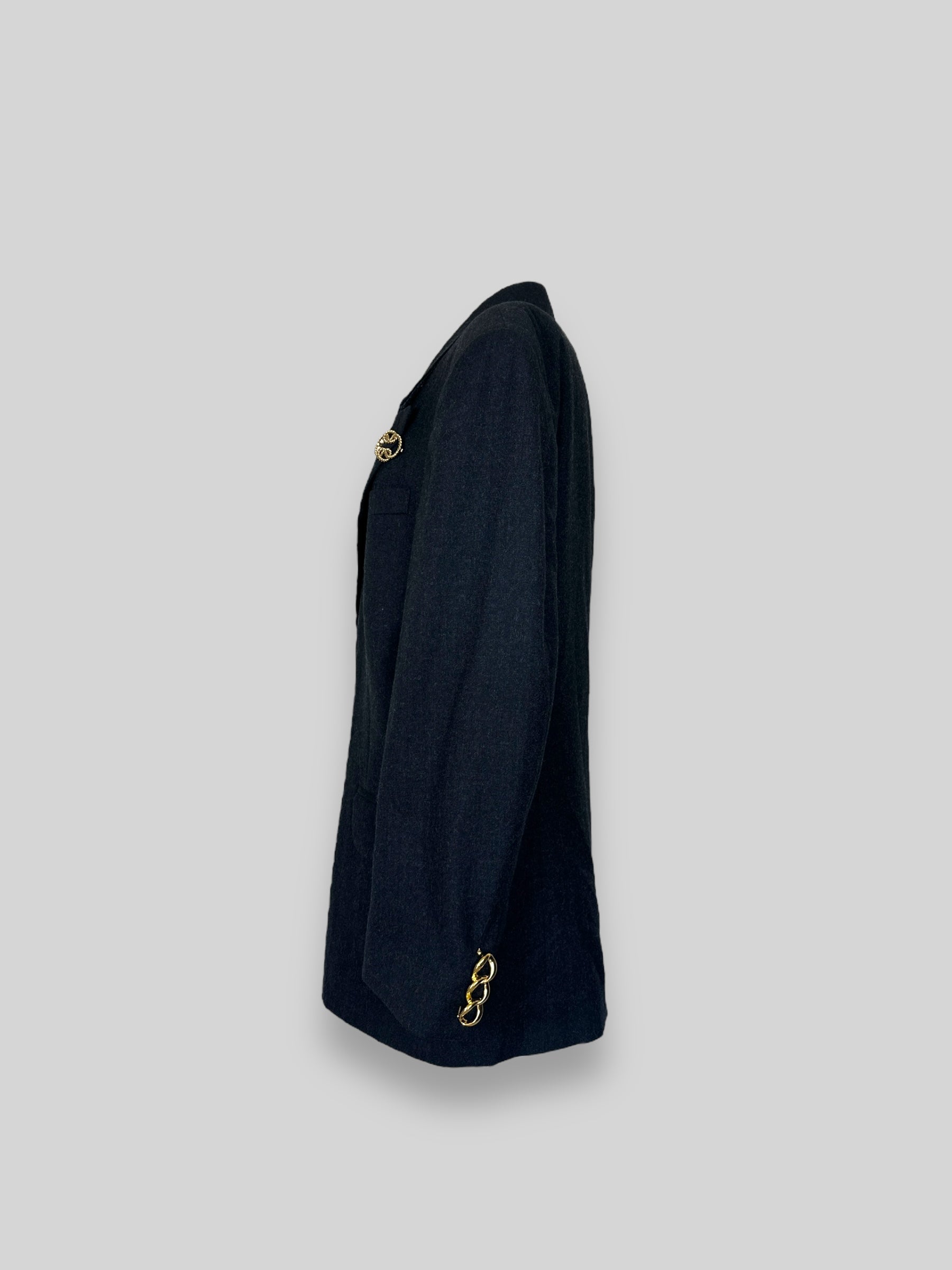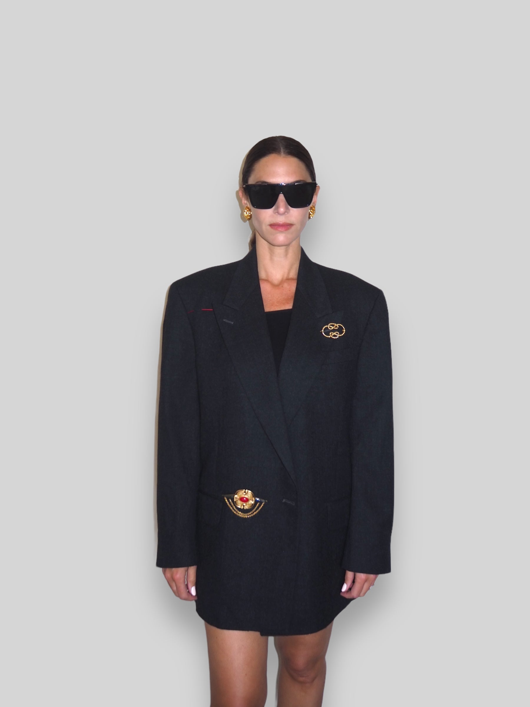 Vintage Oscar de la Renta Dark grey Wool double Breasted Blazer adorned by Jen Wonders with Vintage Gold and silver tone brooches and red stitching on top side as a sign of good fortune. The blazer is meant to stay open, but you can use the brooches to close if needed.