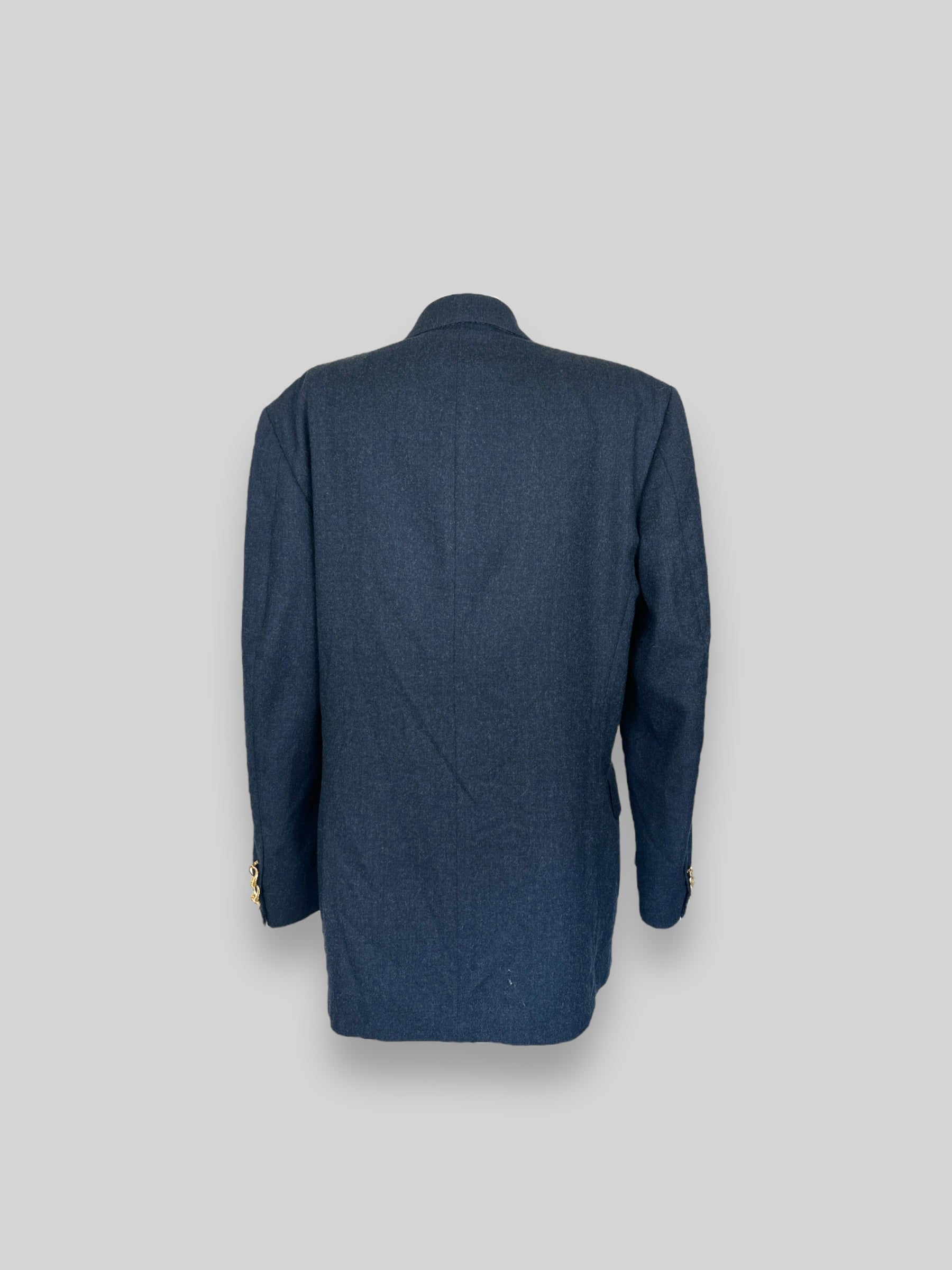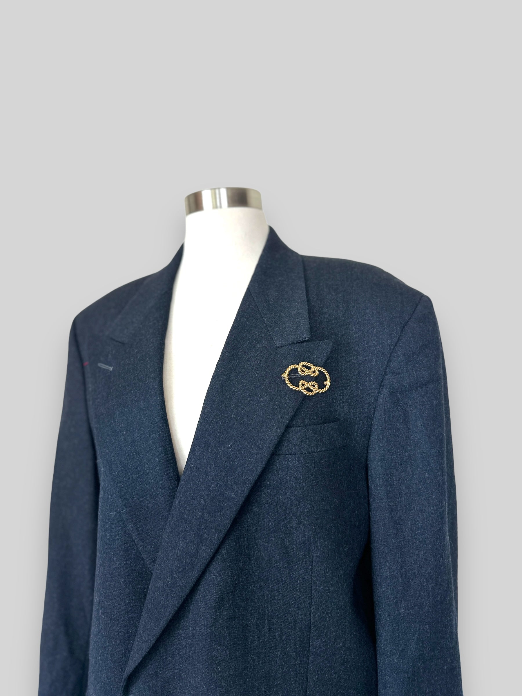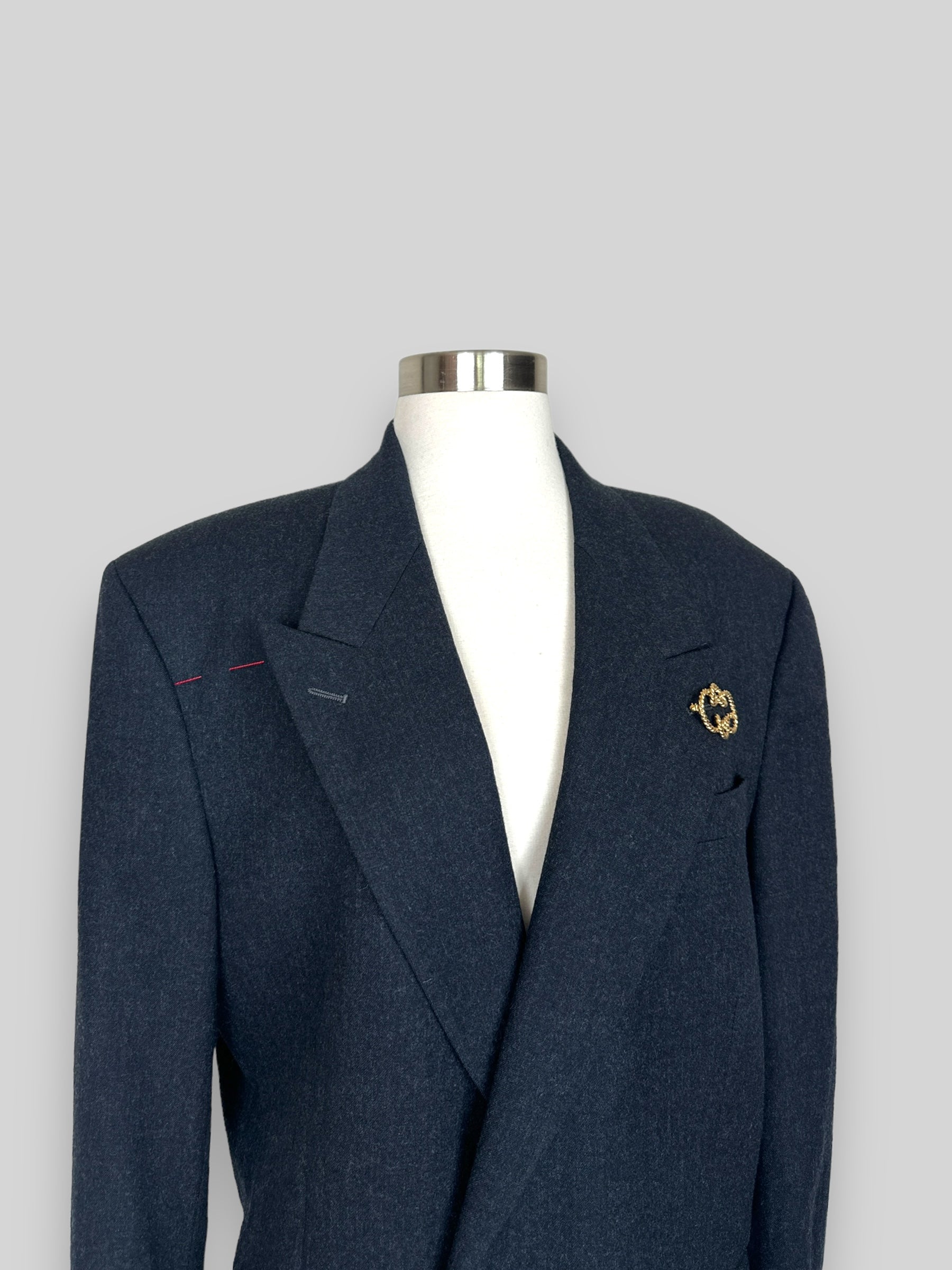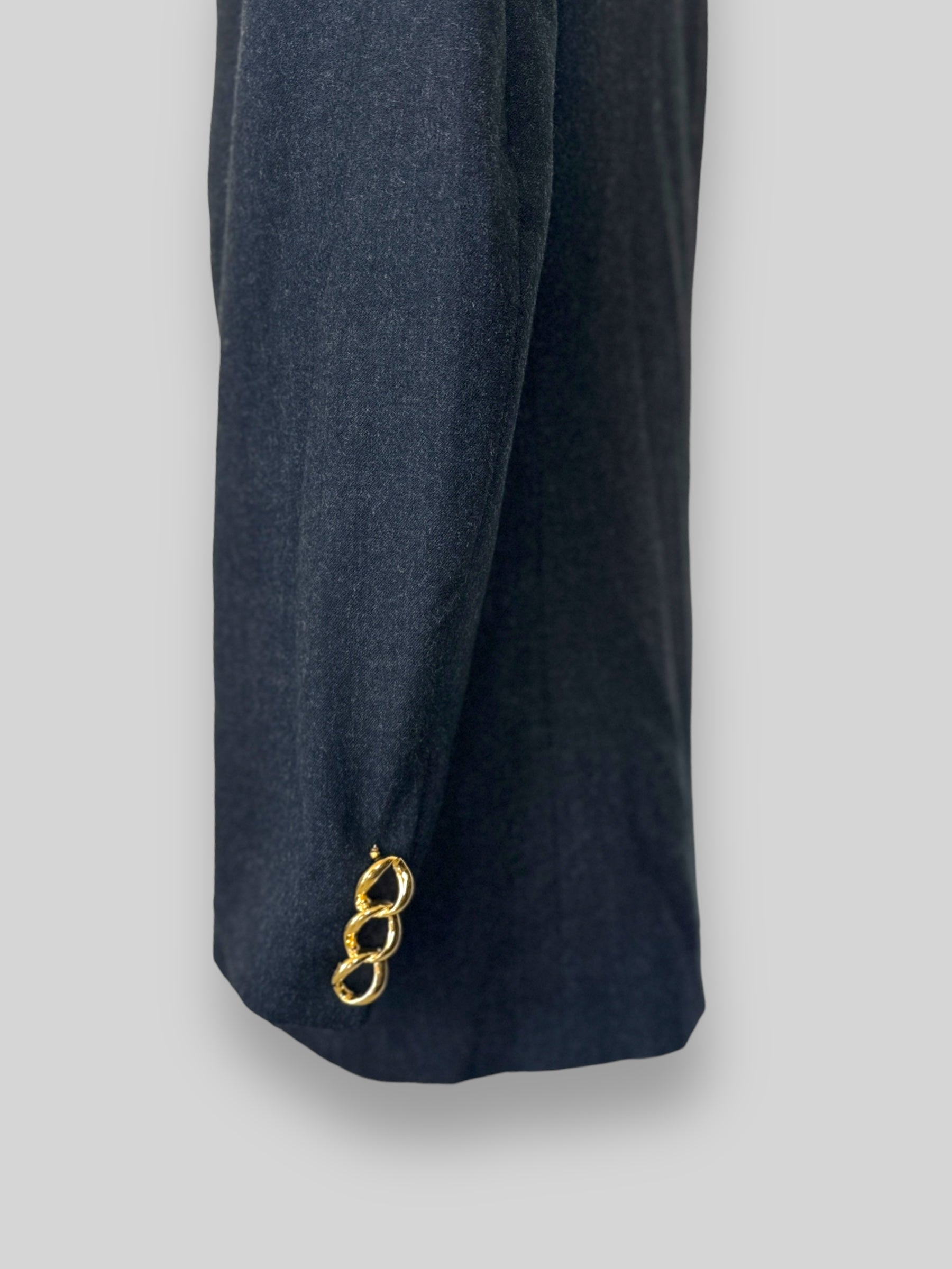 Vintage Oscar de la Renta Dark grey Wool double Breasted Blazer adorned by Jen Wonders with Vintage Gold and silver tone brooches and red stitching on top side as a sign of good fortune. The blazer is meant to stay open, but you can use the brooches to close if needed.
