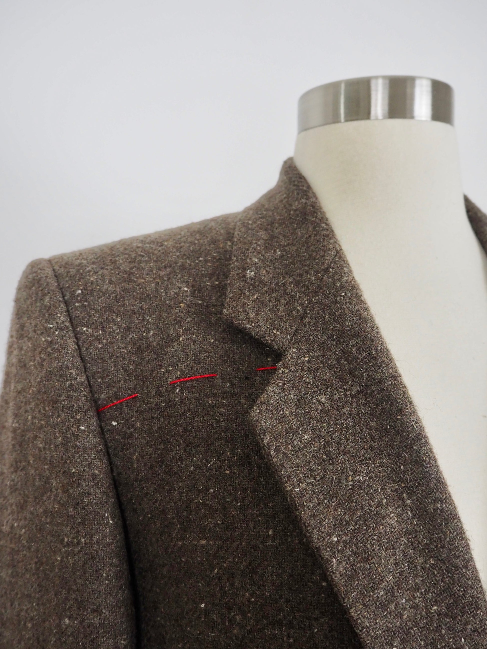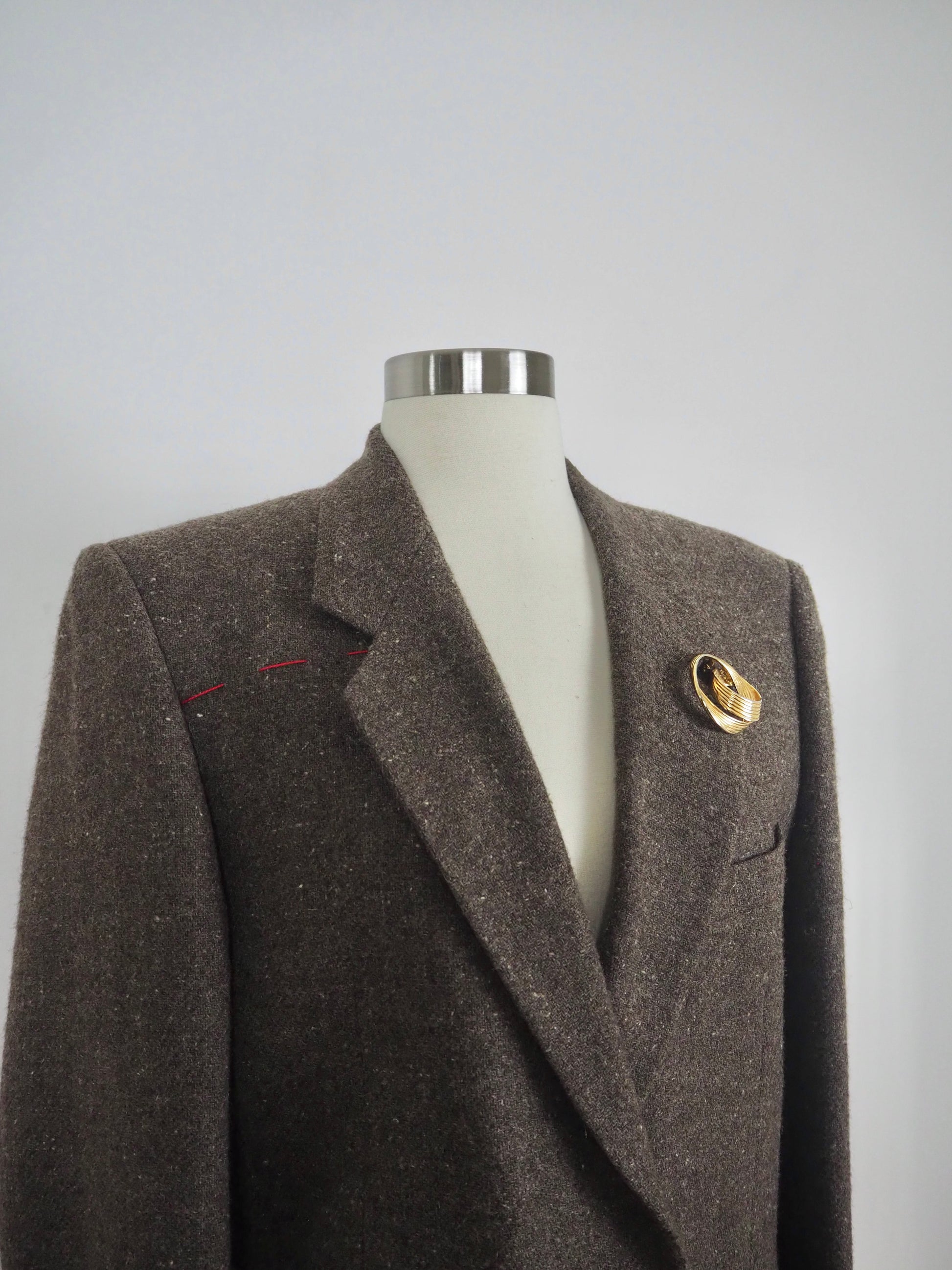 Vintage Wool Greige Blazer adorned by Jen Wonders with Vintage Gold tone brooches and red stitching on top side as a sign of good fortune. The blazer is meant to stay open, but you can use the brooches to close if needed.