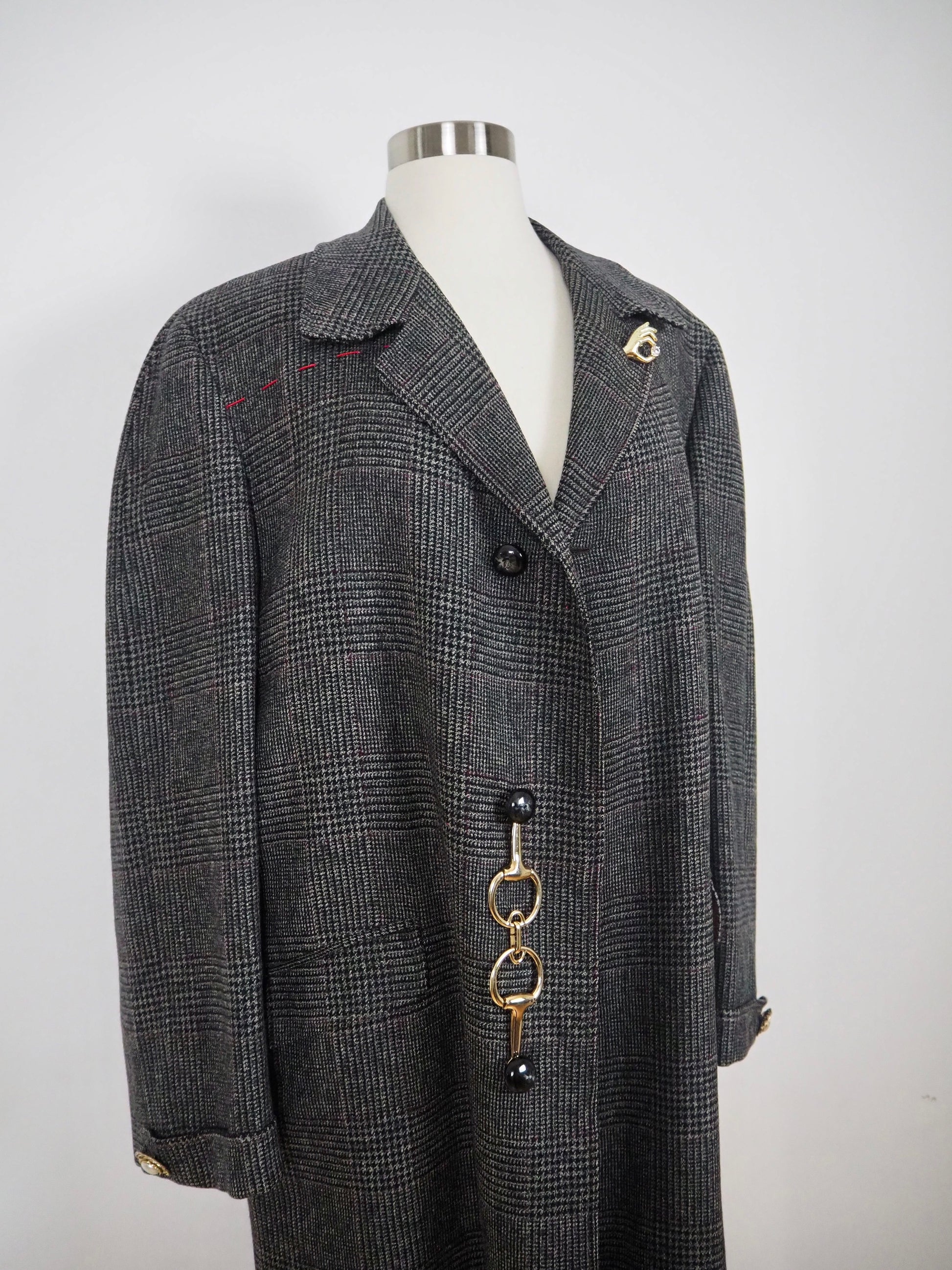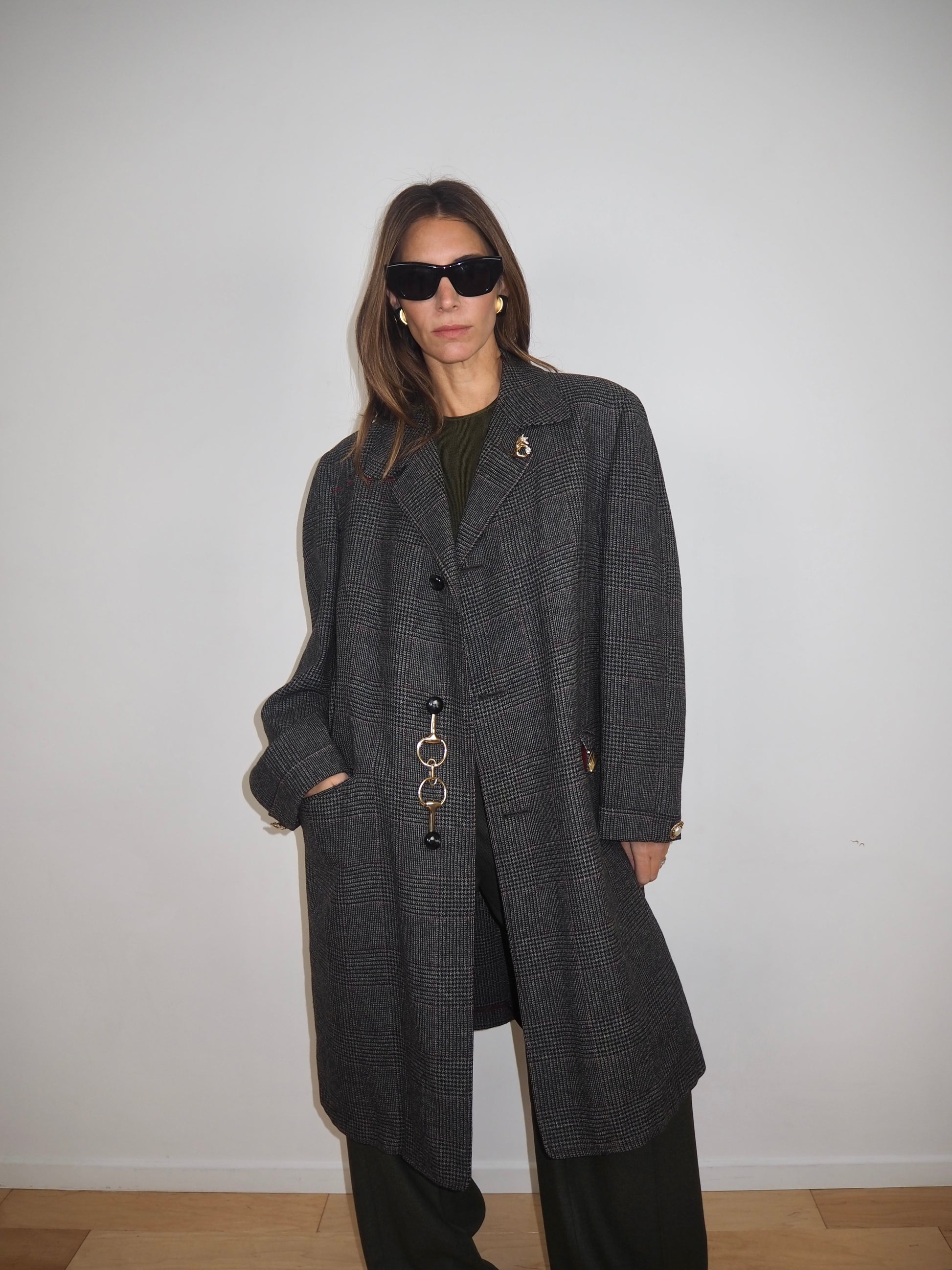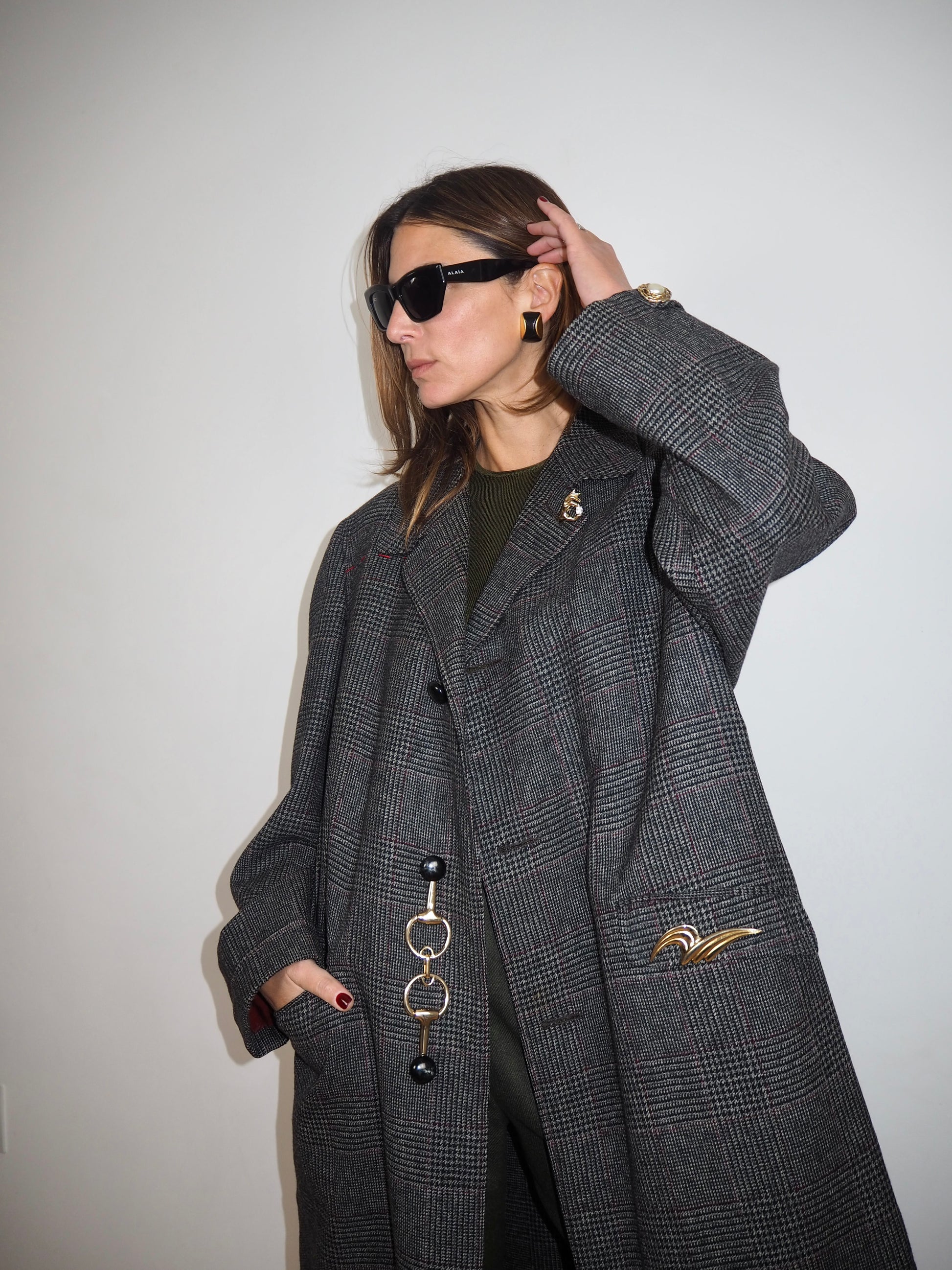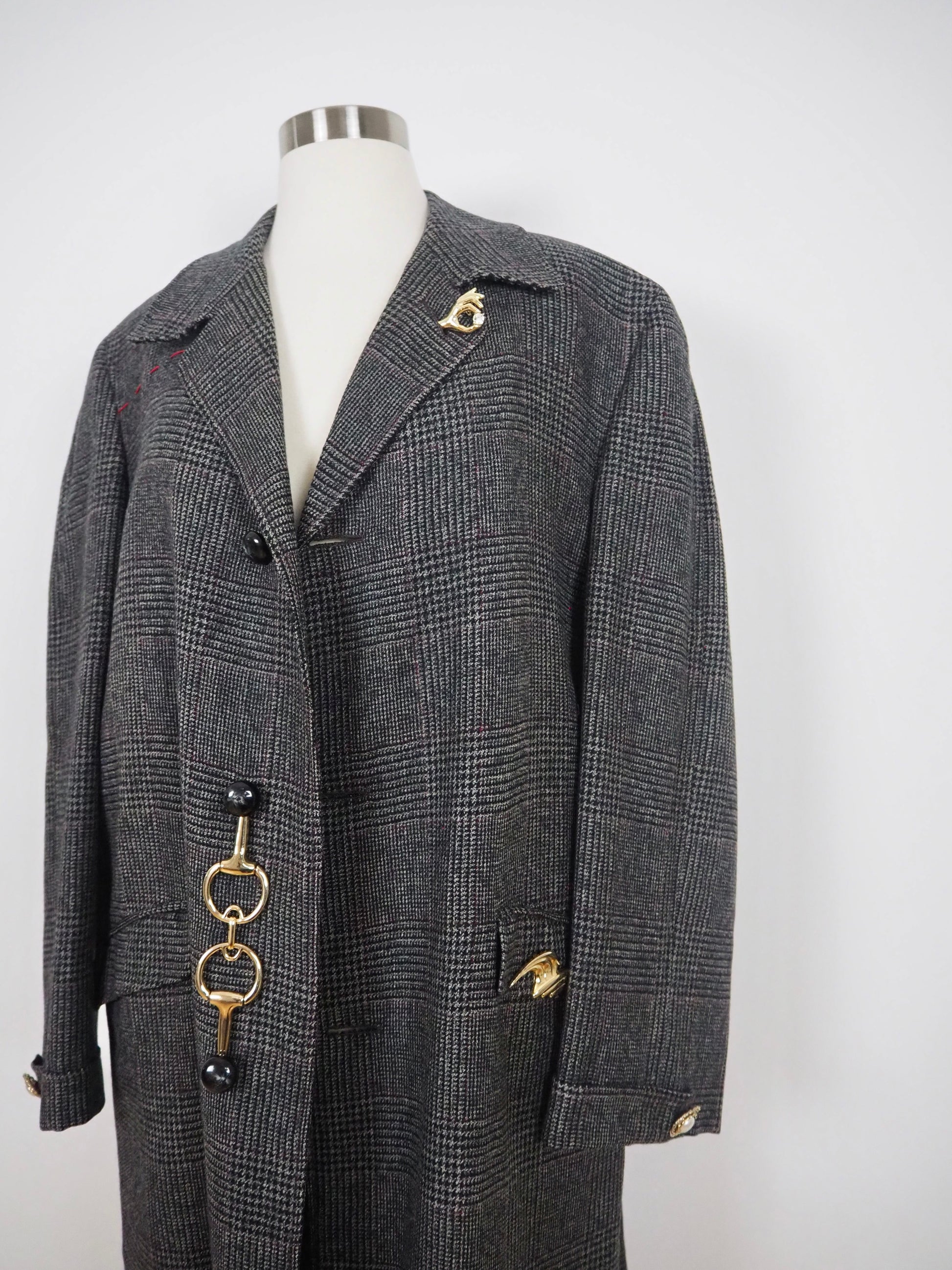 Vintage Wool 90s Anthracite Coat adorned by Jen Wonders with Vintage Gold brooches, Vintage Buttons and red stitching on top side as a sign of good fortune.