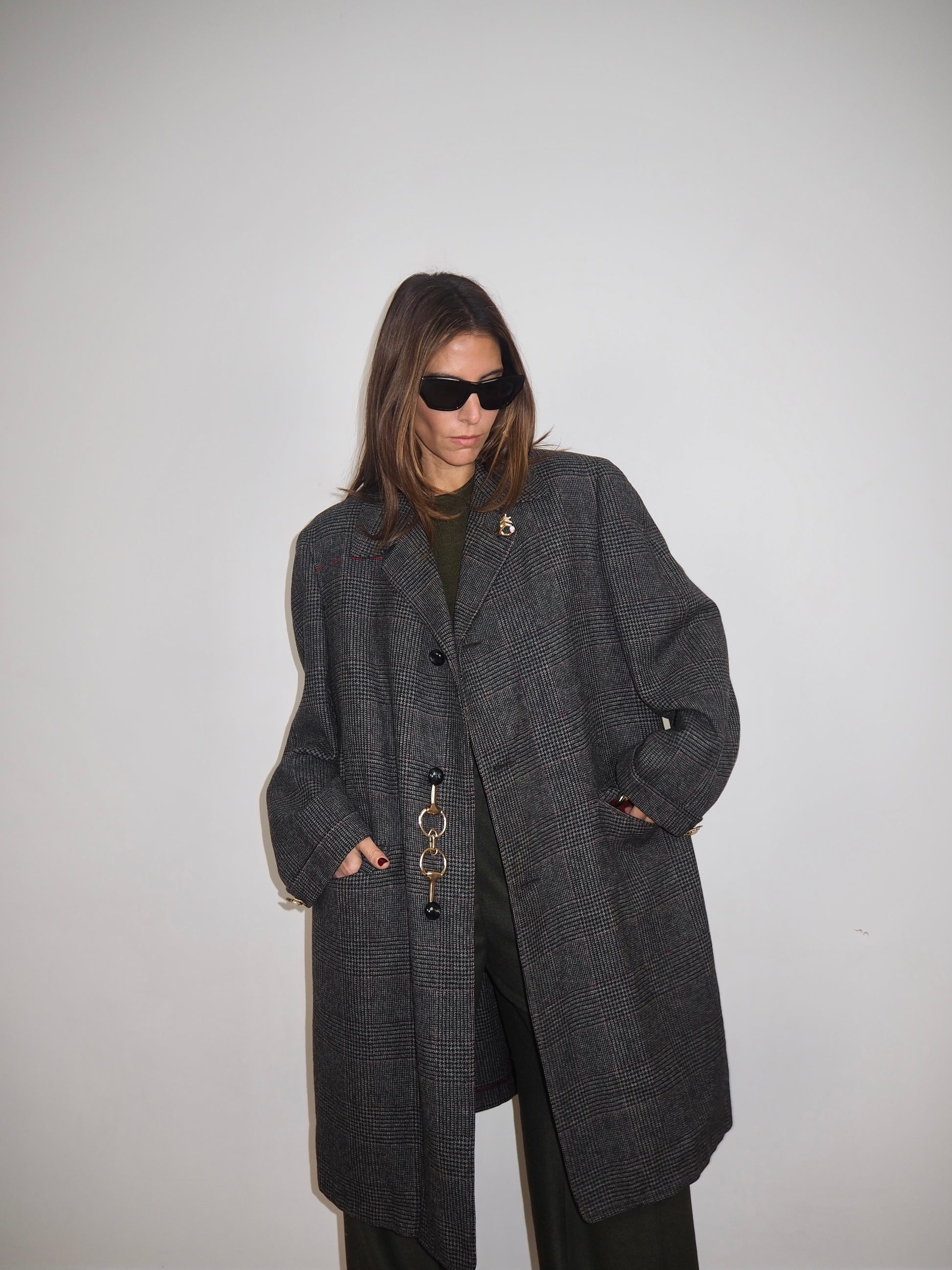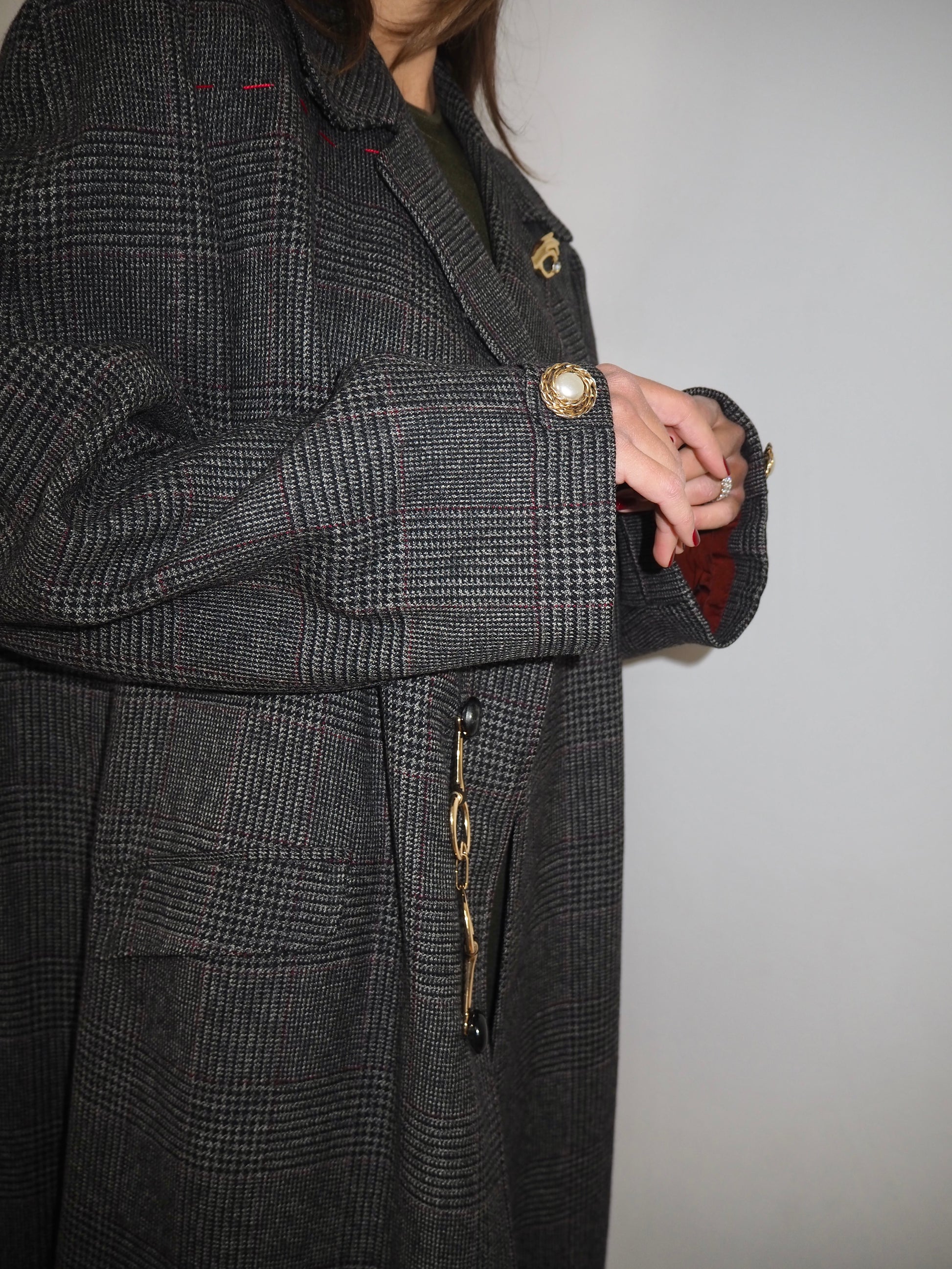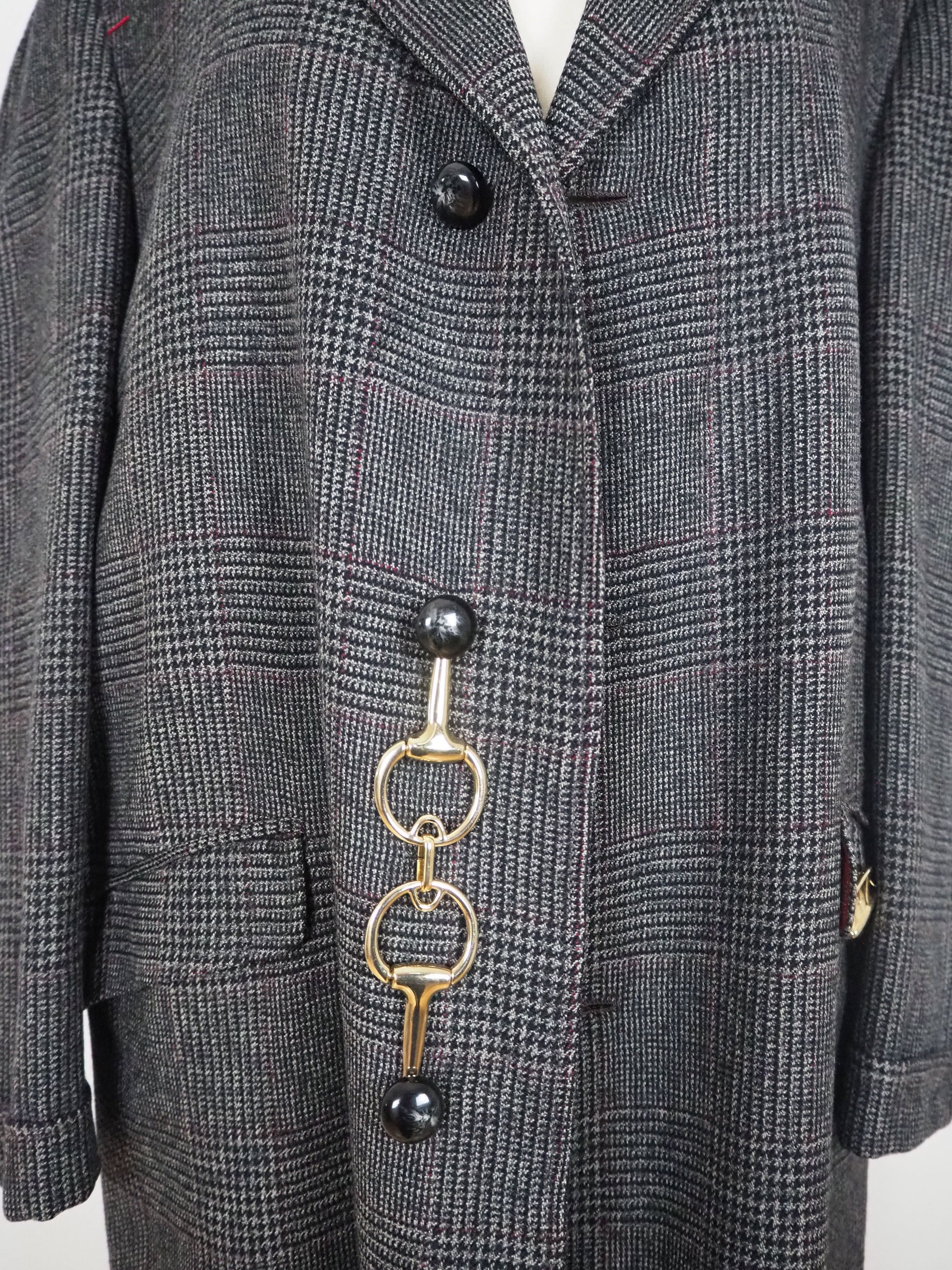 Vintage Wool 90s Anthracite Coat adorned by Jen Wonders with Vintage Gold brooches, Vintage Buttons and red stitching on top side as a sign of good fortune.