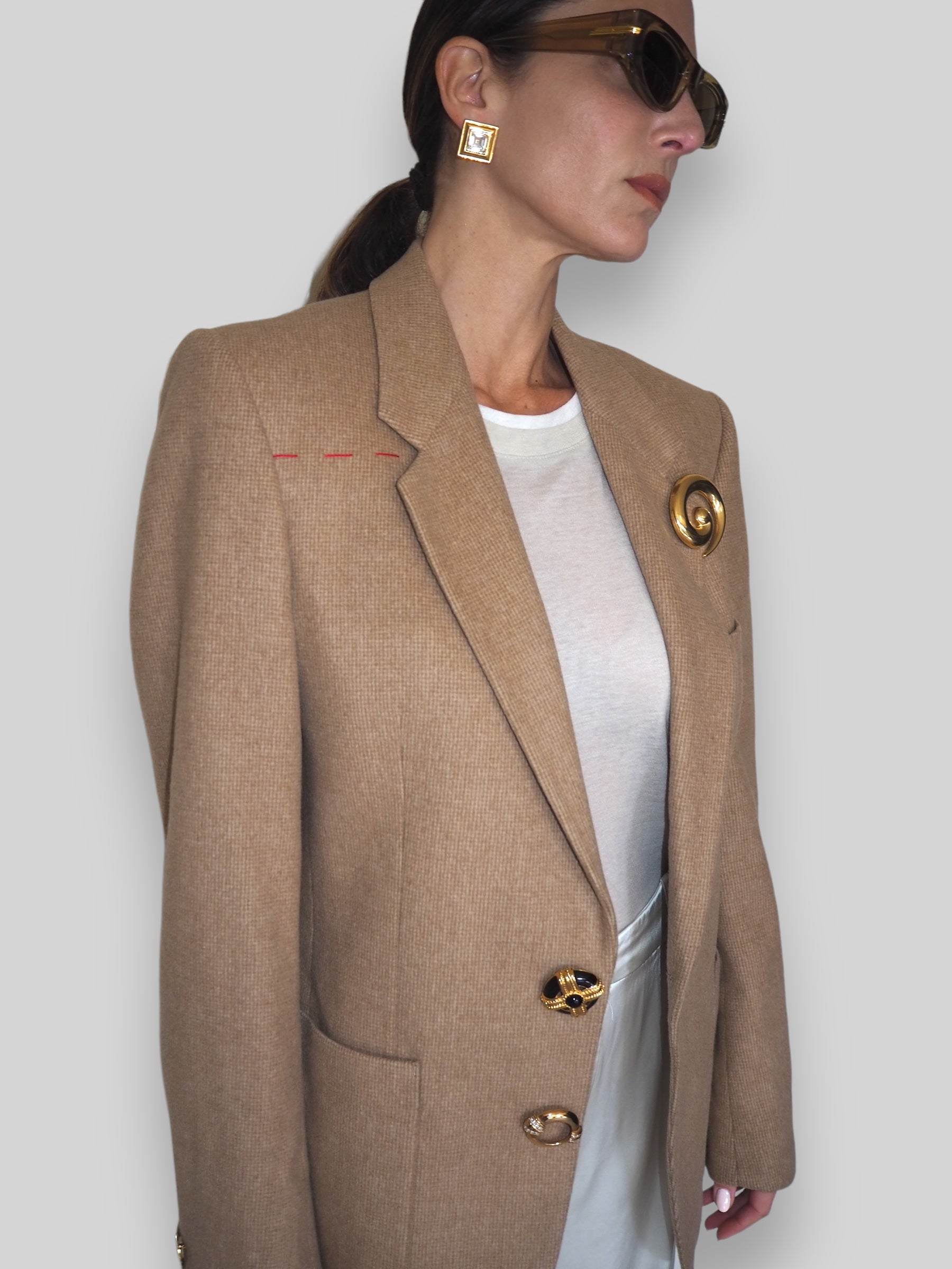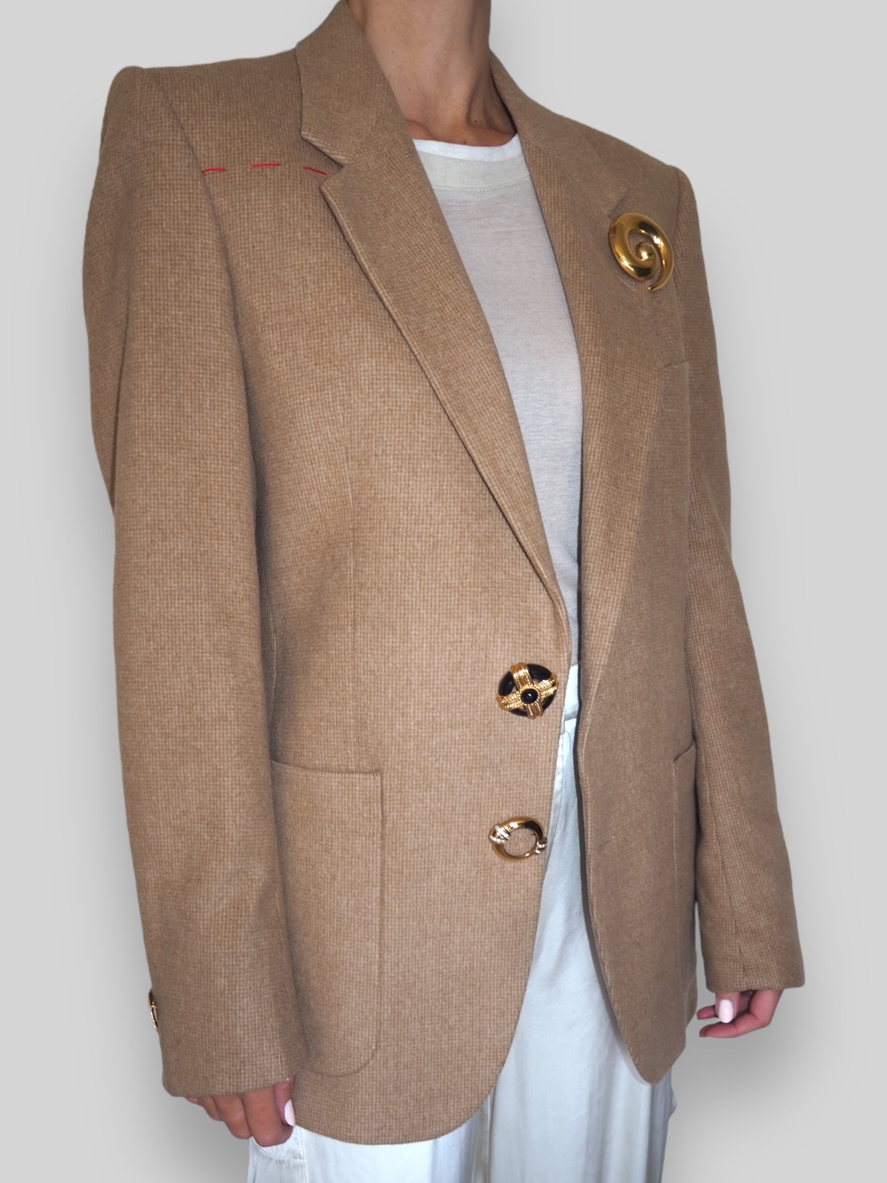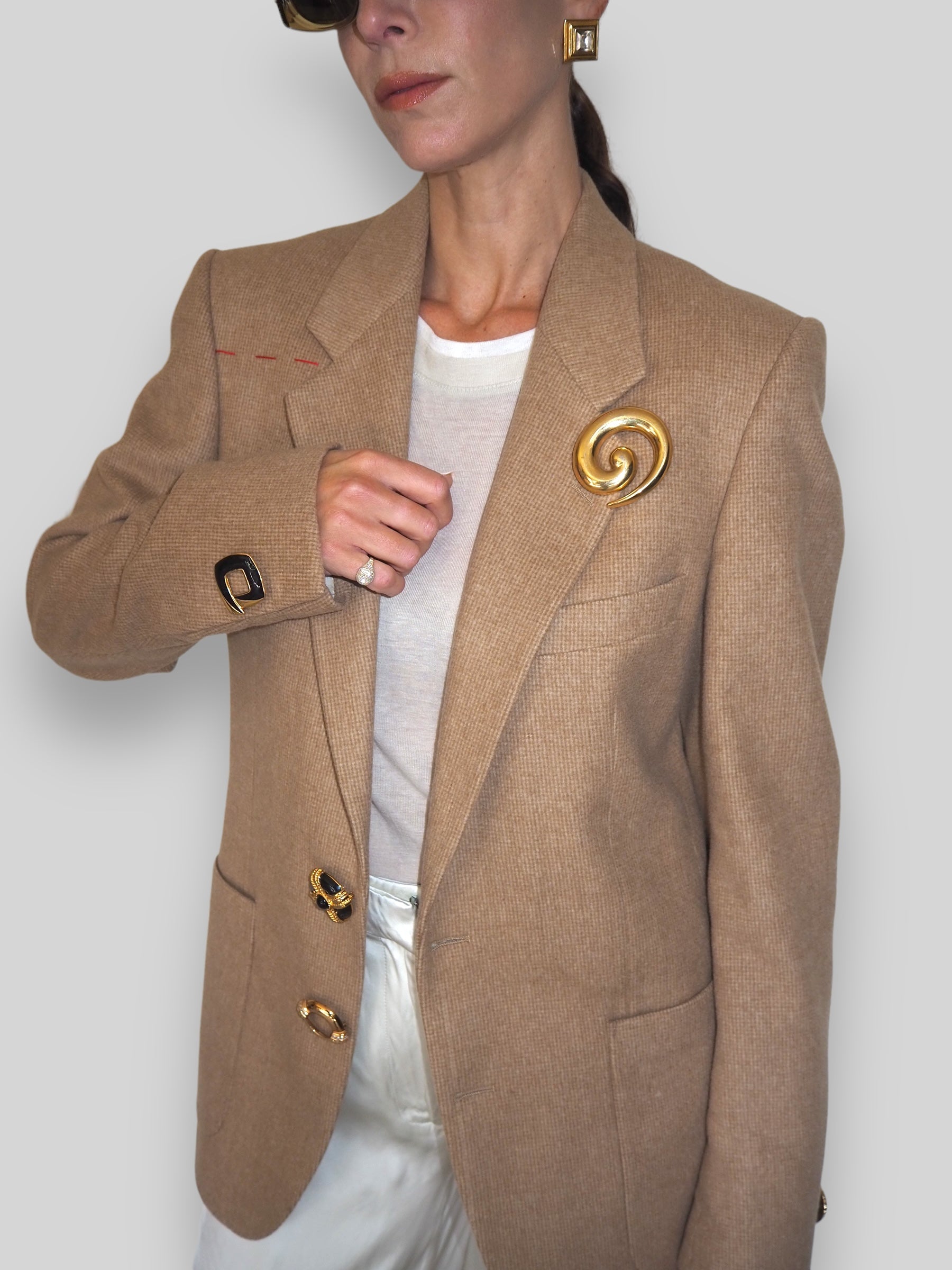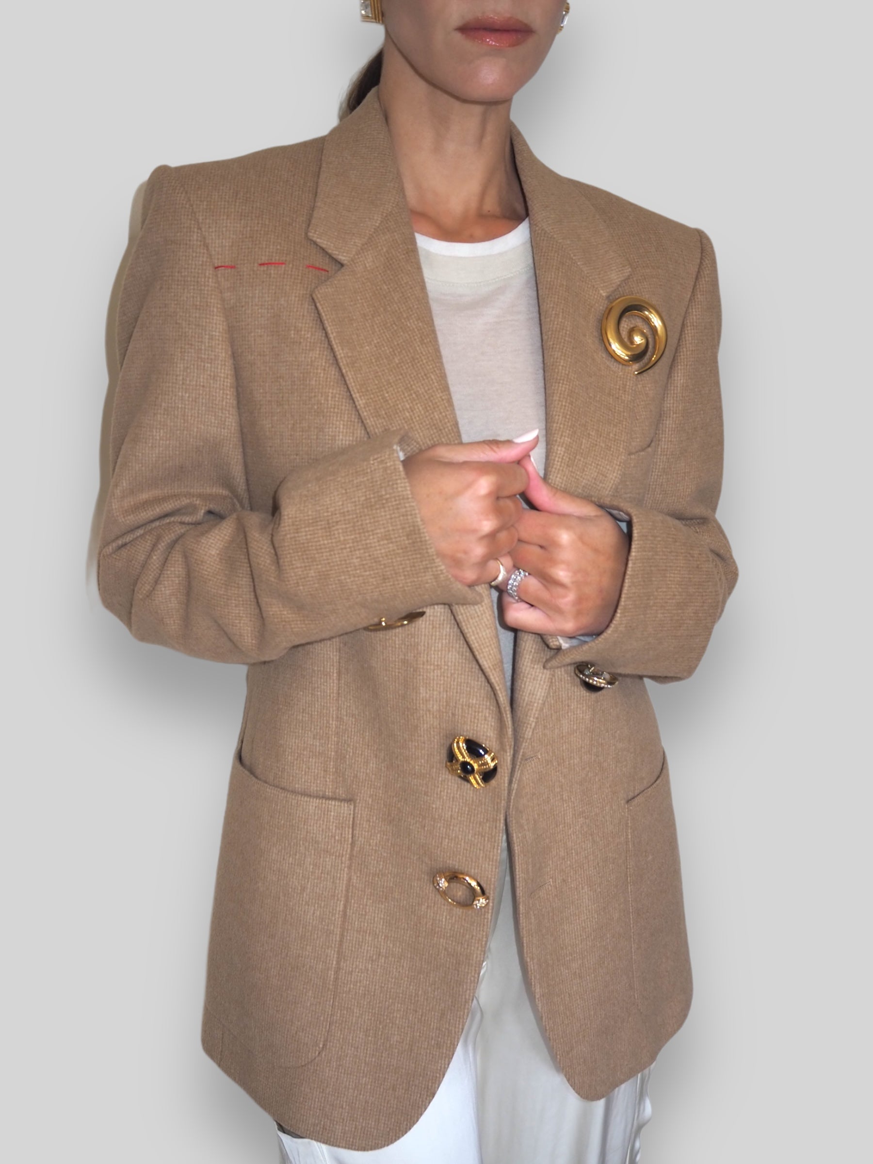 Vintage Yves Saint Laurent Beige Wool Blazer adorned by Jen Wonders with Vintage Gold tone, enamel black brooches and red stitching on top side as a sign of good fortune. The blazer is meant to stay open, but you can use the brooches to close if needed.
