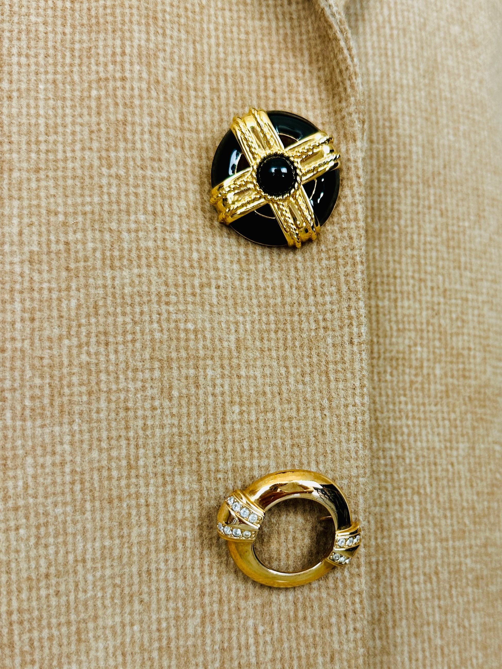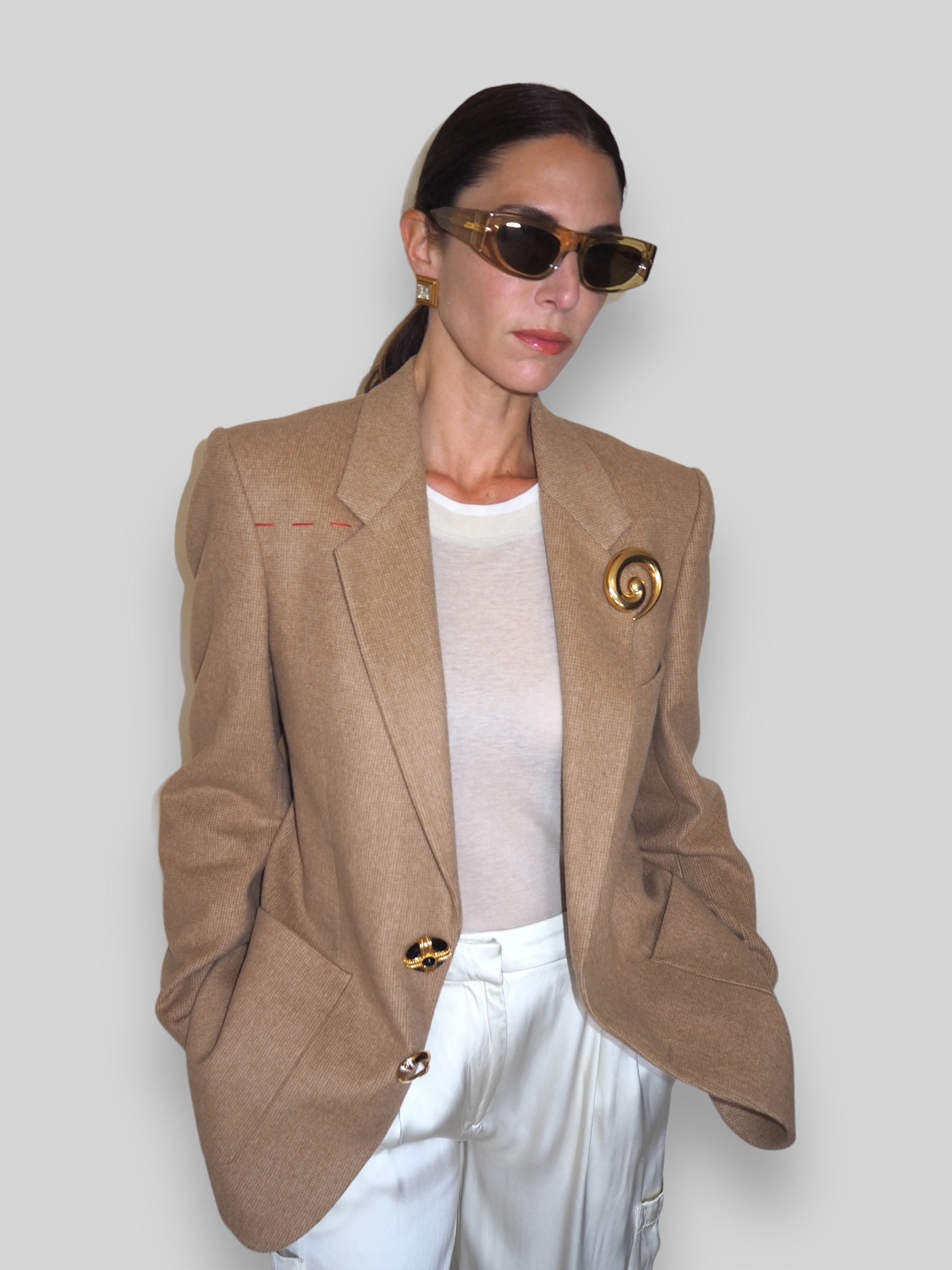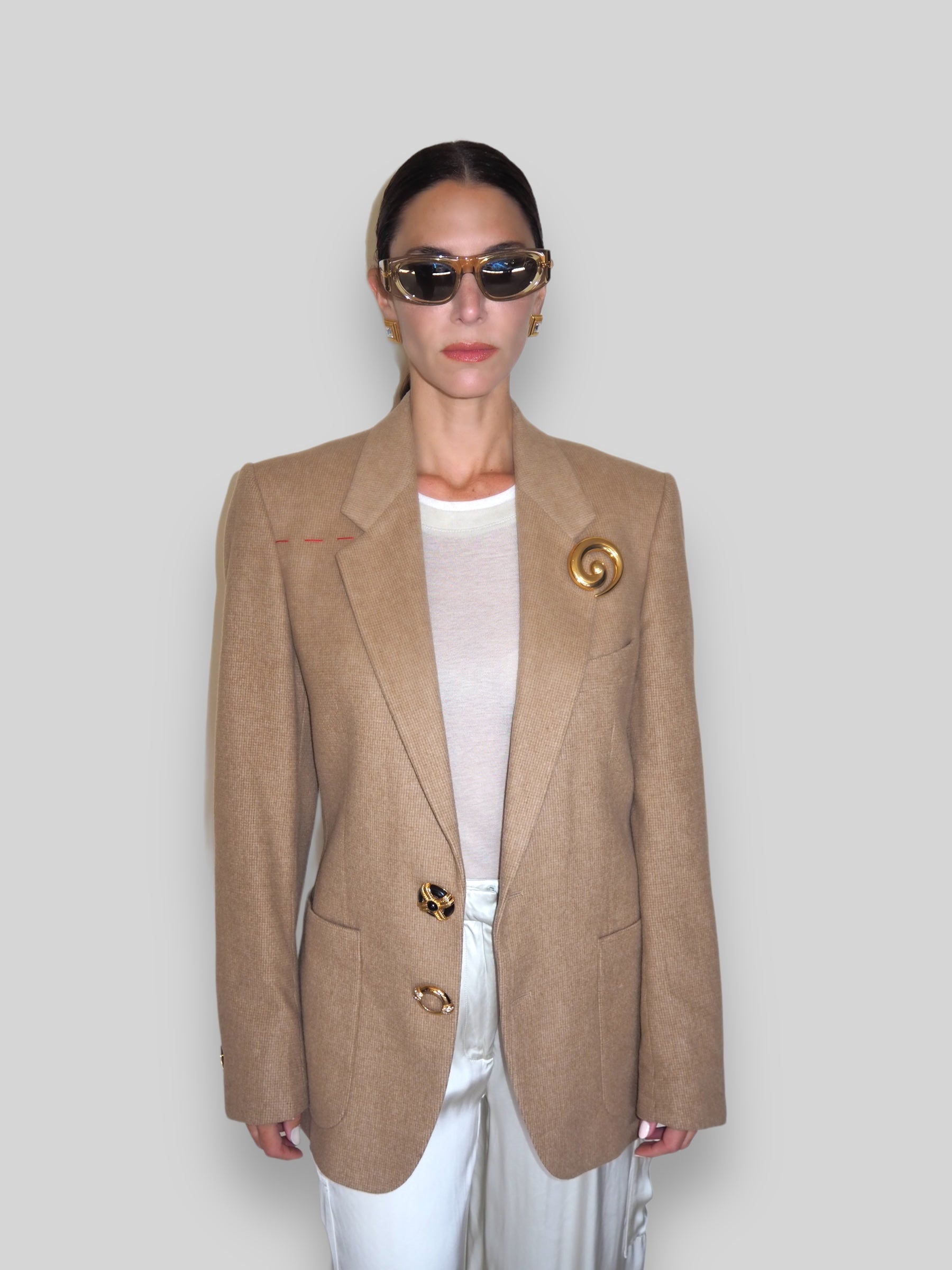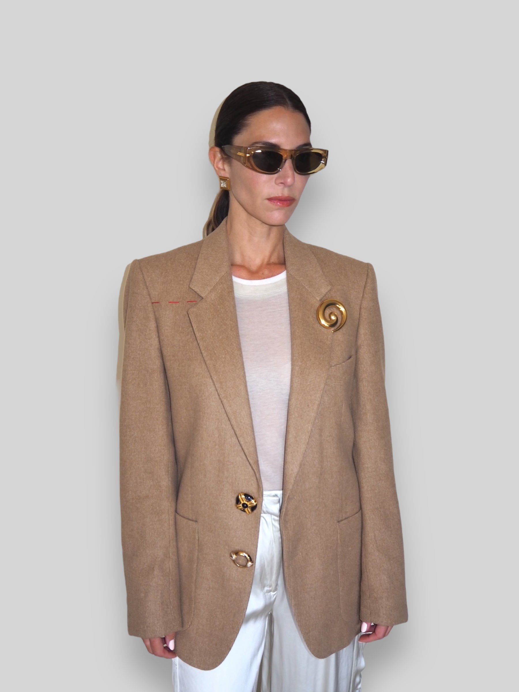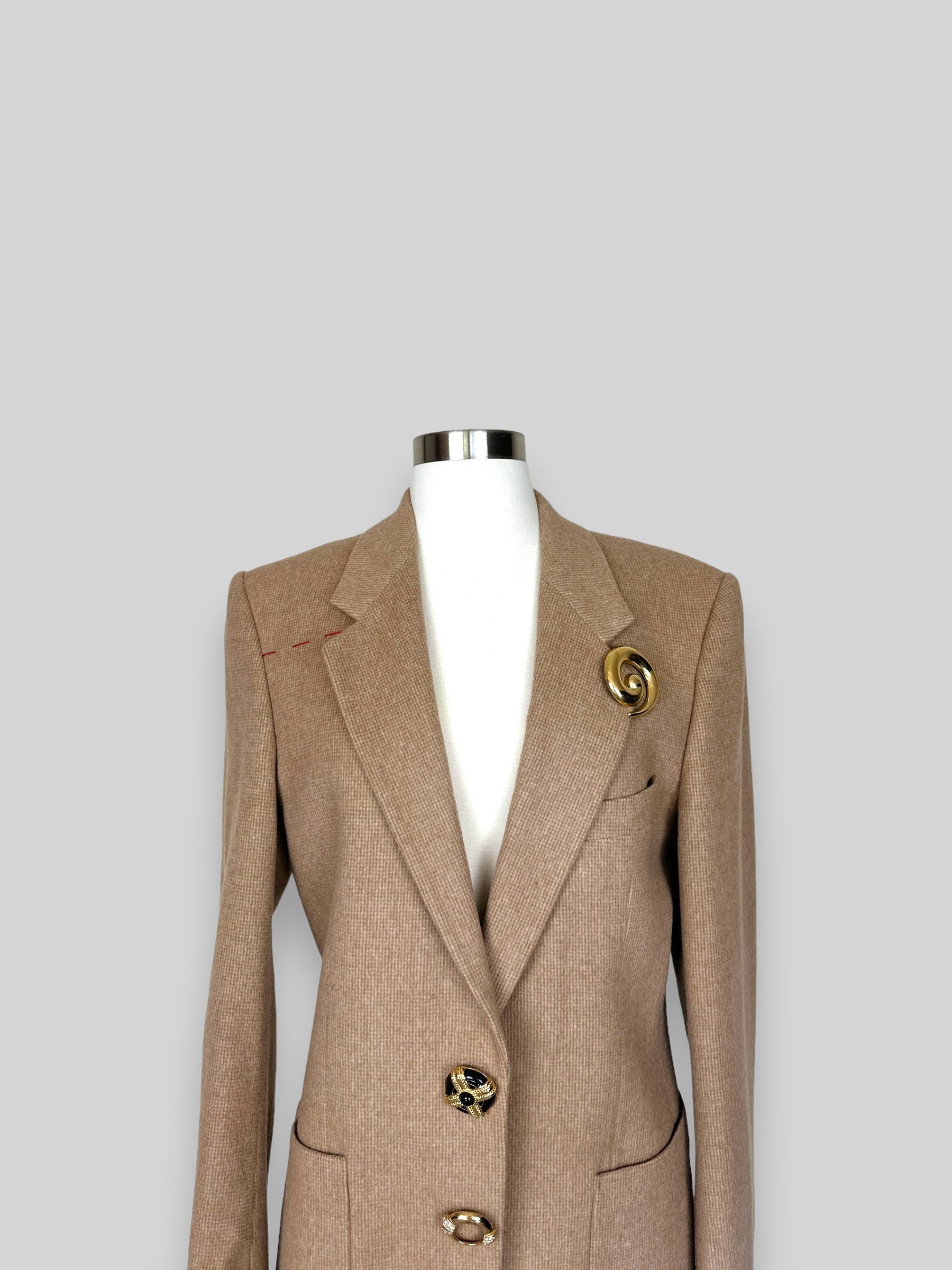 Vintage Yves Saint Laurent Beige Wool Blazer adorned by Jen Wonders with Vintage Gold tone, enamel black brooches and red stitching on top side as a sign of good fortune. The blazer is meant to stay open, but you can use the brooches to close if needed.