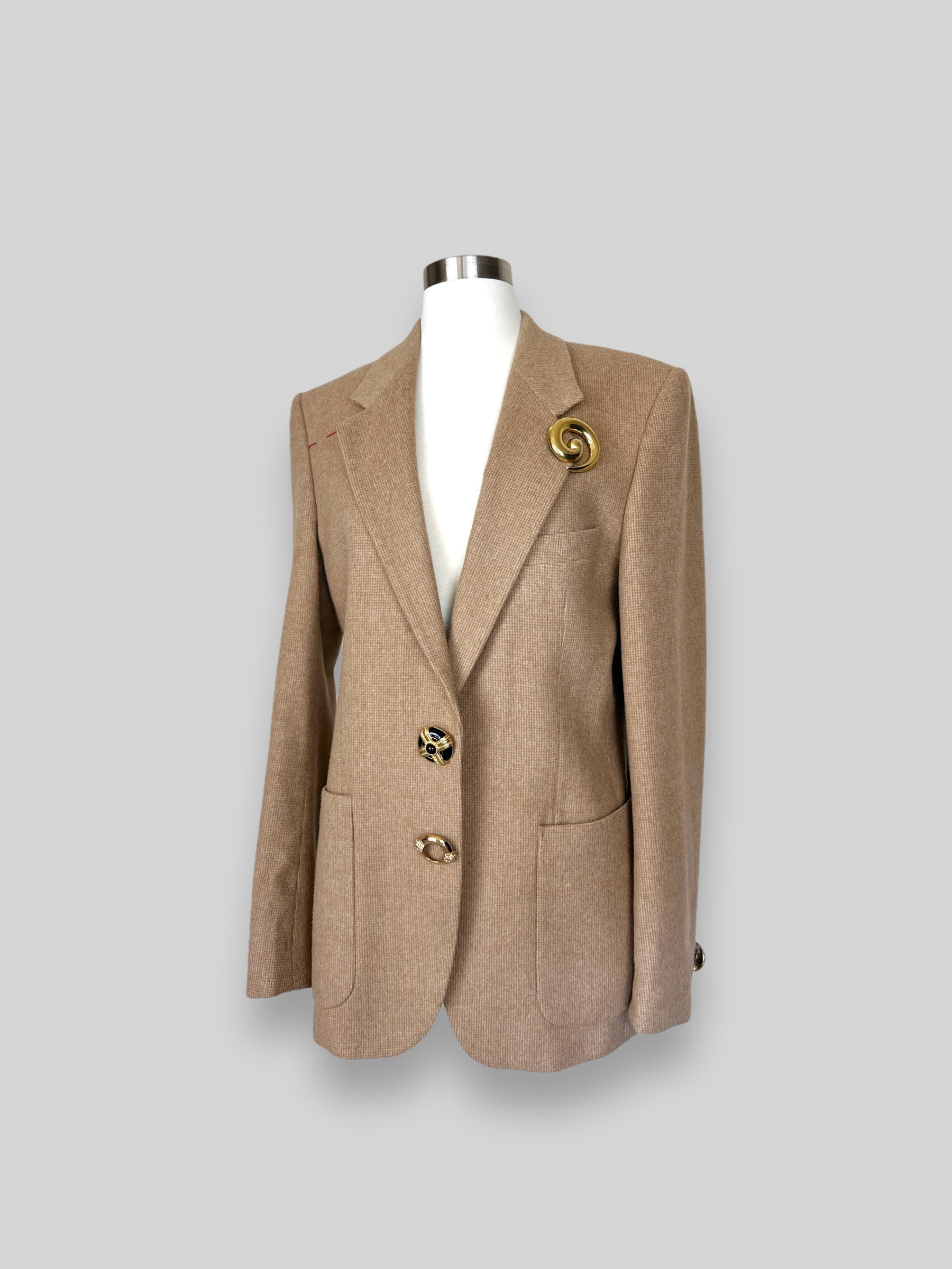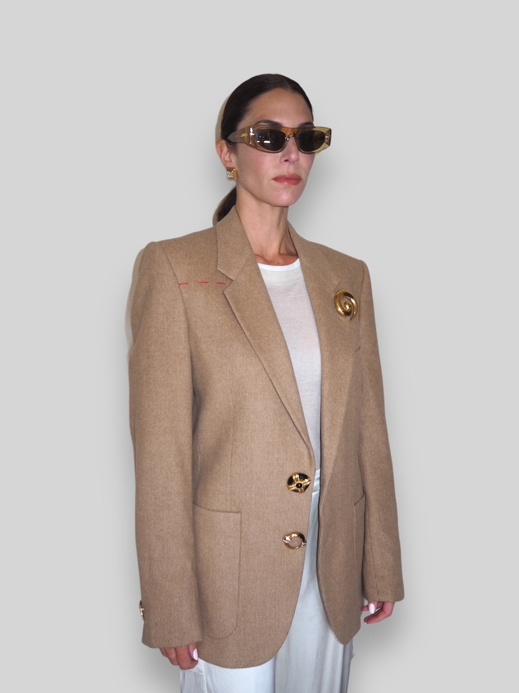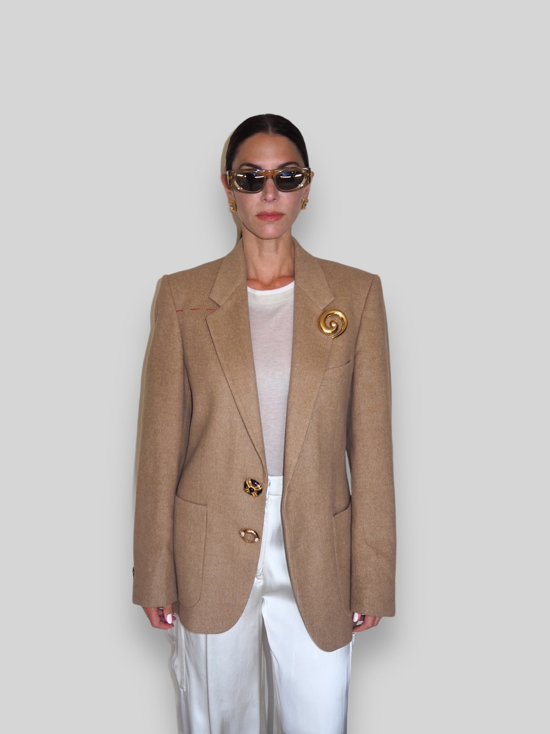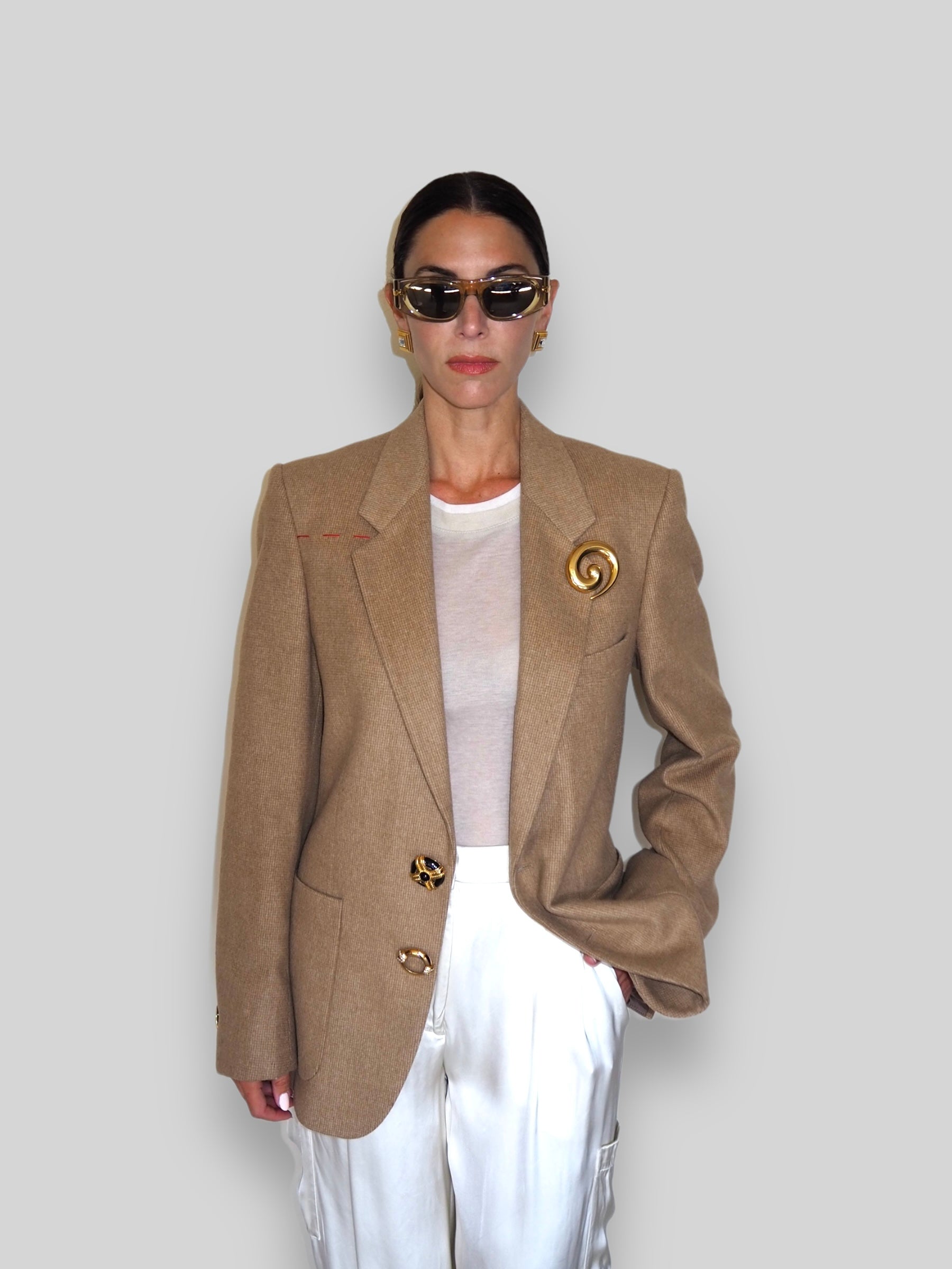 Vintage Yves Saint Laurent Beige Wool Blazer adorned by Jen Wonders with Vintage Gold tone, enamel black brooches and red stitching on top side as a sign of good fortune. The blazer is meant to stay open, but you can use the brooches to close if needed.