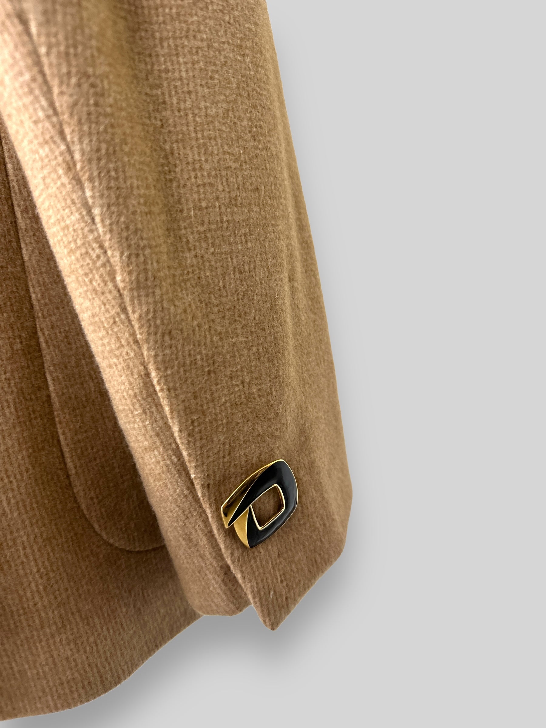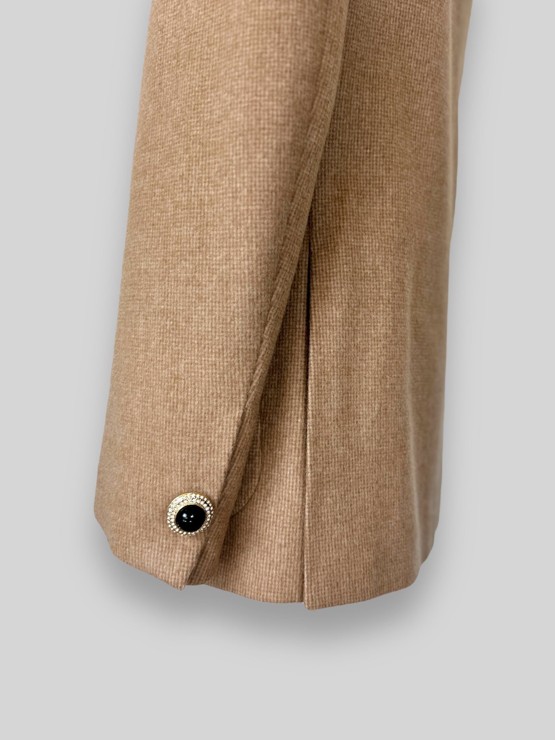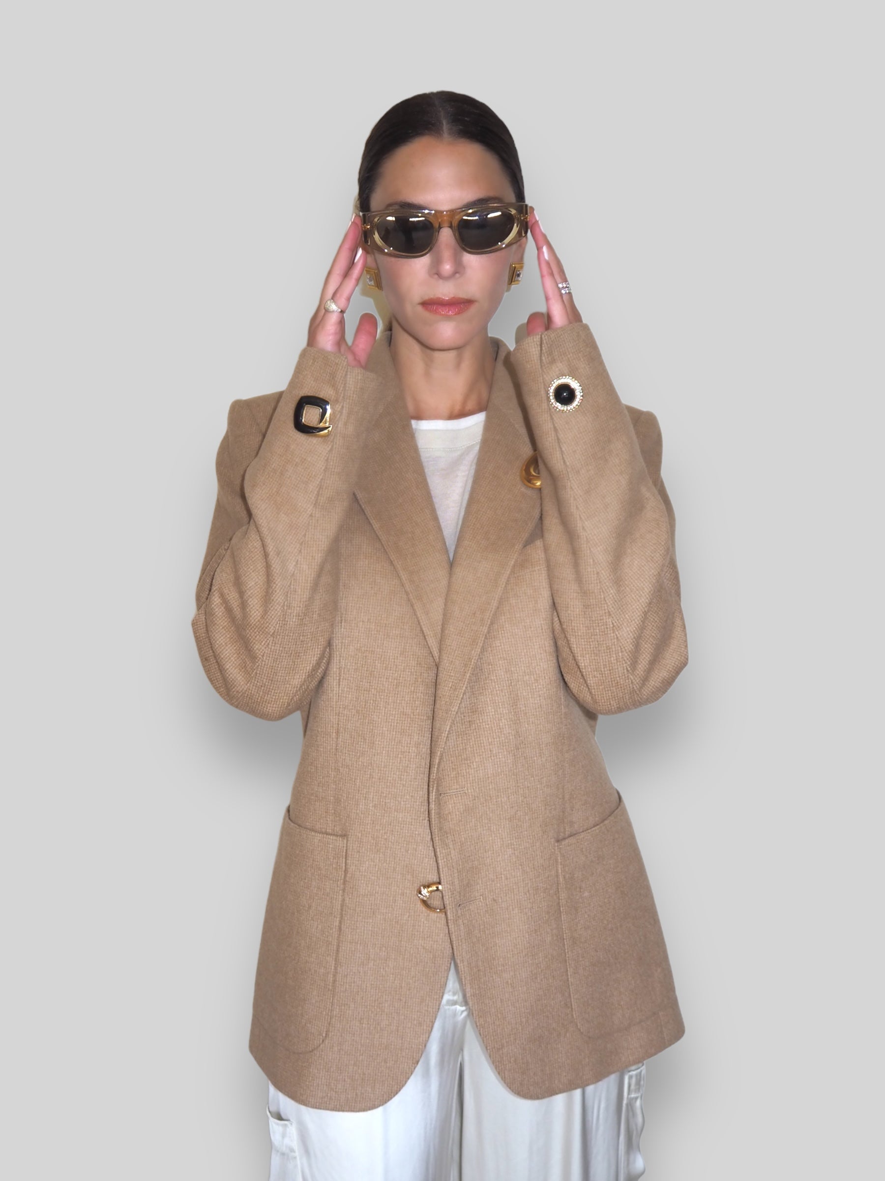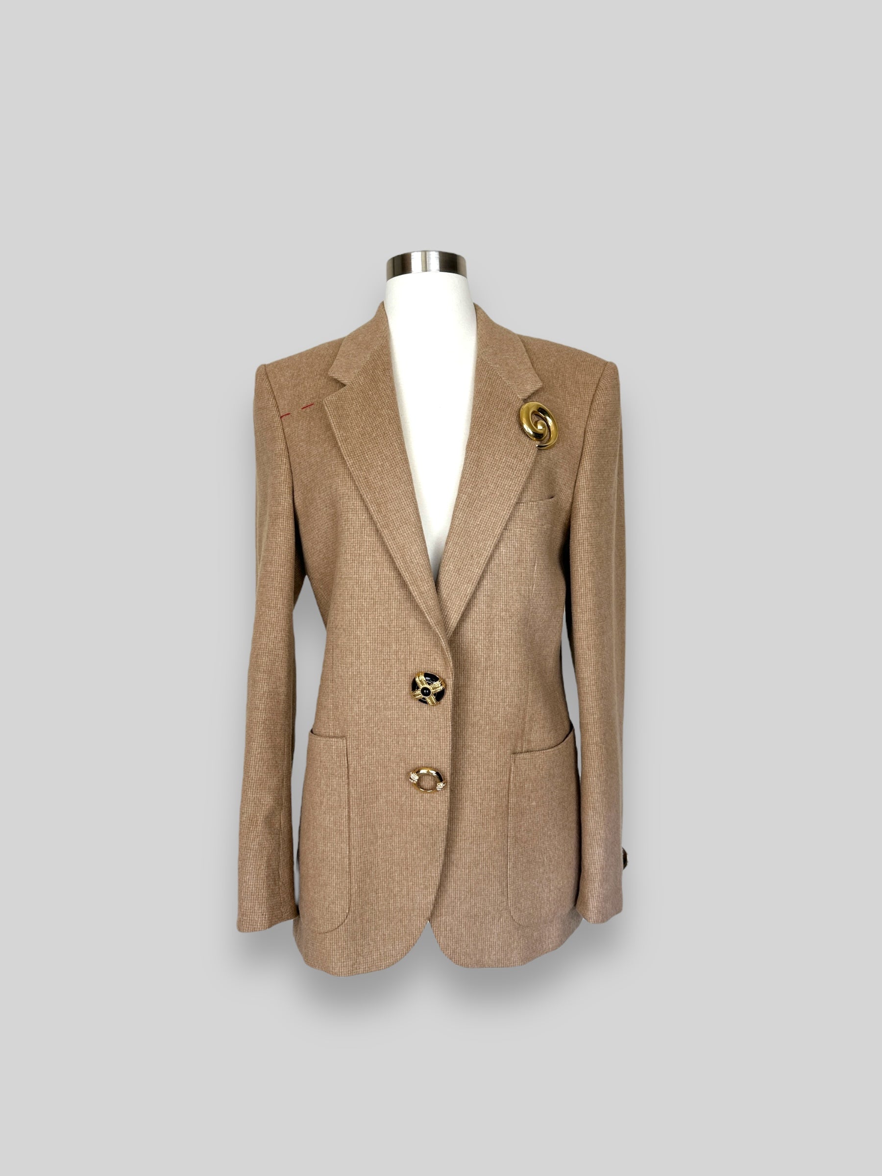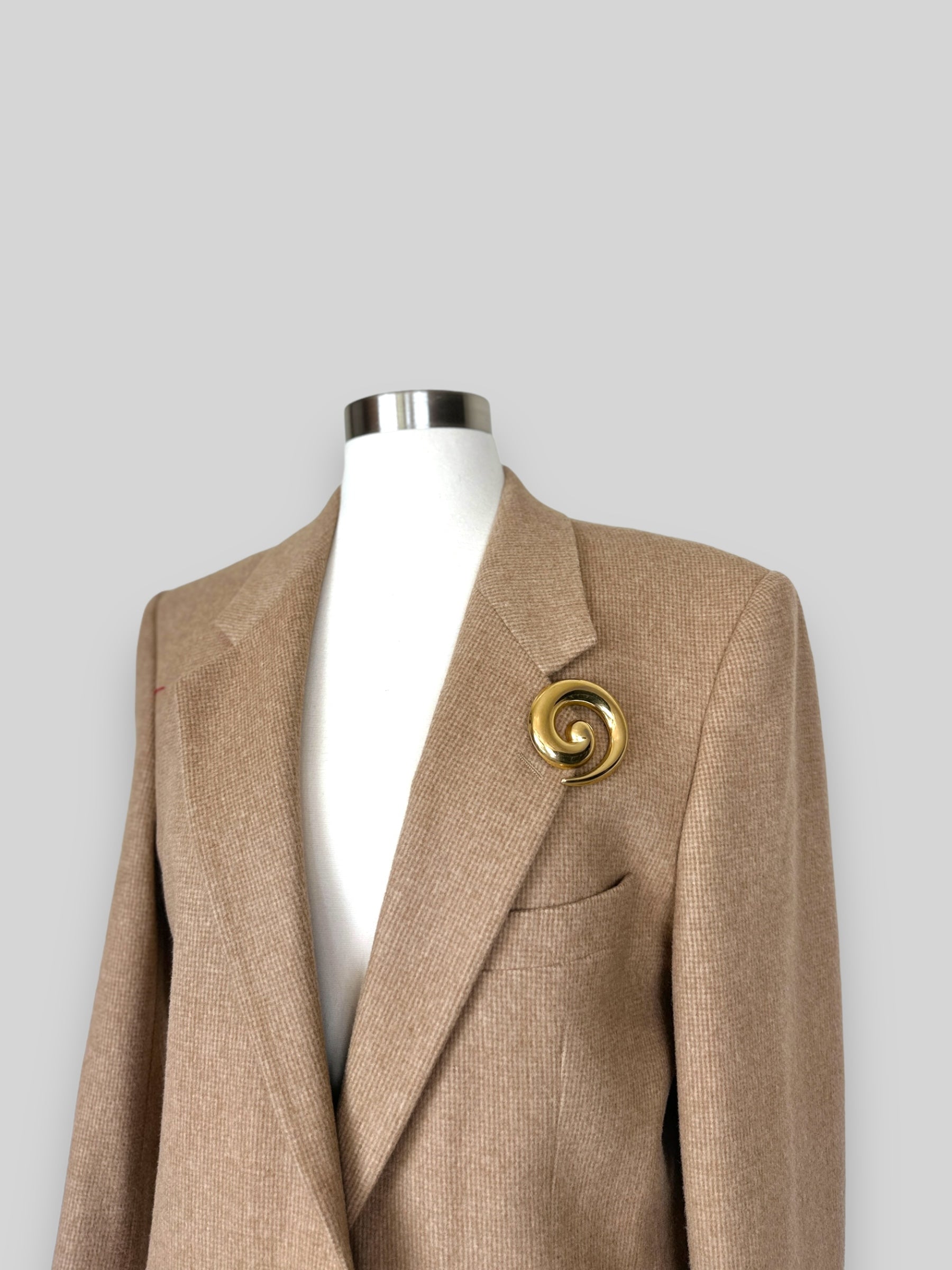 Vintage Yves Saint Laurent Beige Wool Blazer adorned by Jen Wonders with Vintage Gold tone, enamel black brooches and red stitching on top side as a sign of good fortune. The blazer is meant to stay open, but you can use the brooches to close if needed.