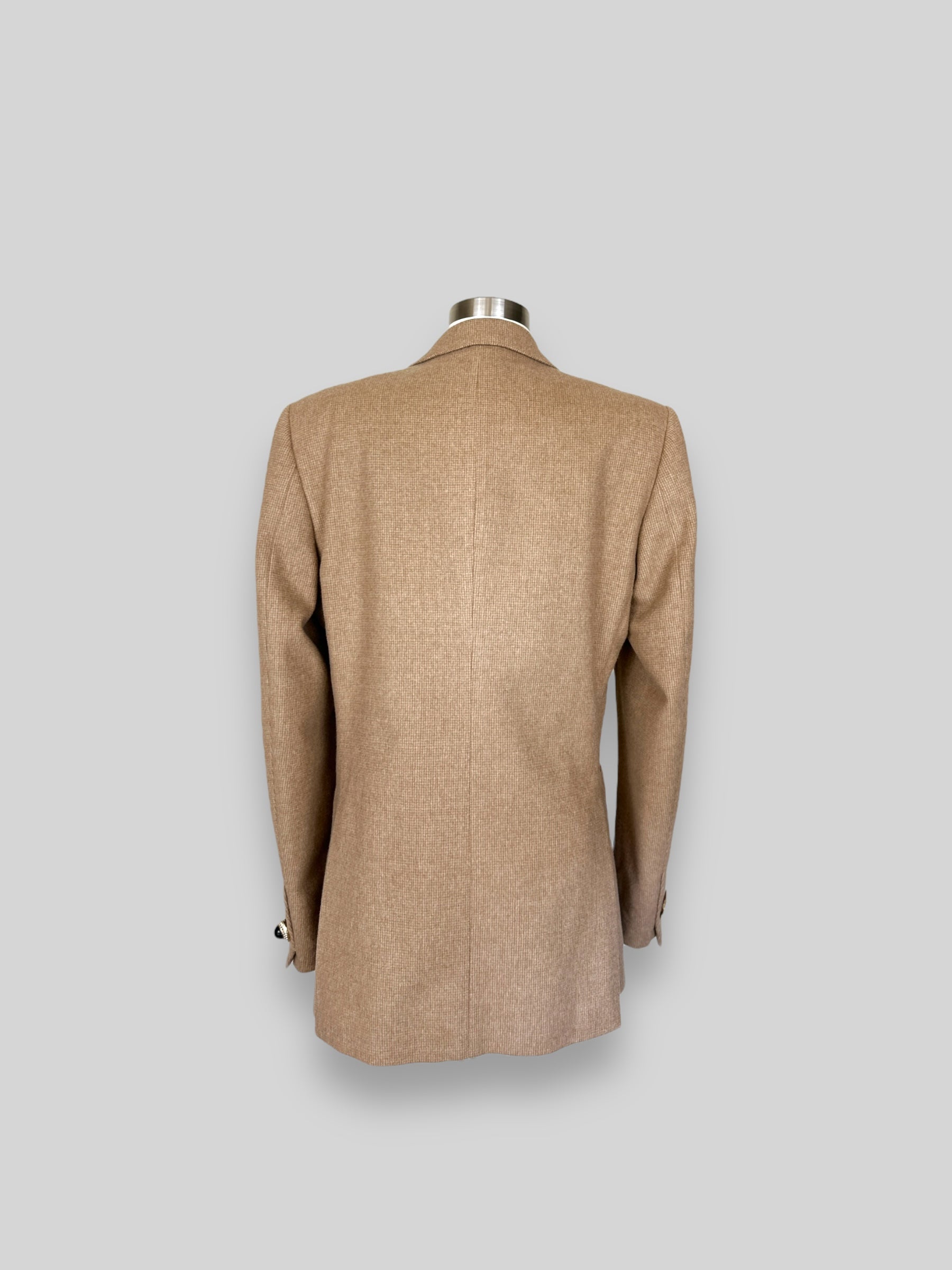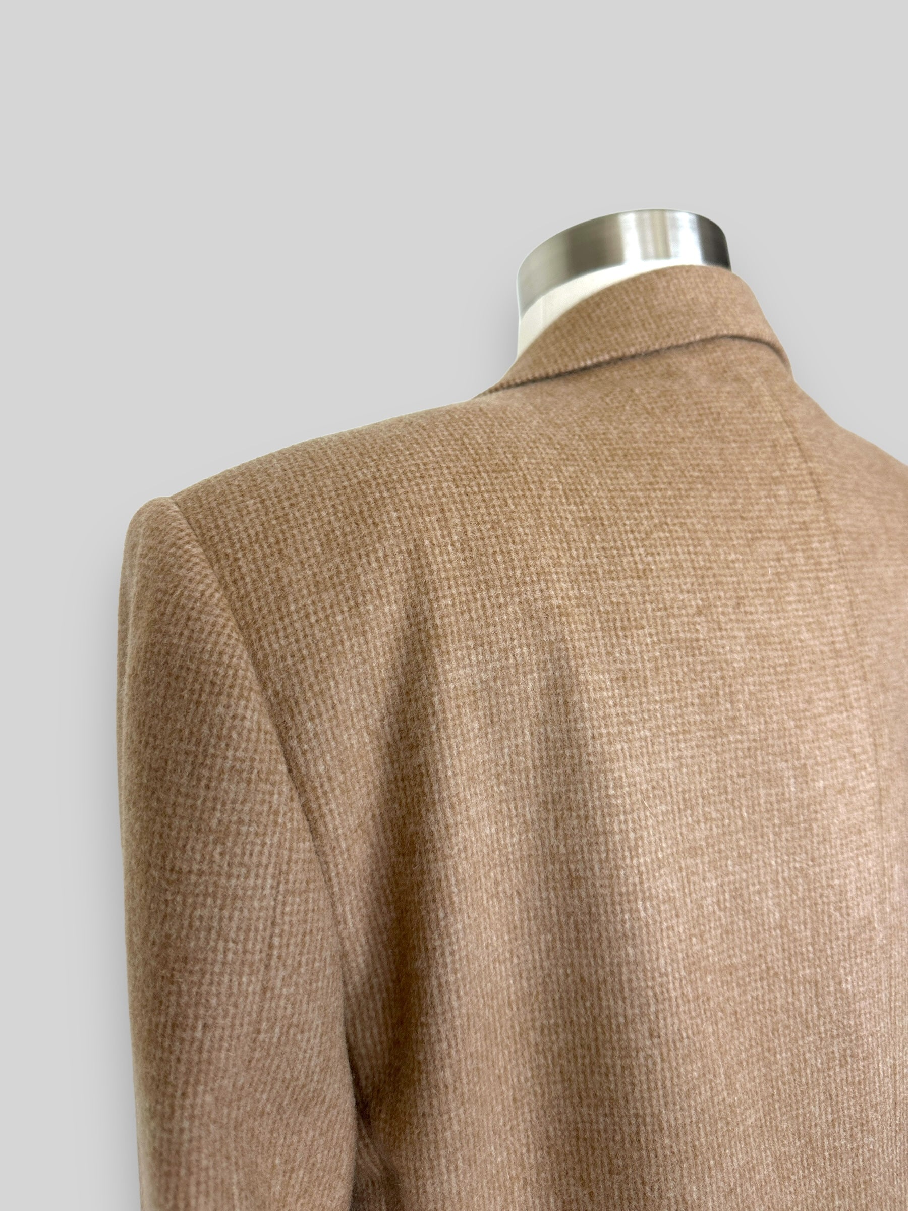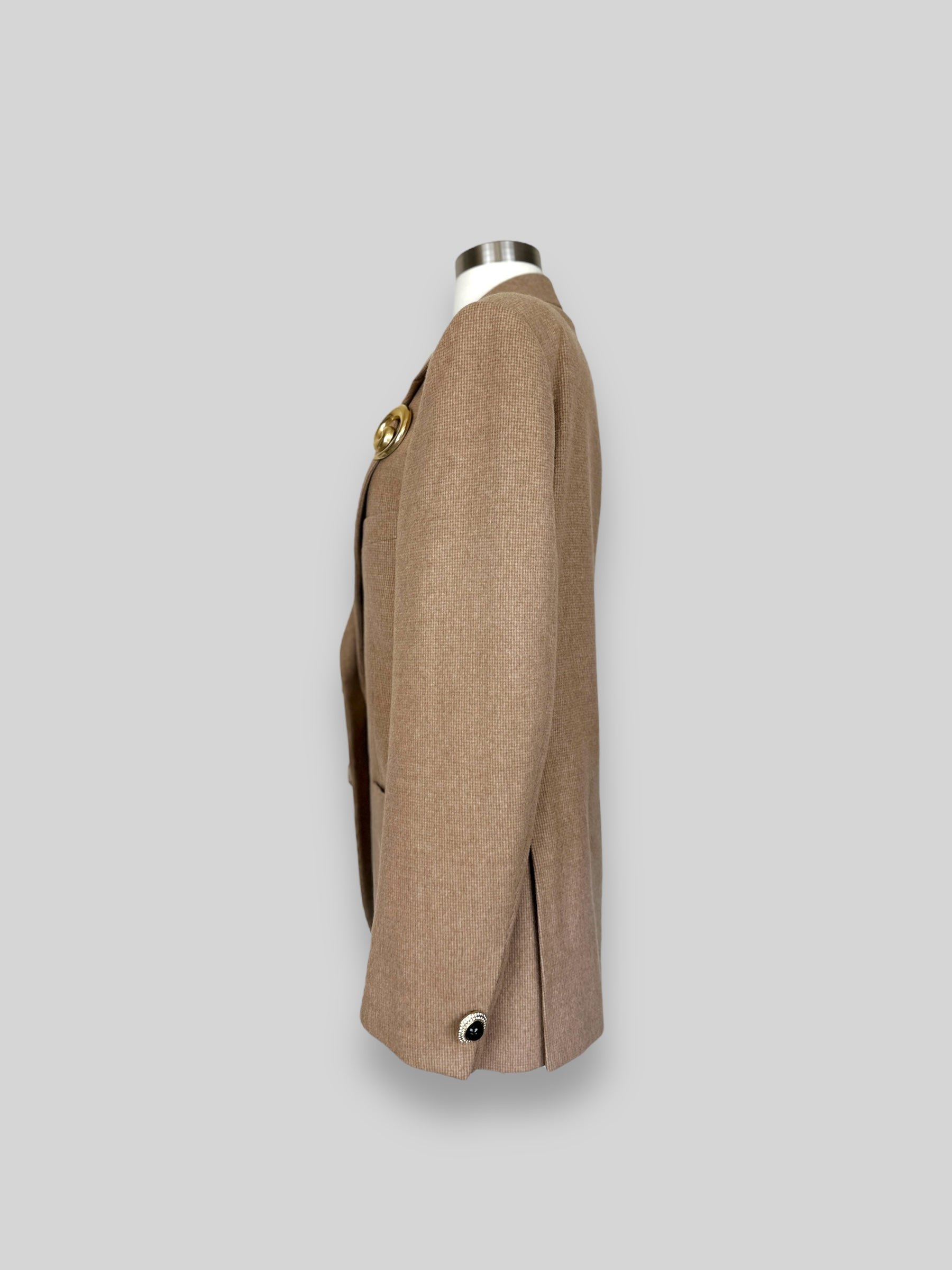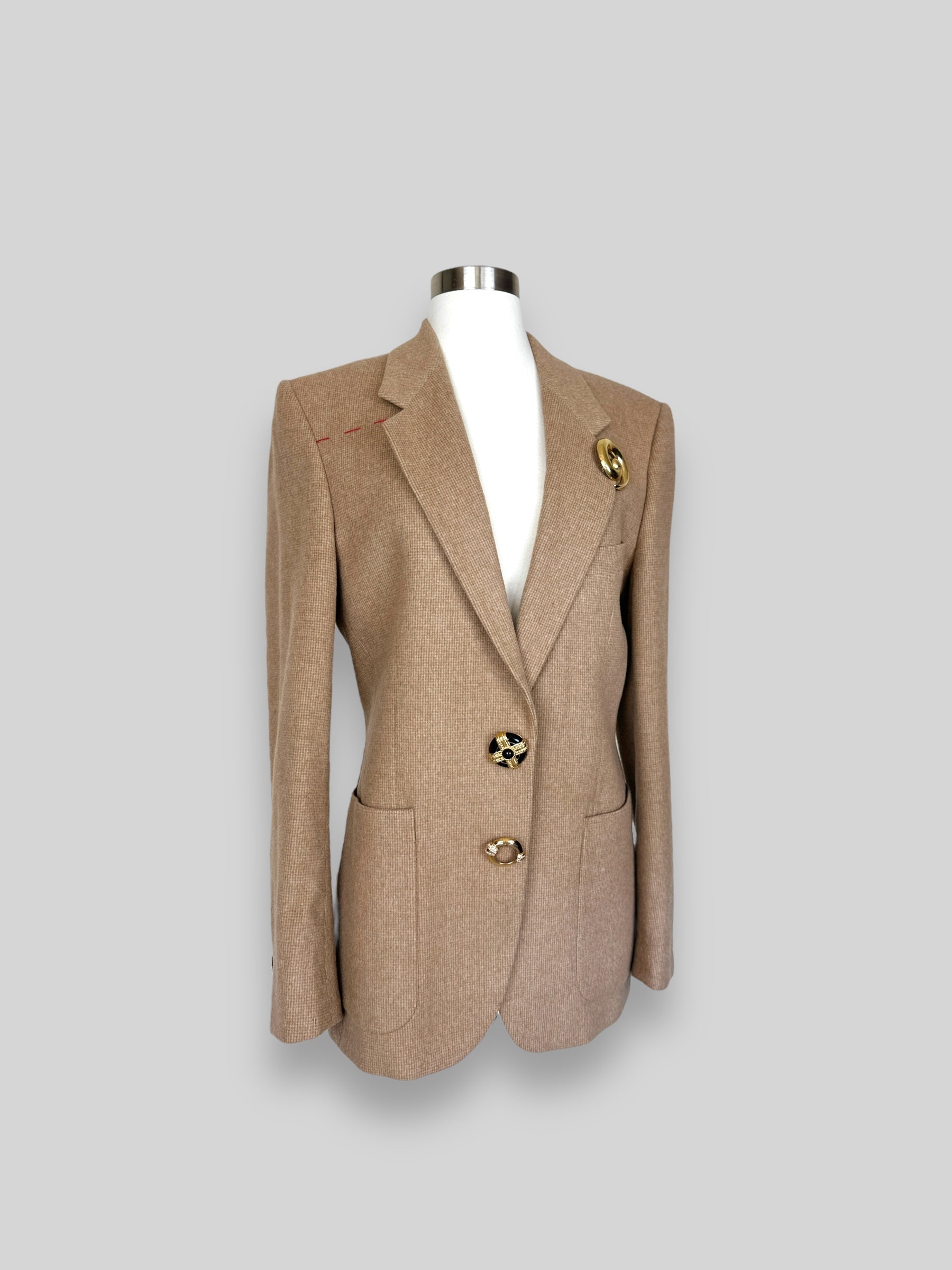 Vintage Yves Saint Laurent Beige Wool Blazer adorned by Jen Wonders with Vintage Gold tone, enamel black brooches and red stitching on top side as a sign of good fortune. The blazer is meant to stay open, but you can use the brooches to close if needed.
