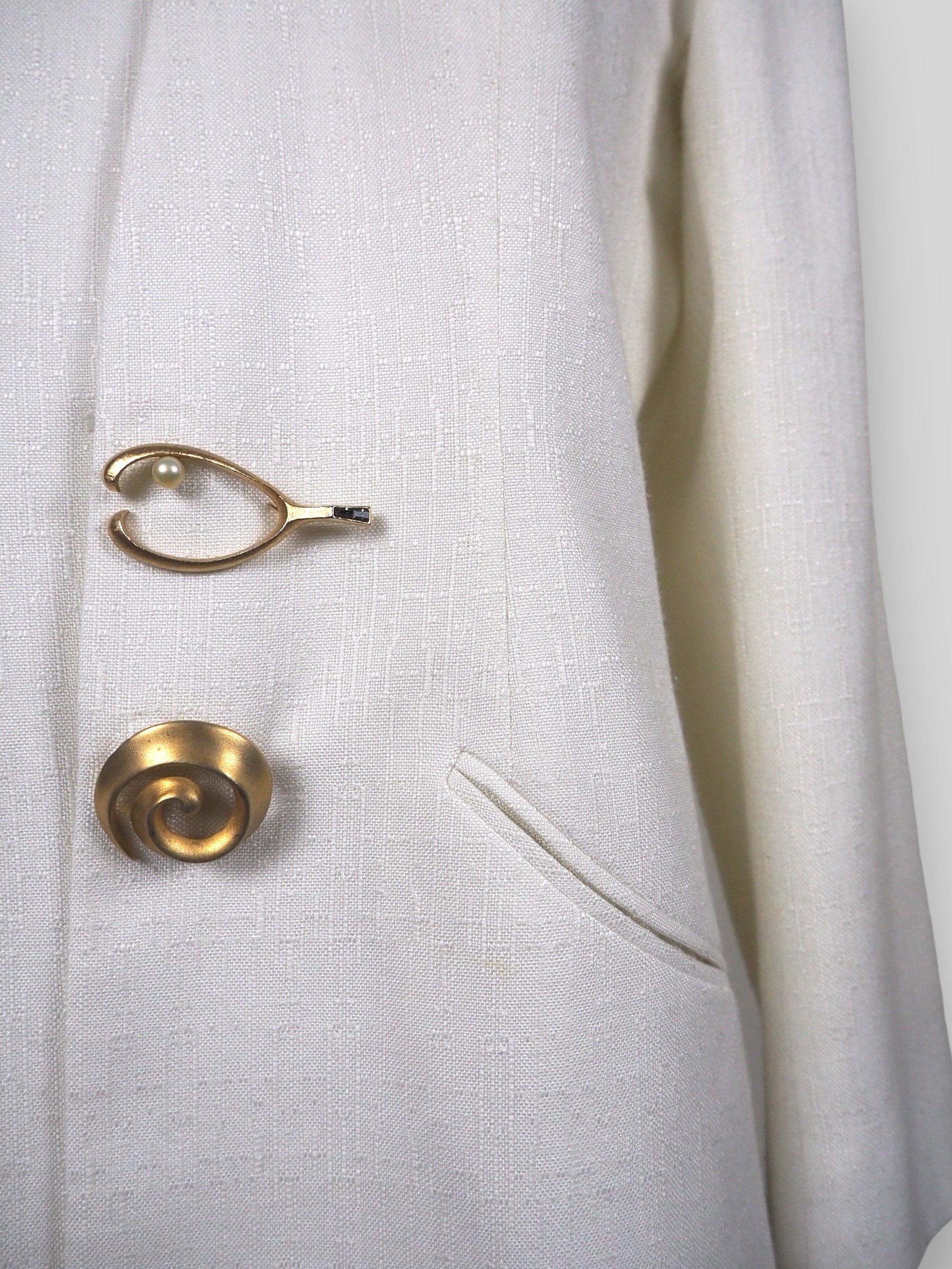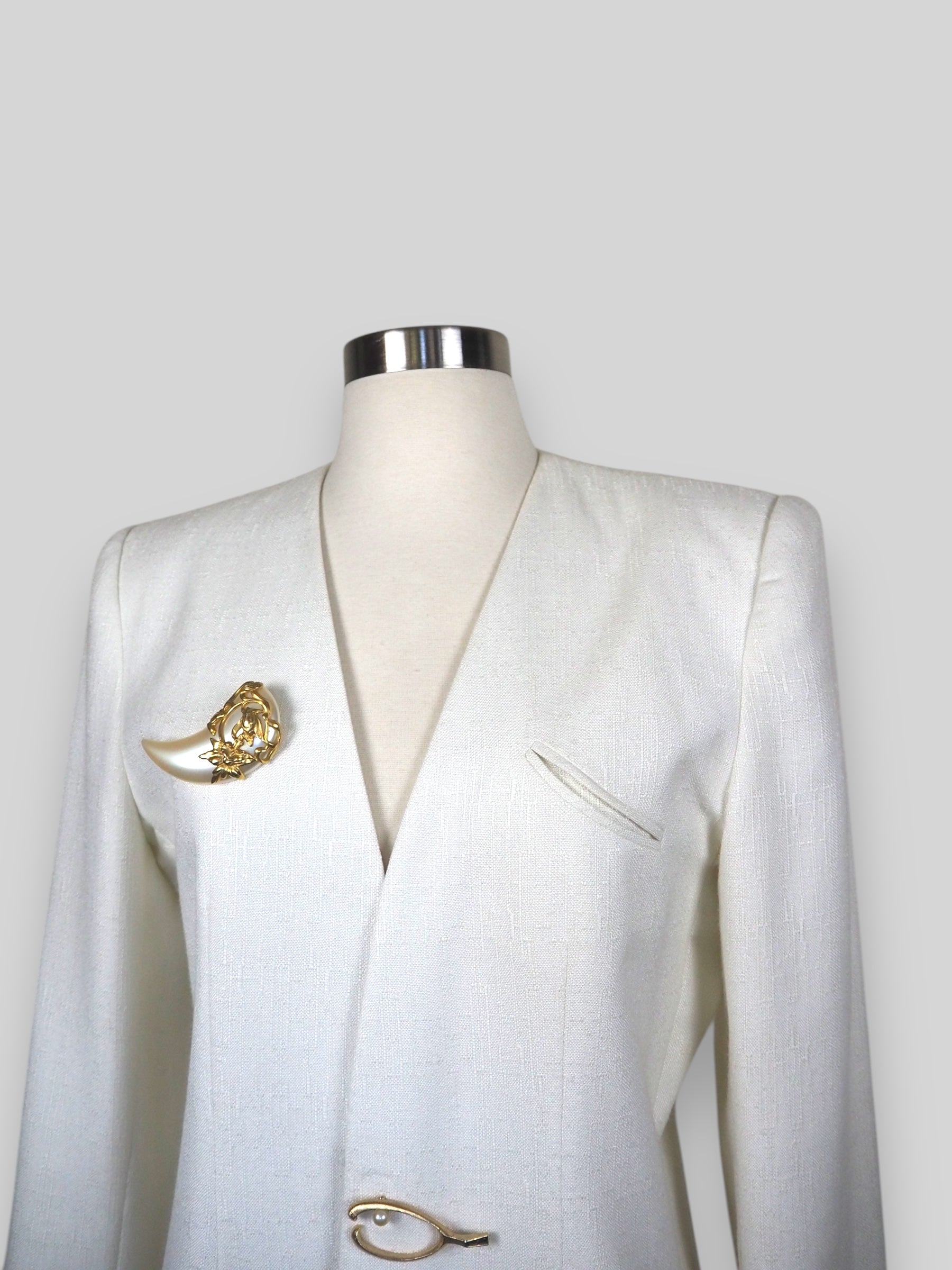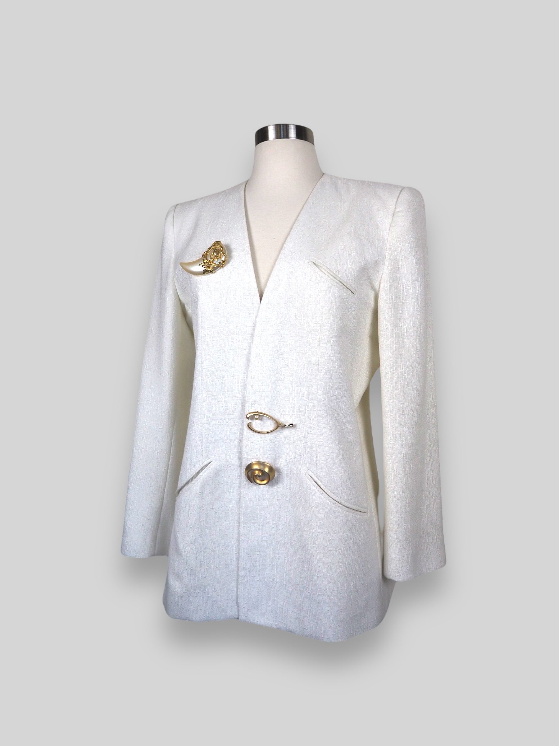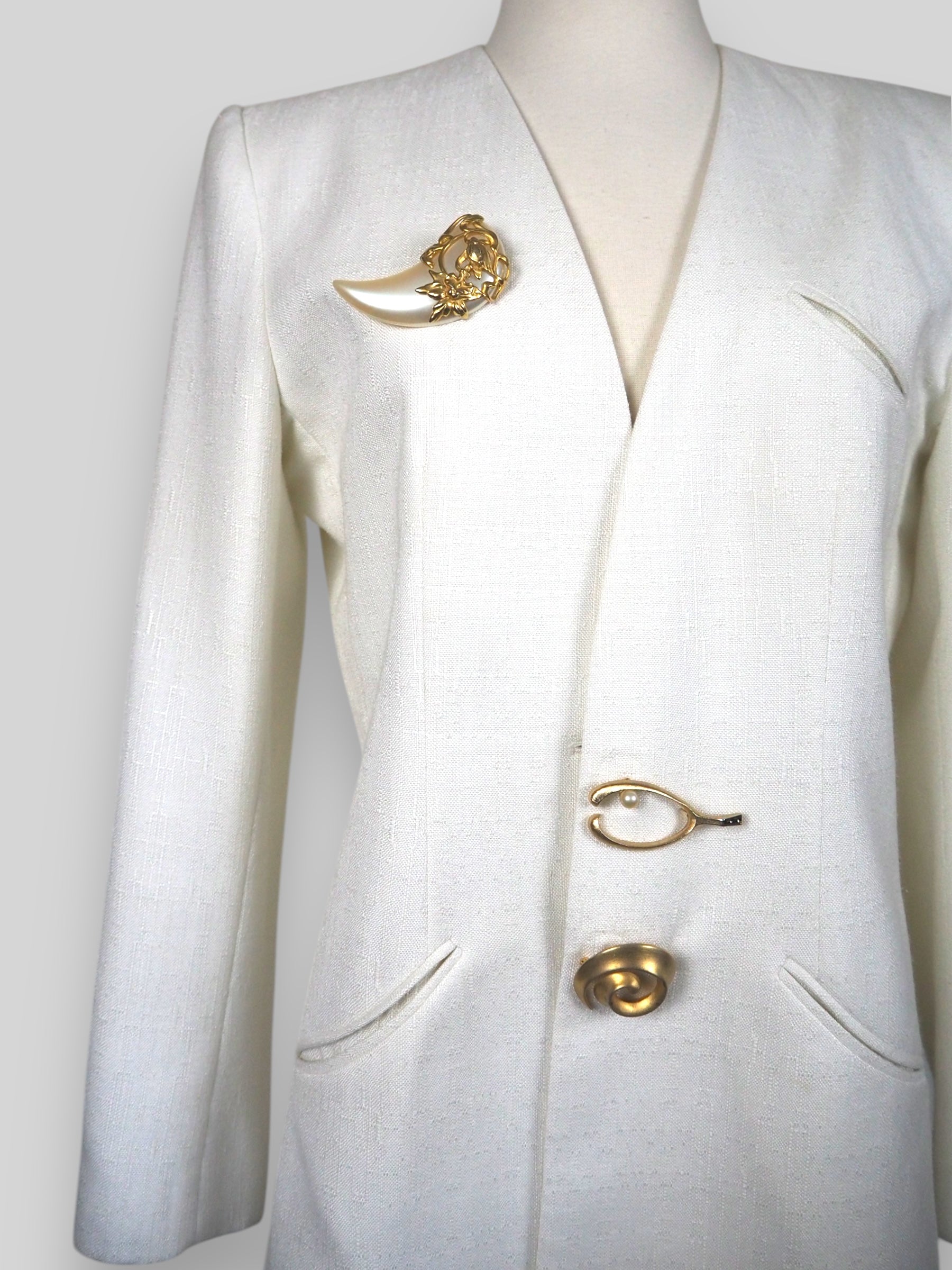 Vintage Ivory Blazer adorned by Jen Wonders with Unique Brooch Accents. Step up your style with this one-of-a-kind vintage blazer, a perfect fusion of timeless elegance and modern artistry. This white blazer has been carefully curated to feature exclusive vintage brooches, making it a standout piece that’s truly unique. The textured fabric offers a sophisticated look, while the bold, gold-tone buttons and exquisite brooch details bring a touch of luxe charm. The blazer is meant to stay open, but you can use the brooches to close if needed.