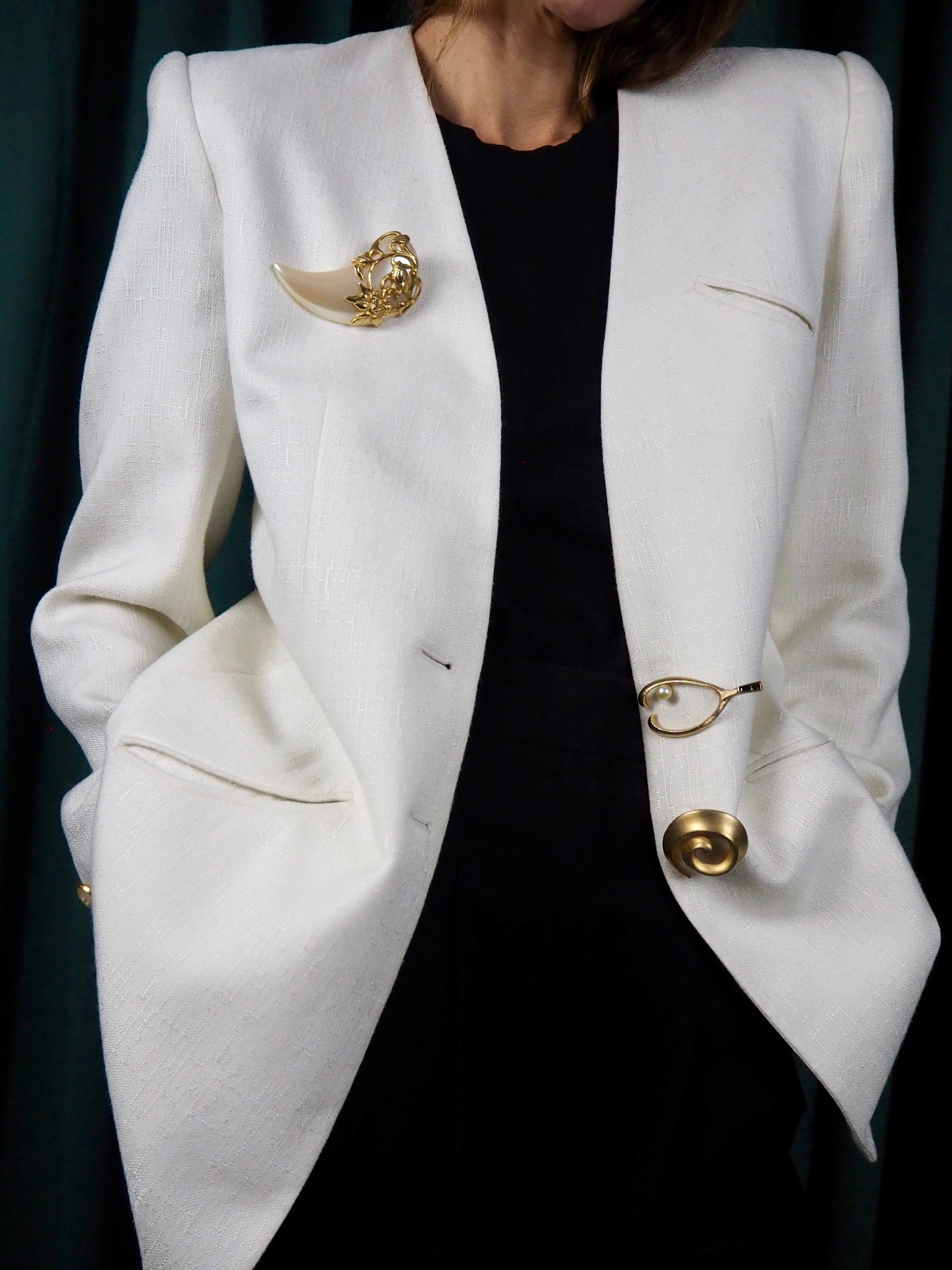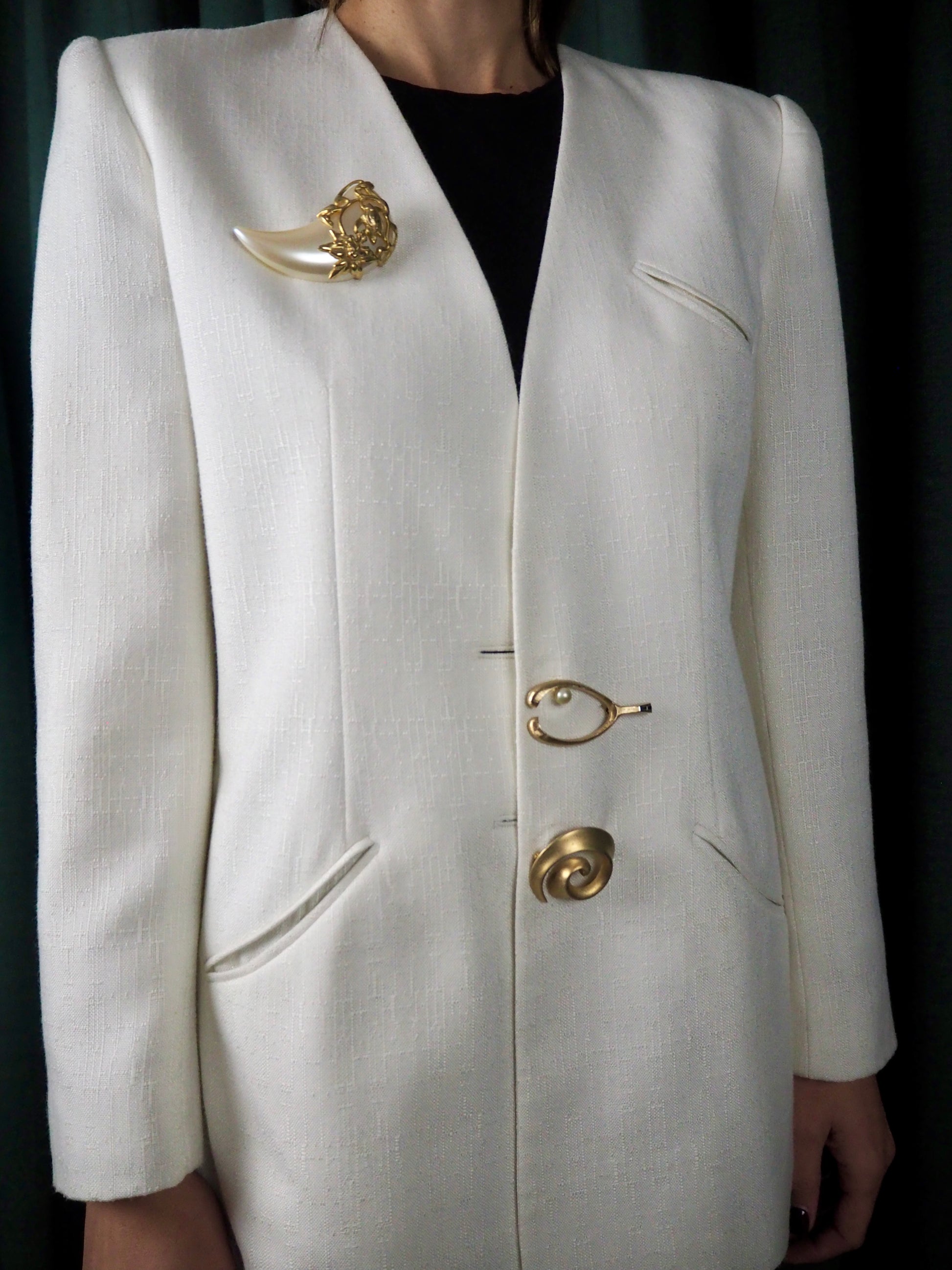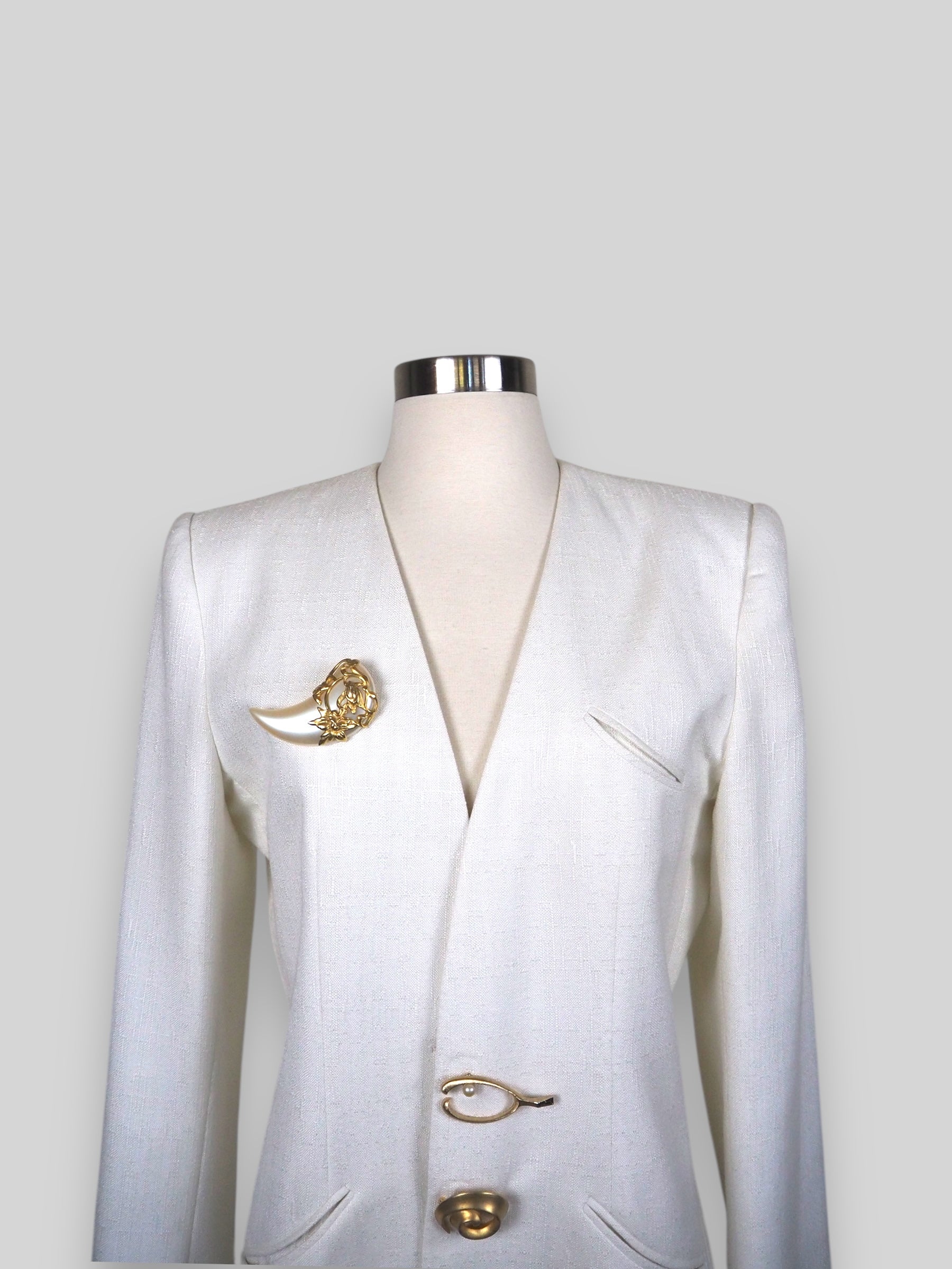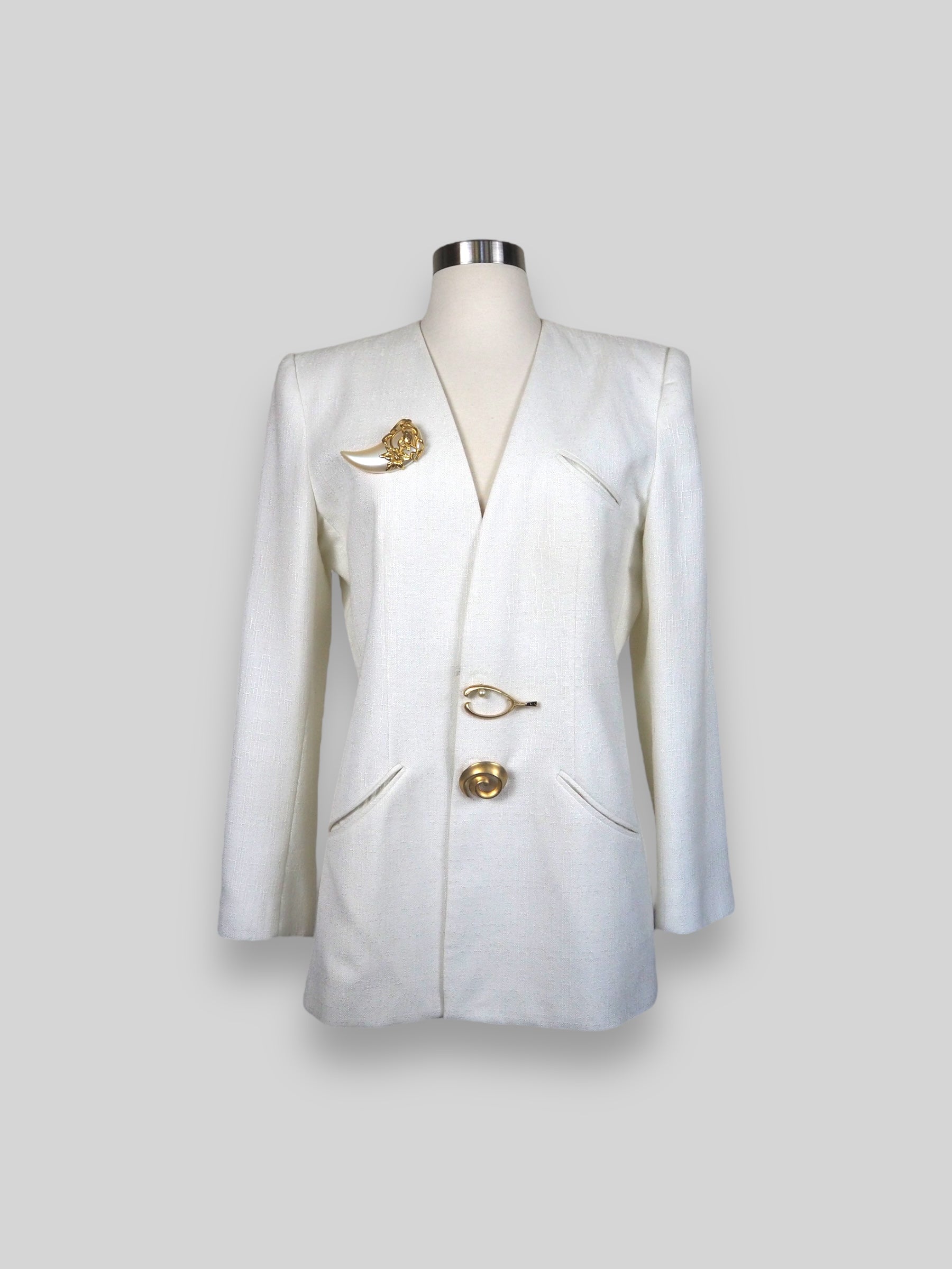 Vintage Ivory Blazer adorned by Jen Wonders with Unique Brooch Accents. Step up your style with this one-of-a-kind vintage blazer, a perfect fusion of timeless elegance and modern artistry. This white blazer has been carefully curated to feature exclusive vintage brooches, making it a standout piece that’s truly unique. The textured fabric offers a sophisticated look, while the bold, gold-tone buttons and exquisite brooch details bring a touch of luxe charm. The blazer is meant to stay open, but you can use the brooches to close if needed.
