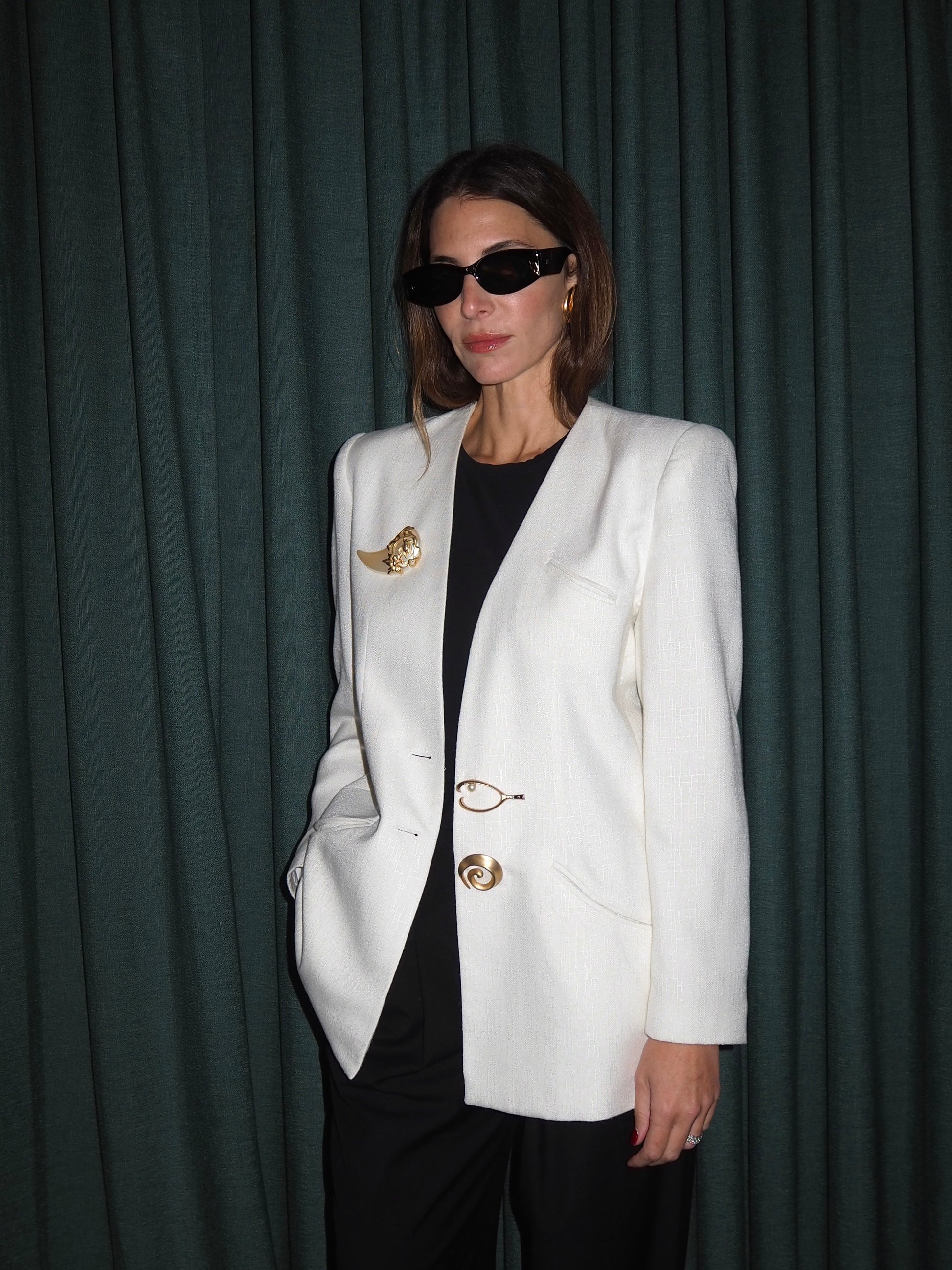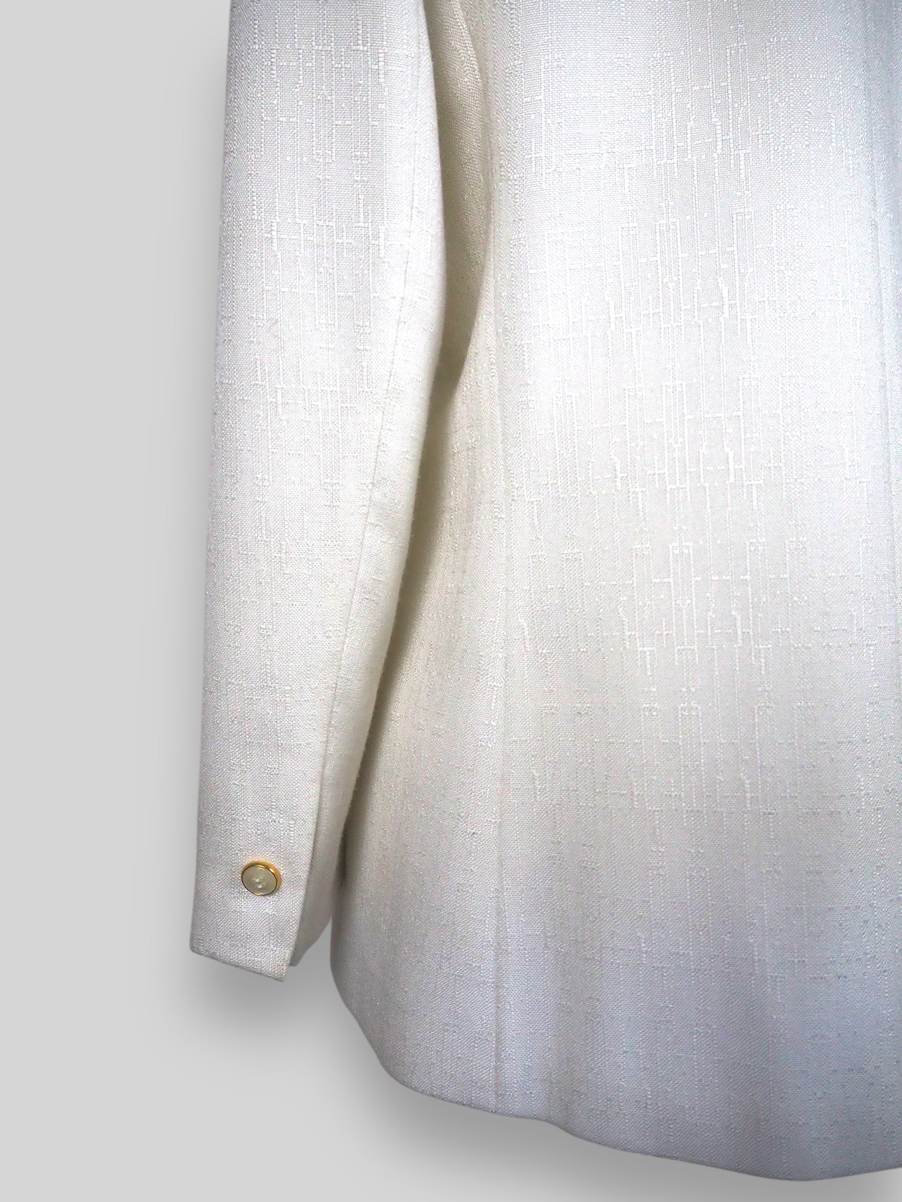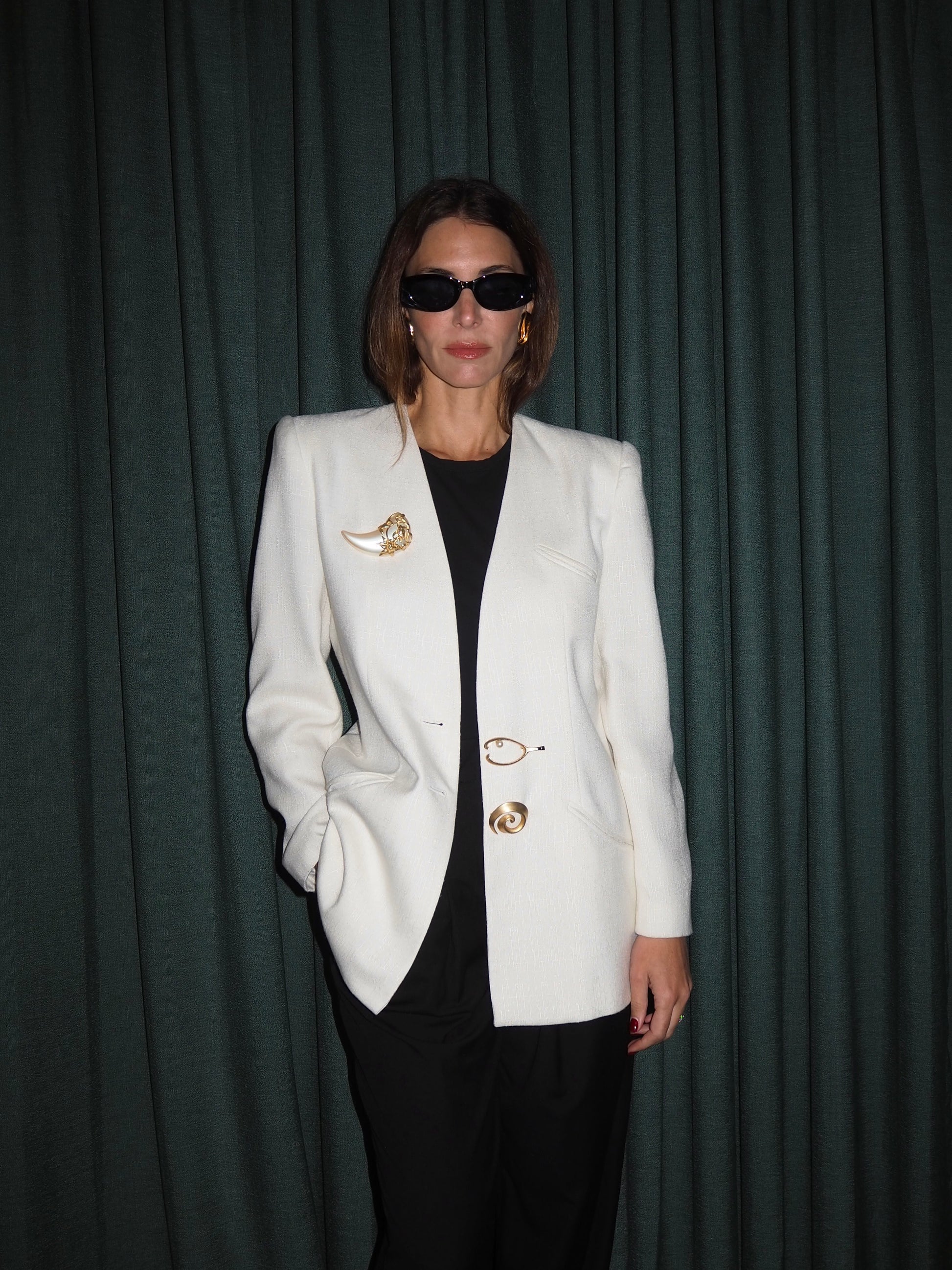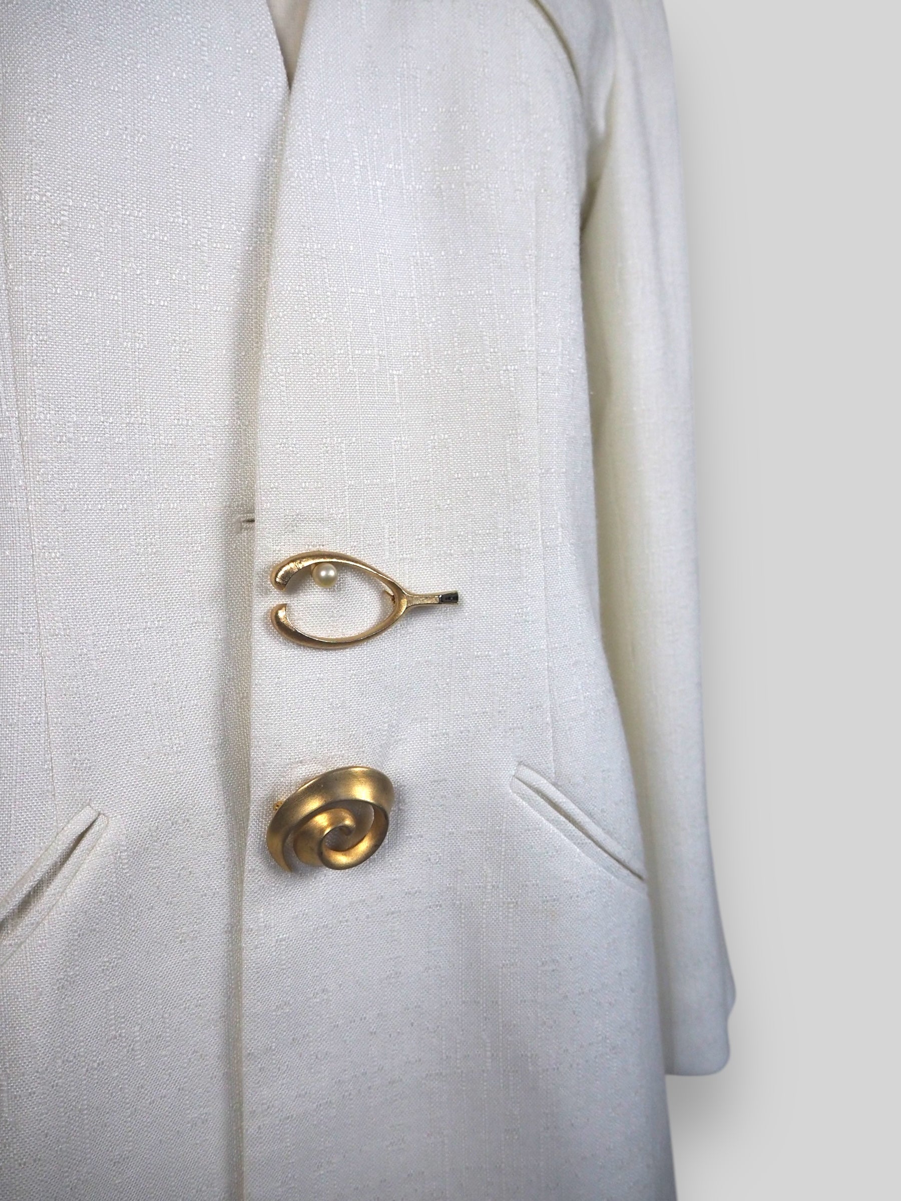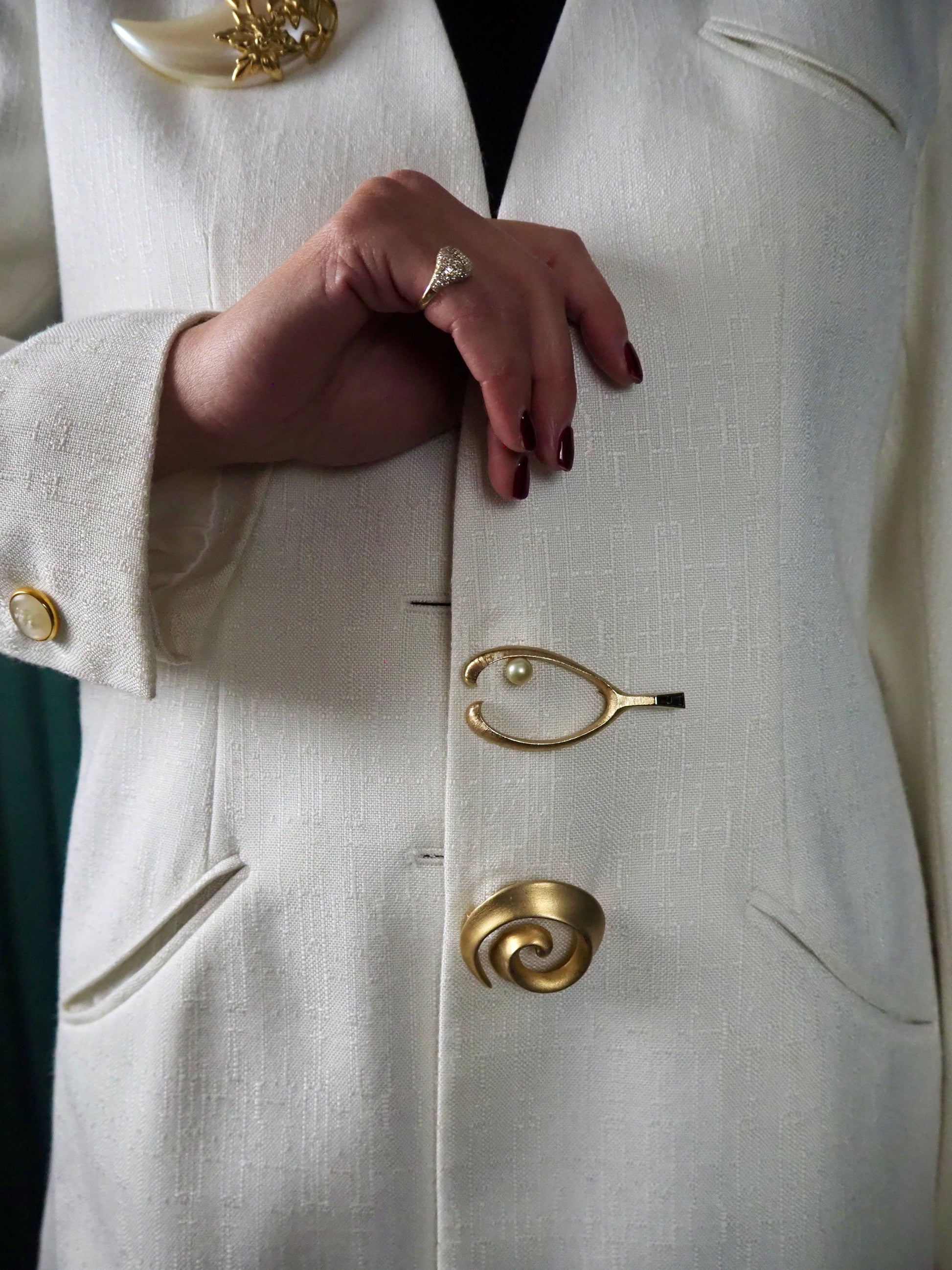 Vintage Ivory Blazer adorned by Jen Wonders with Unique Brooch Accents. Step up your style with this one-of-a-kind vintage blazer, a perfect fusion of timeless elegance and modern artistry. This white blazer has been carefully curated to feature exclusive vintage brooches, making it a standout piece that’s truly unique. The textured fabric offers a sophisticated look, while the bold, gold-tone buttons and exquisite brooch details bring a touch of luxe charm. The blazer is meant to stay open, but you can use the brooches to close if needed.