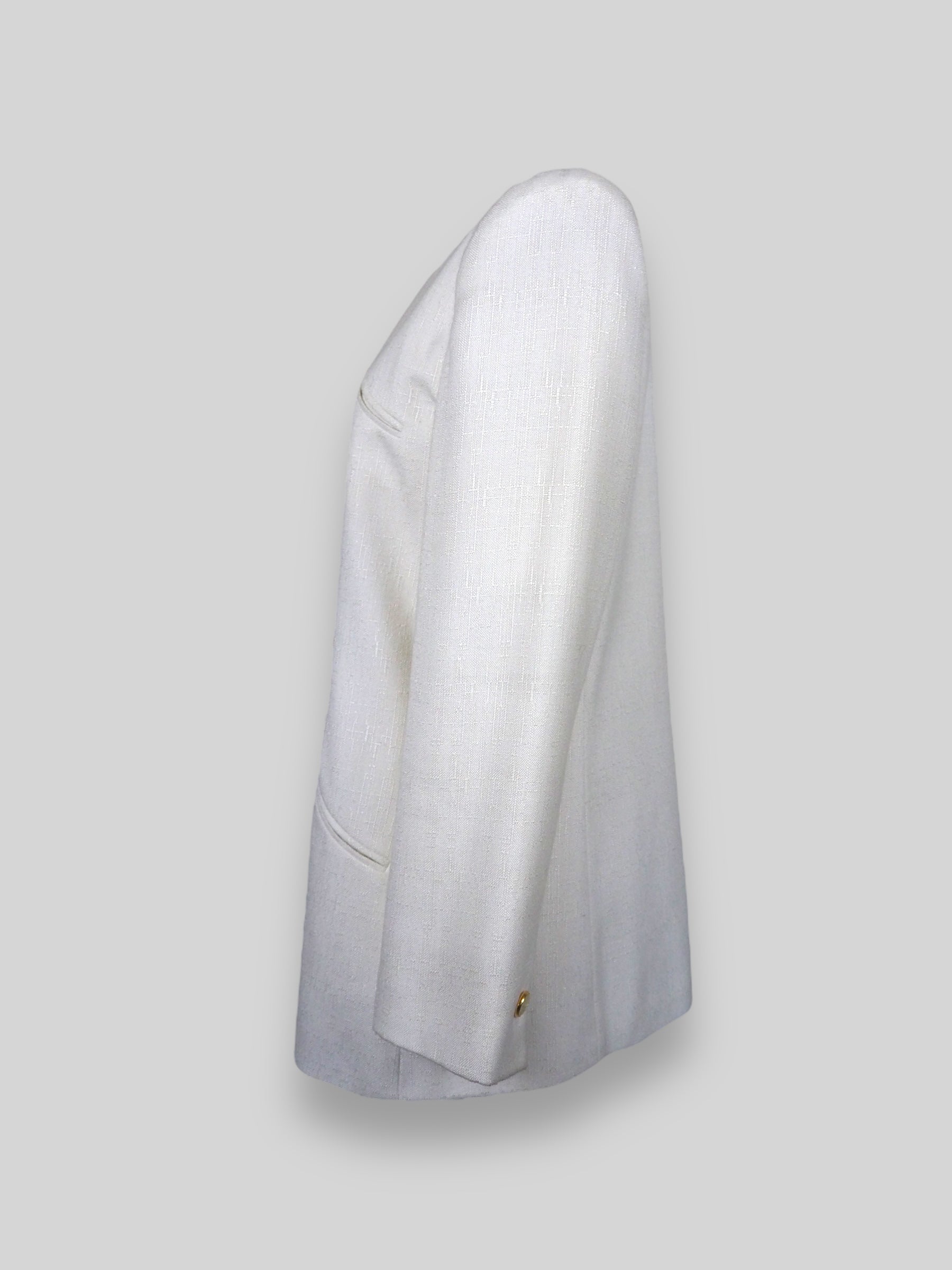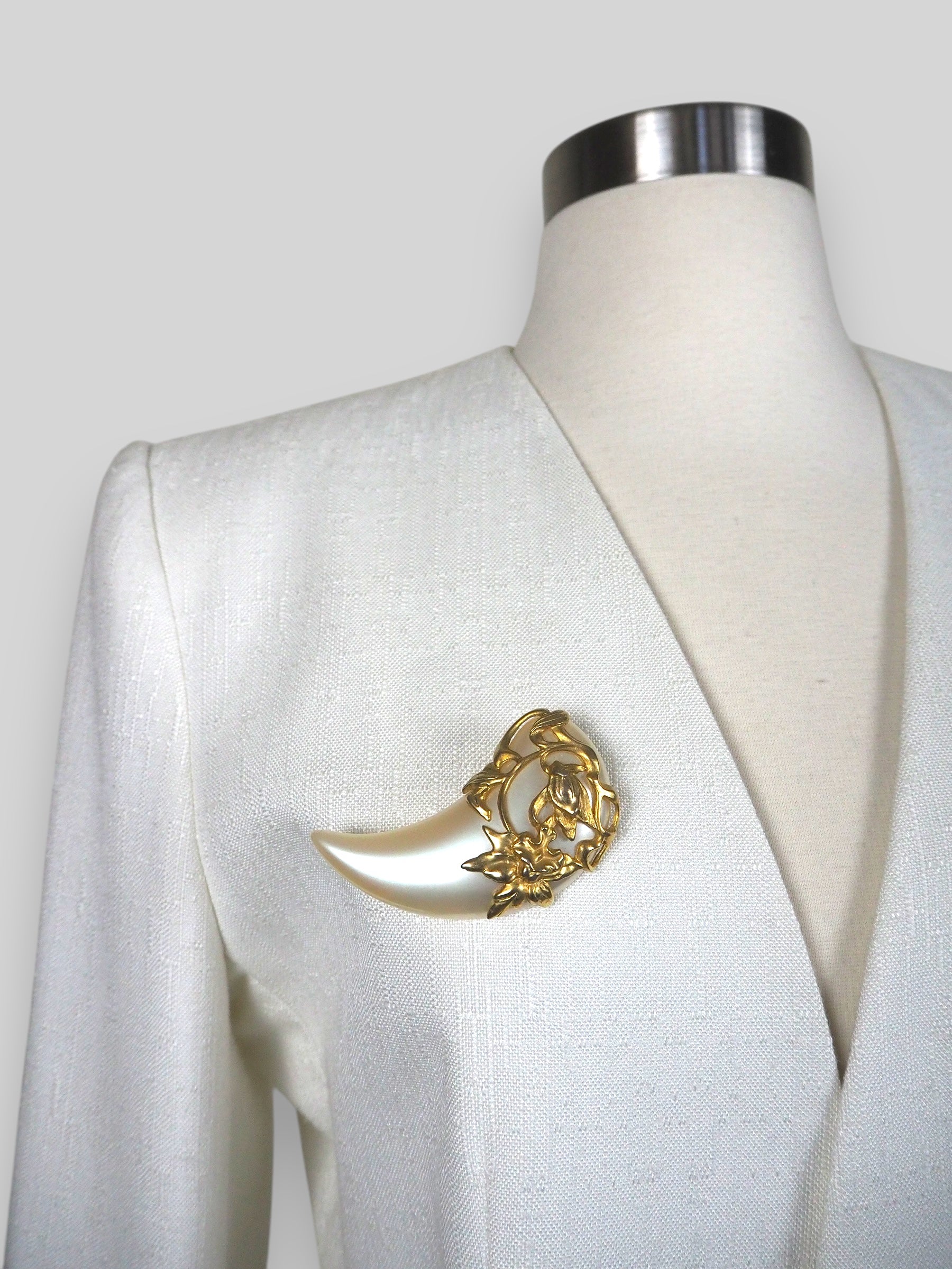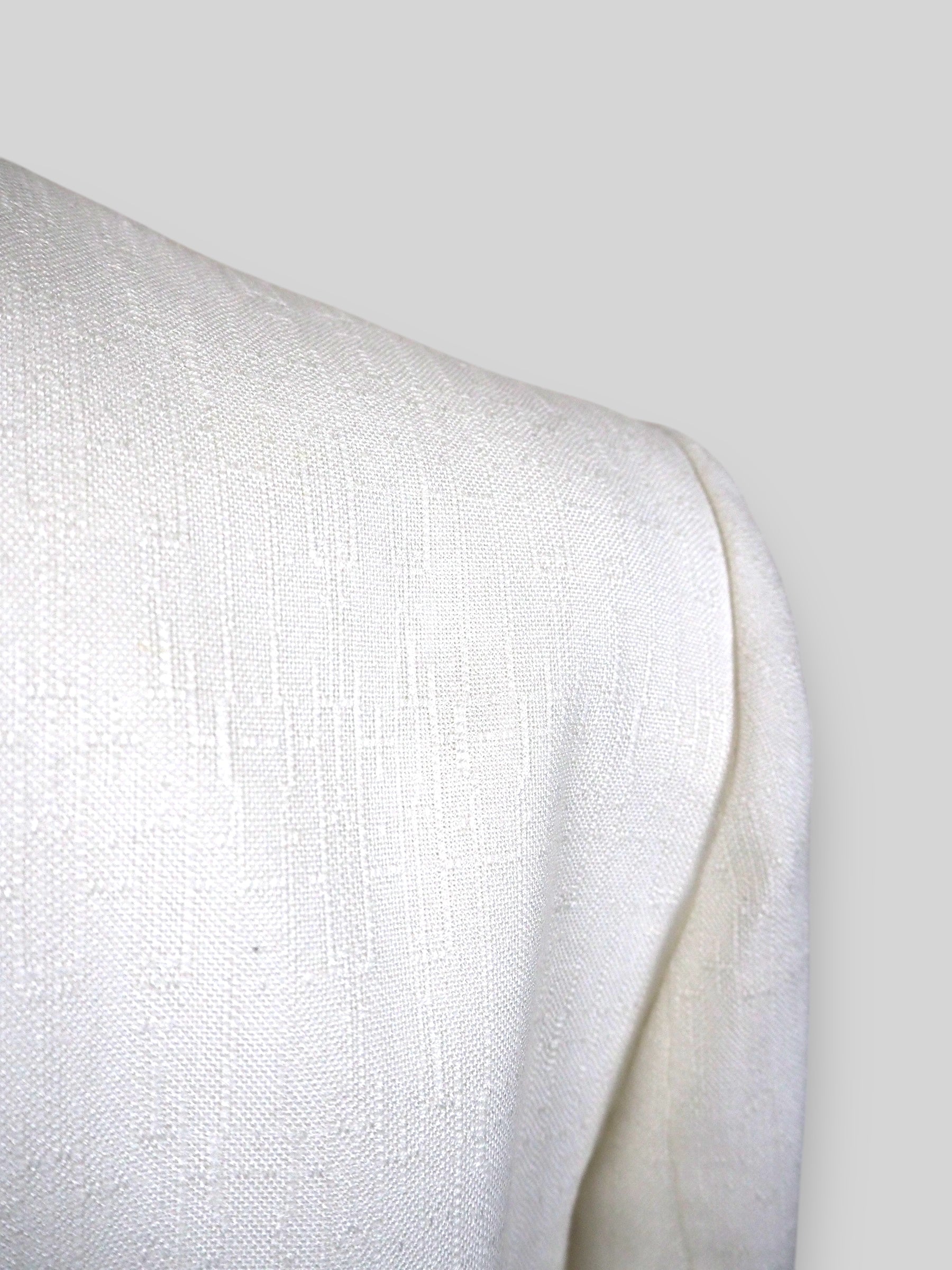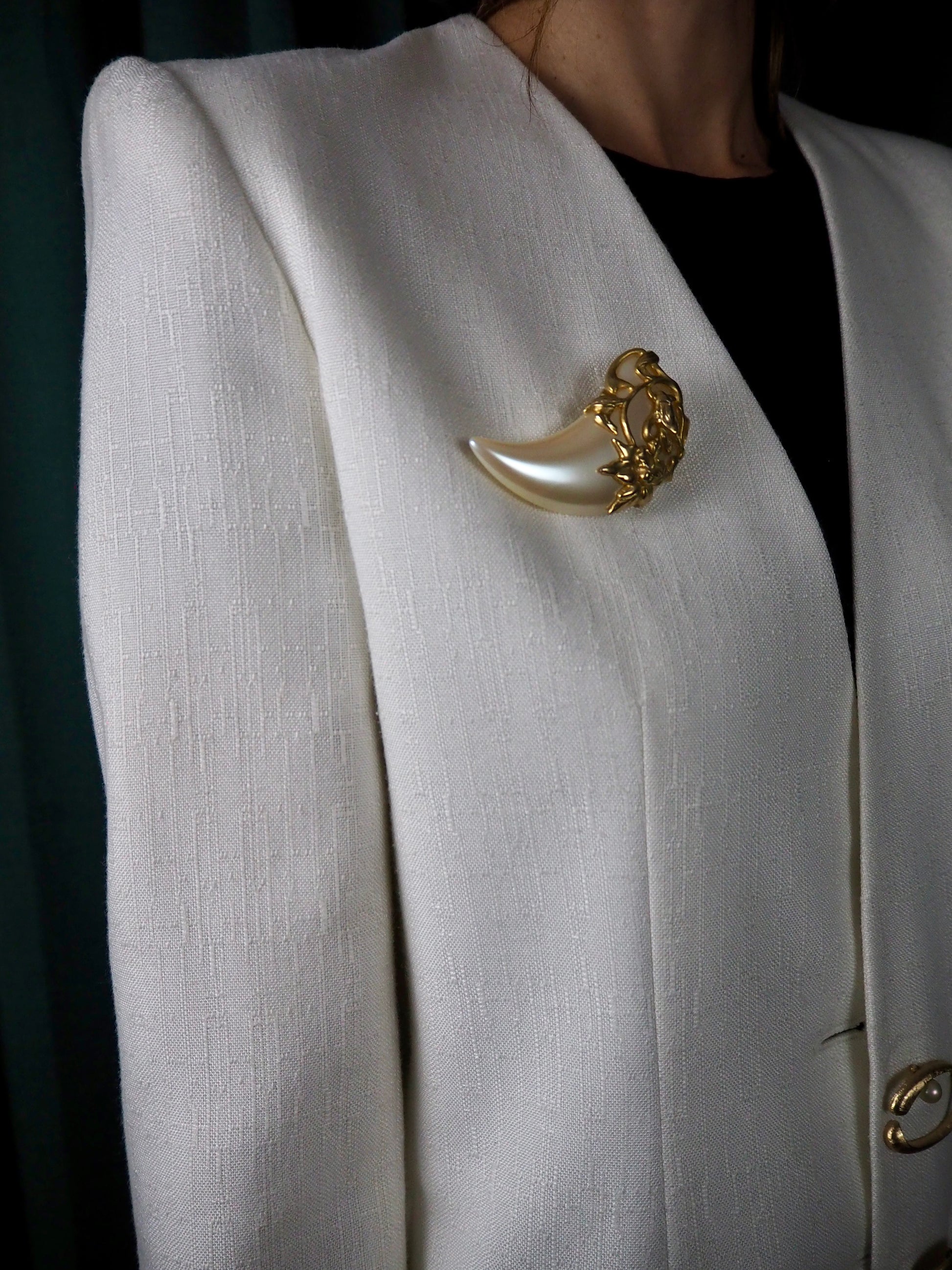 Vintage Ivory Blazer adorned by Jen Wonders with Unique Brooch Accents. Step up your style with this one-of-a-kind vintage blazer, a perfect fusion of timeless elegance and modern artistry. This white blazer has been carefully curated to feature exclusive vintage brooches, making it a standout piece that’s truly unique. The textured fabric offers a sophisticated look, while the bold, gold-tone buttons and exquisite brooch details bring a touch of luxe charm. The blazer is meant to stay open, but you can use the brooches to close if needed.