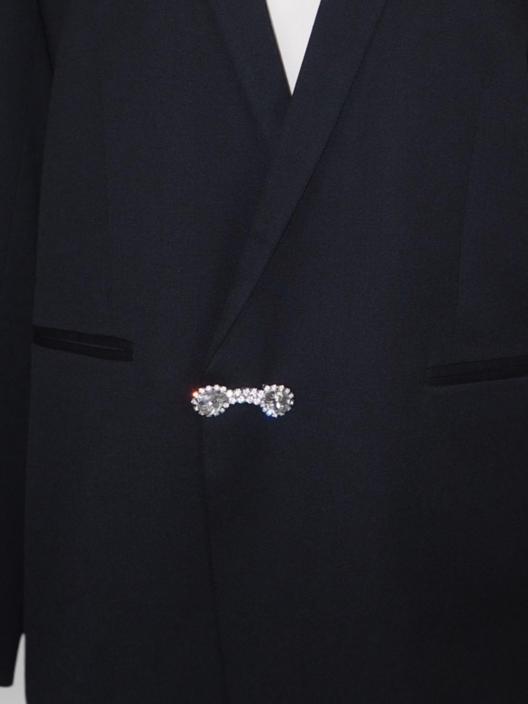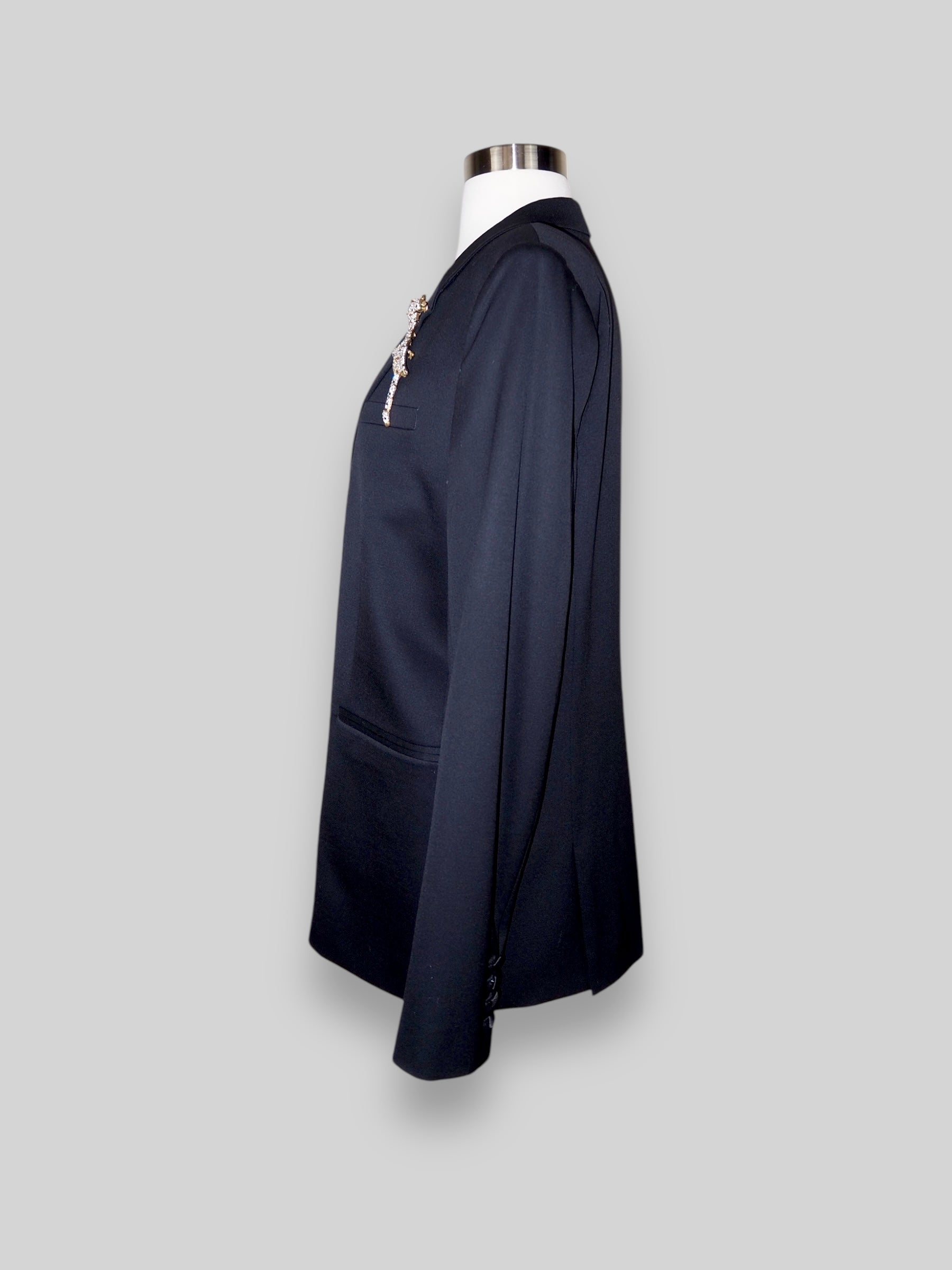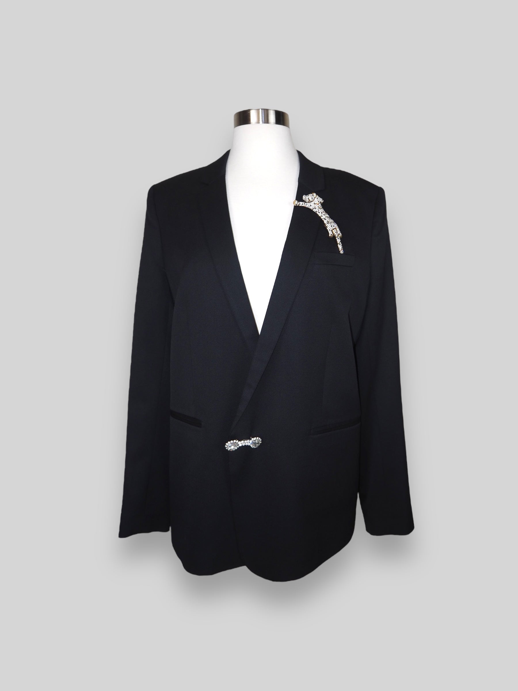 Vintage Black Wool Blazer adorned by Jen Wonders with Unique Brooch Accents. Step up your style with this one-of-a-kind vintage blazer from The Kooples, a perfect fusion of timeless elegance and modern artistry. This black elegant blazer has been carefully curated to feature exclusive vintage brooches, making it a standout piece that’s truly unique. The luxurious fabric offers a sophisticated look, while the bold, rhinestone exquisite brooch details bring a touch of luxe charm. The blazer is meant to stay open, but you can use the brooches to close if needed.