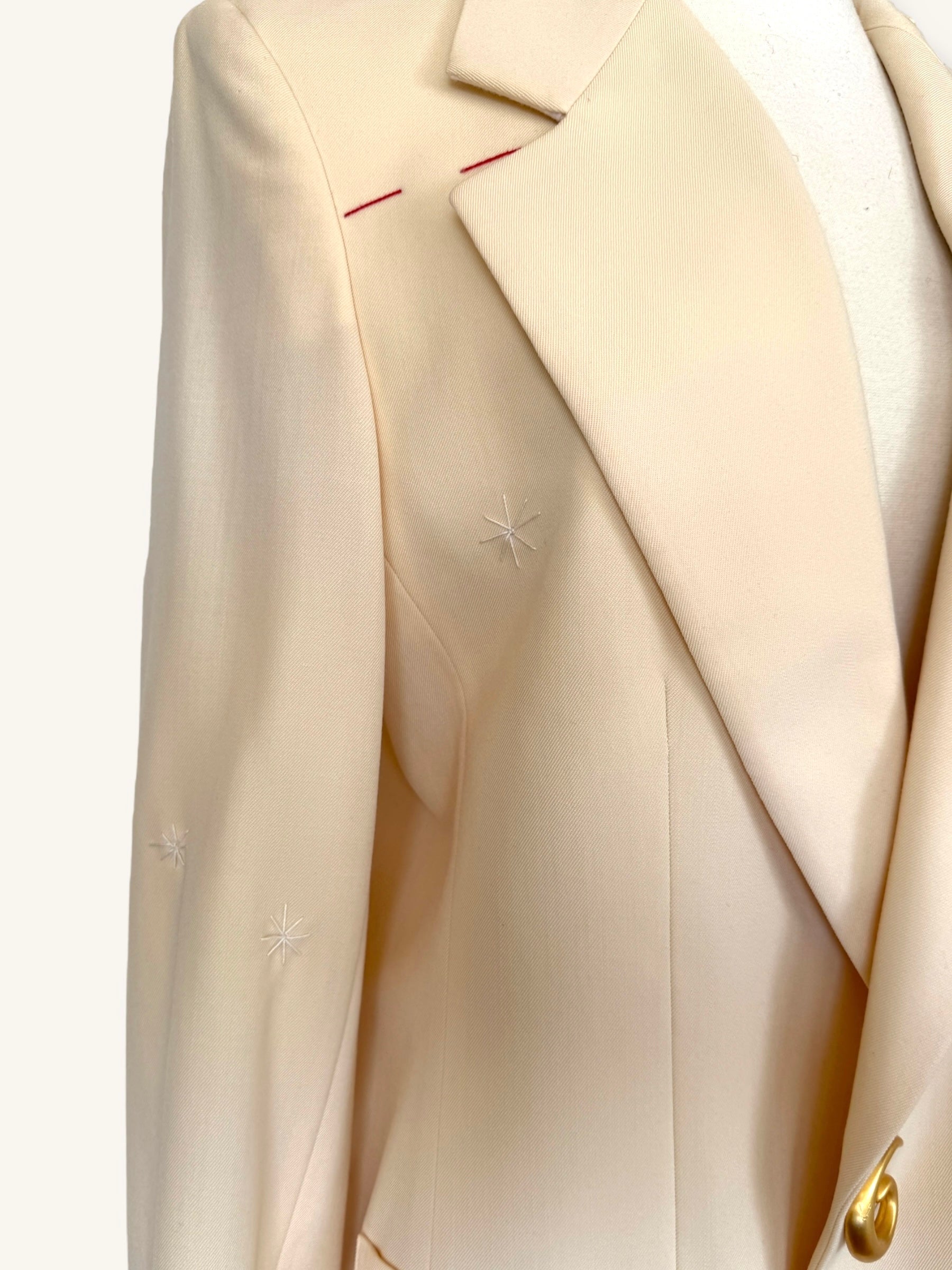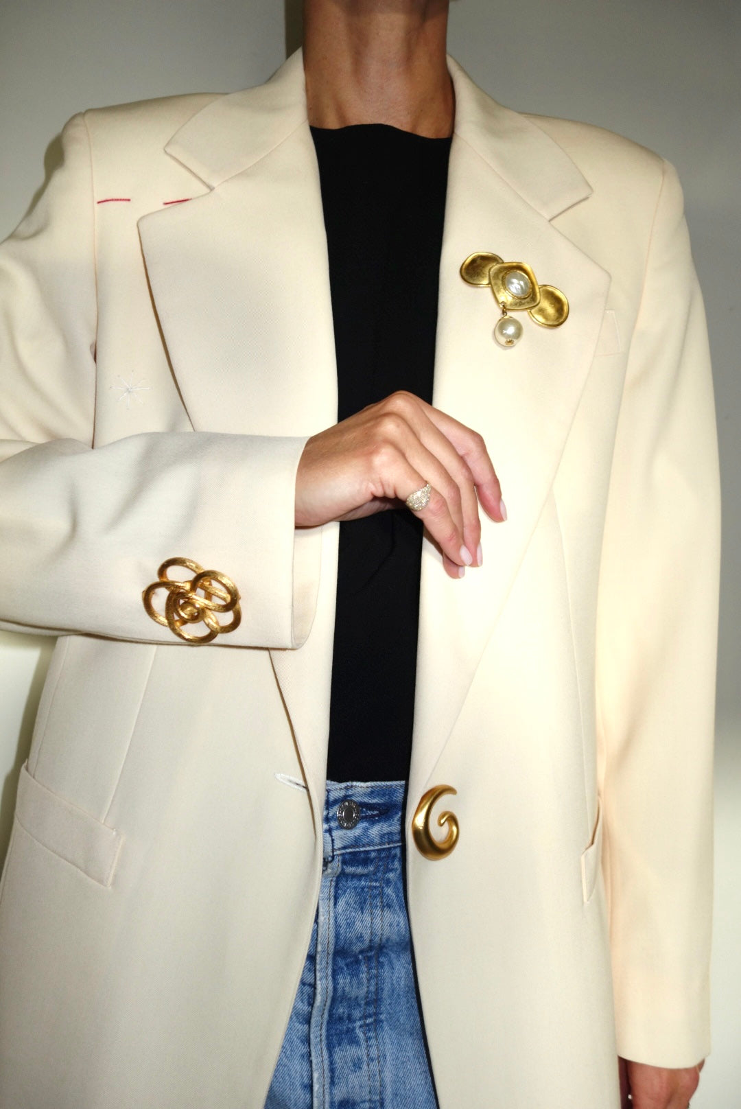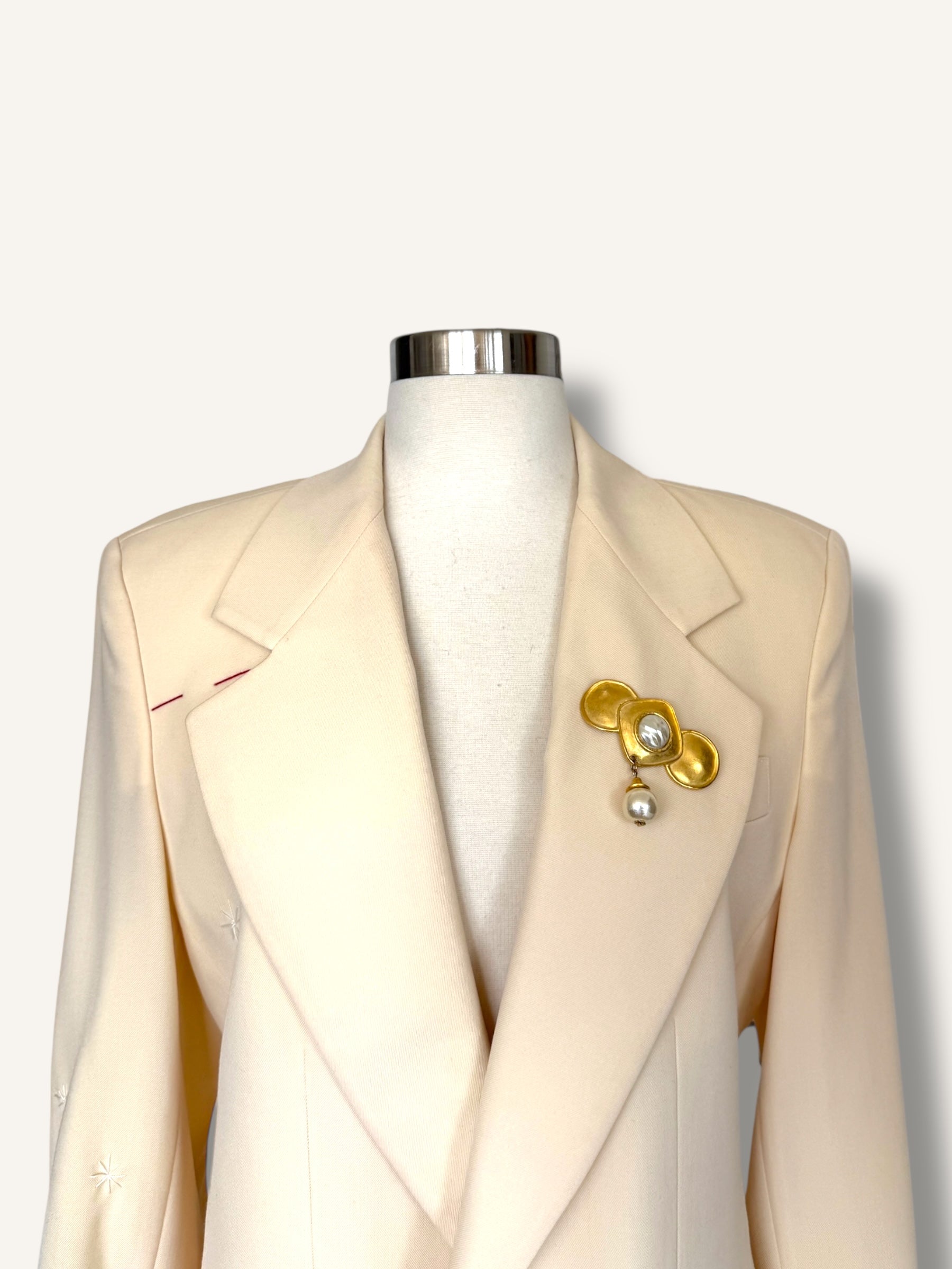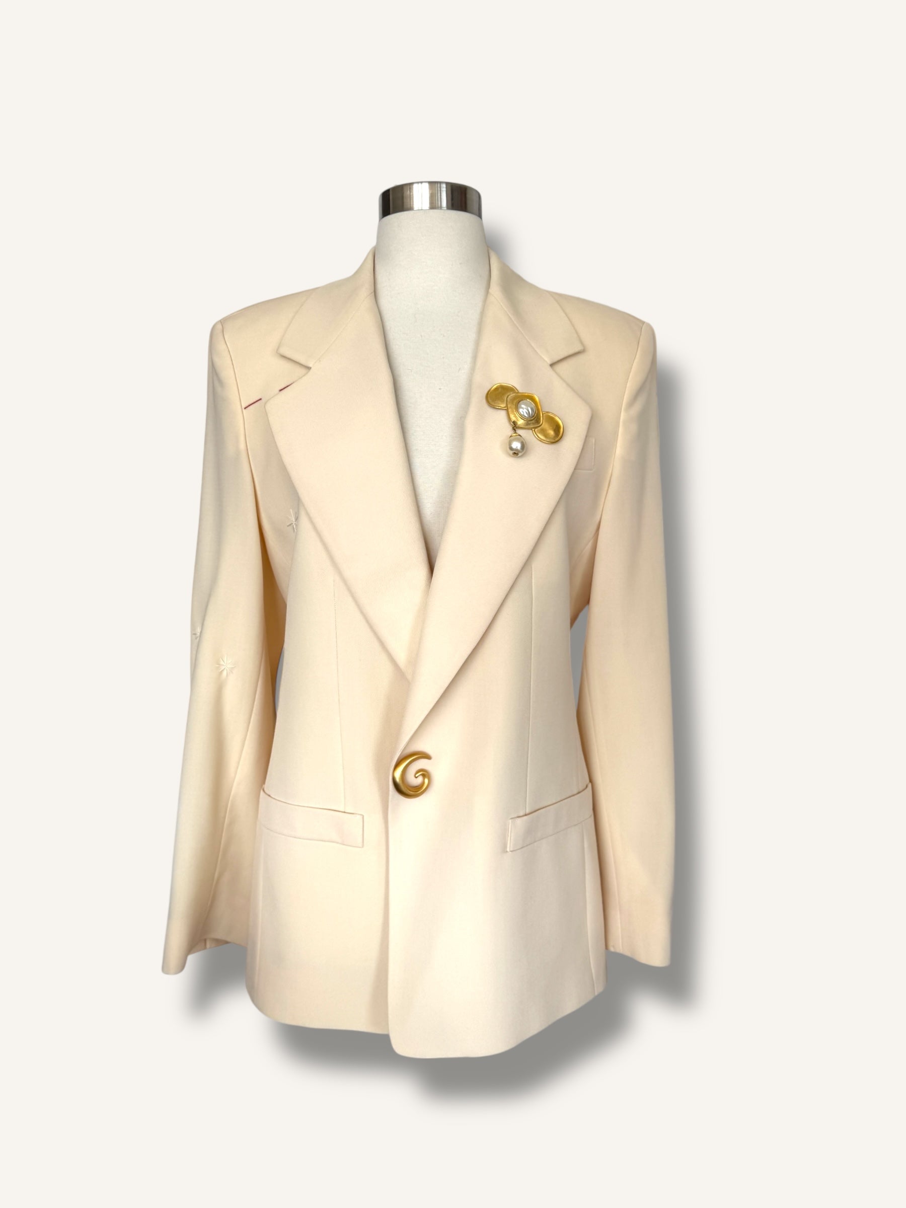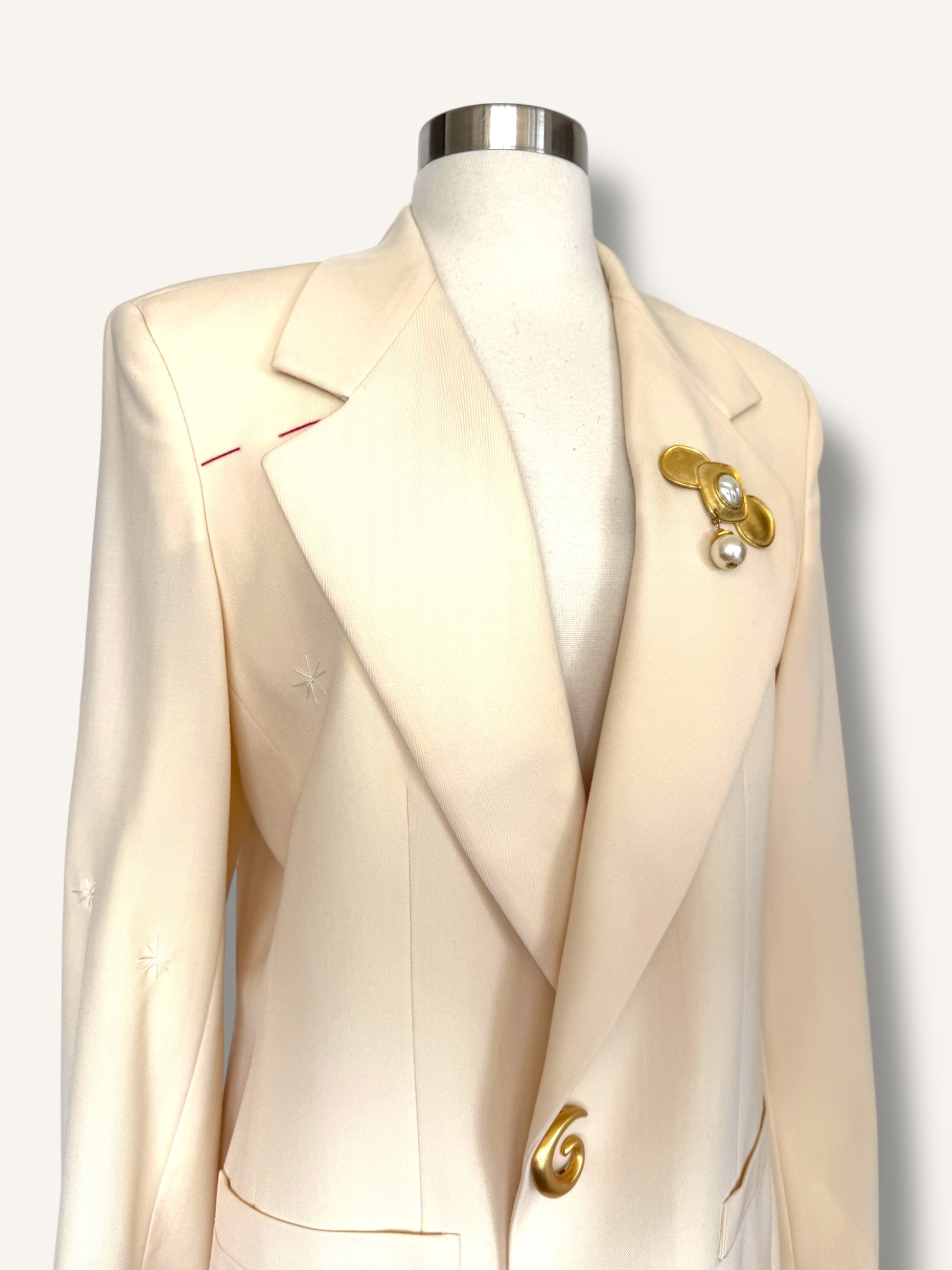Vintage Austin Reed 100% Wool Blazer adorned by Jen Wonders with Unique Brooch Accents. Vintage cream blazer with a sleek, tailored silhouette, crafted from a smooth fabric that drapes effortlessly. Subtle tone-on-tone stars embroidery is sewn in a few places, adding a hidden layer of charm, while the signature red thread, a hallmark of the brand, symbolizes good fortune. Adorned with handpicked vintage brooches, including a sculptural pearl-drop design for a touch of elegance. Designed to be worn open for a relaxed, modern look, but can also be fastened with the brooches for a unique closure. Perfect for pairing with denim for an elevated casual style or over trousers for a sophisticated statement.