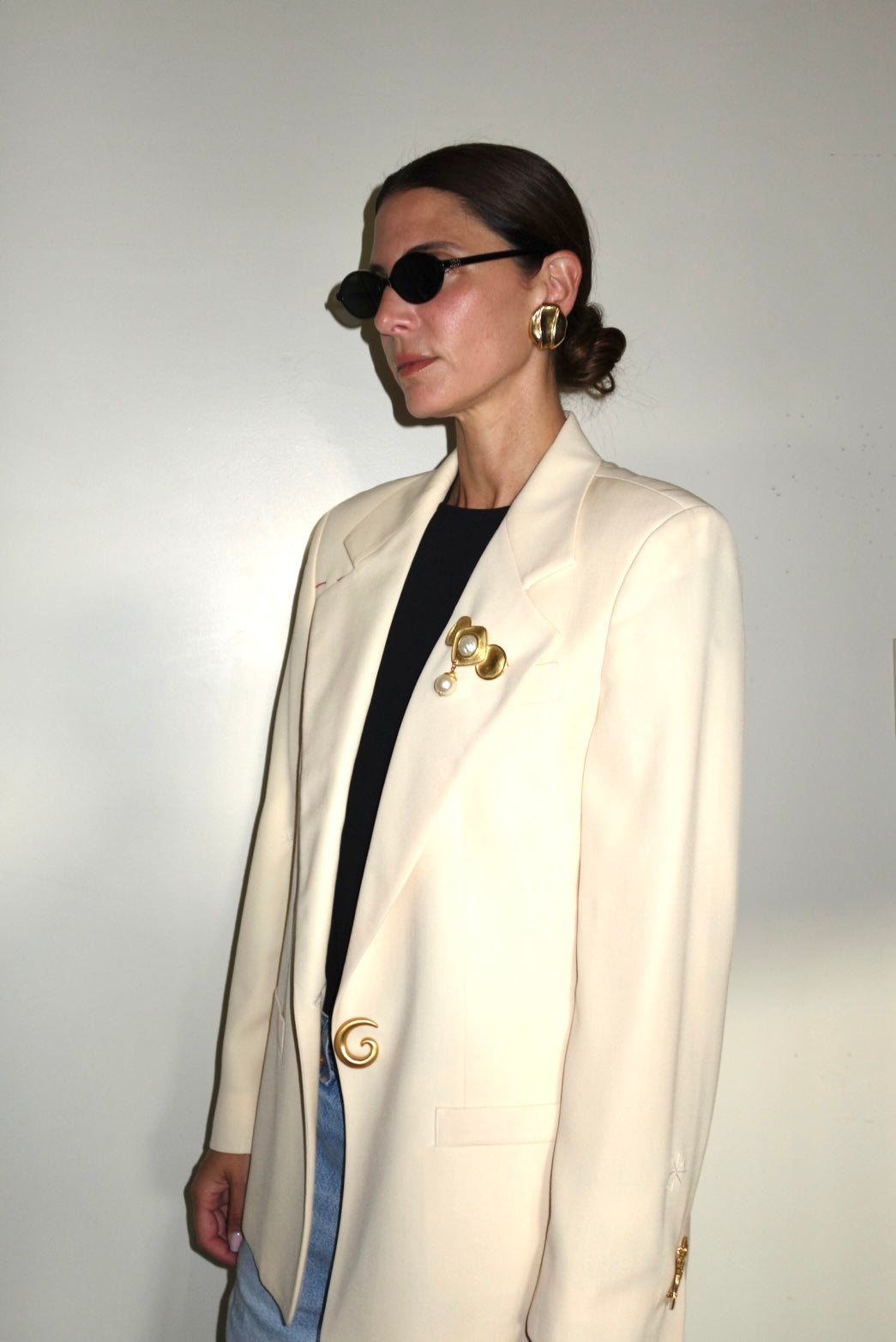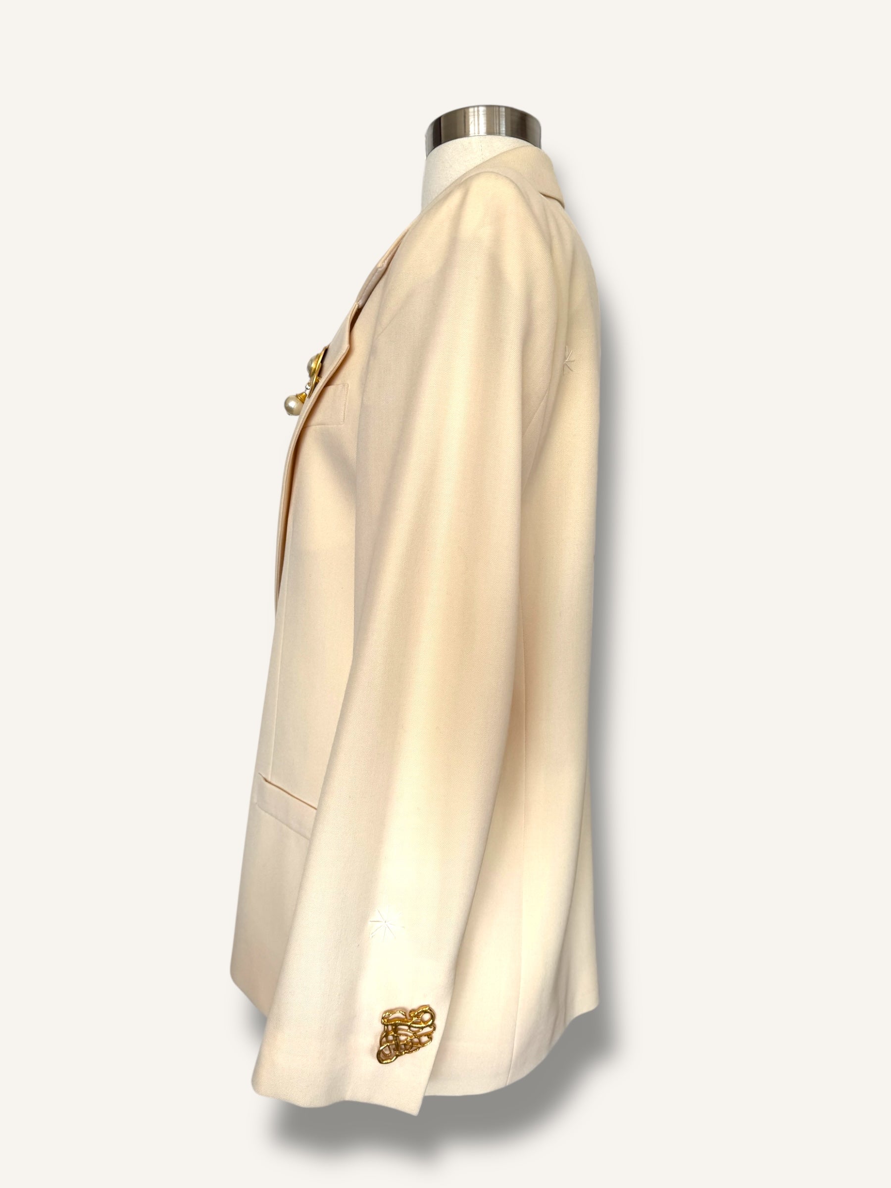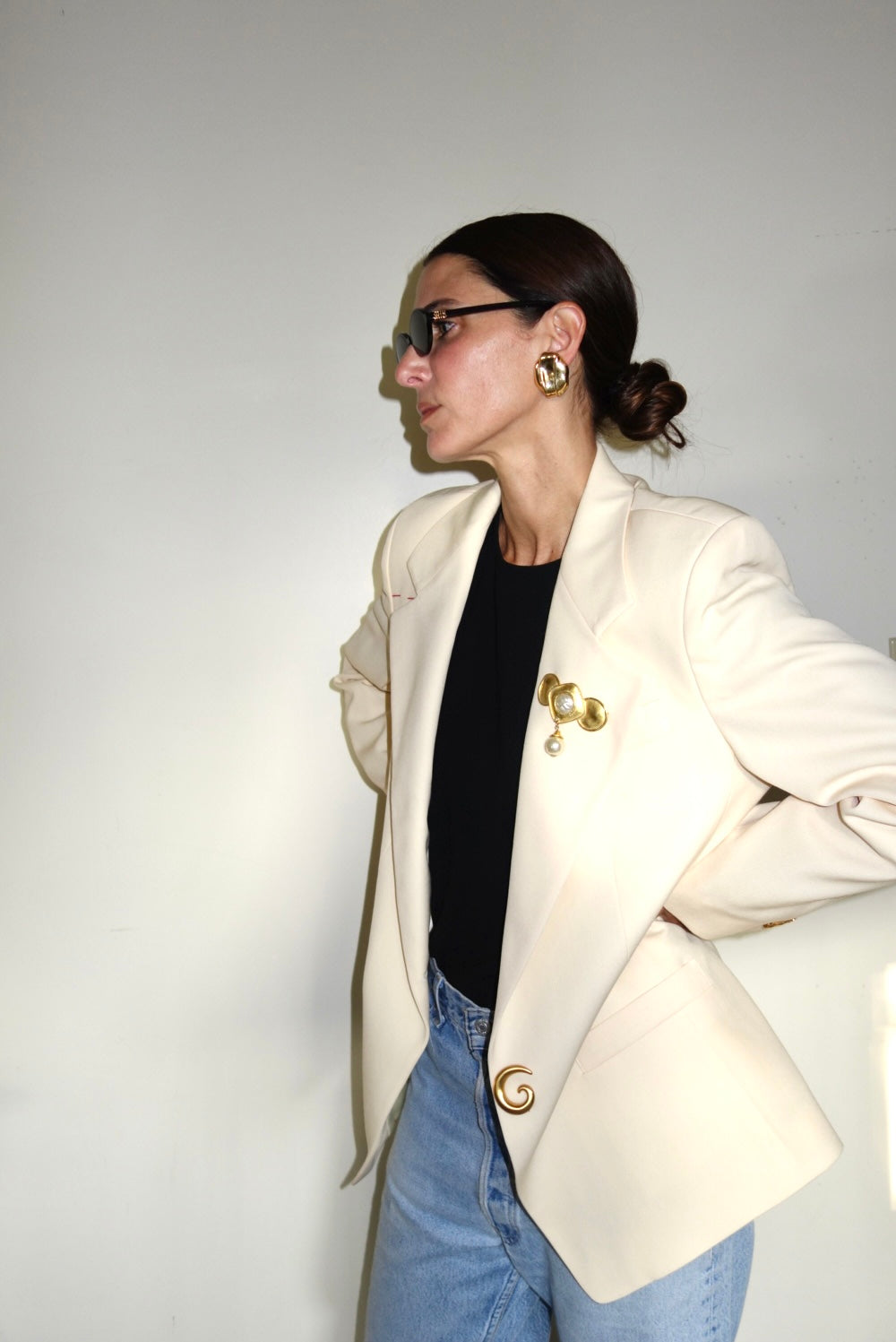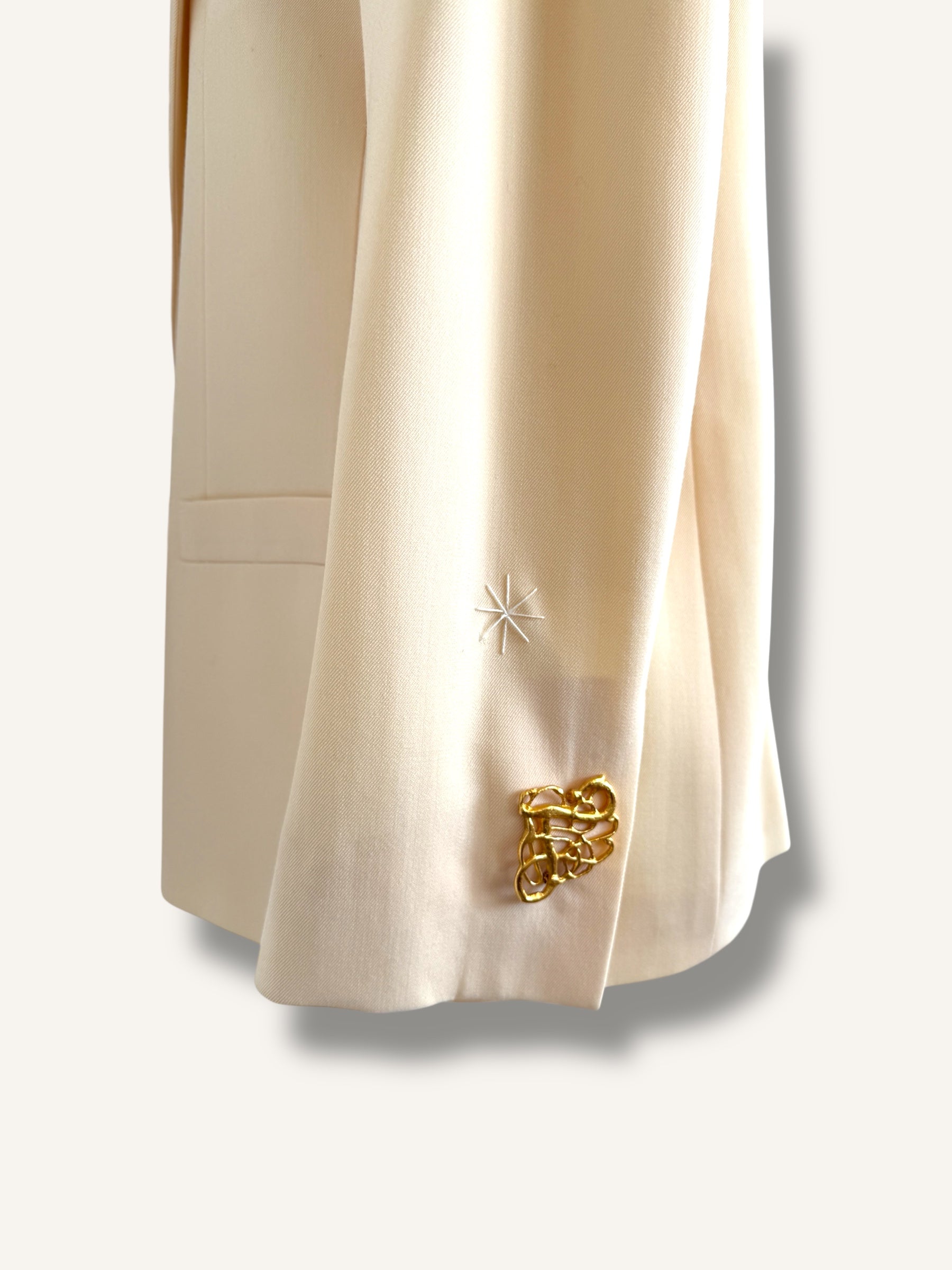 Vintage Austin Reed 100% Wool Blazer adorned by Jen Wonders with Unique Brooch Accents. Vintage cream blazer with a sleek, tailored silhouette, crafted from a smooth fabric that drapes effortlessly. Subtle tone-on-tone stars embroidery is sewn in a few places, adding a hidden layer of charm, while the signature red thread, a hallmark of the brand, symbolizes good fortune. Adorned with handpicked vintage brooches, including a sculptural pearl-drop design for a touch of elegance. Designed to be worn open for a relaxed, modern look, but can also be fastened with the brooches for a unique closure. Perfect for pairing with denim for an elevated casual style or over trousers for a sophisticated statement.