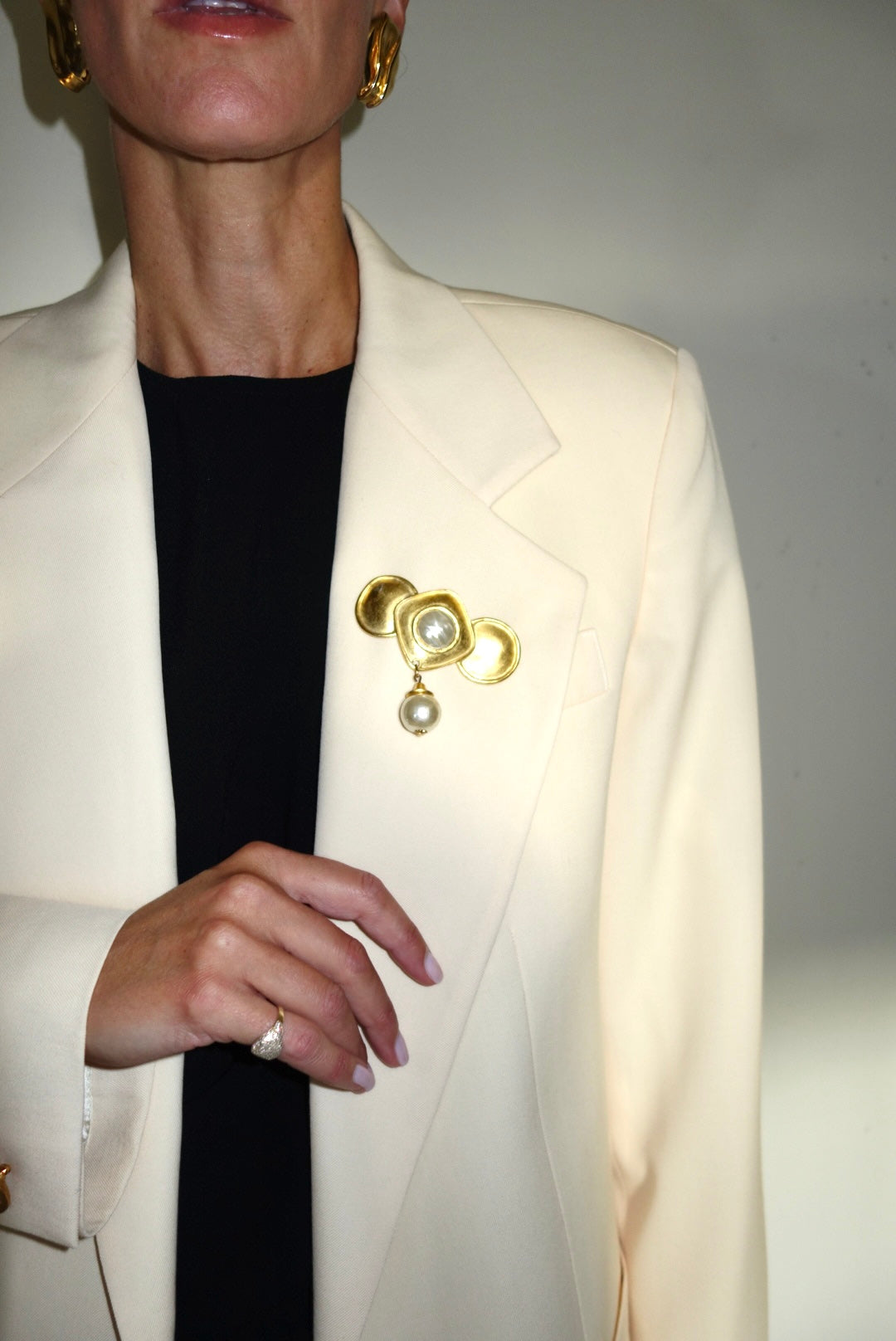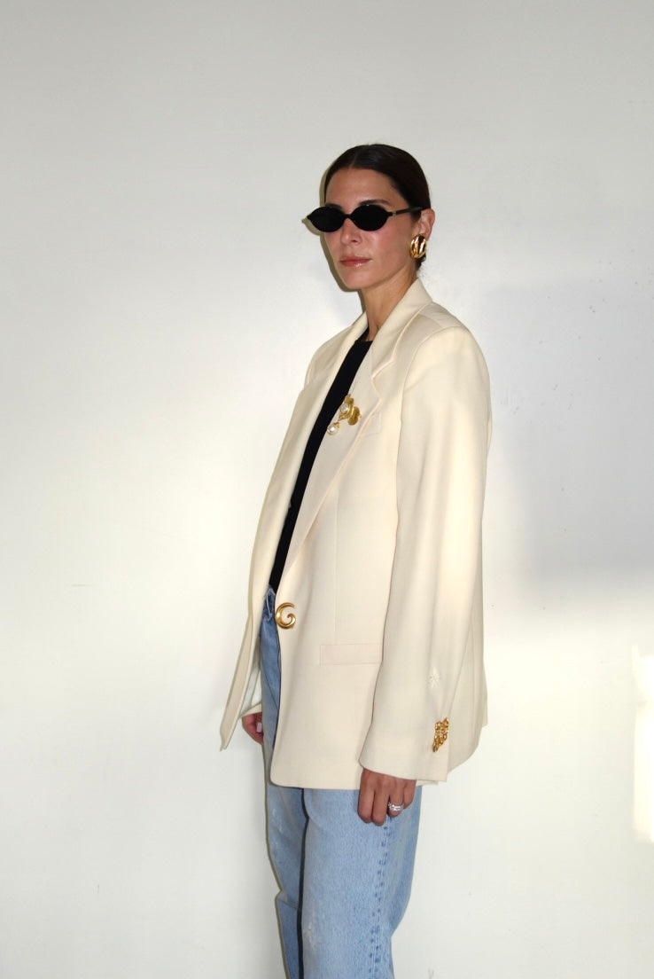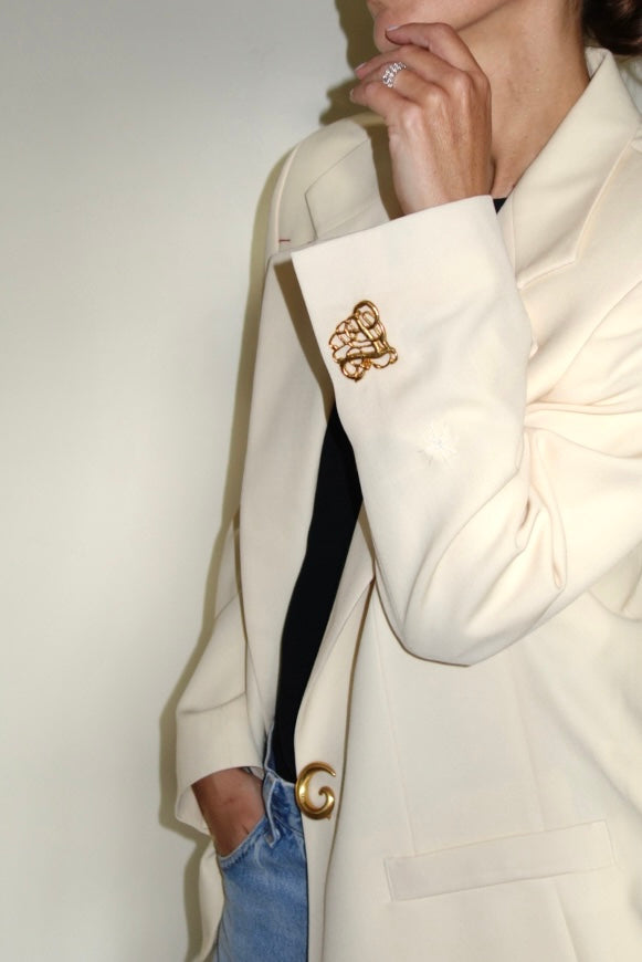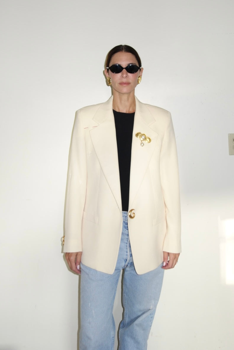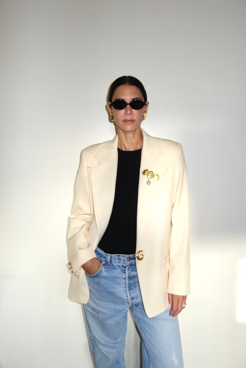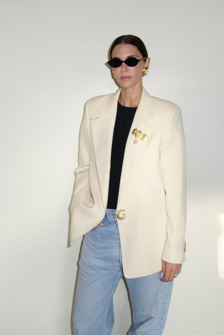 Vintage Austin Reed 100% Wool Blazer adorned by Jen Wonders with Unique Brooch Accents. Vintage cream blazer with a sleek, tailored silhouette, crafted from a smooth fabric that drapes effortlessly. Subtle tone-on-tone stars embroidery is sewn in a few places, adding a hidden layer of charm, while the signature red thread, a hallmark of the brand, symbolizes good fortune. Adorned with handpicked vintage brooches, including a sculptural pearl-drop design for a touch of elegance. Designed to be worn open for a relaxed, modern look, but can also be fastened with the brooches for a unique closure. Perfect for pairing with denim for an elevated casual style or over trousers for a sophisticated statement.