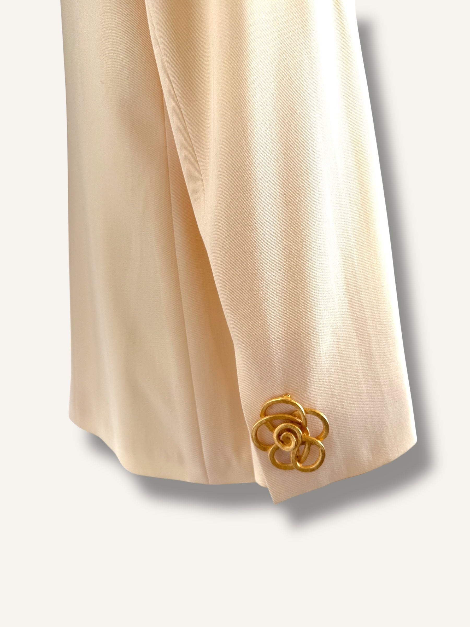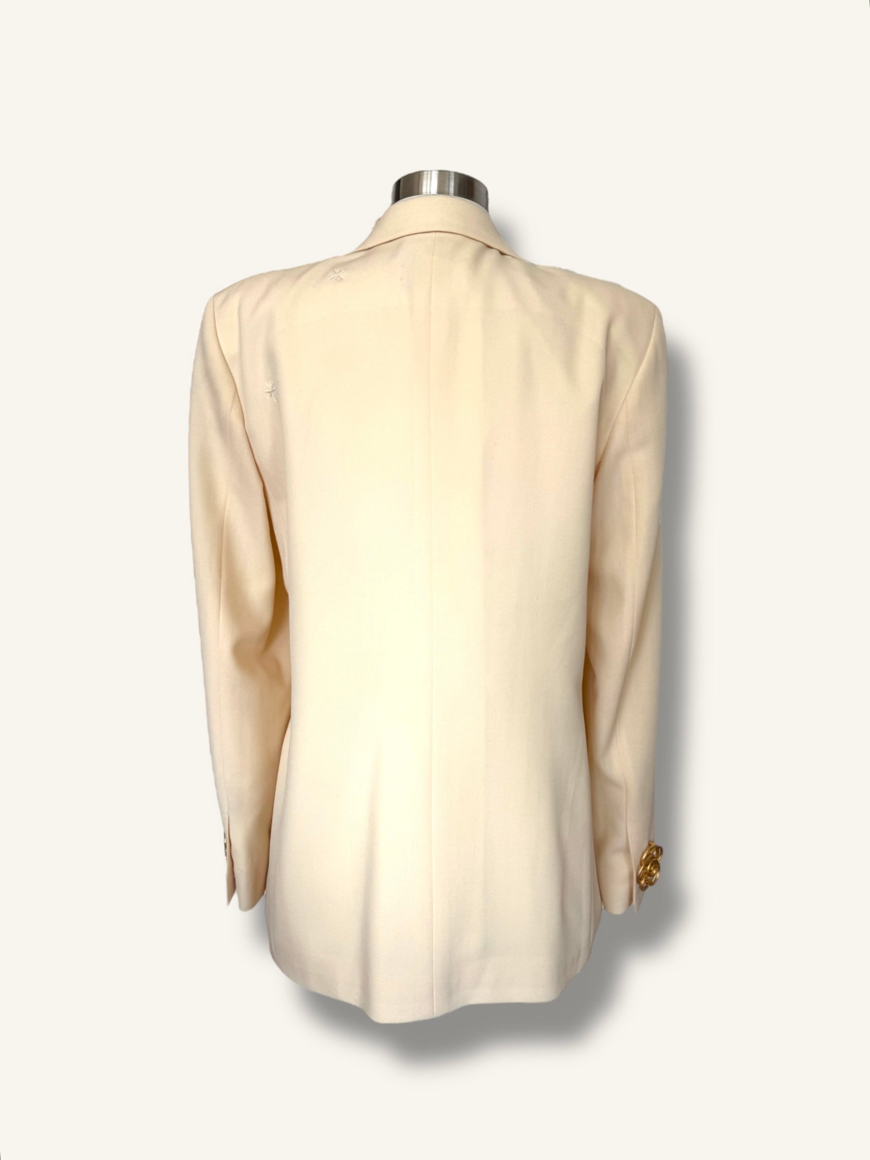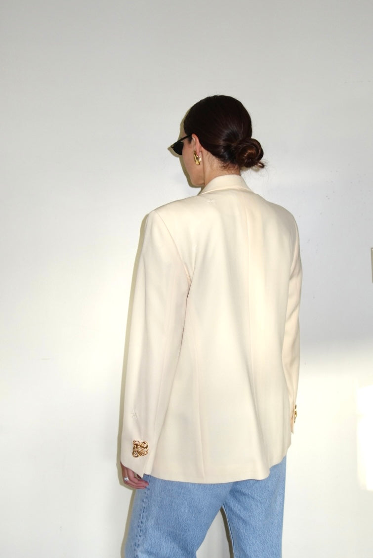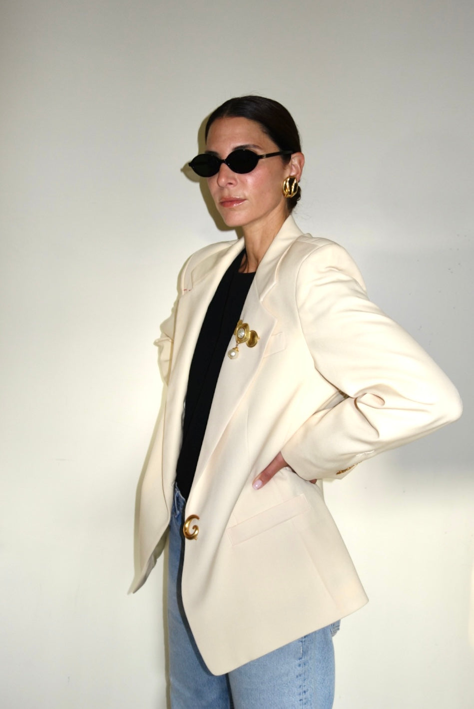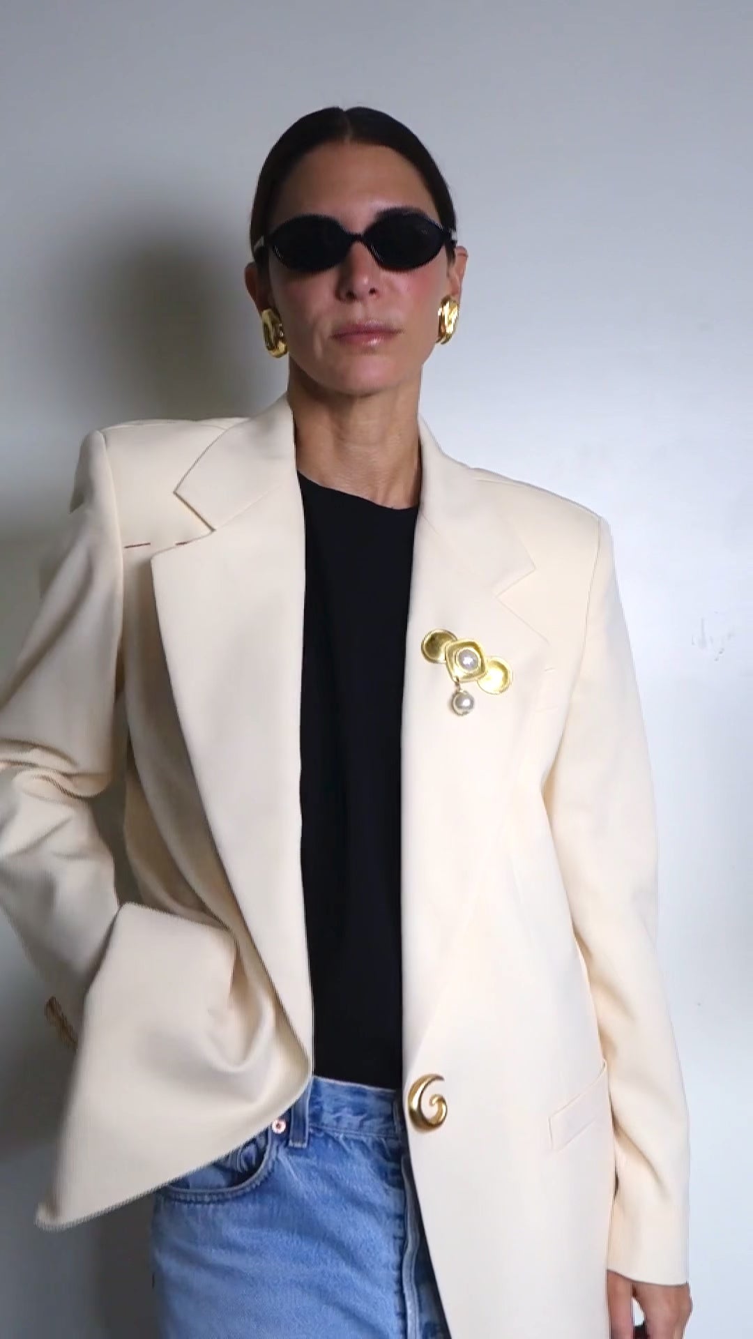 Vintage Austin Reed 100% Wool Blazer adorned by Jen Wonders with Unique Brooch Accents. Vintage cream blazer with a sleek, tailored silhouette, crafted from a smooth fabric that drapes effortlessly. Subtle tone-on-tone stars embroidery is sewn in a few places, adding a hidden layer of charm, while the signature red thread, a hallmark of the brand, symbolizes good fortune. Adorned with handpicked vintage brooches, including a sculptural pearl-drop design for a touch of elegance. Designed to be worn open for a relaxed, modern look, but can also be fastened with the brooches for a unique closure. Perfect for pairing with denim for an elevated casual style or over trousers for a sophisticated statement.