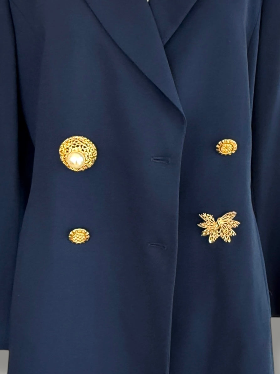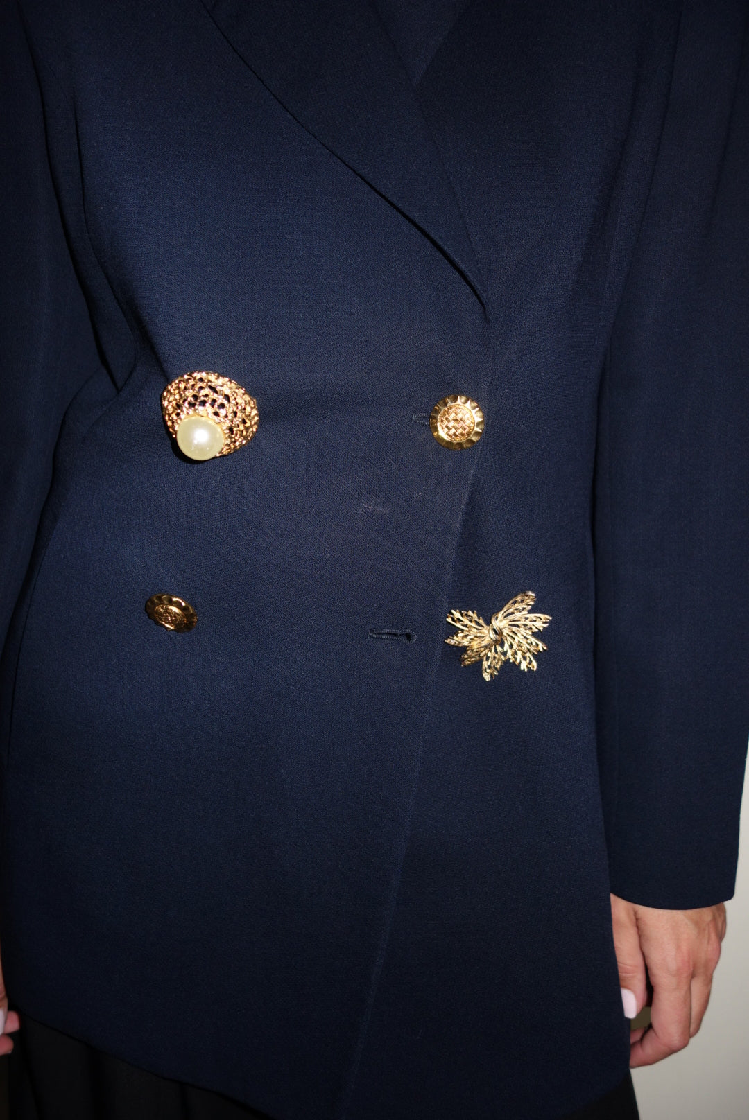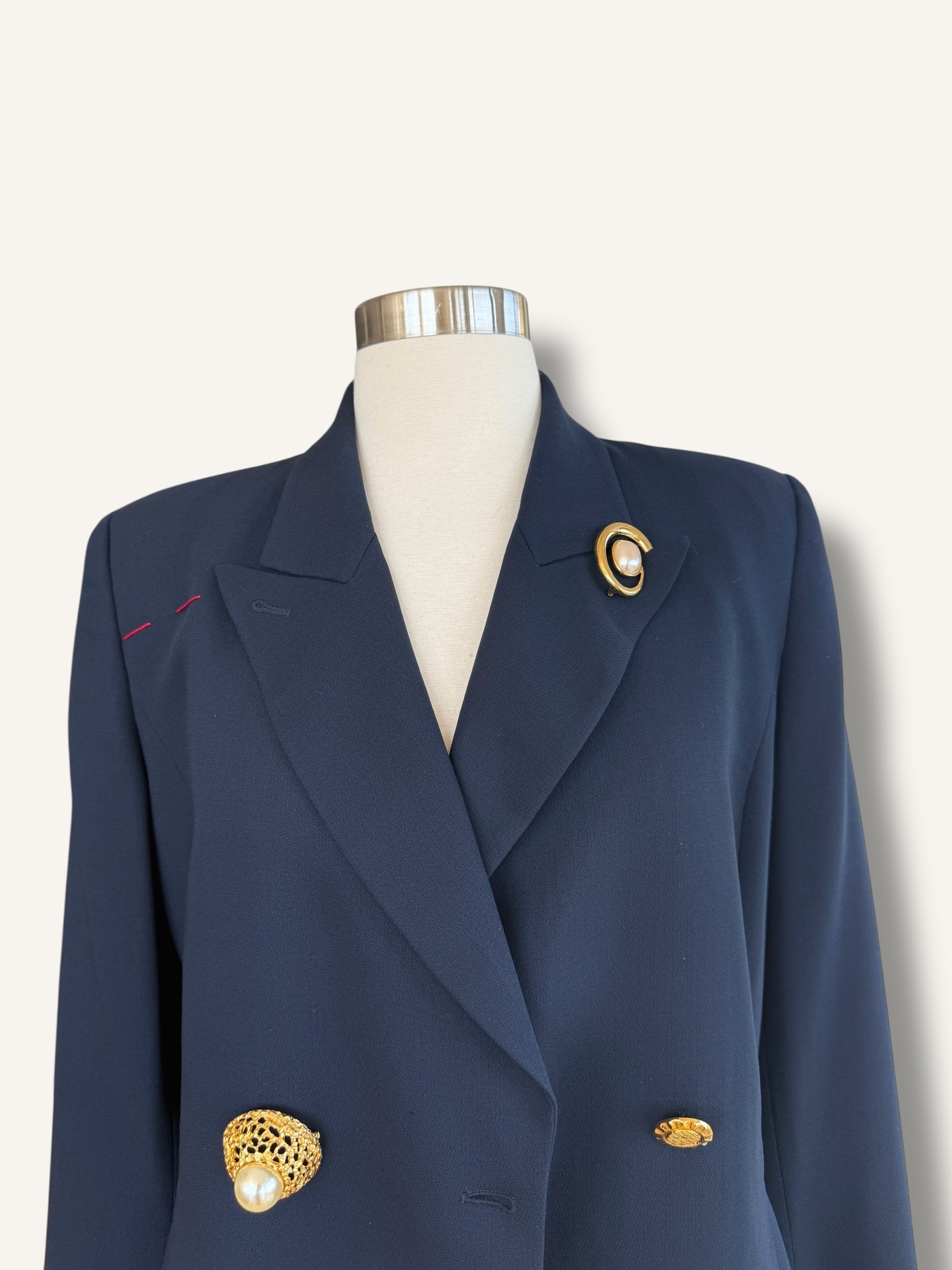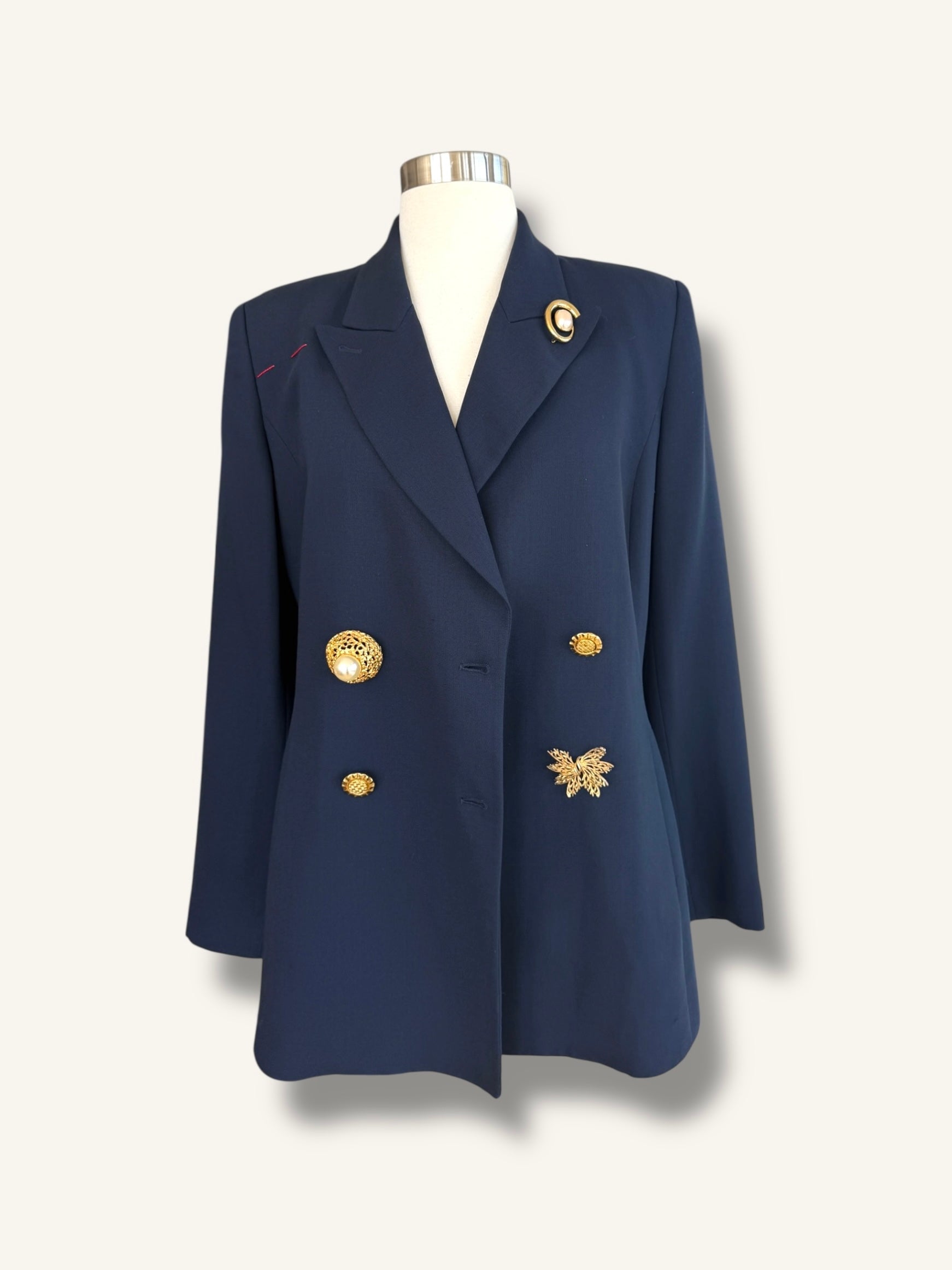 Vintage Henri Bendel 100% Wool Blazer adorned by Jen Wonders with Unique Brooch Accents. Vintage navy blazer in a sharp double-breasted cut, exuding timeless sophistication featuring discreet pockets in the front. This one-of-a-kind piece is reimagined with hand-picked vintage gold-tone buttons and statement brooches, including a pearl-accented design and a textured botanical motif, adding both elegance and personality. The brand’s signature red thread at the shoulder symbolizes good fortune, while the structured tailoring ensures a polished fit. Perfect worn open for a relaxed, modern vibe or buttoned for a sleek, commanding silhouette. Made in Italy