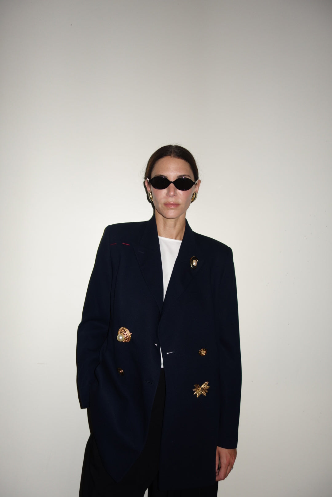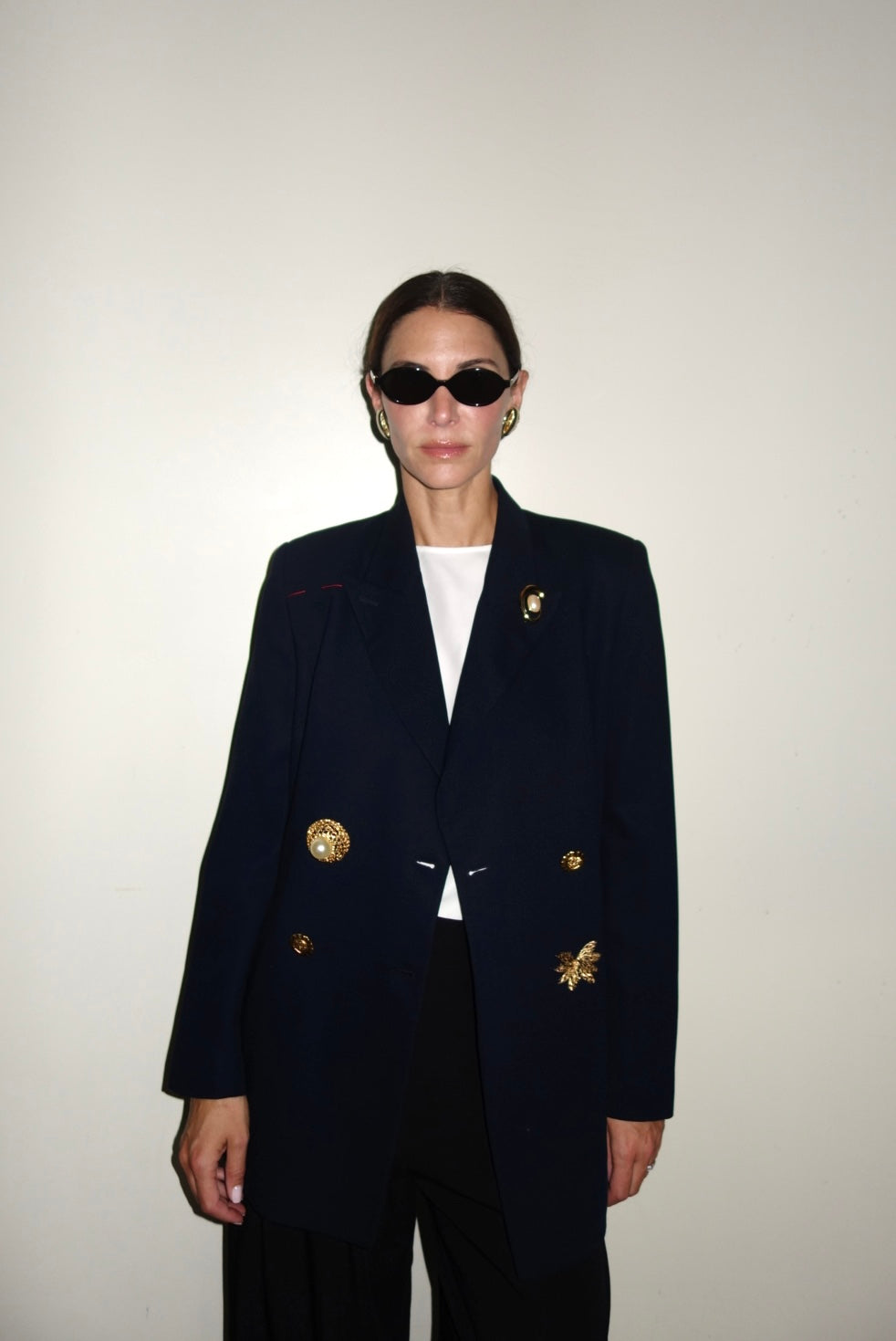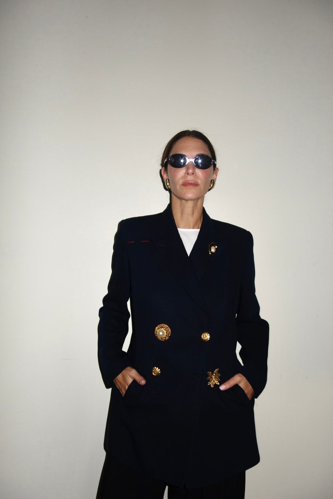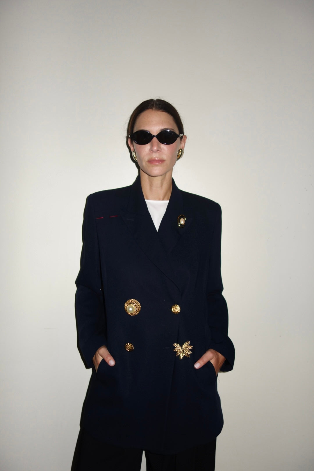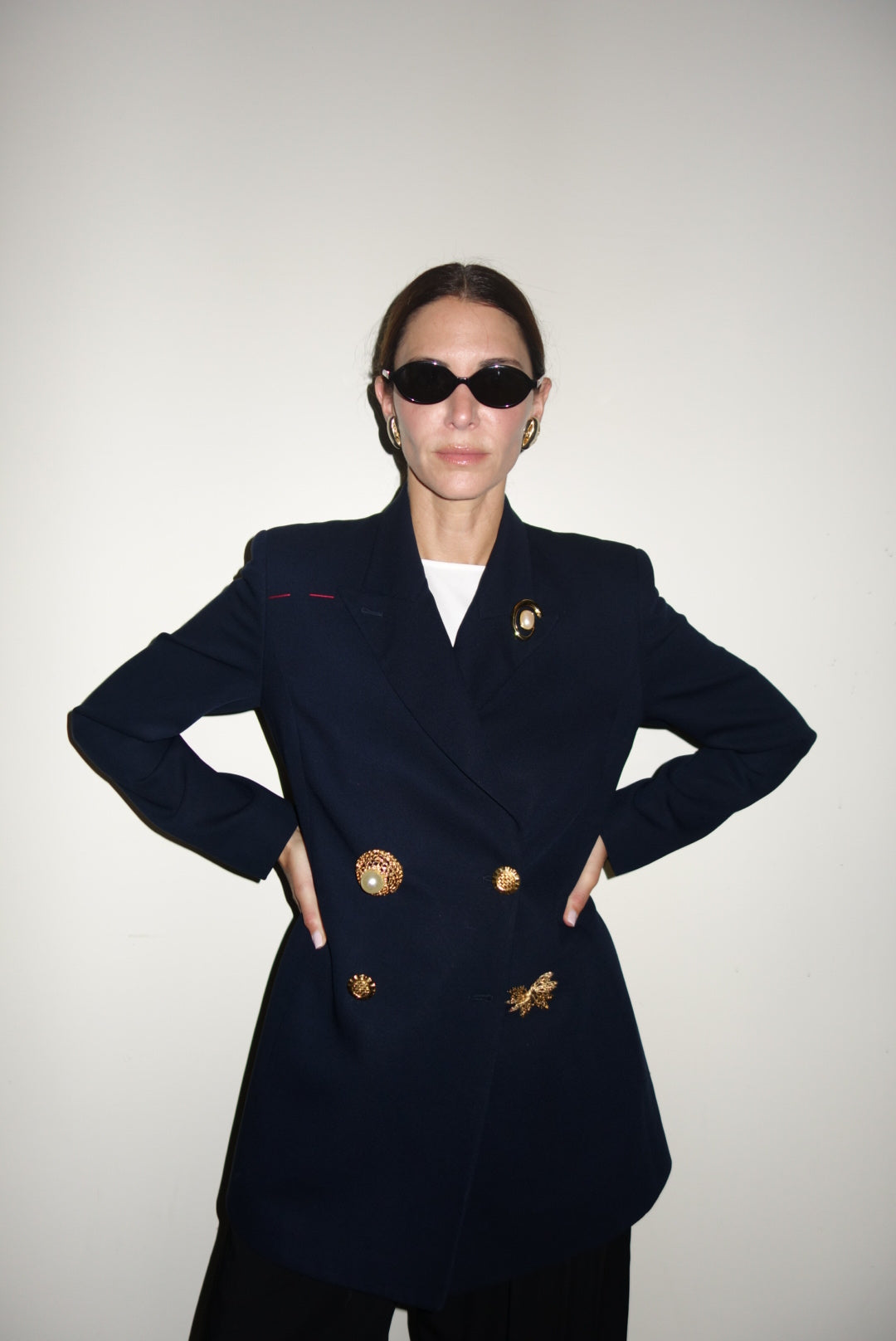 Vintage Henri Bendel 100% Wool Blazer adorned by Jen Wonders with Unique Brooch Accents. Vintage navy blazer in a sharp double-breasted cut, exuding timeless sophistication featuring discreet pockets in the front. This one-of-a-kind piece is reimagined with hand-picked vintage gold-tone buttons and statement brooches, including a pearl-accented design and a textured botanical motif, adding both elegance and personality. The brand’s signature red thread at the shoulder symbolizes good fortune, while the structured tailoring ensures a polished fit. Perfect worn open for a relaxed, modern vibe or buttoned for a sleek, commanding silhouette. Made in Italy