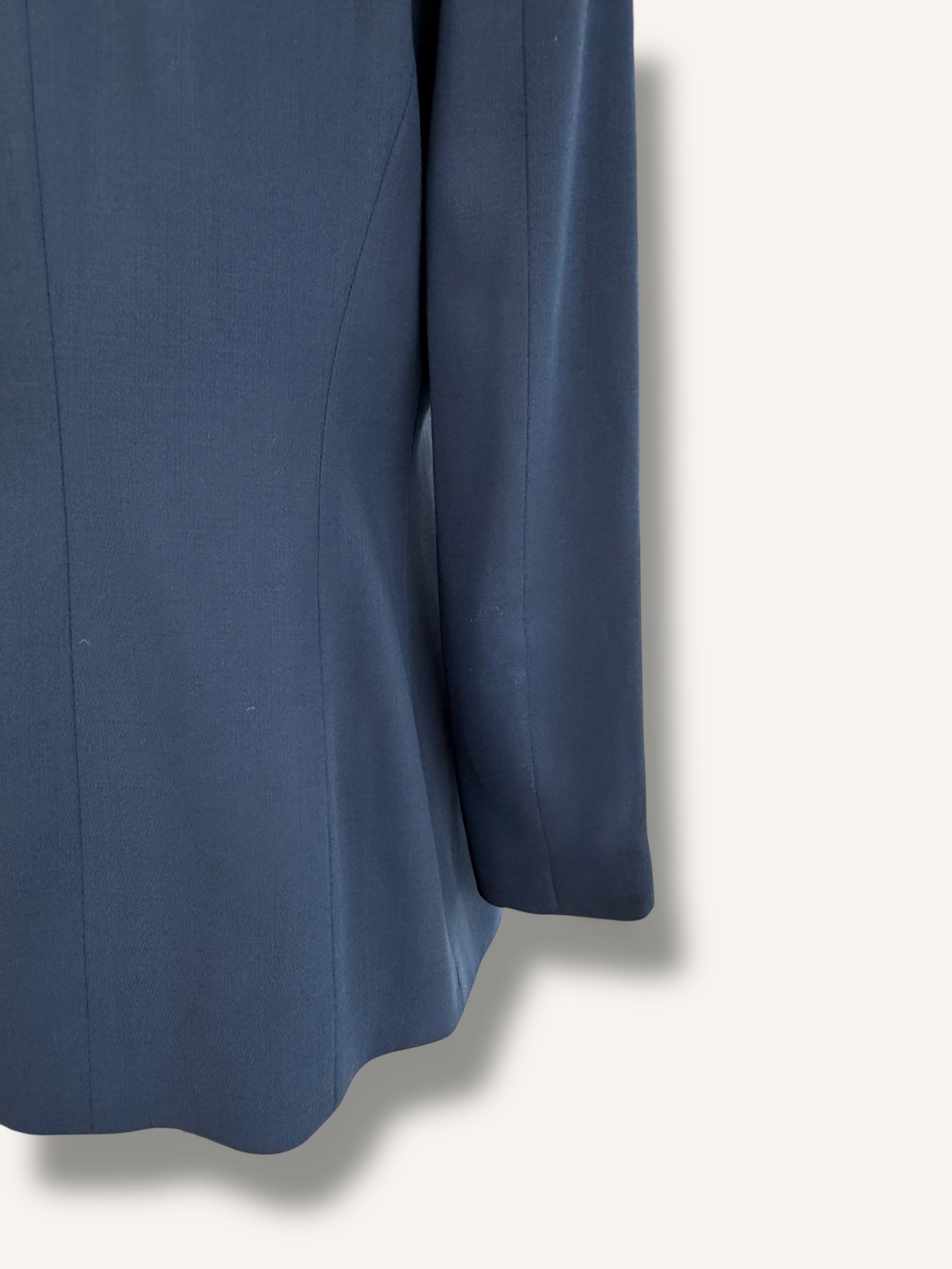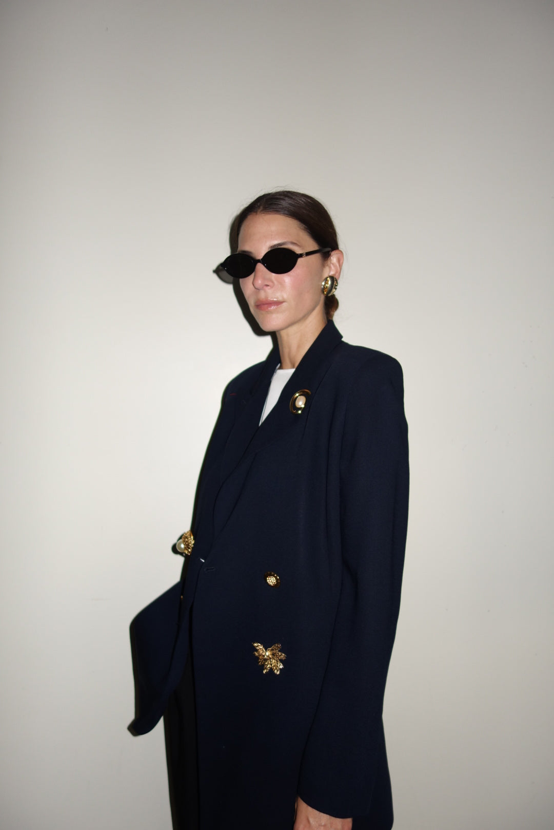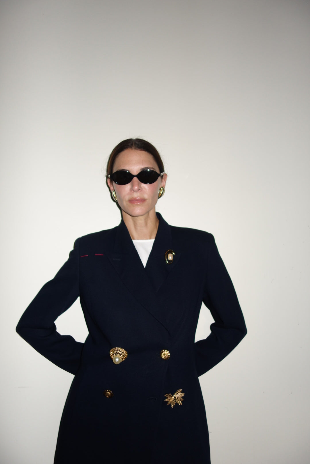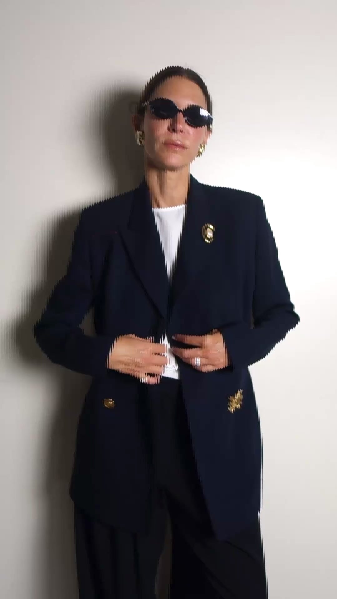 Vintage Henri Bendel 100% Wool Blazer adorned by Jen Wonders with Unique Brooch Accents. Vintage navy blazer in a sharp double-breasted cut, exuding timeless sophistication featuring discreet pockets in the front. This one-of-a-kind piece is reimagined with hand-picked vintage gold-tone buttons and statement brooches, including a pearl-accented design and a textured botanical motif, adding both elegance and personality. The brand’s signature red thread at the shoulder symbolizes good fortune, while the structured tailoring ensures a polished fit. Perfect worn open for a relaxed, modern vibe or buttoned for a sleek, commanding silhouette. Made in Italy