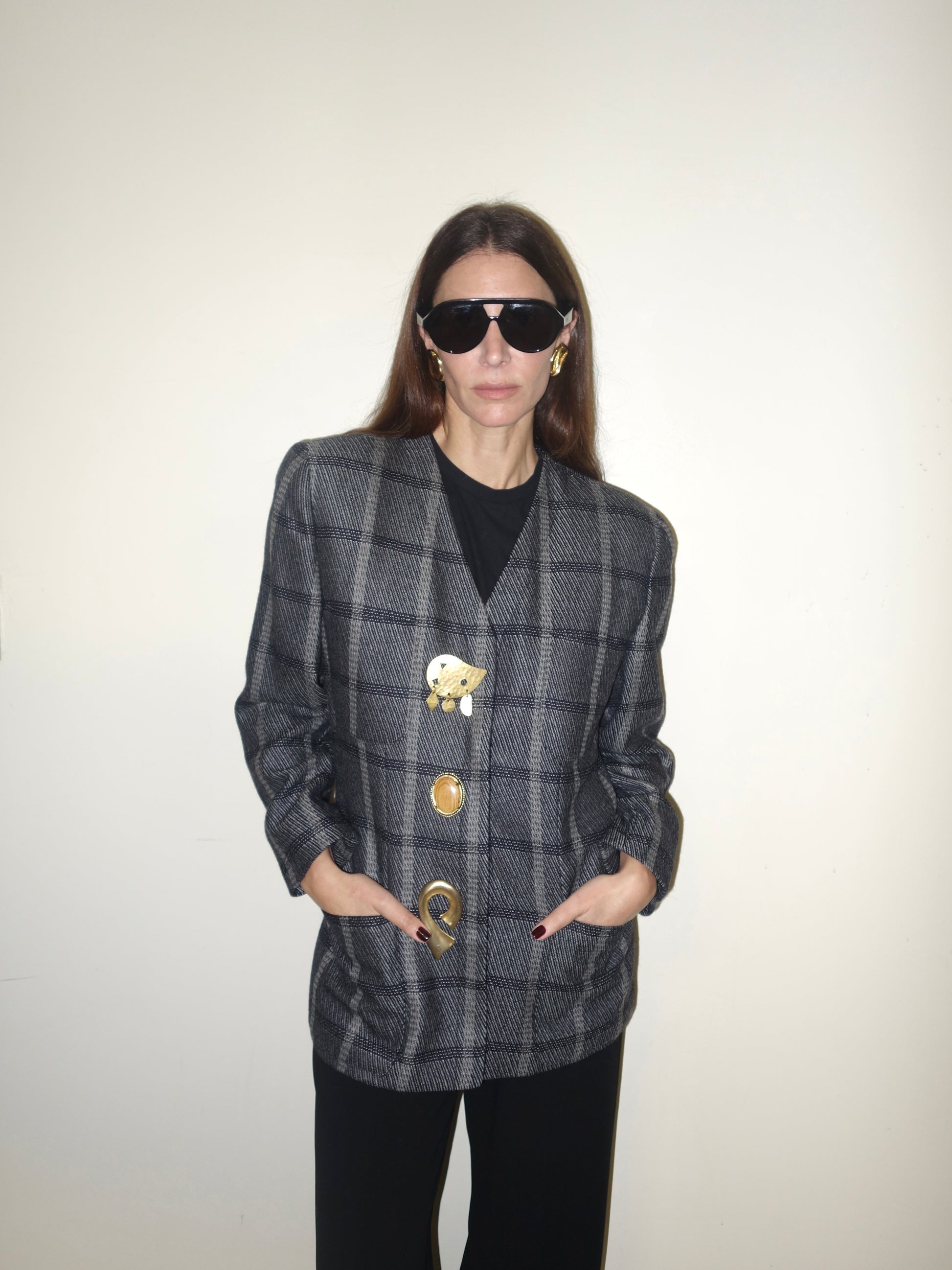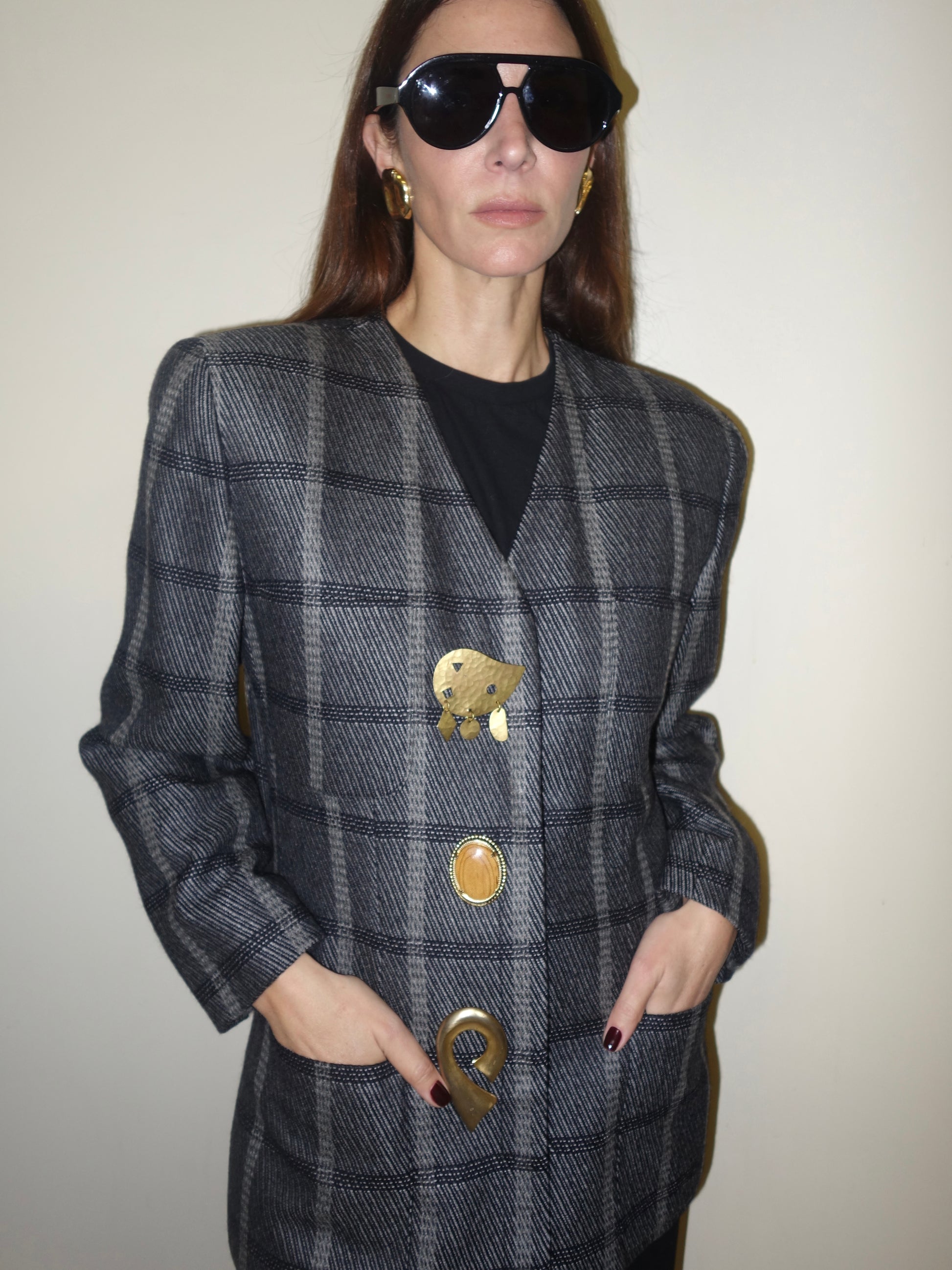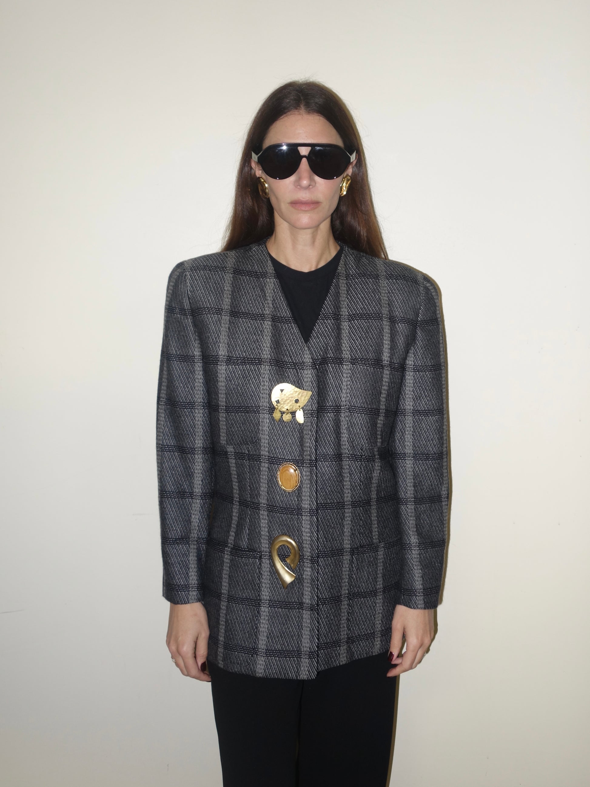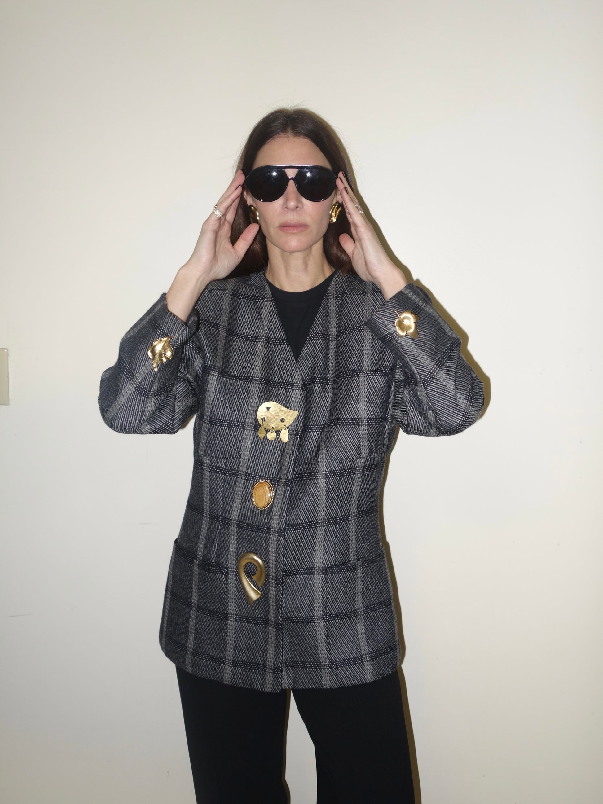 A one-of-a-kind vintage Anne Klein blazer reimagined by Jen Wonders Studio, meticulously adorned with hand-selected vintage brooches that bring character, history, and a sculptural touch to the silhouette. Crafted in a dark grey checkered wool pattern with a refined structure, this blazer features a hidden button closure, allowing you to wear it fully closed for a clean, tailored look or left open for an effortless, modern silhouette.