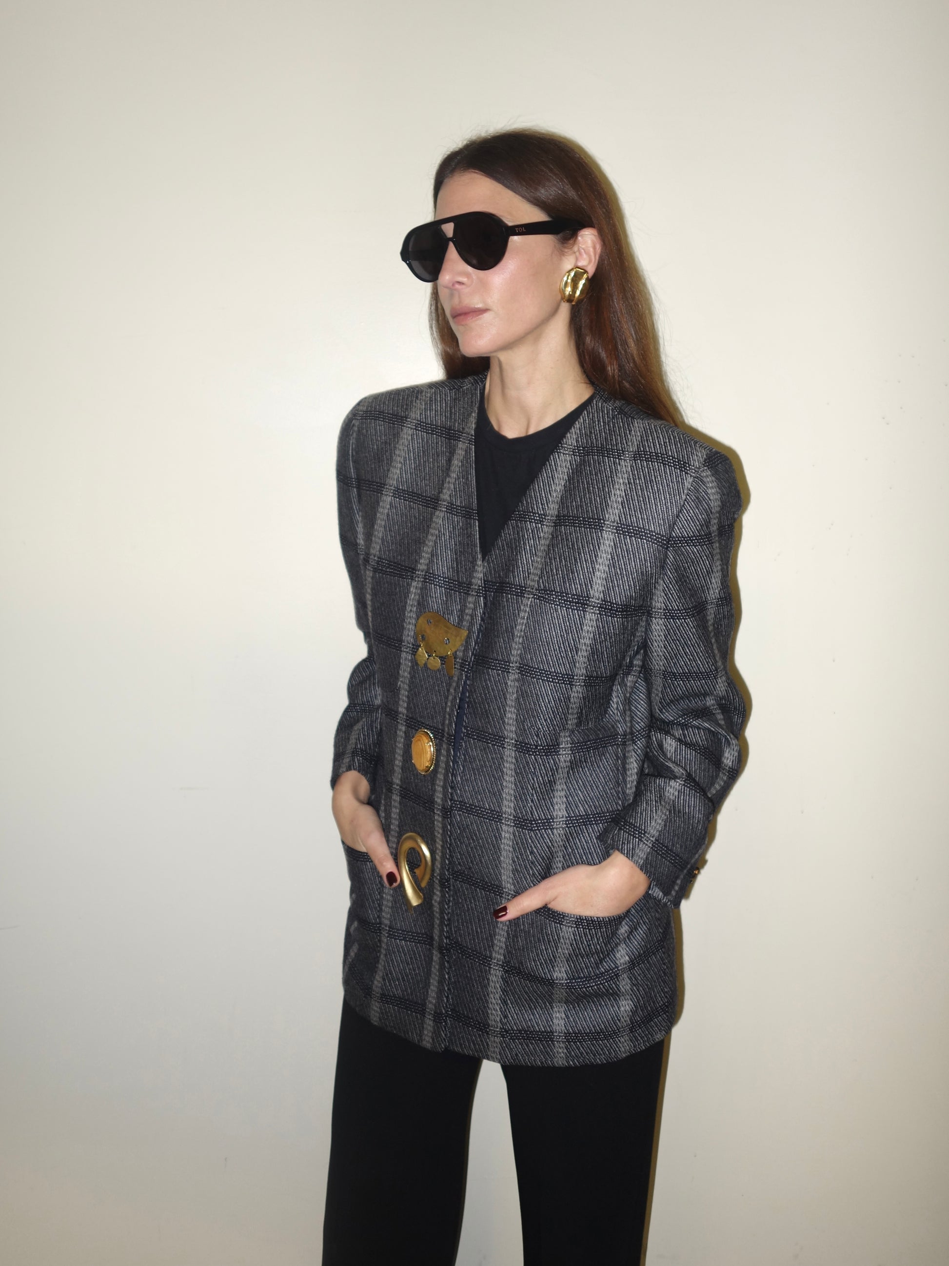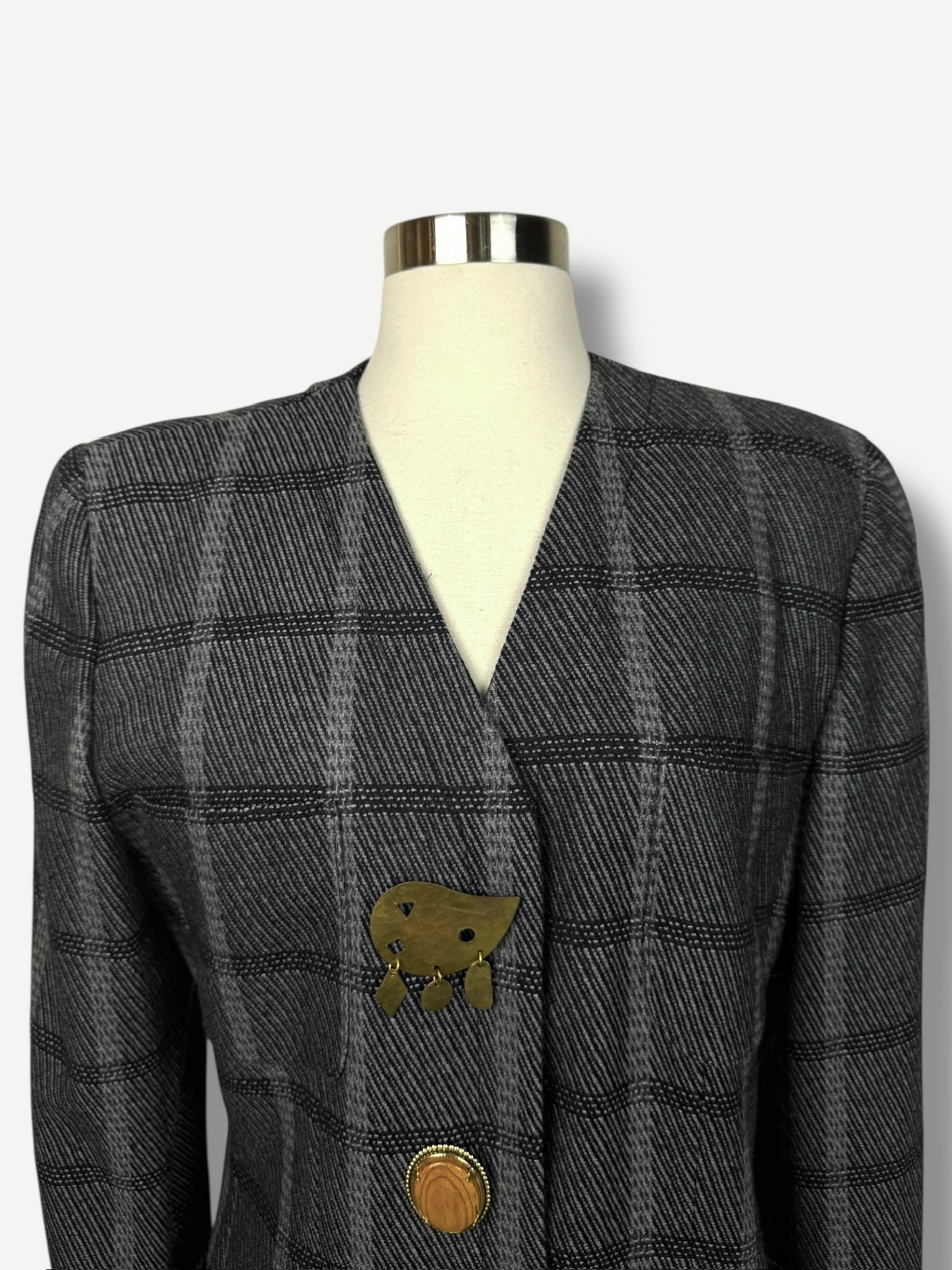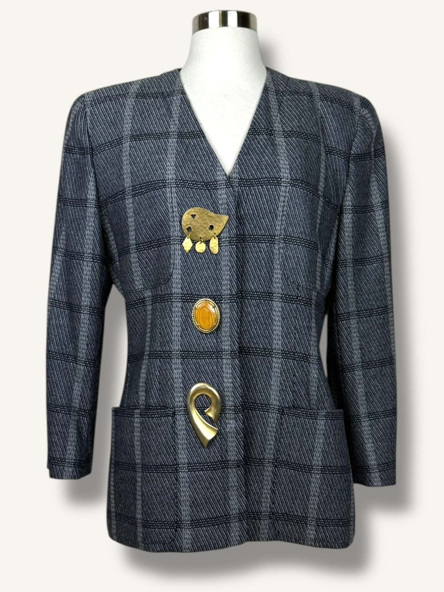 A one-of-a-kind vintage Anne Klein blazer reimagined by Jen Wonders Studio, meticulously adorned with hand-selected vintage brooches that bring character, history, and a sculptural touch to the silhouette. Crafted in a dark grey checkered wool pattern with a refined structure, this blazer features a hidden button closure, allowing you to wear it fully closed for a clean, tailored look or left open for an effortless, modern silhouette.