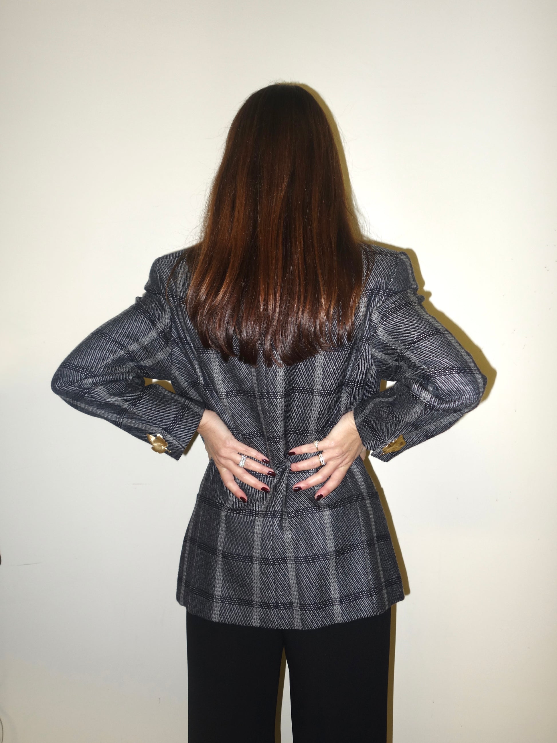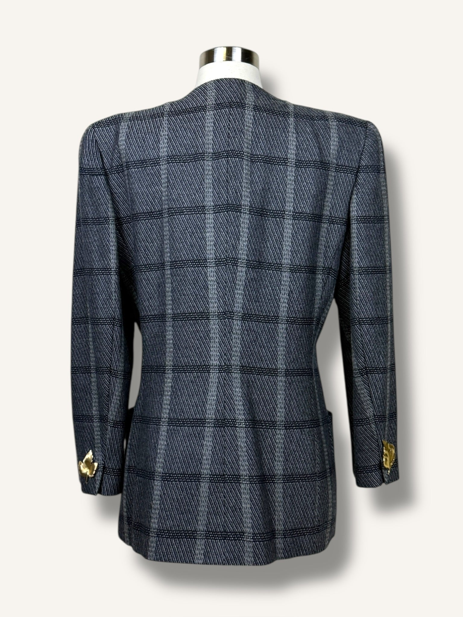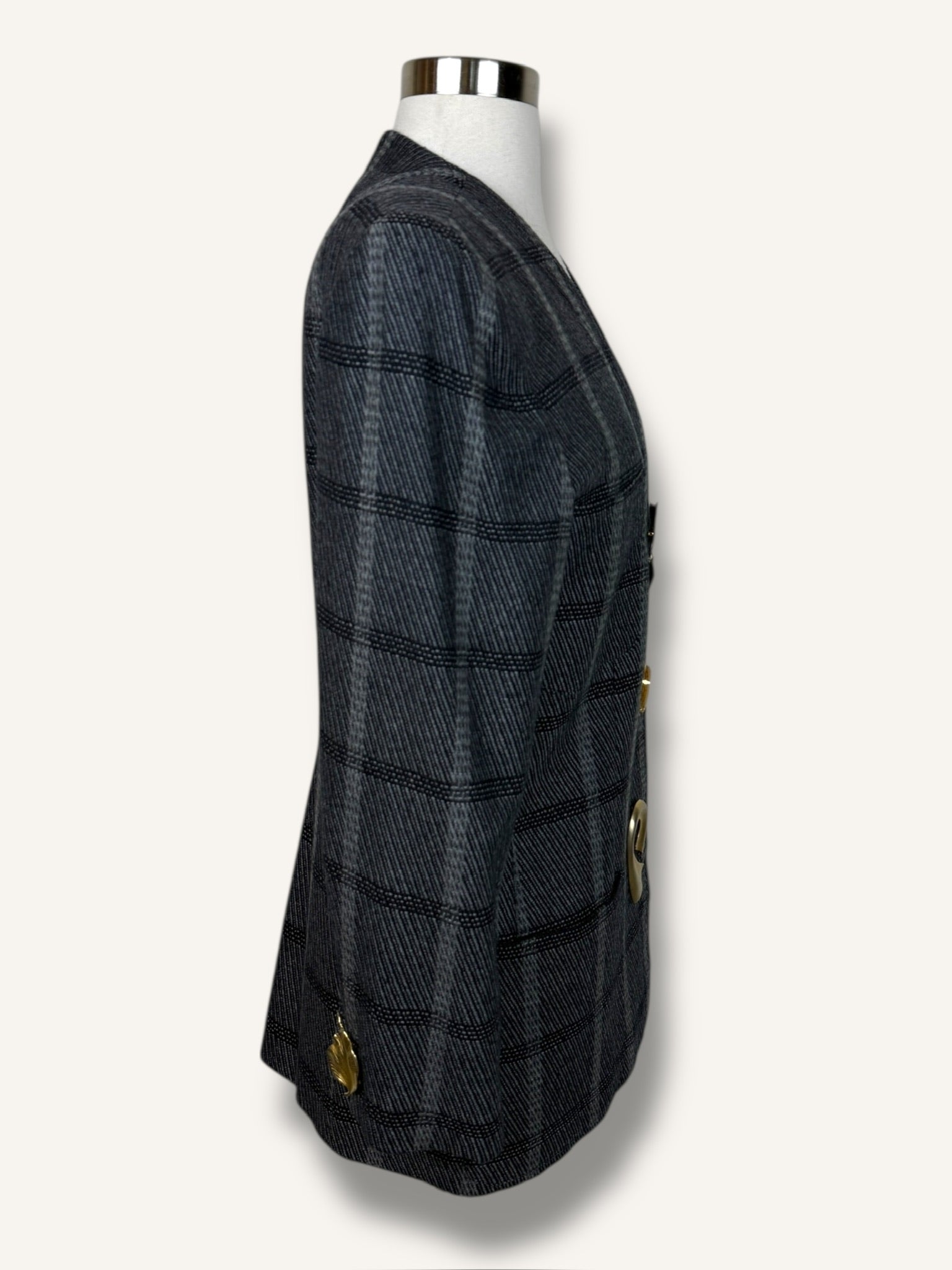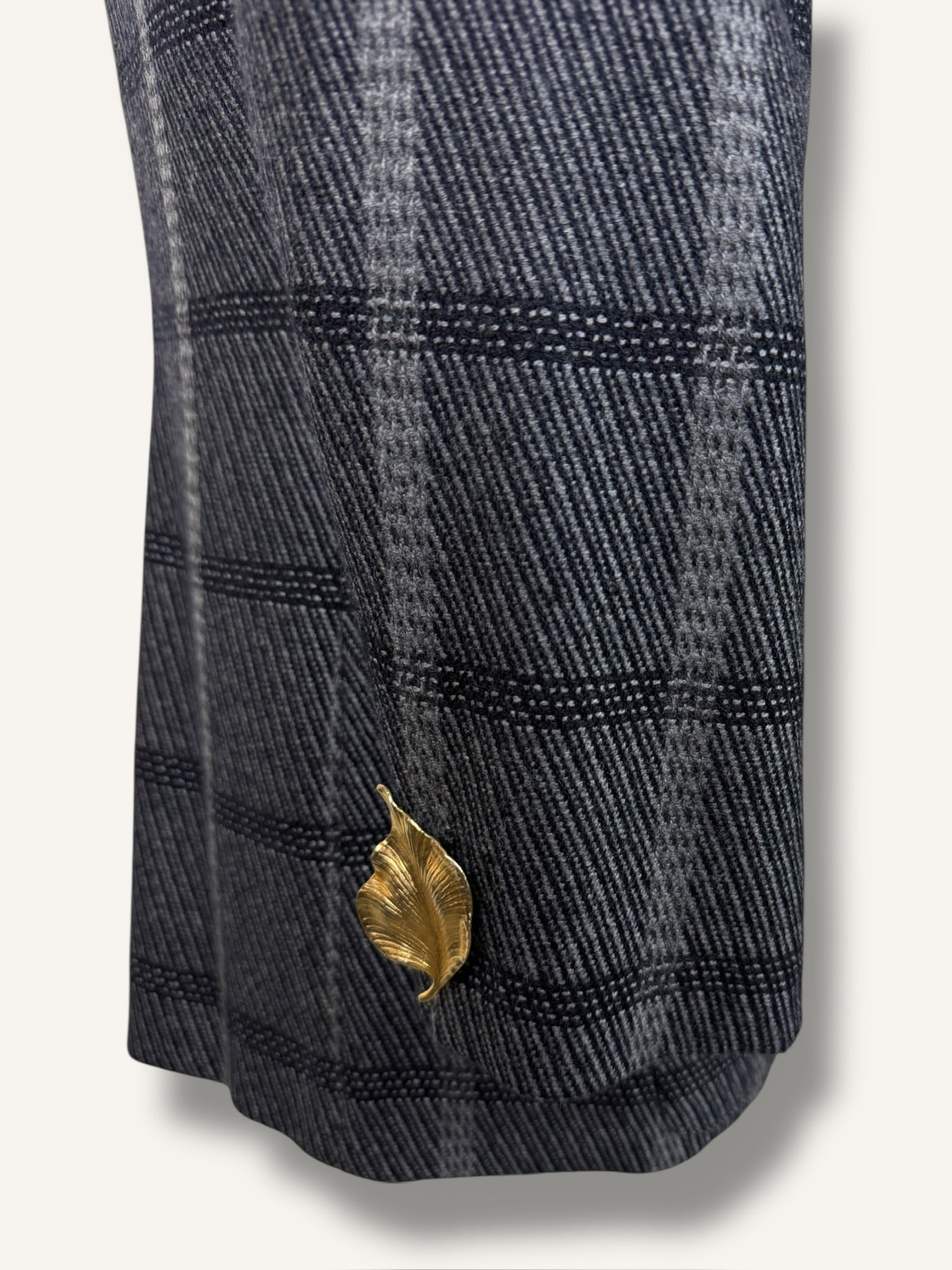 A one-of-a-kind vintage Anne Klein blazer reimagined by Jen Wonders Studio, meticulously adorned with hand-selected vintage brooches that bring character, history, and a sculptural touch to the silhouette. Crafted in a dark grey checkered wool pattern with a refined structure, this blazer features a hidden button closure, allowing you to wear it fully closed for a clean, tailored look or left open for an effortless, modern silhouette.