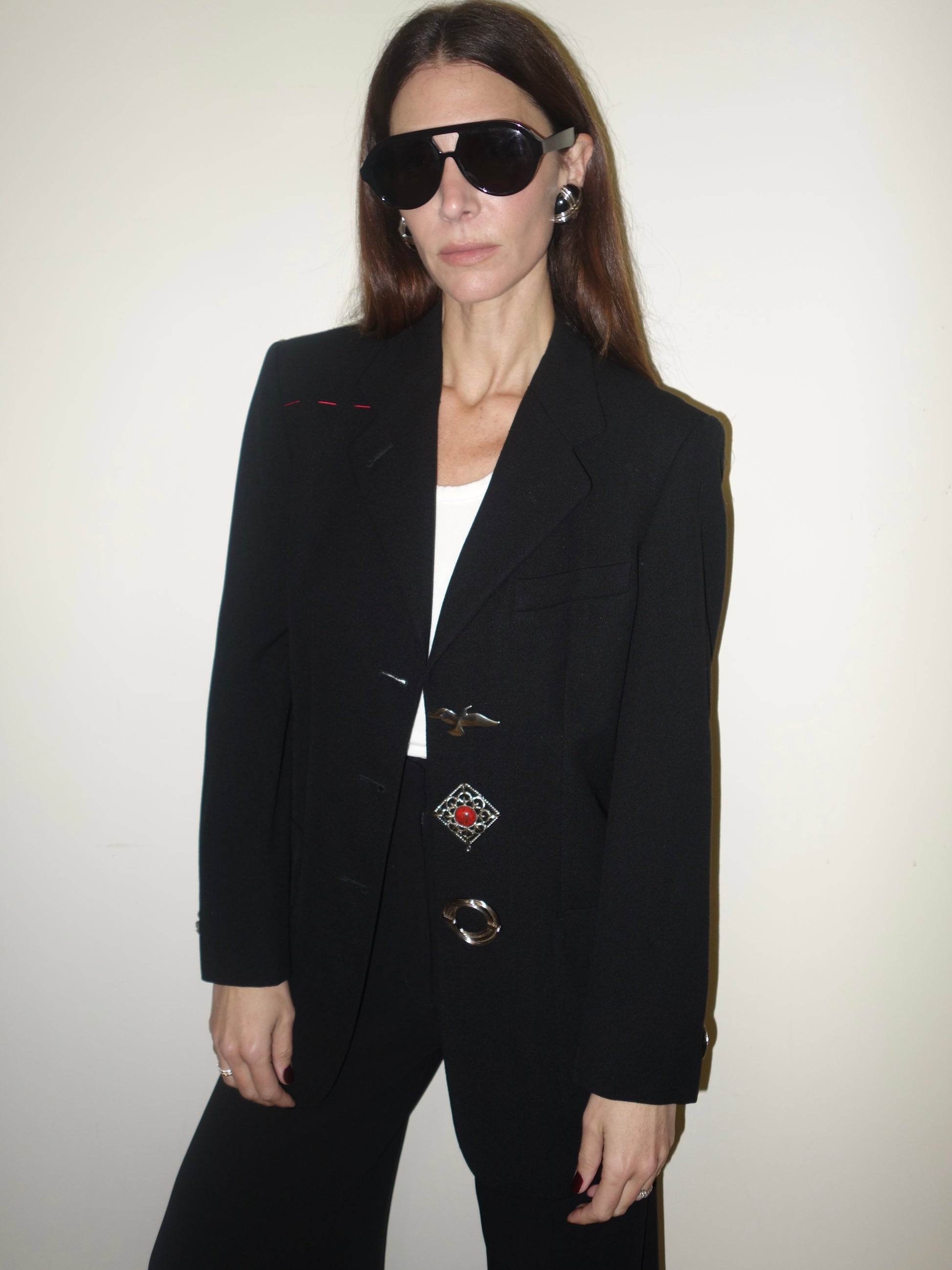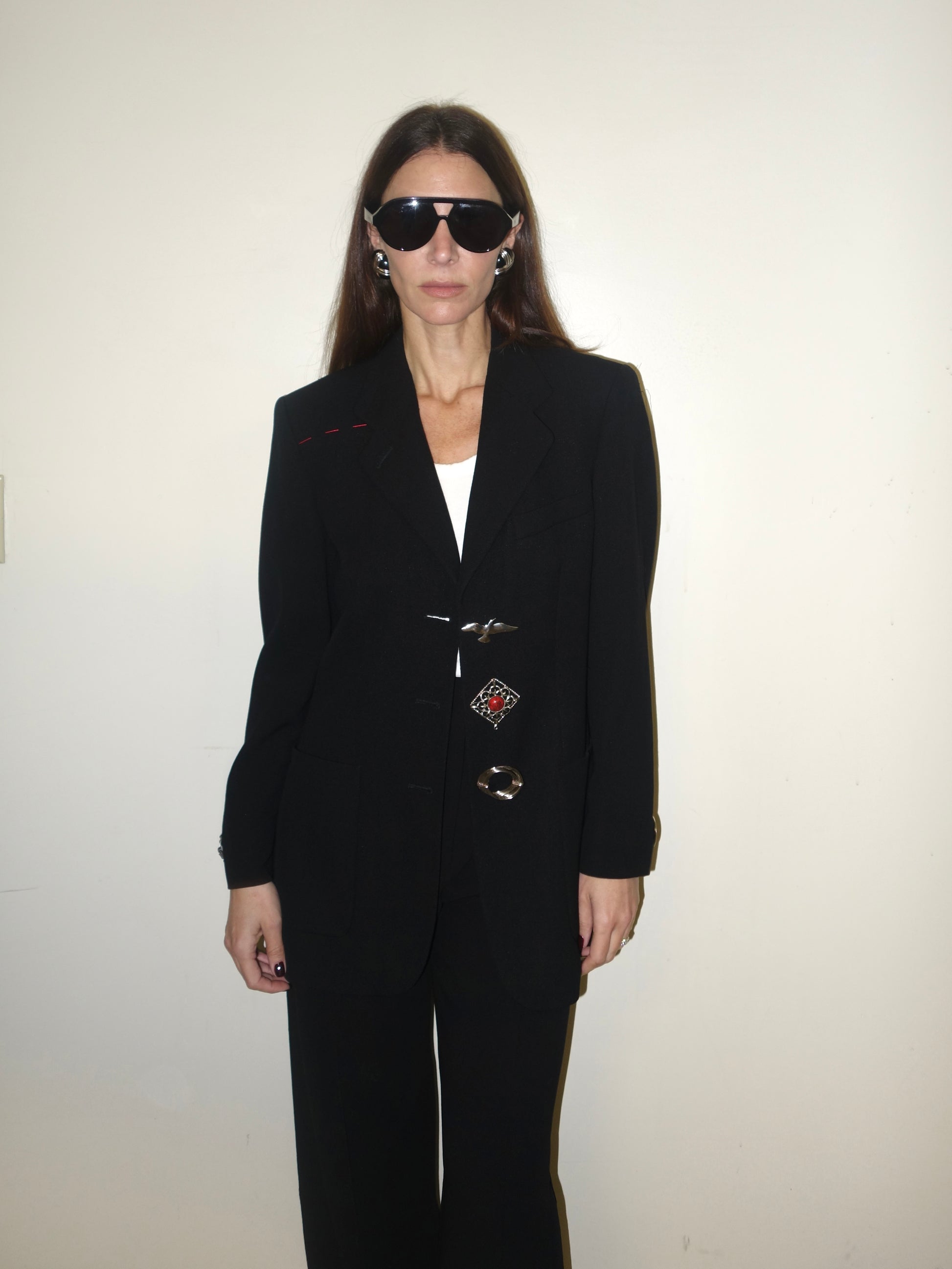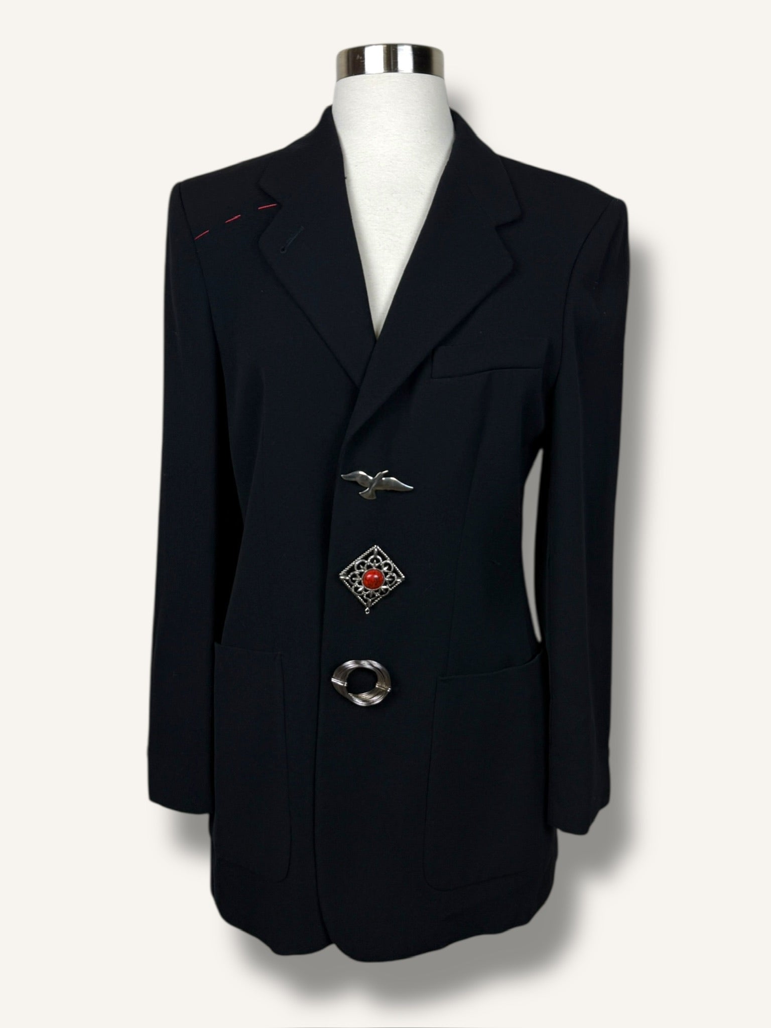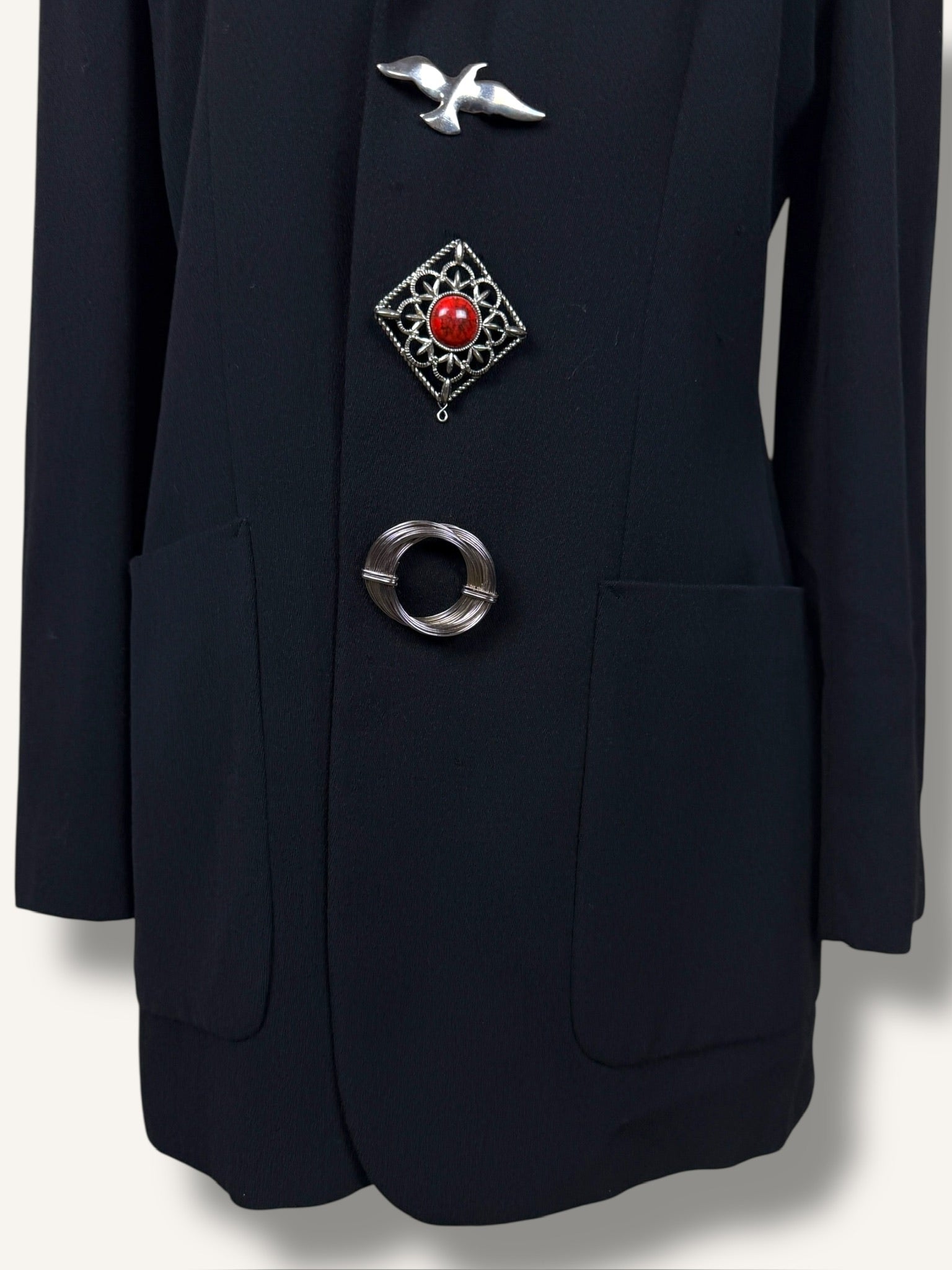 A one-of-a-kind vintage black blazer transformed by Jen Wonders Studio, thoughtfully adorned with a curated trio of vintage brooches in the front that bring sculptural contrast and personality to its clean, tailored lines. The Studio’s signature red stitch at the shoulder adds a discreet touch of intention and good fortune, a mark of authenticity and artistry. Each brooch, from the soaring silver bird to the ornate red cabochon and the circular metallic motif, is individually sourced and vintage, making this piece truly singular. A timeless staple elevated with collectible charm and unmistakable character.