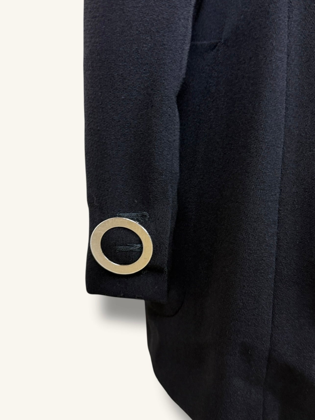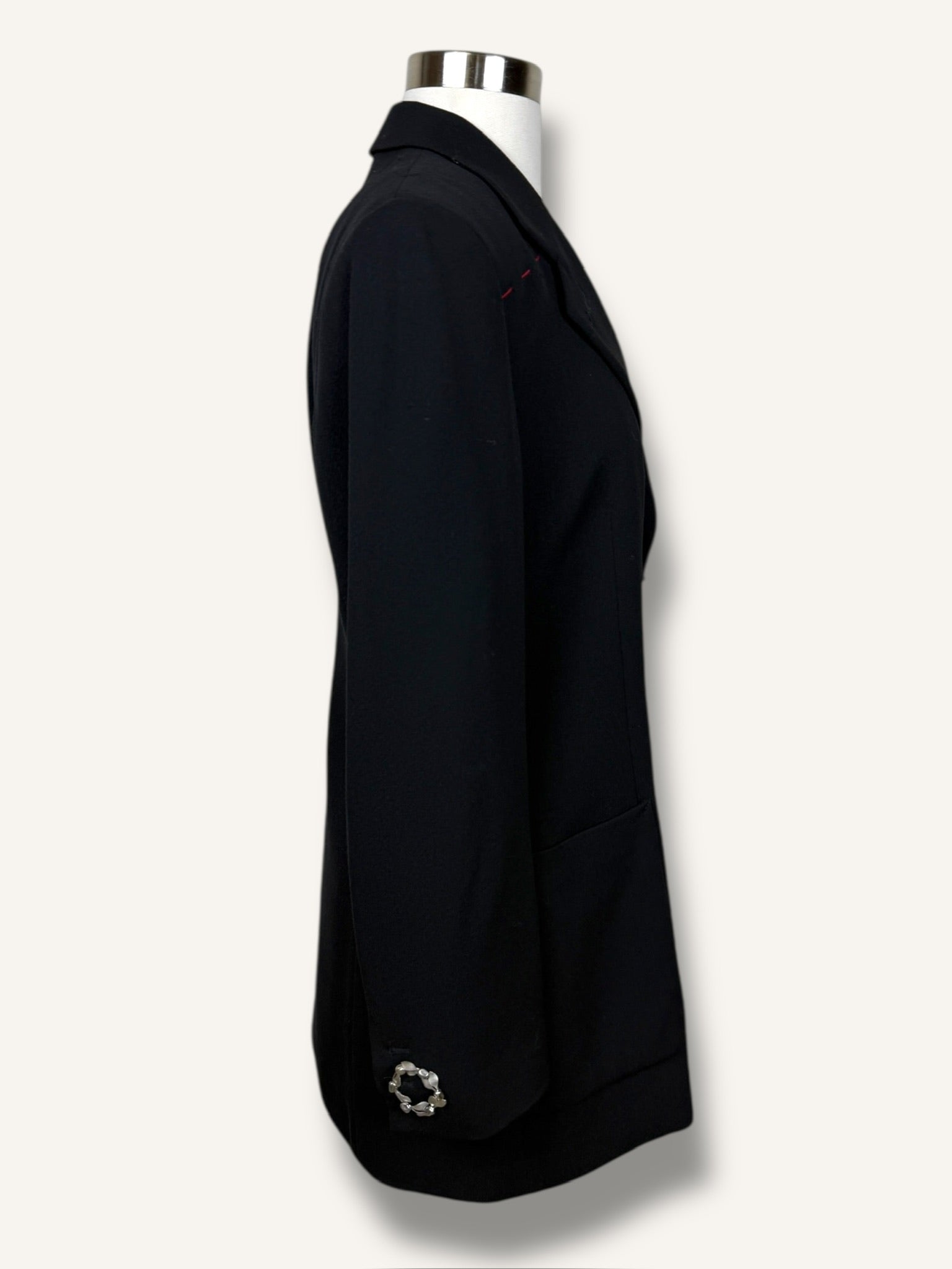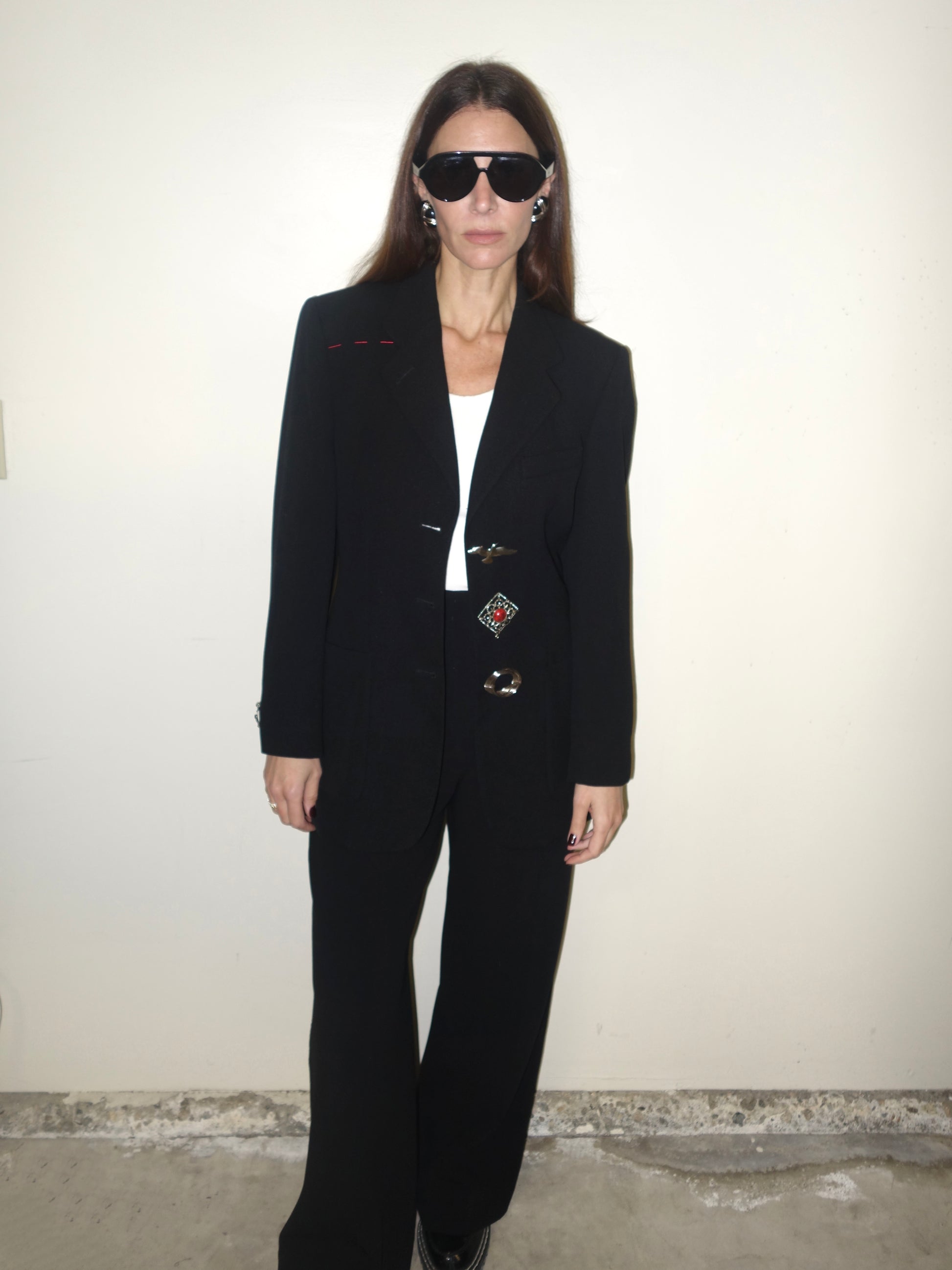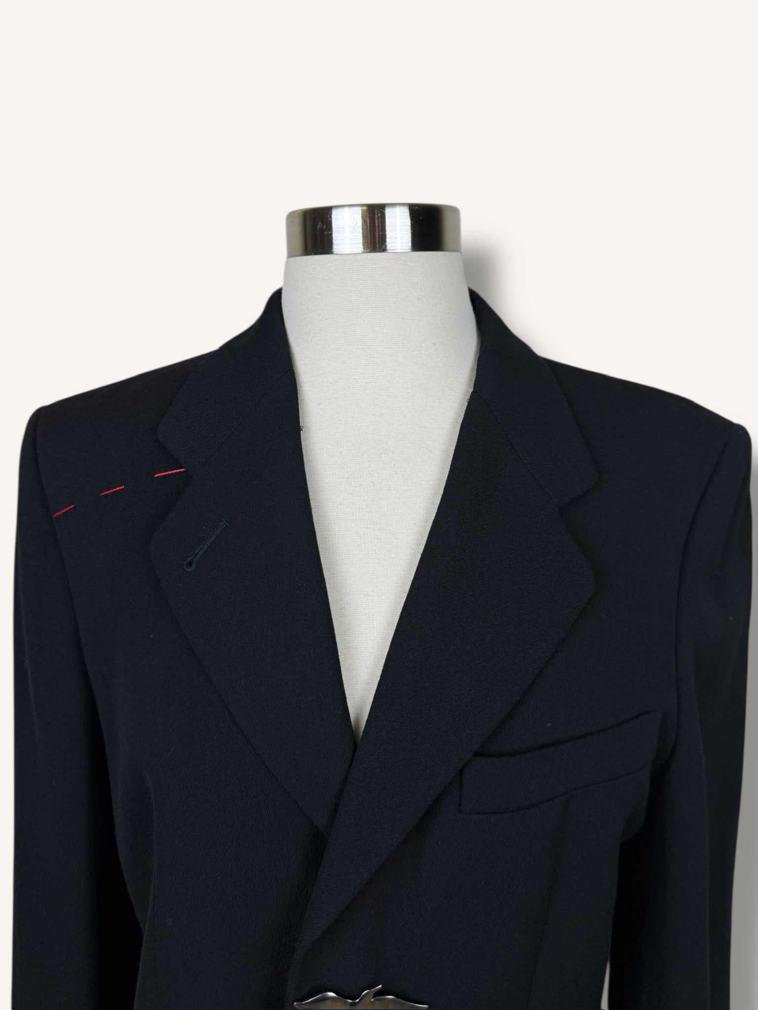 A one-of-a-kind vintage black blazer transformed by Jen Wonders Studio, thoughtfully adorned with a curated trio of vintage brooches in the front that bring sculptural contrast and personality to its clean, tailored lines. The Studio’s signature red stitch at the shoulder adds a discreet touch of intention and good fortune, a mark of authenticity and artistry. Each brooch, from the soaring silver bird to the ornate red cabochon and the circular metallic motif, is individually sourced and vintage, making this piece truly singular. A timeless staple elevated with collectible charm and unmistakable character.