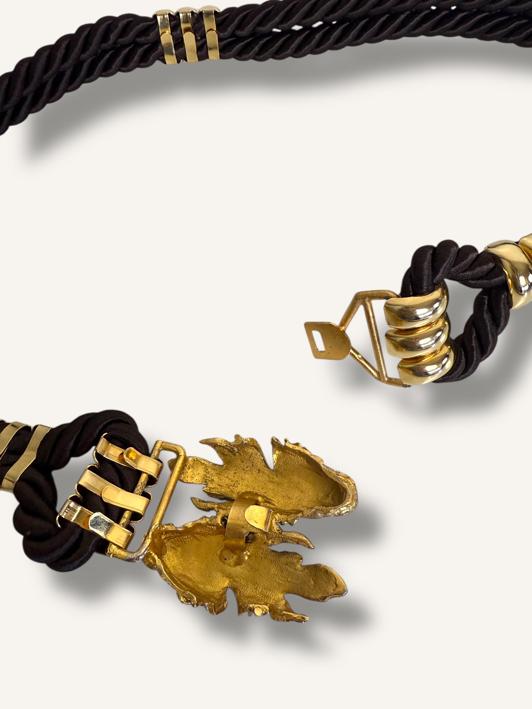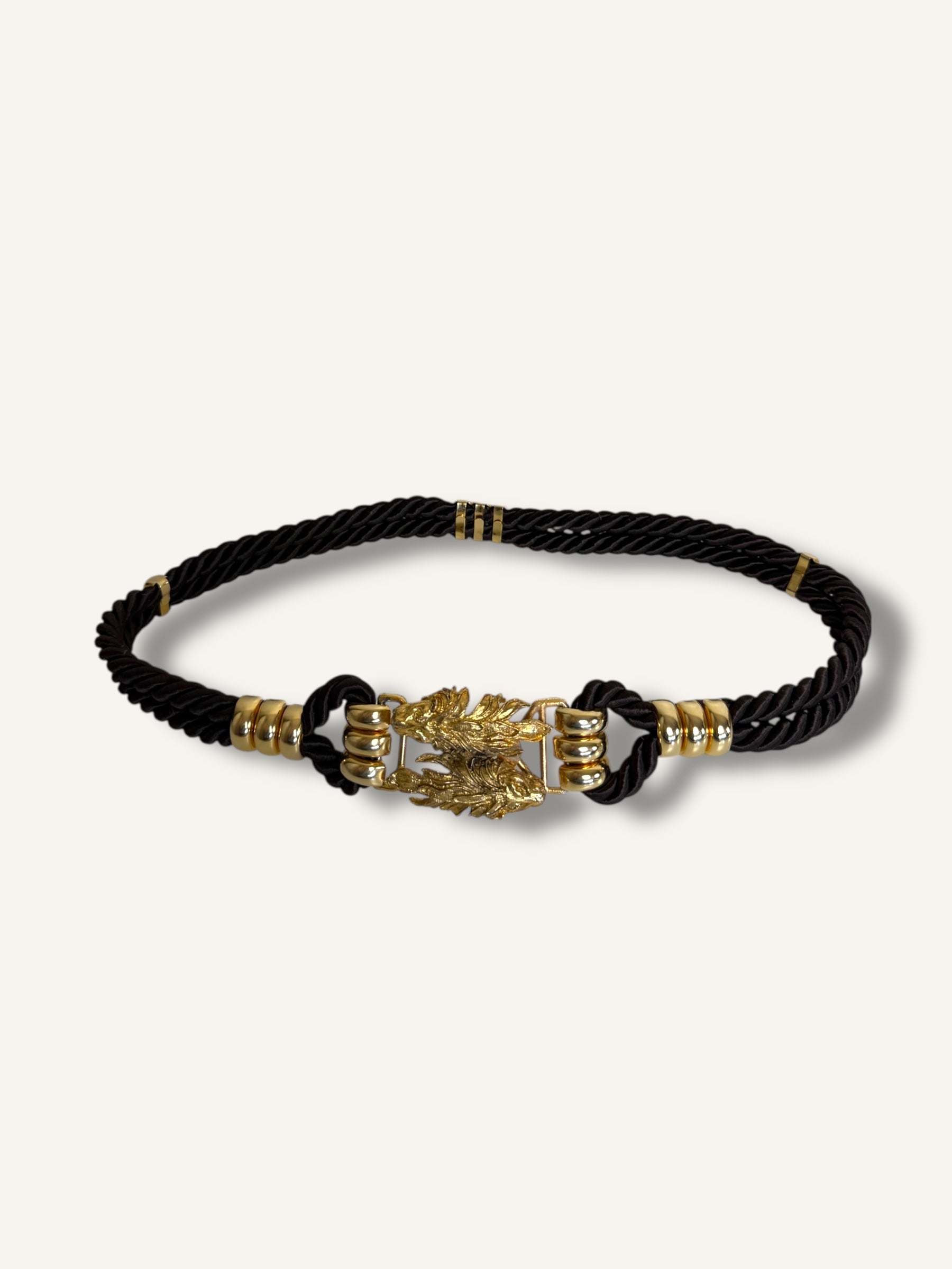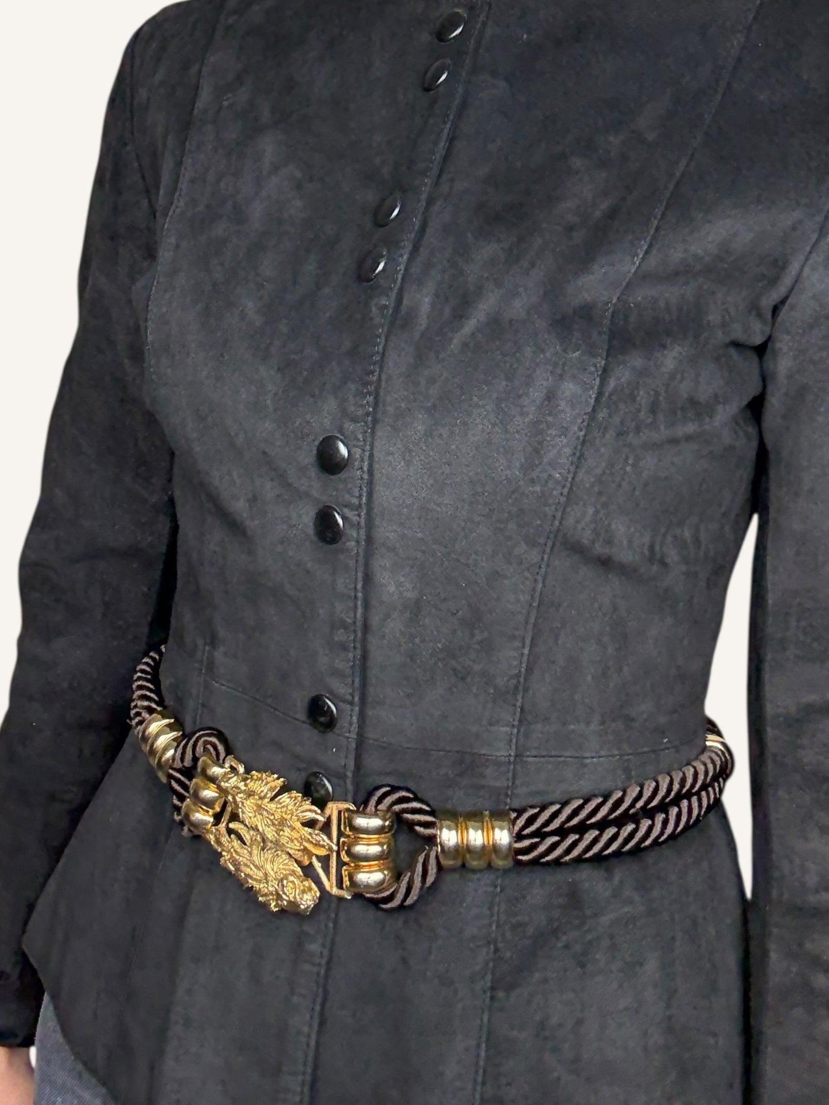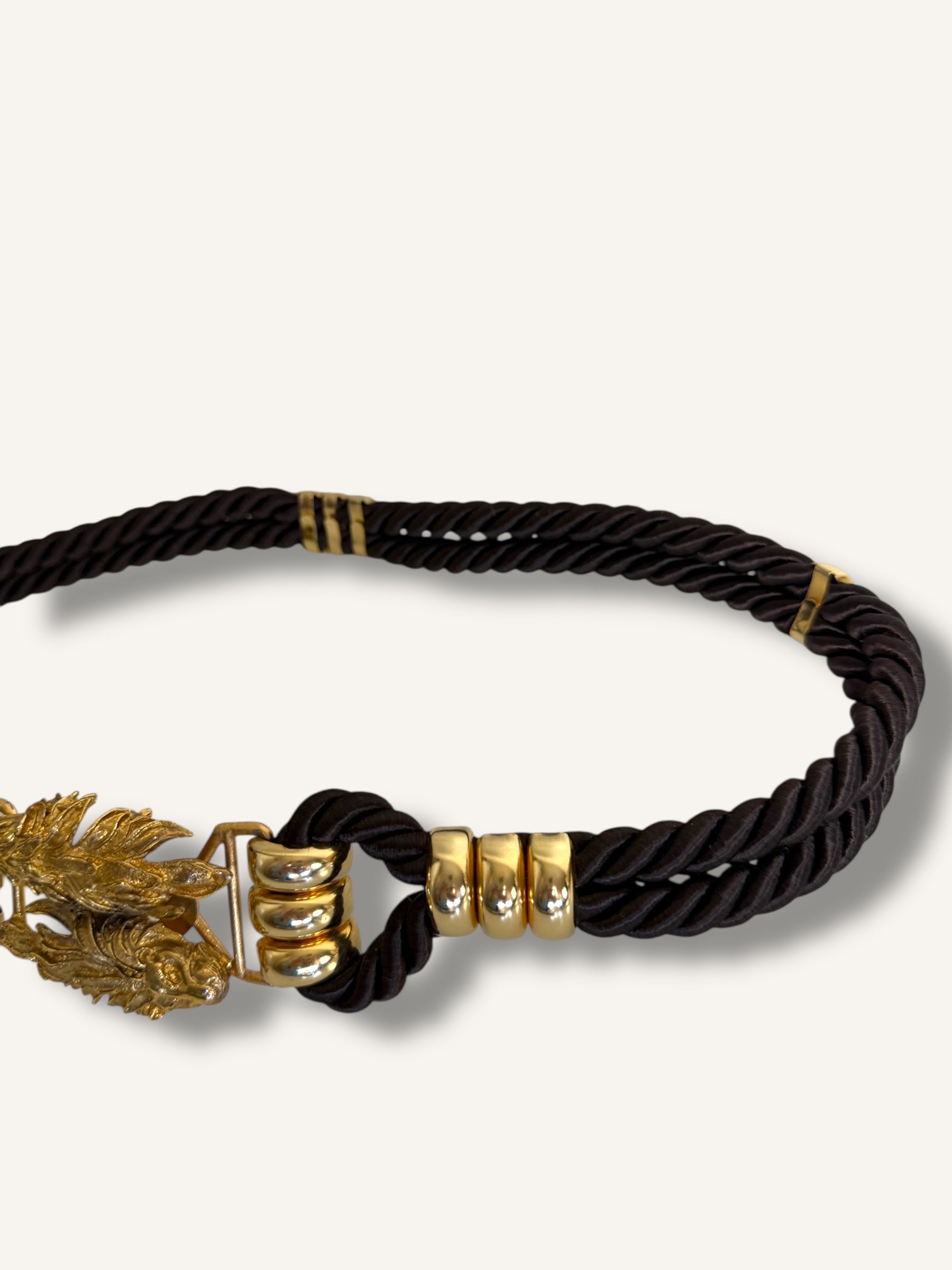 A beautifully crafted vintage belt in rich brown cord, designed to add texture and character to any silhouette. The sculpted shape and structured form give it a cinched, waist-defining effect, while its warm tone makes it a versatile piece for both everyday styling and statement looks. Perfect over blazers, dresses, or knits, it’s an effortless way to elevate your outfit with timeless vintage charm.