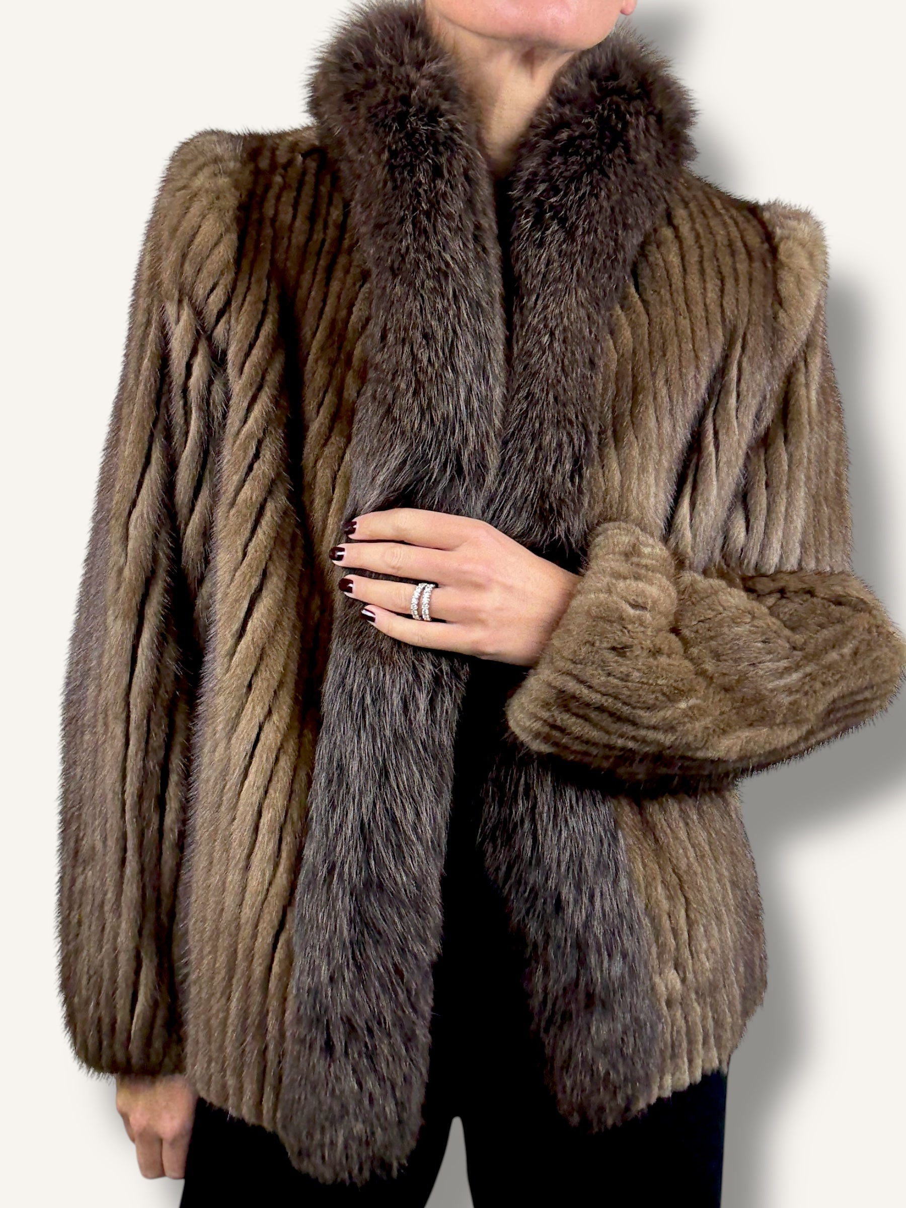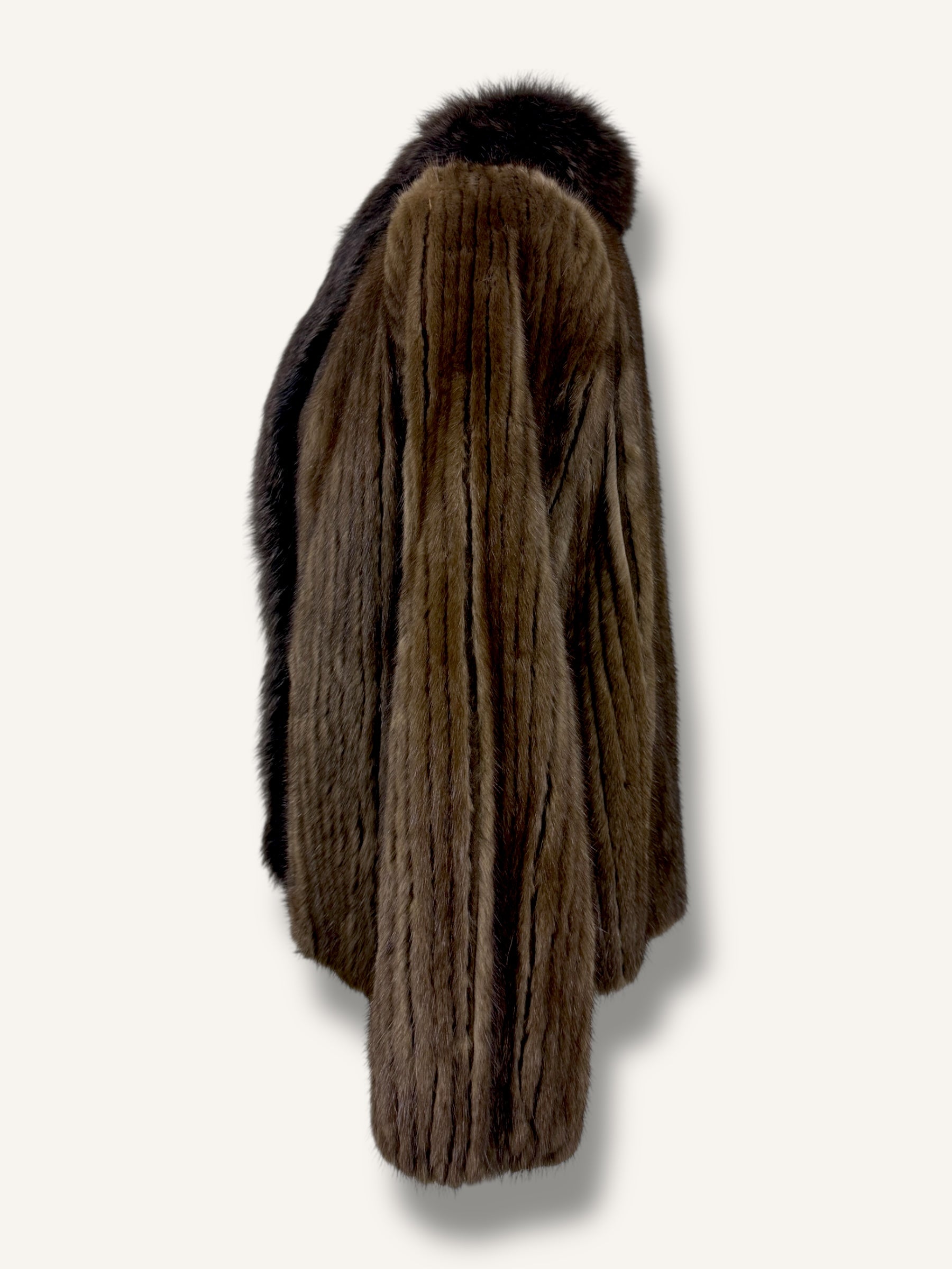 Vintage Mink Fur Coat with Fox Trim. A luxurious vintage mink fur coat crafted in a rich, warm brown tone and finished with a stunning darker fox fur trim along the collar and front panel. The silhouette is timeless, offering both sophistication and exceptional softness. Designed with hidden hook closures for a seamless front and two discreet pockets for added practicality, this piece embodies classic elegance with effortless wearability. Great overall condition.