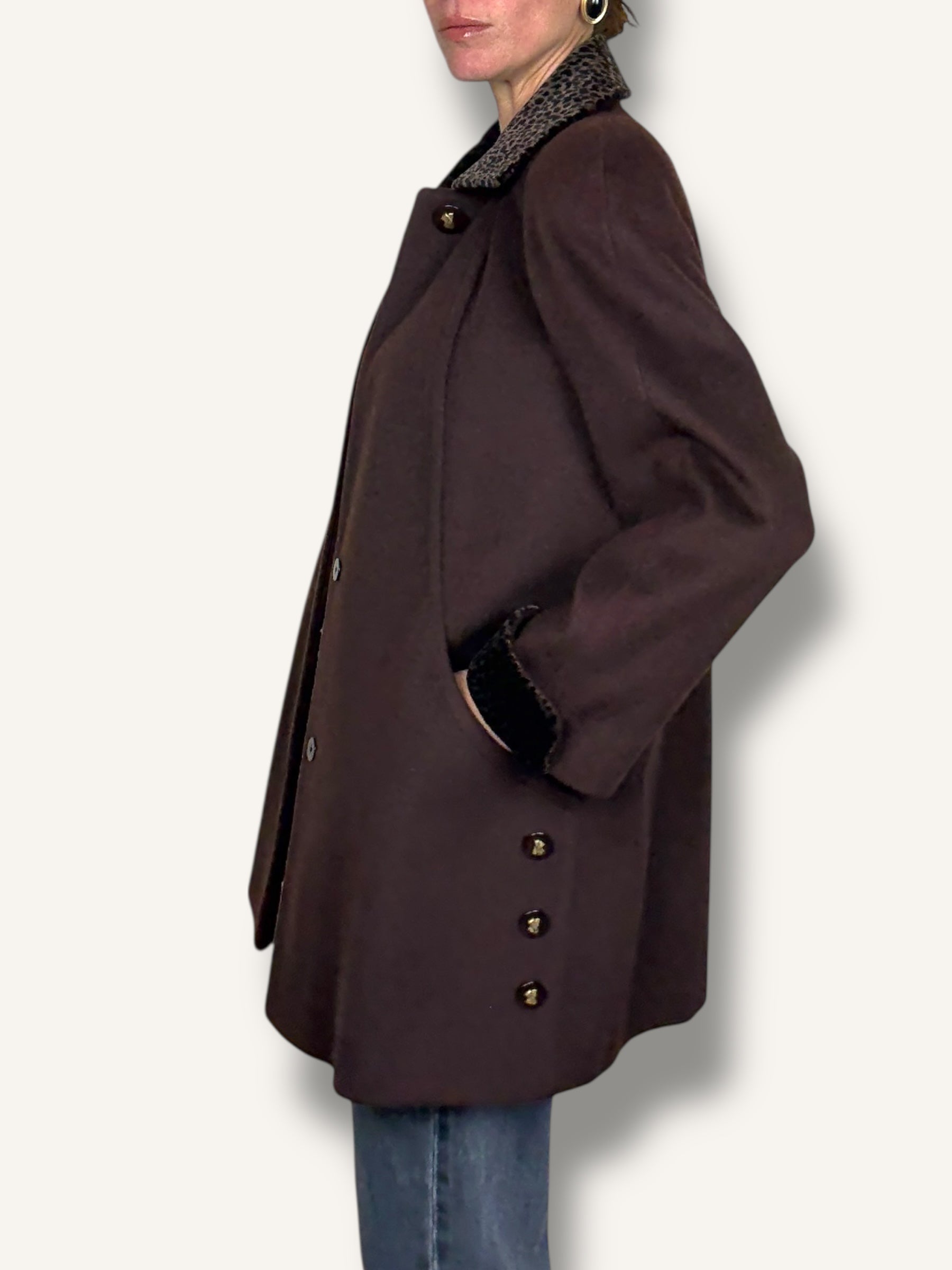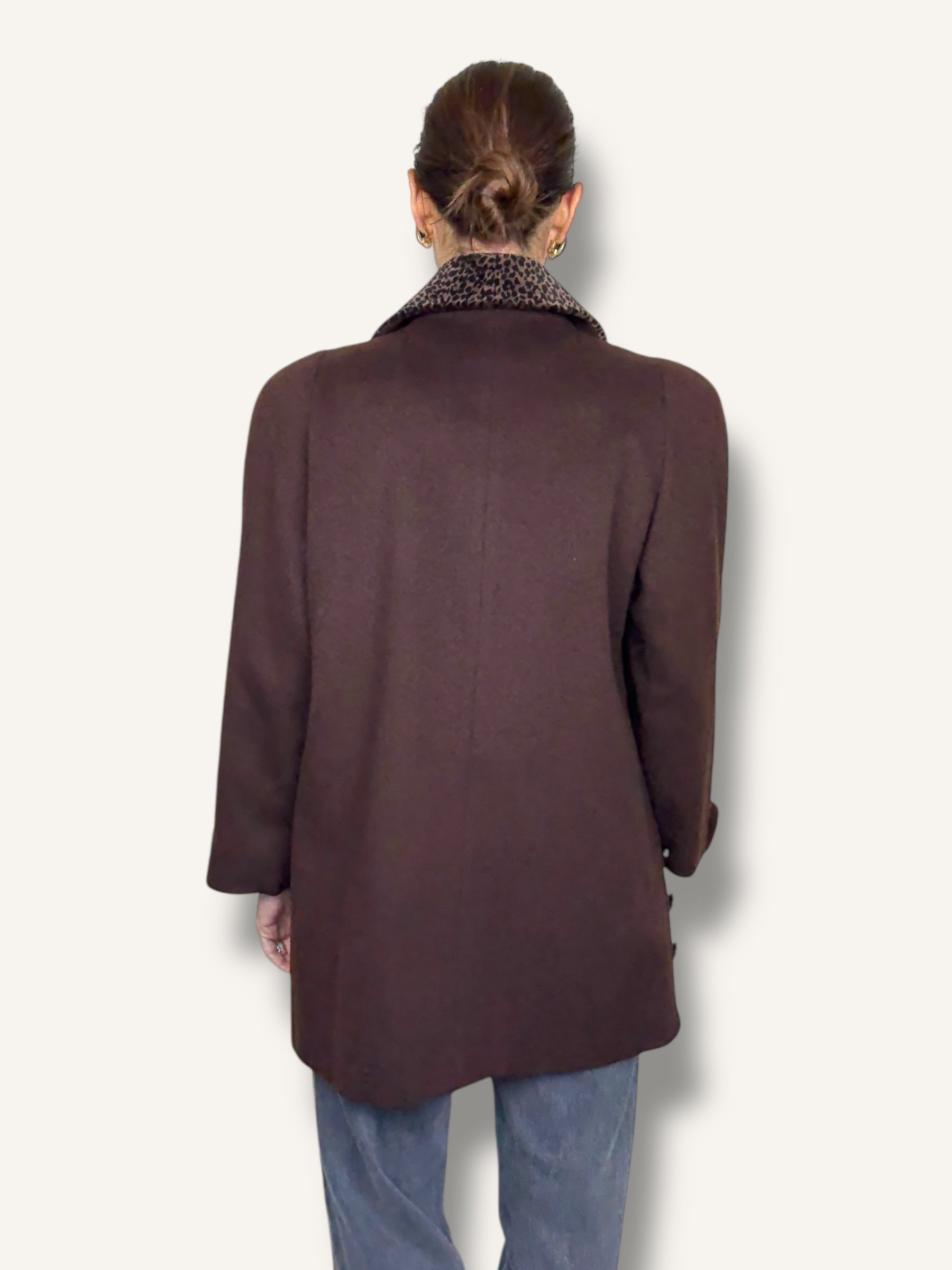A timeless vintage treasure, this rich brown wool coat brings effortless sophistication to winter dressing. The silhouette drapes beautifully, while the statement buttons along the side and at the collar add a refined, sculptural touch. Leopard-trim accents on the collar and cuffs introduce a bold, glamorous contrast, giving the coat its unique character. Warm, chic, and unmistakably stylish, it’s the kind of vintage piece that elevates every look with ease.